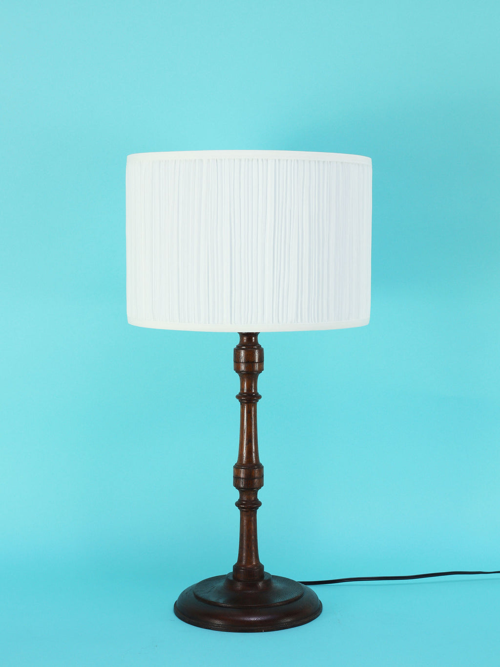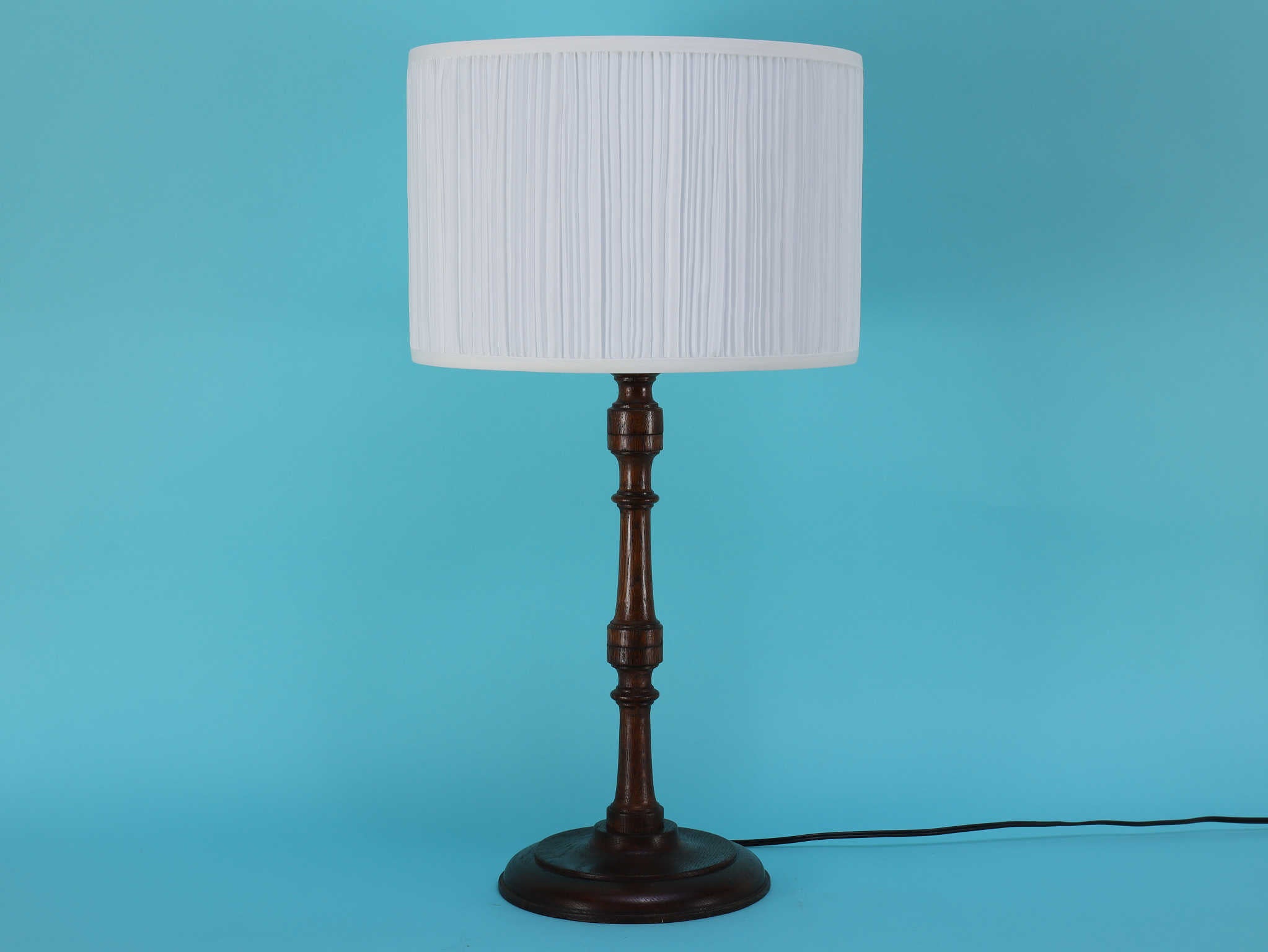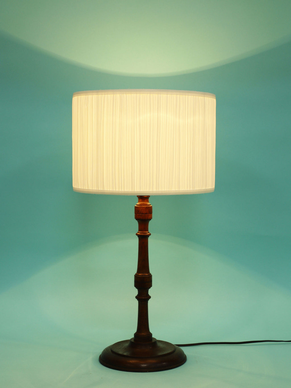 クラシカルな挽物細工が美しいオーク材のテーブルランプ。安定感のある円形台座と、中央部分が装飾的に膨らんだ挽物細工(ターニング)の支柱が特徴です。オーク材の深い色と、長年の使用によって生まれた艶が、この家具に確かな重厚感と信頼をもたらします。台座には、オーク材特有の力強い杢目が感じられます。上部には、円柱型の白いシェードがつくことで、重厚な木製ベースとの美しいコントラストが生まれ、読書灯や間接照明として、上品で柔らかな光を届けてくれるでしょう。書斎やベッドサイドに最適な、格調高い雰囲気を持つ一品です。