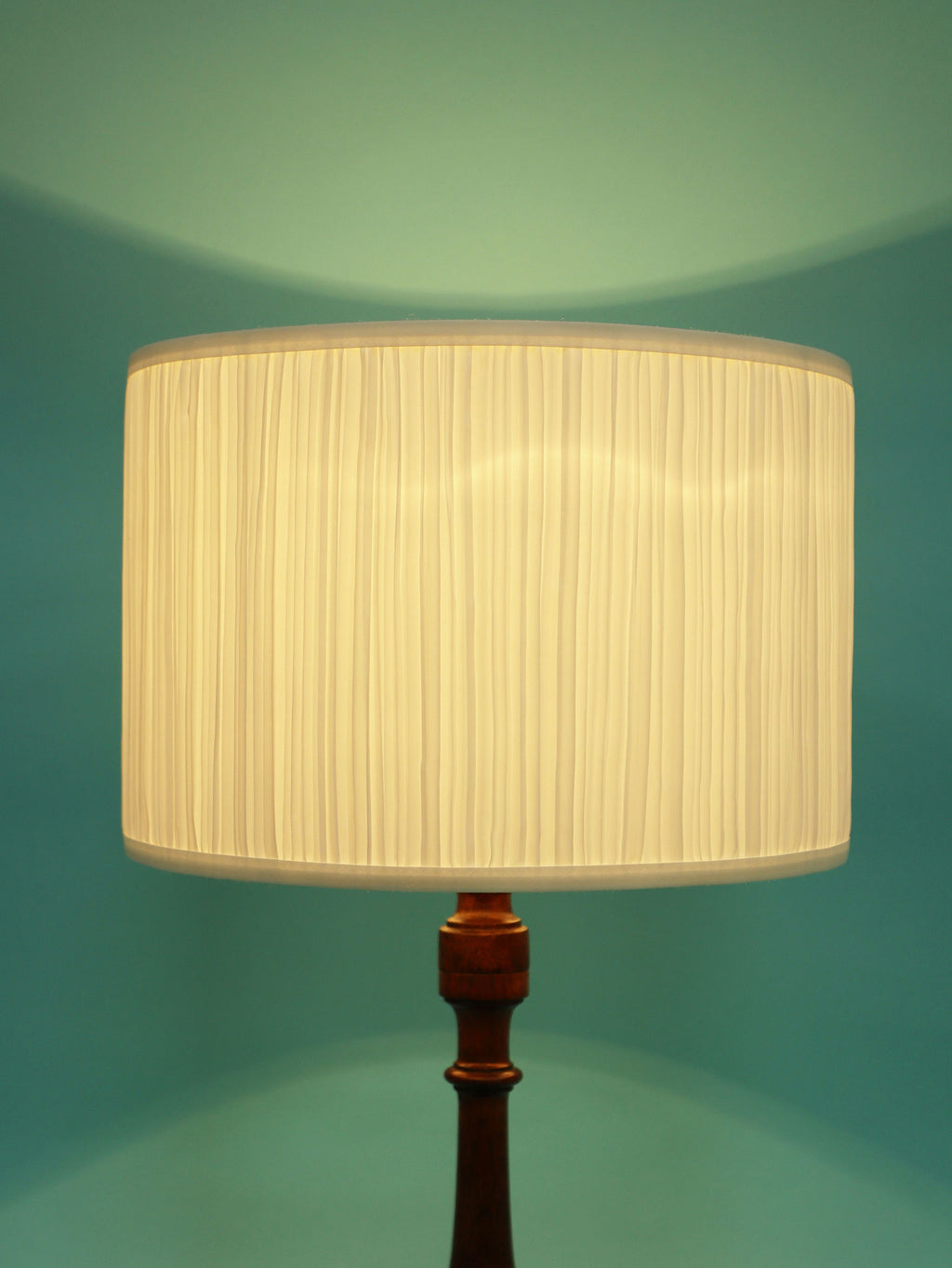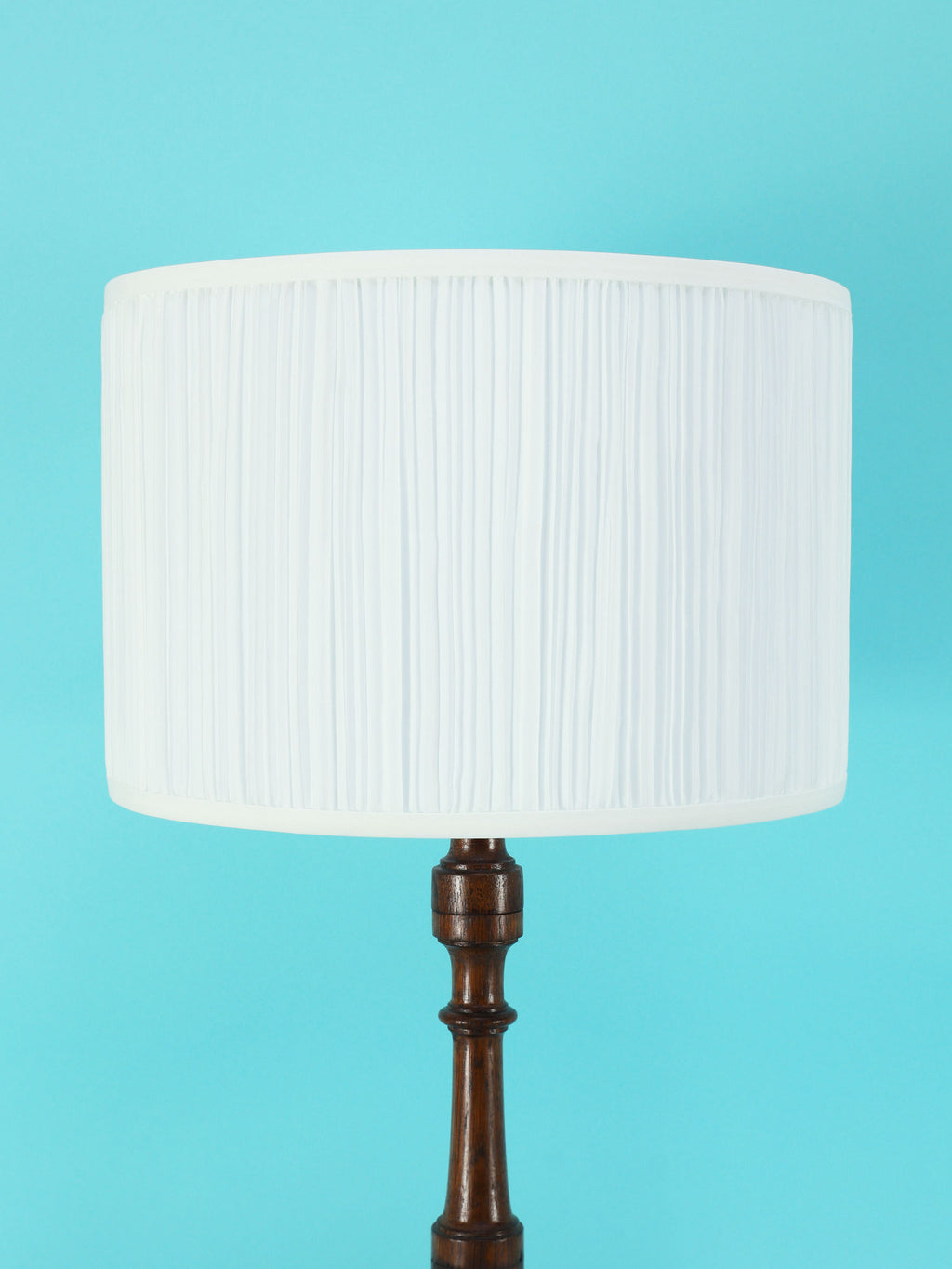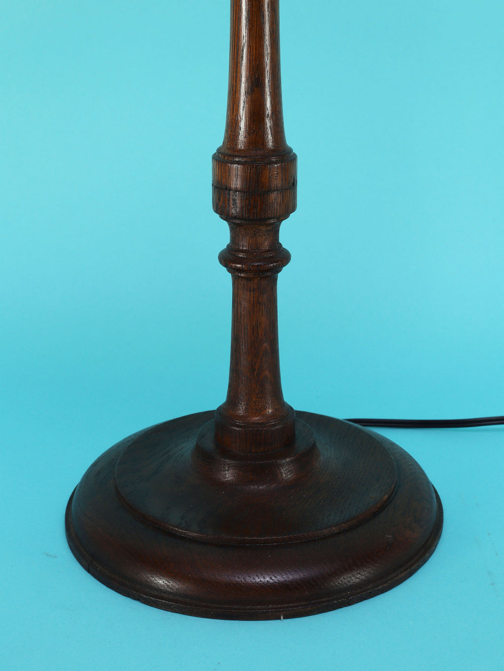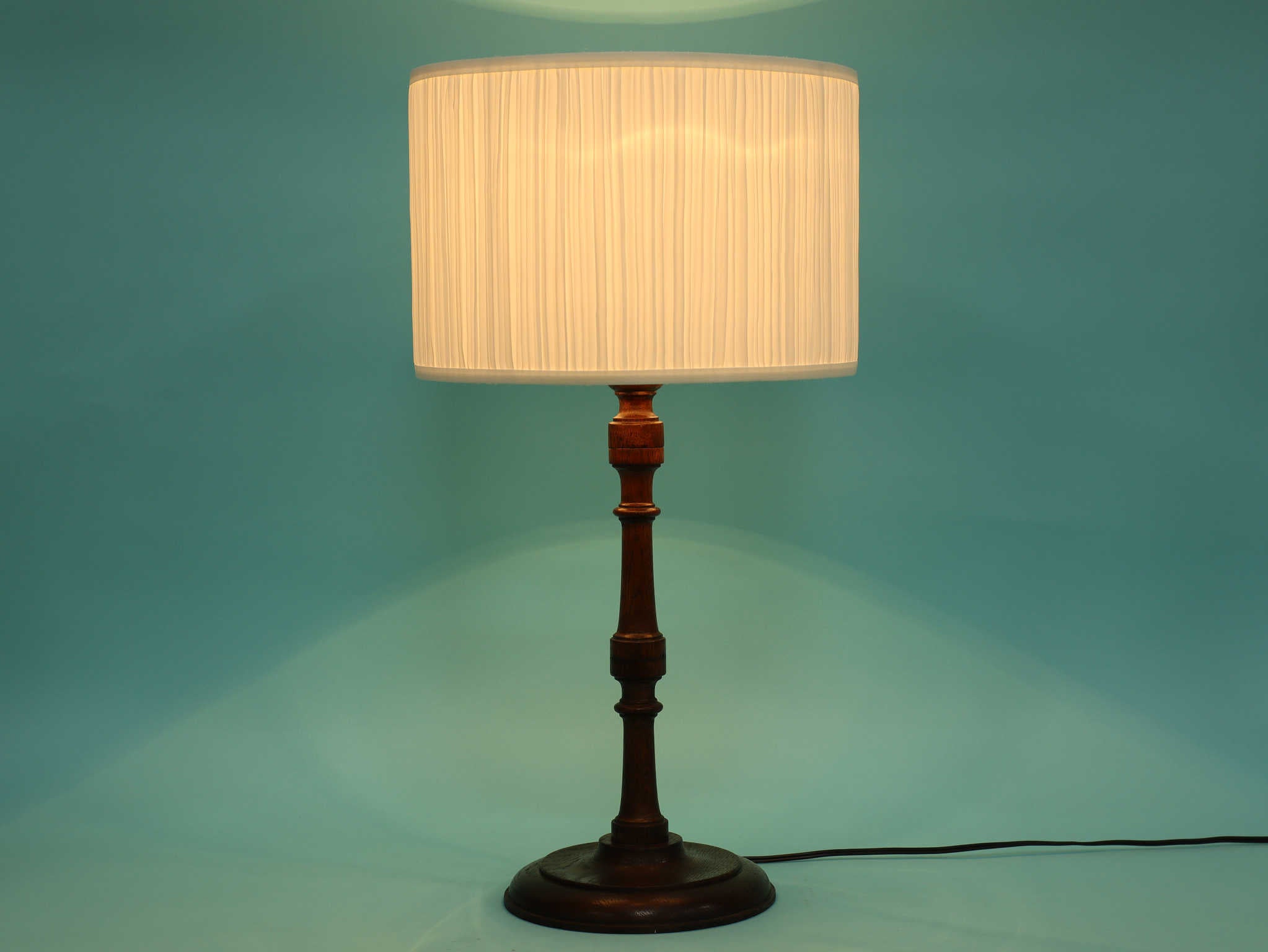 クラシカルな挽物細工が美しいオーク材のテーブルランプ。安定感のある円形台座と、中央部分が装飾的に膨らんだ挽物細工(ターニング)の支柱が特徴です。オーク材の深い色と、長年の使用によって生まれた艶が、この家具に確かな重厚感と信頼をもたらします。台座には、オーク材特有の力強い杢目が感じられます。上部には、円柱型の白いシェードがつくことで、重厚な木製ベースとの美しいコントラストが生まれ、読書灯や間接照明として、上品で柔らかな光を届けてくれるでしょう。書斎やベッドサイドに最適な、格調高い雰囲気を持つ一品です。