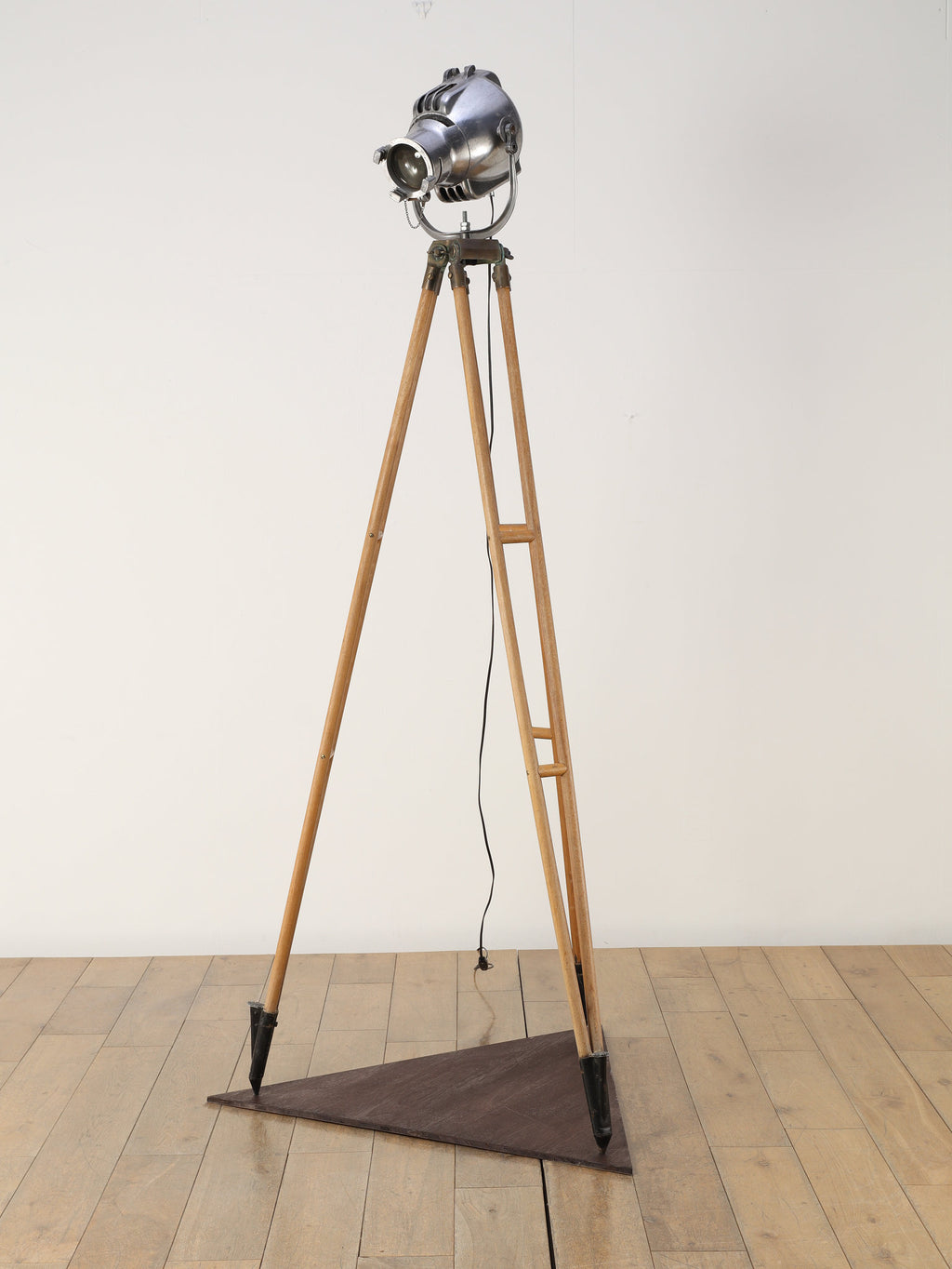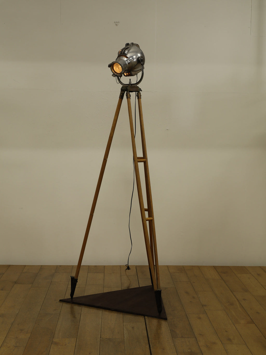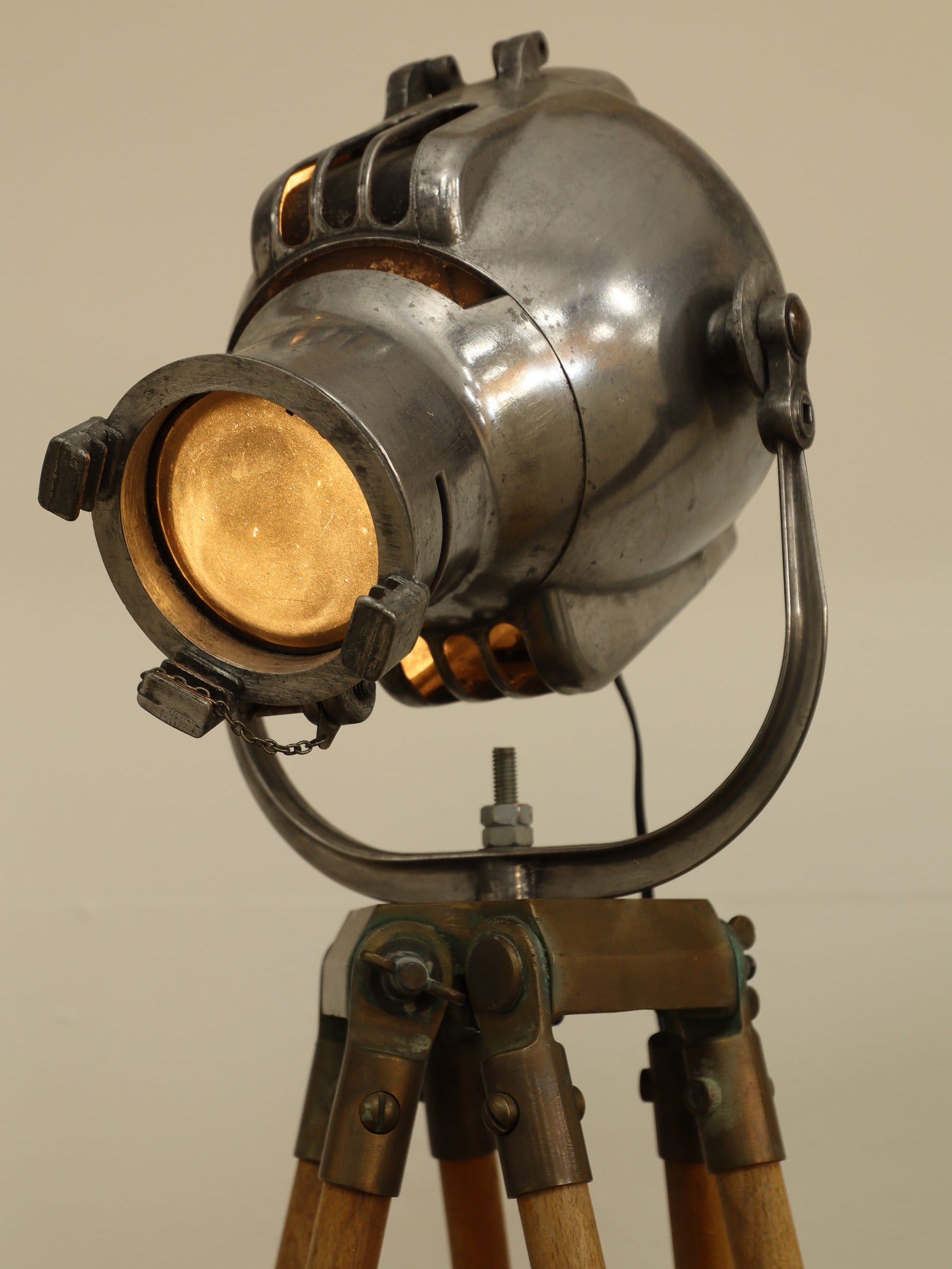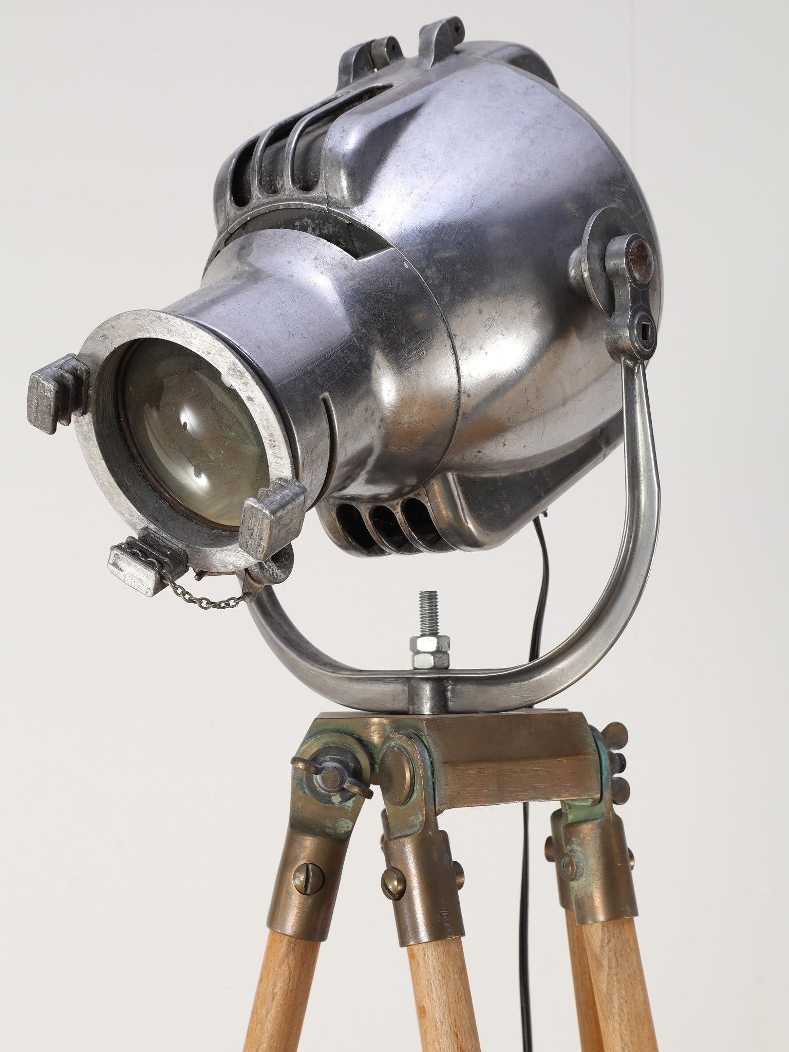 1890年代(推定)、英国製のシネマランプです。かつて航海や舞台の現場を照らしていたであろう、実用性から生まれた機能美と力強いフォルムが魅力です。圧倒的な存在感を放つヘッド部分は、重厚なメタルの質感が丁寧に磨き上げられ、クールでインダストリアルな美しさを湛えています。それを支える三脚の木材ならではの温かみと金属パーツの経年変化が相まって、味わい深い表情を見せます。広々としたリビングやアトリエ、店舗のディスプレイとして置けば、空間を一変させるドラマティックなアクセントとなります。歴史のロマンと機械的な造形美が融合した、他にはない特別な照明器具です。