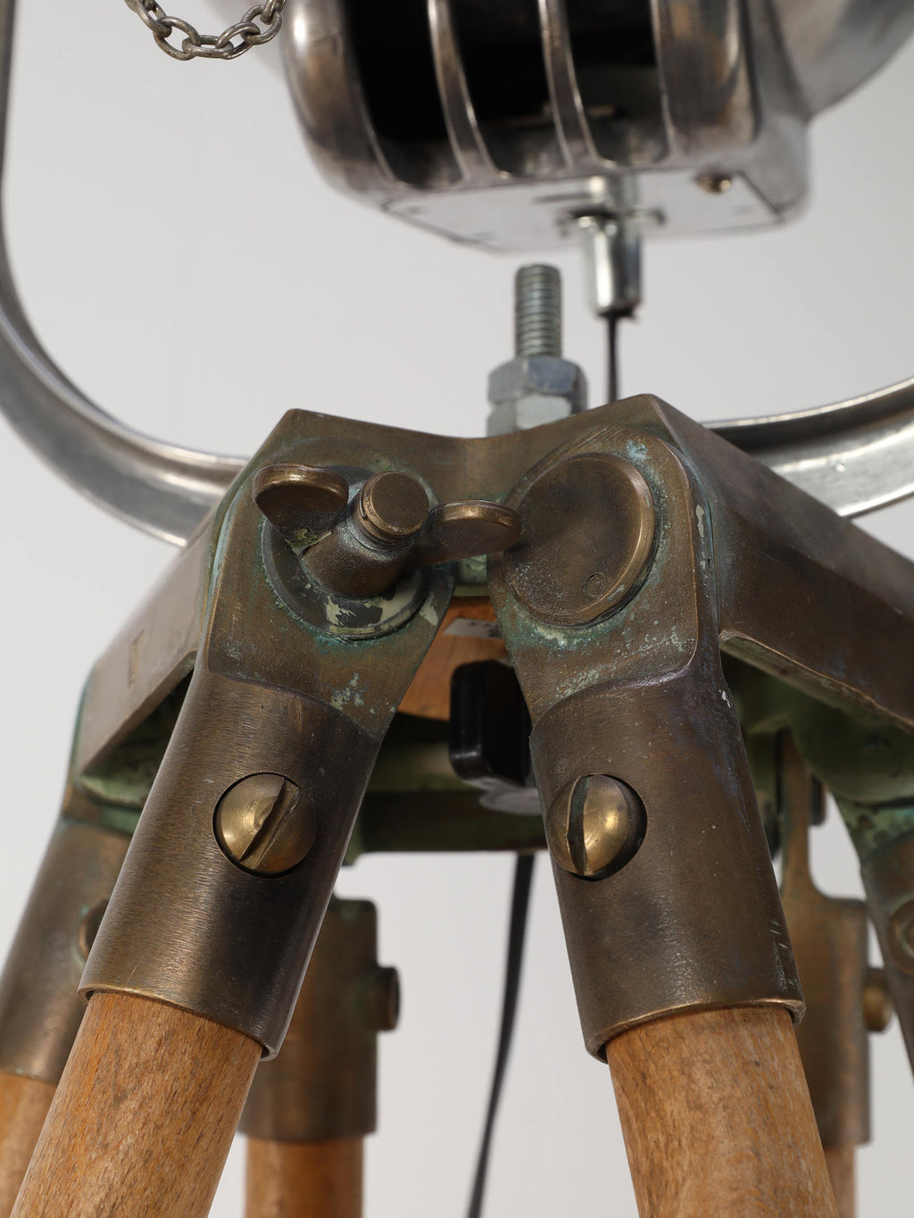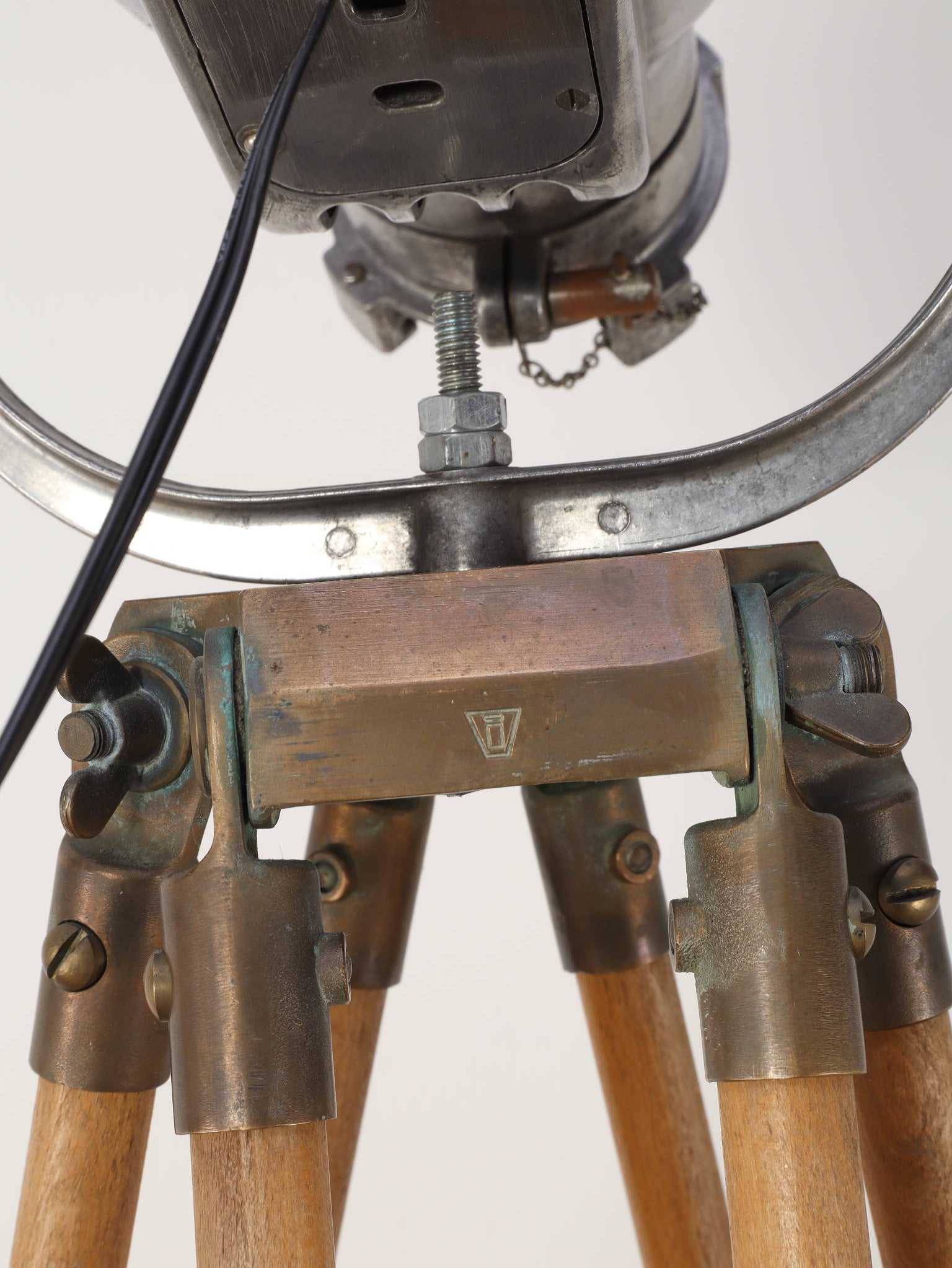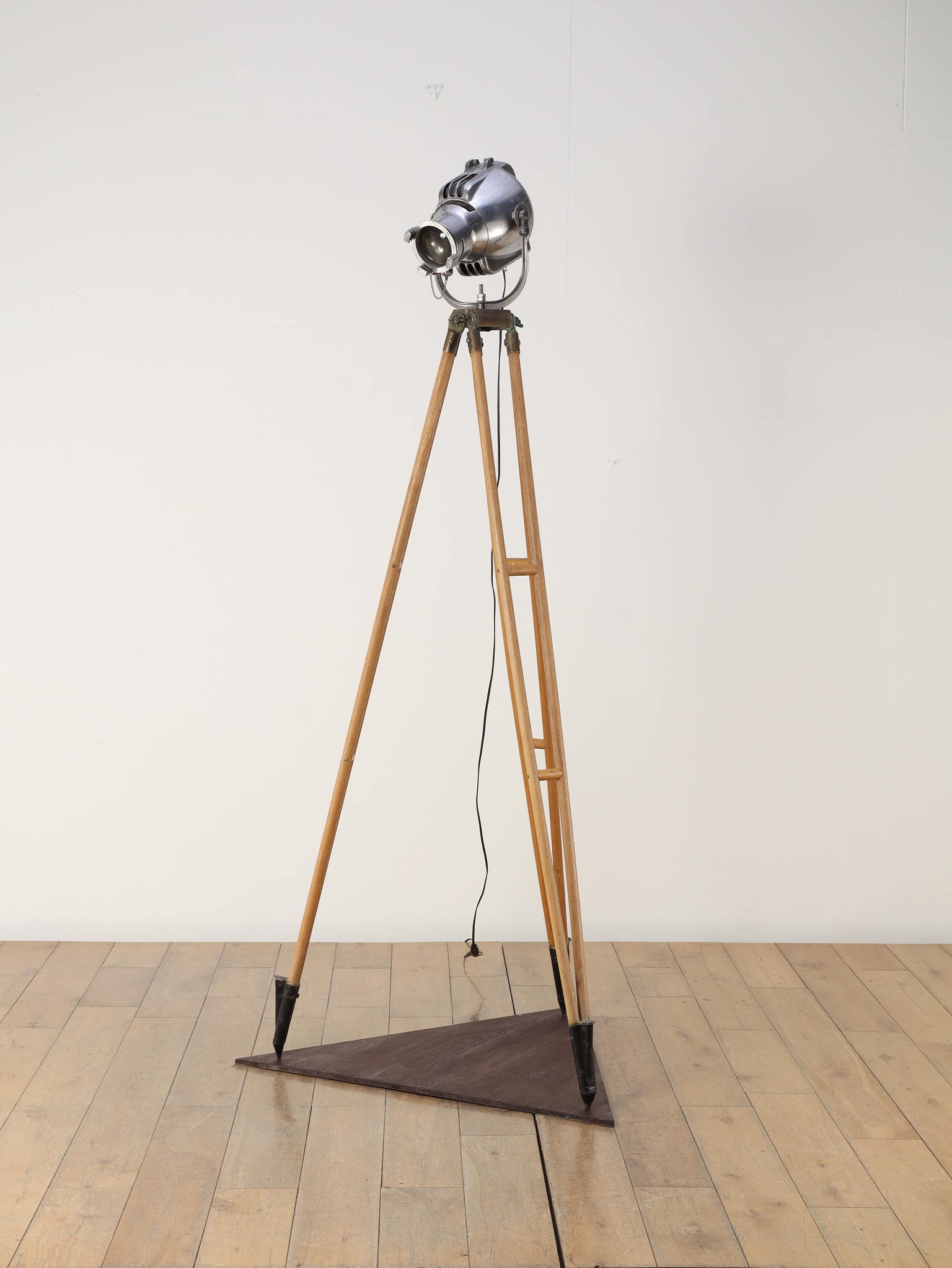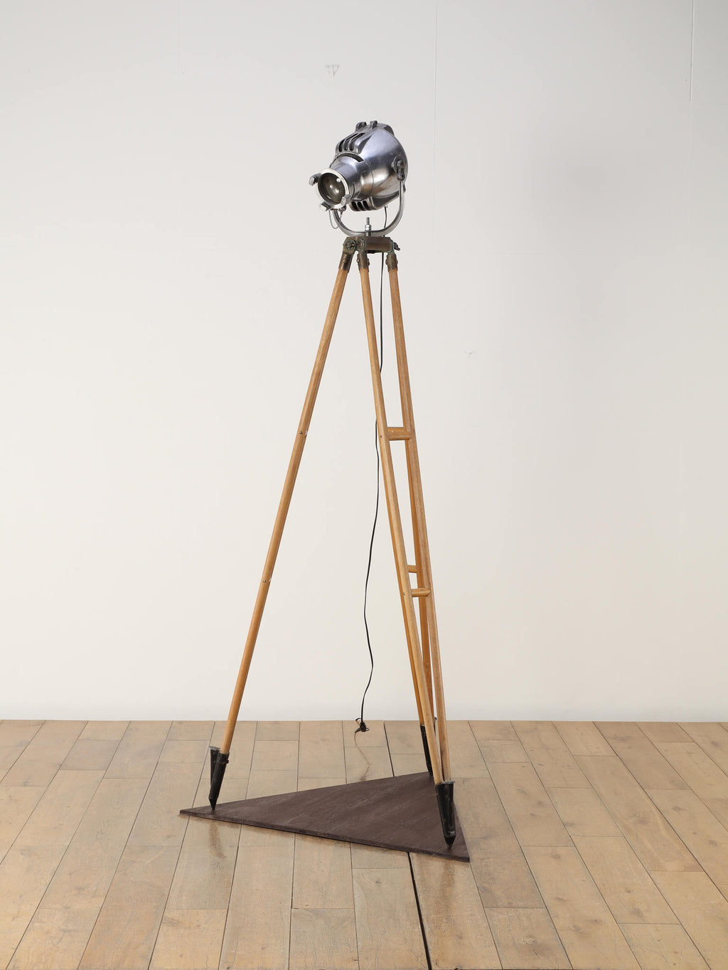 1890年代(推定)、英国製のシネマランプです。かつて航海や舞台の現場を照らしていたであろう、実用性から生まれた機能美と力強いフォルムが魅力です。圧倒的な存在感を放つヘッド部分は、重厚なメタルの質感が丁寧に磨き上げられ、クールでインダストリアルな美しさを湛えています。それを支える三脚の木材ならではの温かみと金属パーツの経年変化が相まって、味わい深い表情を見せます。広々としたリビングやアトリエ、店舗のディスプレイとして置けば、空間を一変させるドラマティックなアクセントとなります。歴史のロマンと機械的な造形美が融合した、他にはない特別な照明器具です。