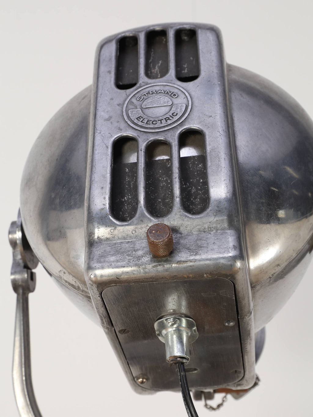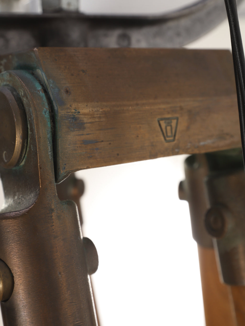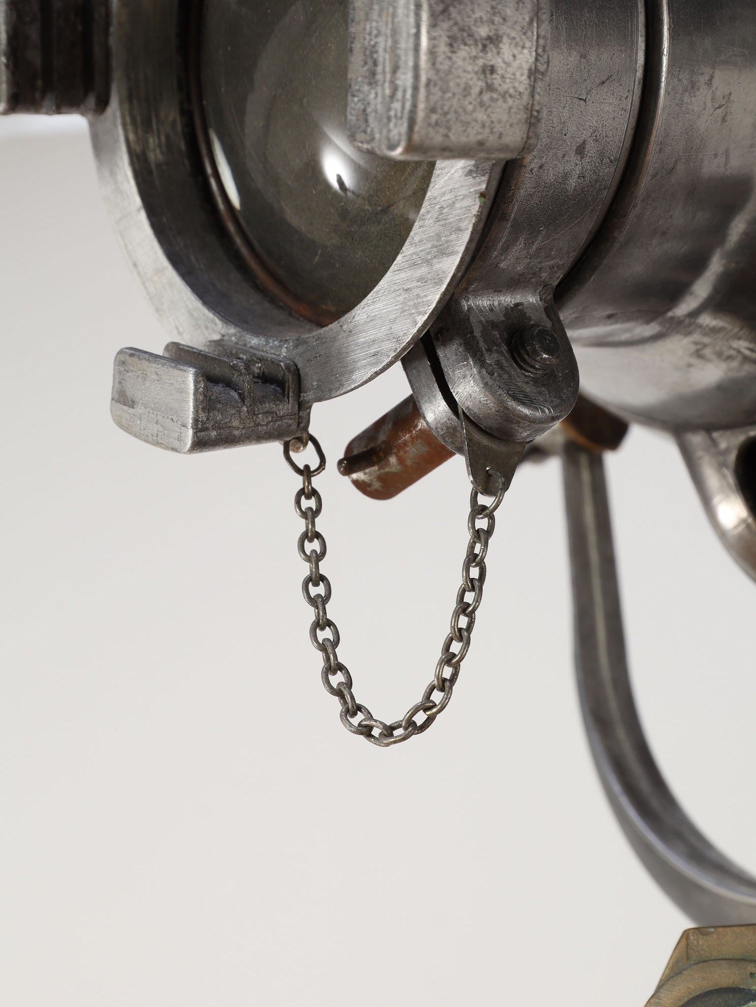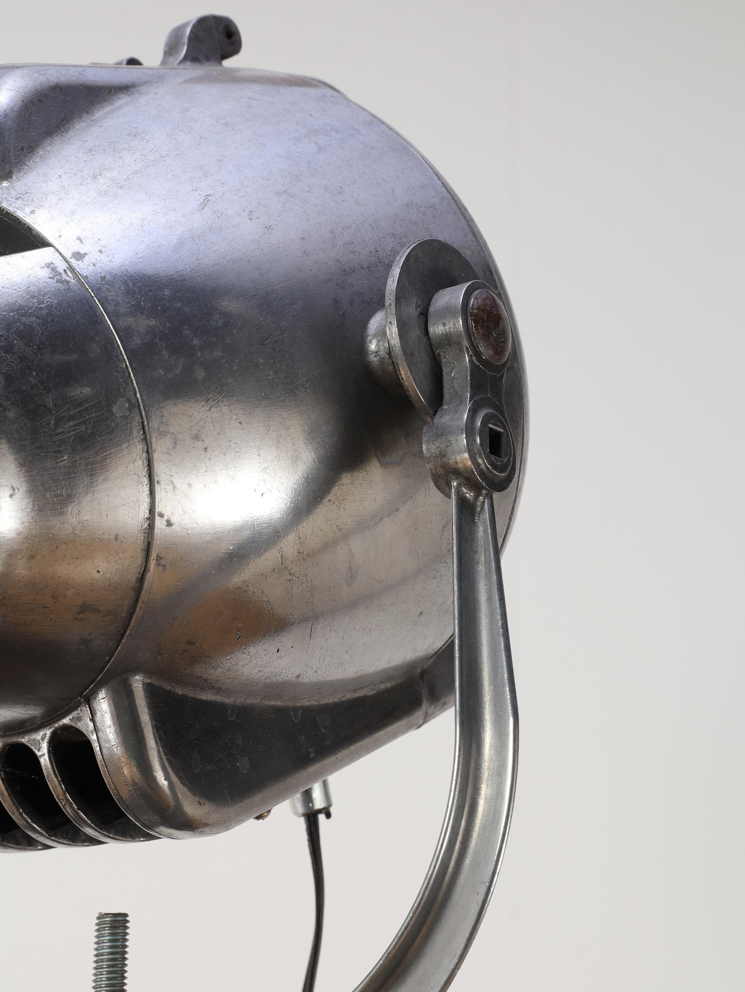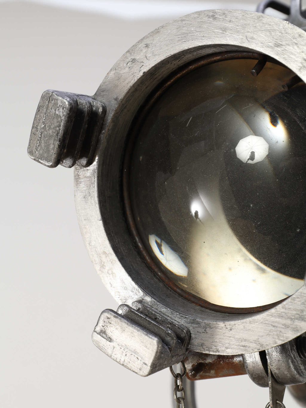 1890年代(推定)、英国製のシネマランプです。かつて航海や舞台の現場を照らしていたであろう、実用性から生まれた機能美と力強いフォルムが魅力です。圧倒的な存在感を放つヘッド部分は、重厚なメタルの質感が丁寧に磨き上げられ、クールでインダストリアルな美しさを湛えています。それを支える三脚の木材ならではの温かみと金属パーツの経年変化が相まって、味わい深い表情を見せます。広々としたリビングやアトリエ、店舗のディスプレイとして置けば、空間を一変させるドラマティックなアクセントとなります。歴史のロマンと機械的な造形美が融合した、他にはない特別な照明器具です。