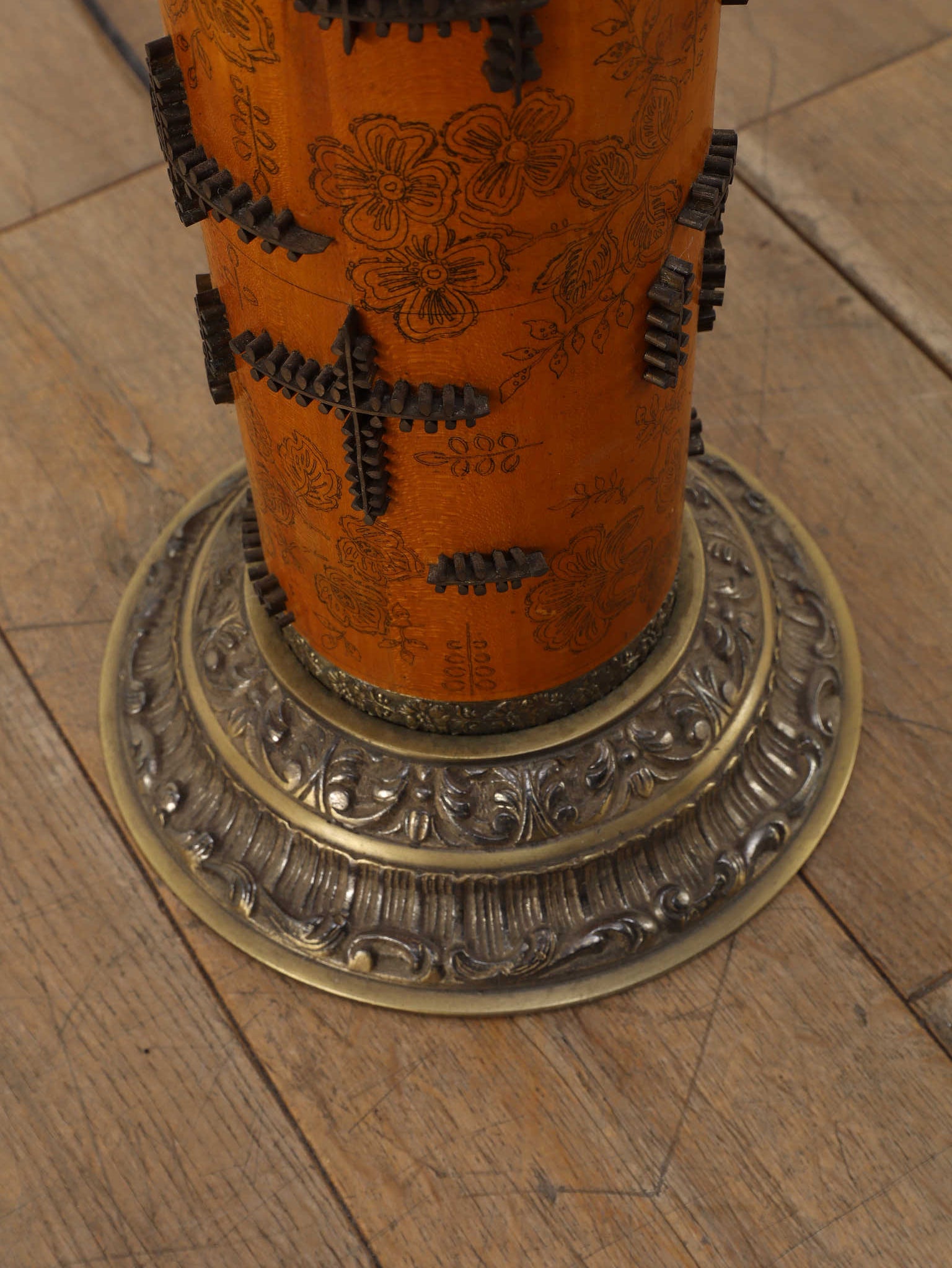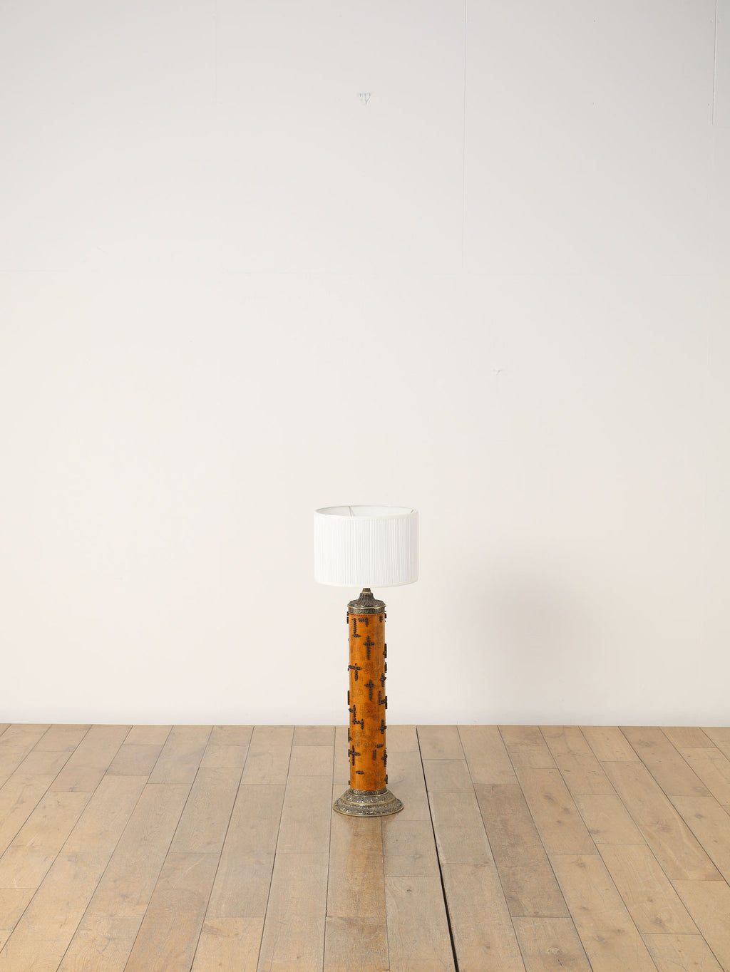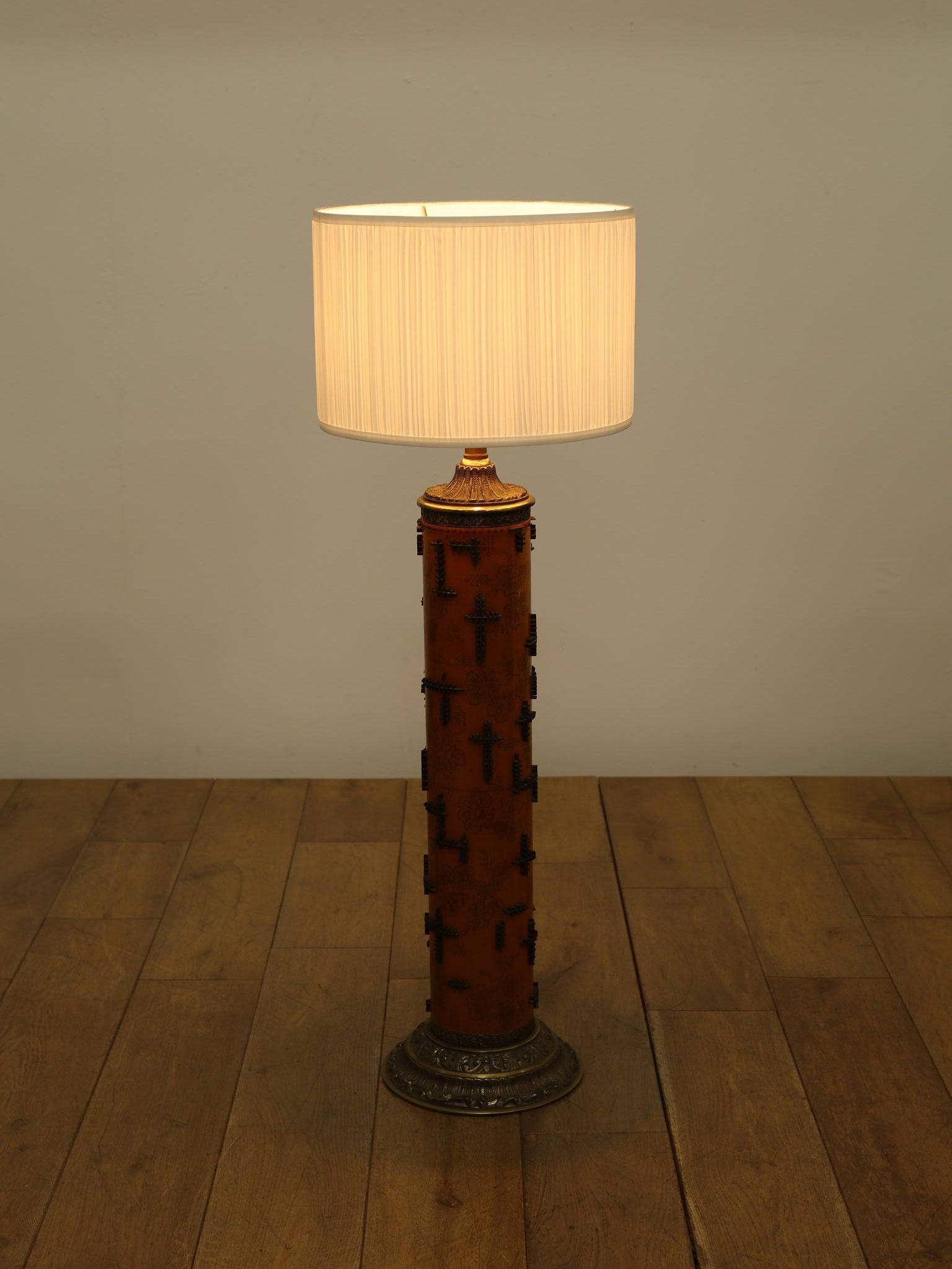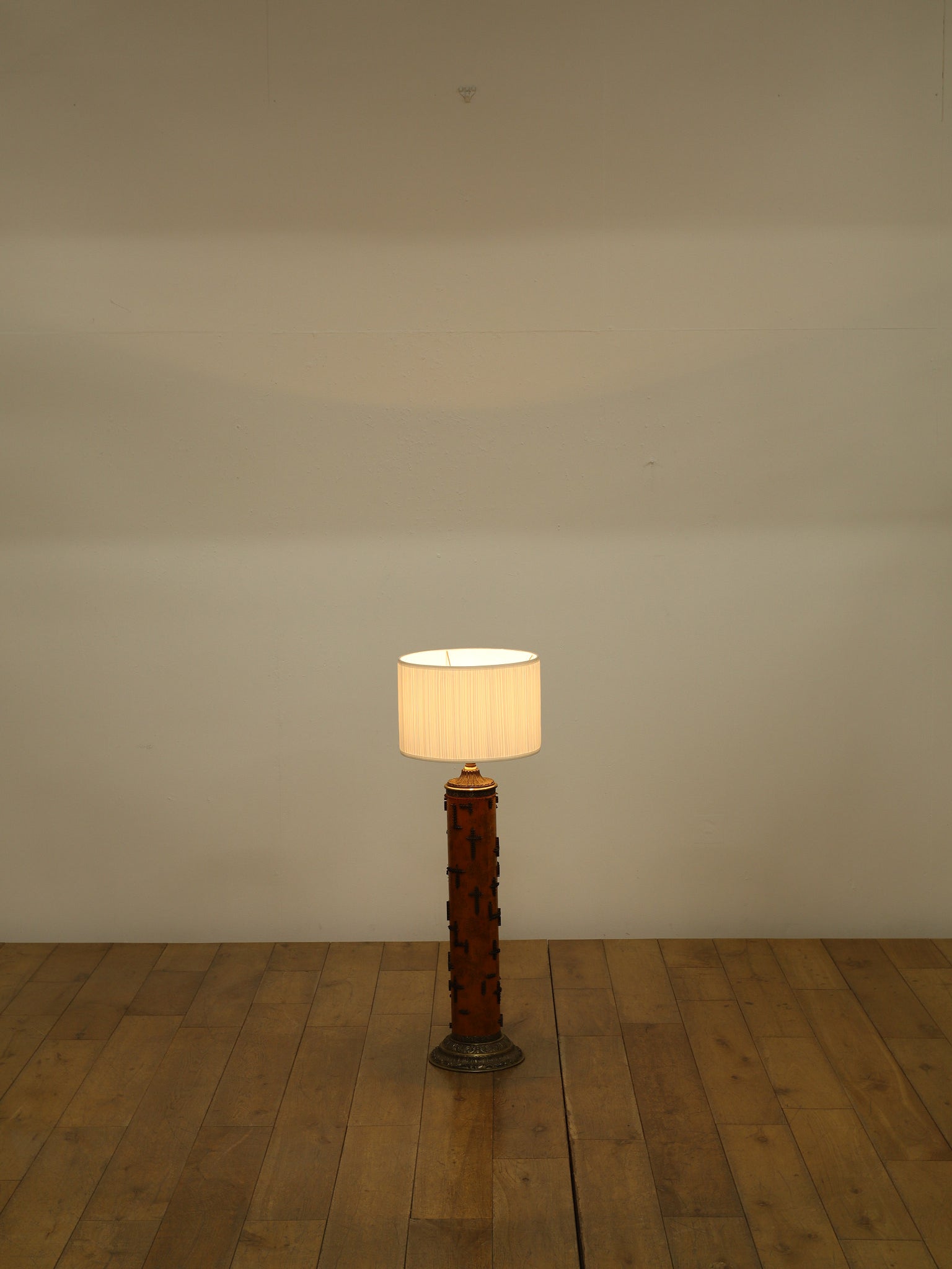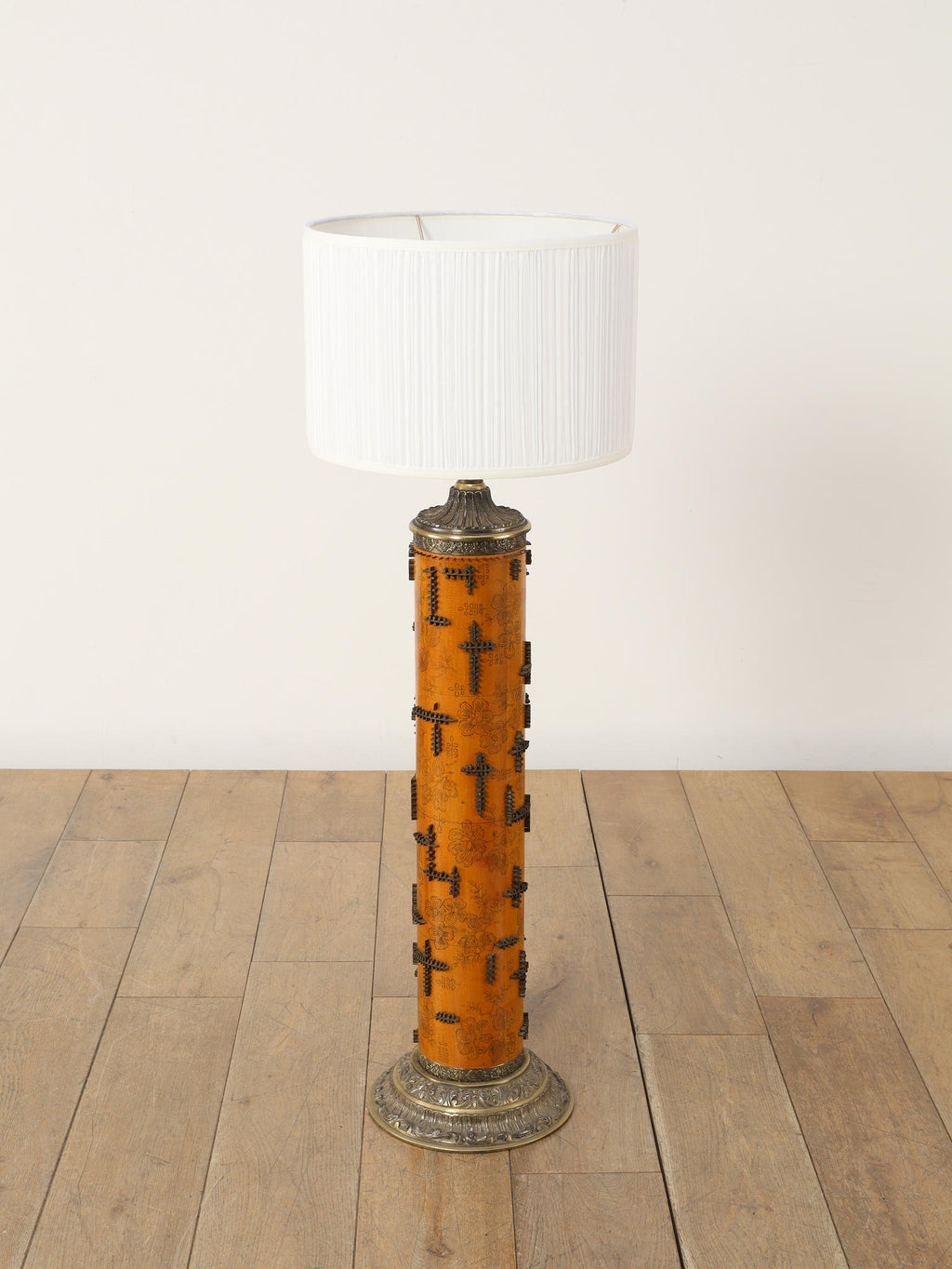 1920年代(推定)、英国製のフロアランプです。すっと伸びた円筒形のフォルムが印象的で、温かみのあるアンバー色のボディには繊細な花模様が描かれています。その名のとおり、当時、プリントワーク用の什器ロールを再利用したもので、イギリスではそのデザインの秀逸さで多くのものが、このようにランプや家具となりました。幾何学的で特徴的な形状の金属装飾がリズミカルに配され、当時の流行であったアール・デコや東洋趣味を感じさせる独創的なデザインとなっています。トップとベース部分の真鍮には緻密なレリーフが施され、重厚な格調高さを添えています。リビングや寝室のサイドテーブルに置くだけで、空間に深みと個性を与えてくれるランプです。