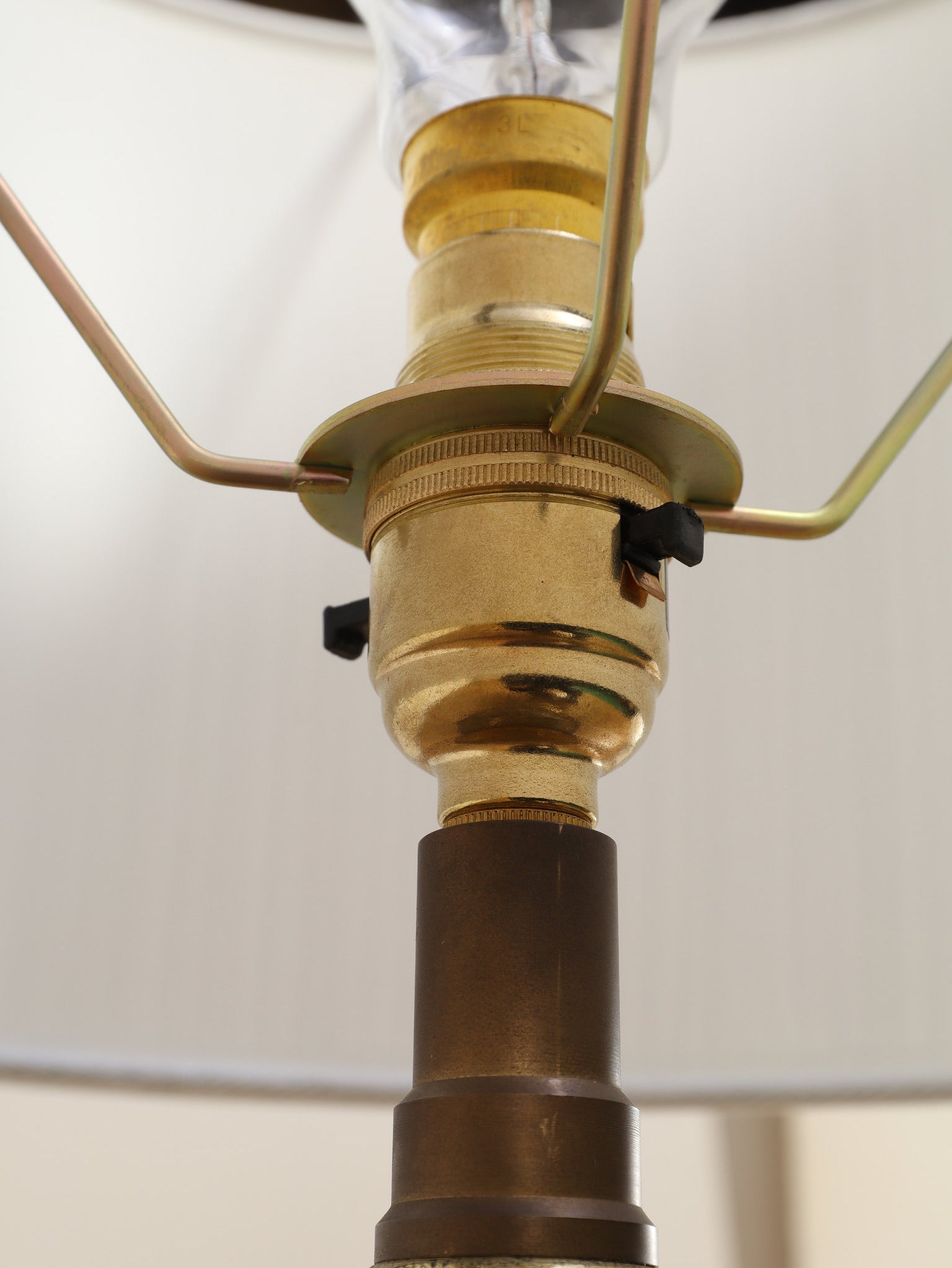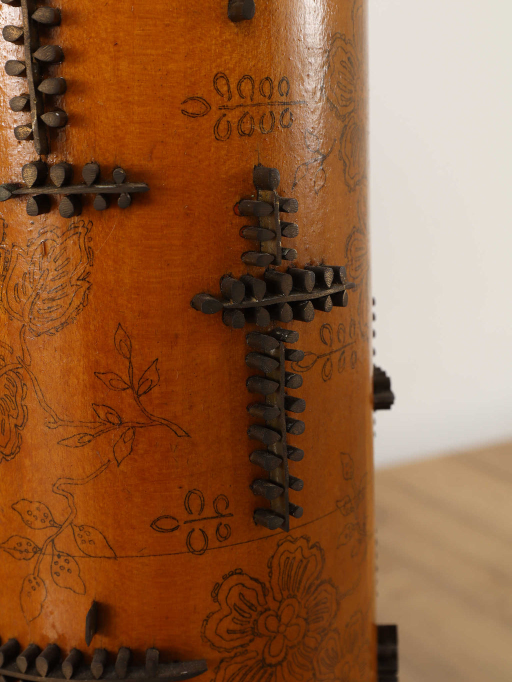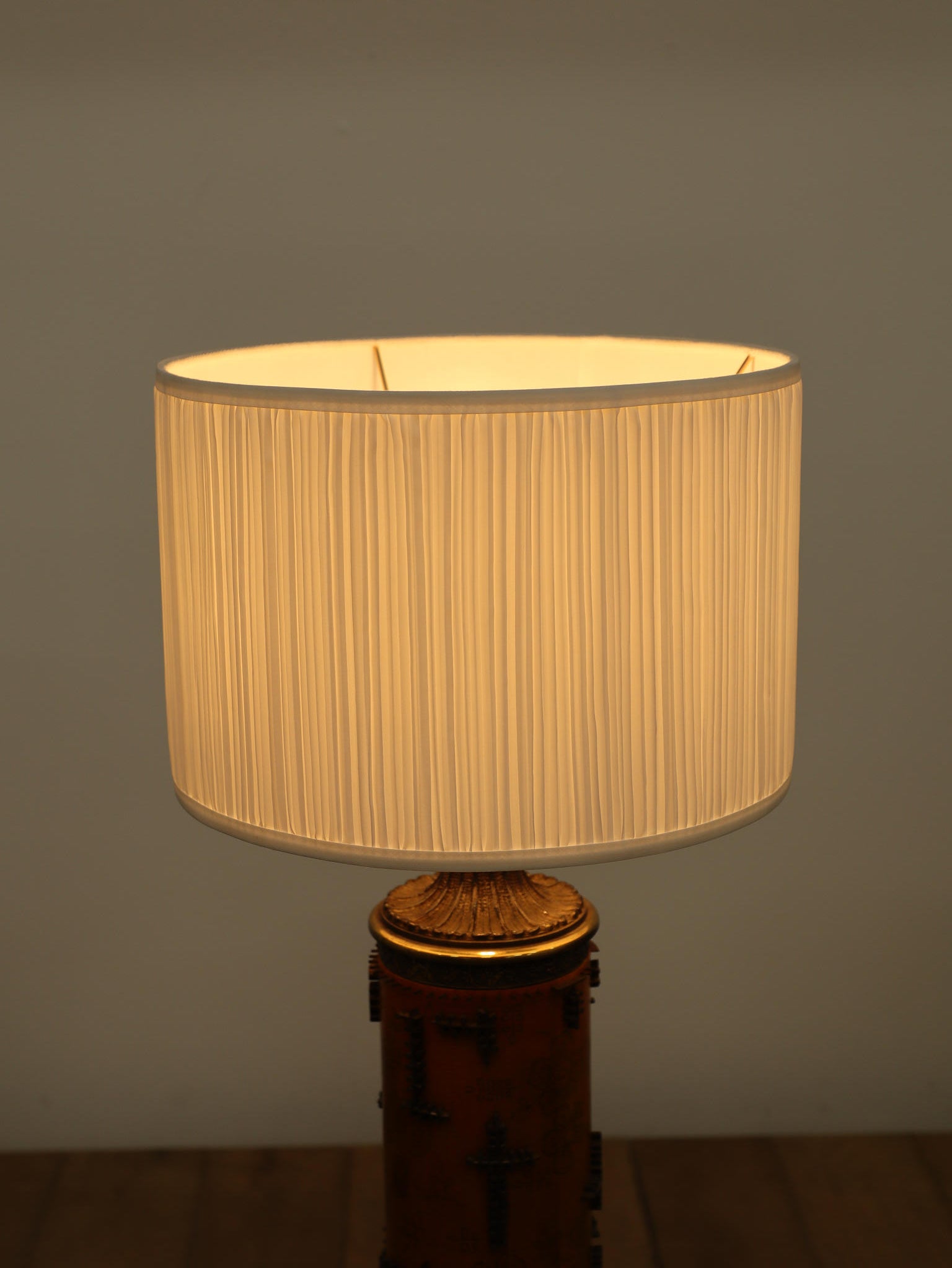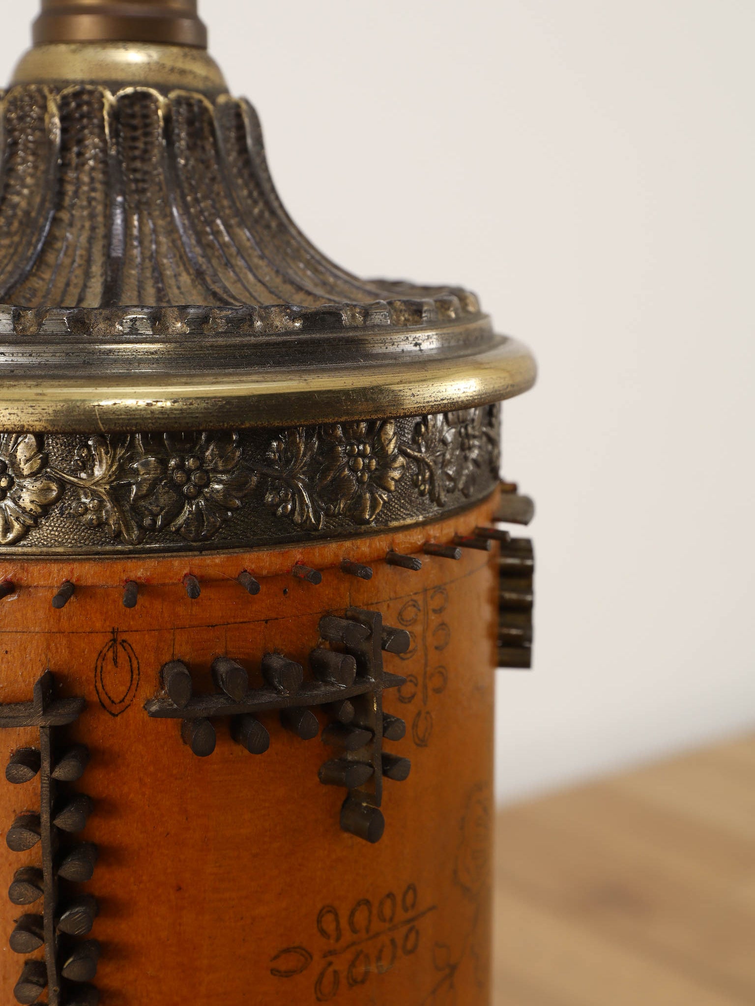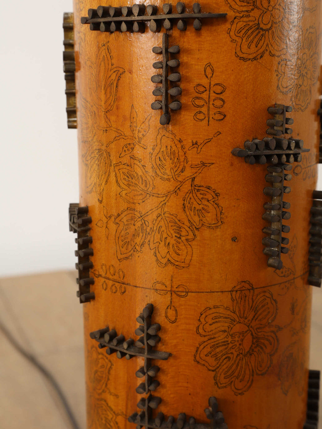 1920年代(推定)、英国製のフロアランプです。すっと伸びた円筒形のフォルムが印象的で、温かみのあるアンバー色のボディには繊細な花模様が描かれています。その名のとおり、当時、プリントワーク用の什器ロールを再利用したもので、イギリスではそのデザインの秀逸さで多くのものが、このようにランプや家具となりました。幾何学的で特徴的な形状の金属装飾がリズミカルに配され、当時の流行であったアール・デコや東洋趣味を感じさせる独創的なデザインとなっています。トップとベース部分の真鍮には緻密なレリーフが施され、重厚な格調高さを添えています。リビングや寝室のサイドテーブルに置くだけで、空間に深みと個性を与えてくれるランプです。