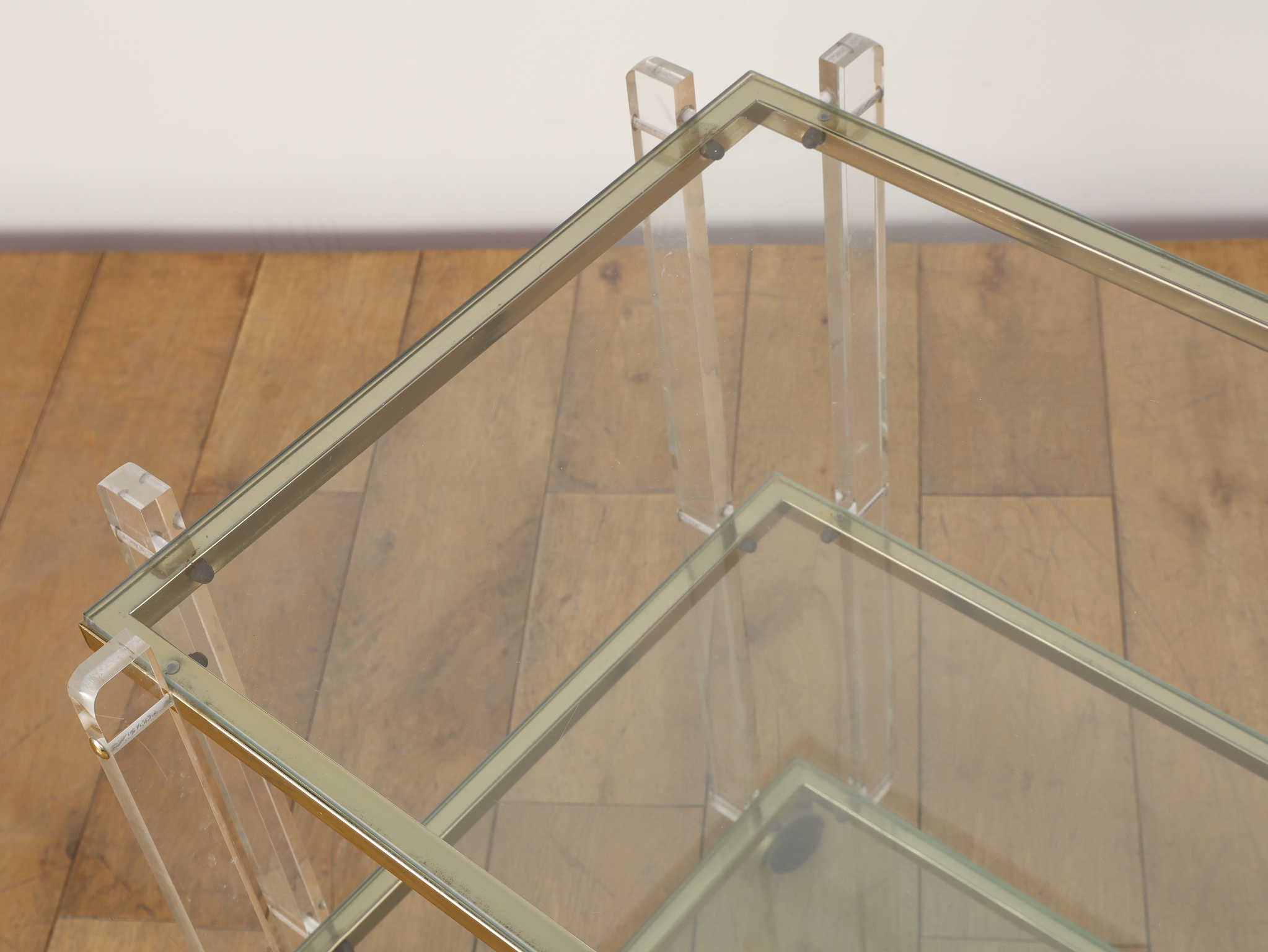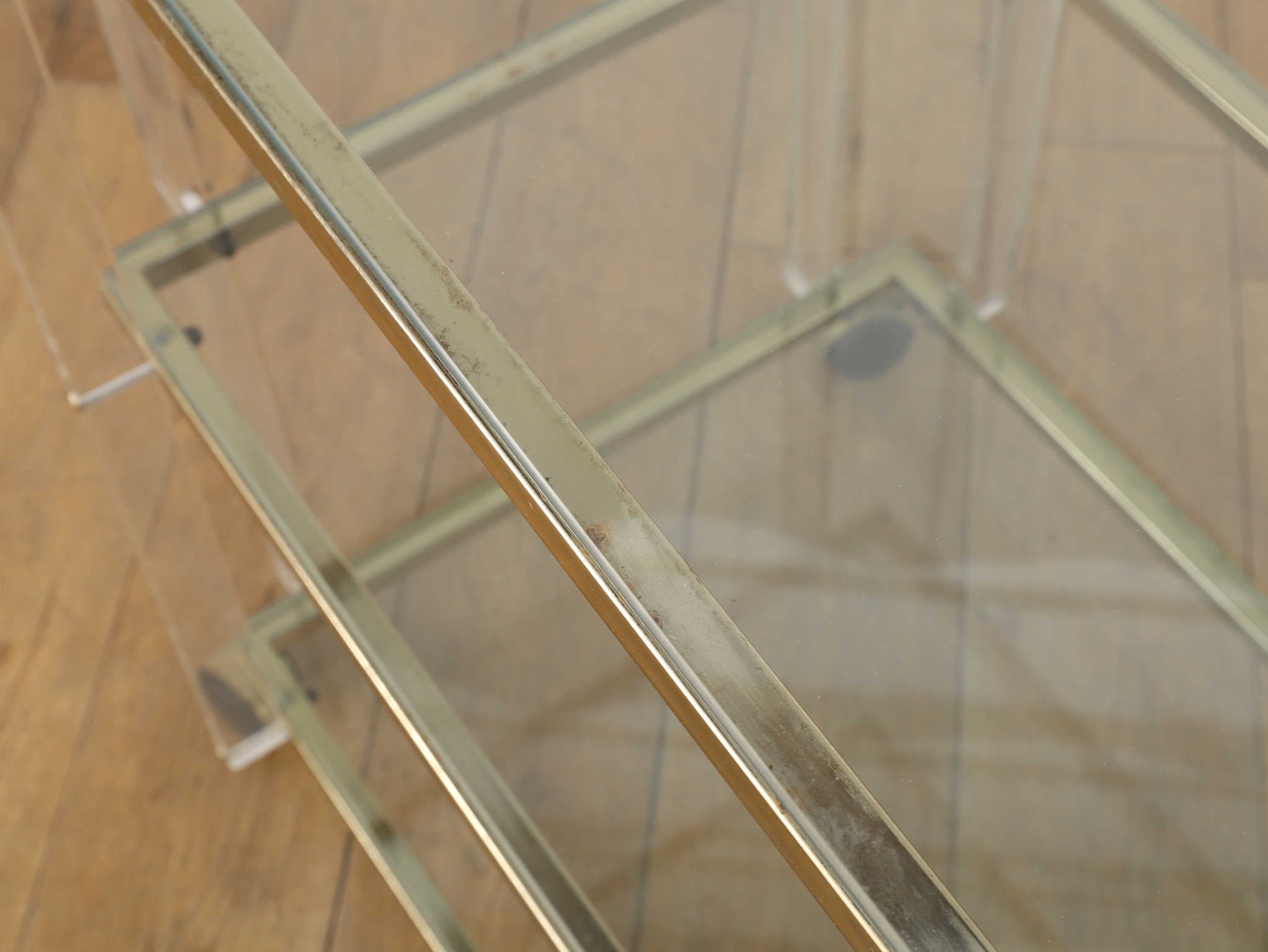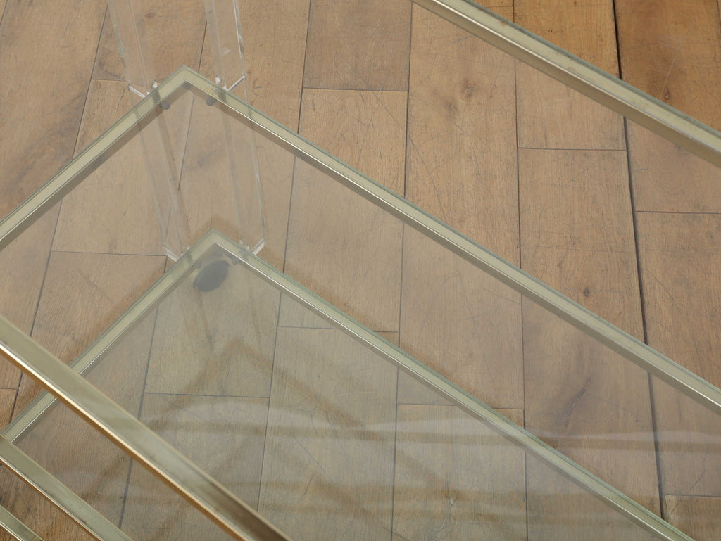1960年代(推定)イギリス製、ルーサイト素材のトロリー。直線的で洗練されたデザインは、当時のモダンスタイルを象徴しています。透明なガラス素材、アクセントに使用された金属の組み合わせが、都会的でクールな印象を与えてくれます。お部屋に置くだけで空間に軽やかさと広がりをもたらし、現代のモダンなインテリアにも調和する普遍的なデザイン性が最大の魅力です。リビングで飲み物やグラスを運ぶサービスワゴンとして、あるいは書斎で愛読書や小物をディスプレイするサイドテーブルとしてもご活用いただけます。主張しすぎない透明感のあるデザインは、周囲の家具を引き立てながら、自身の存在感を静かに伝えてくれます。