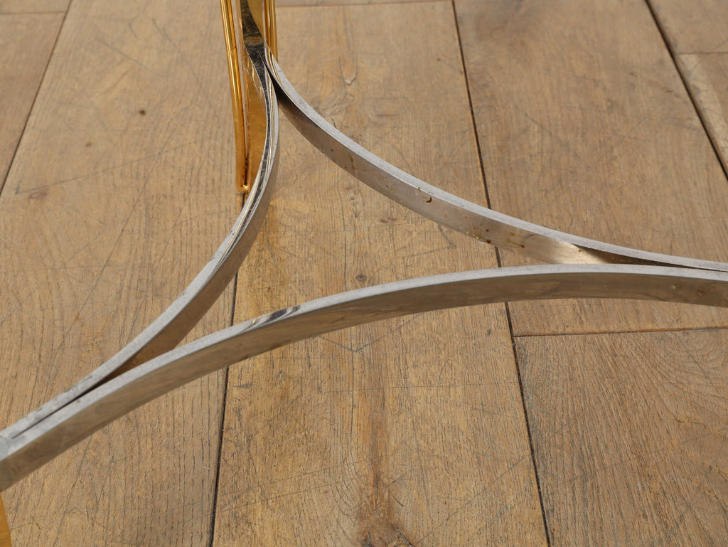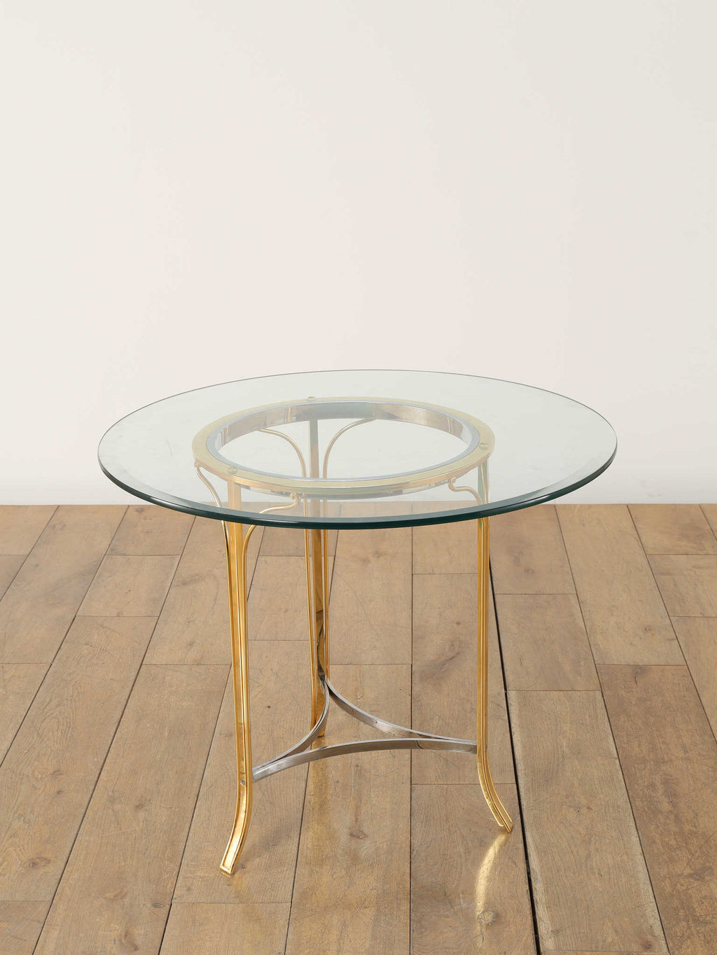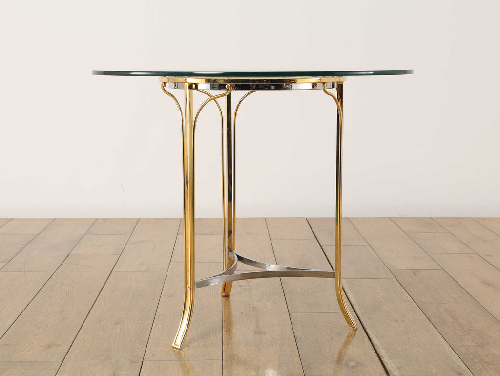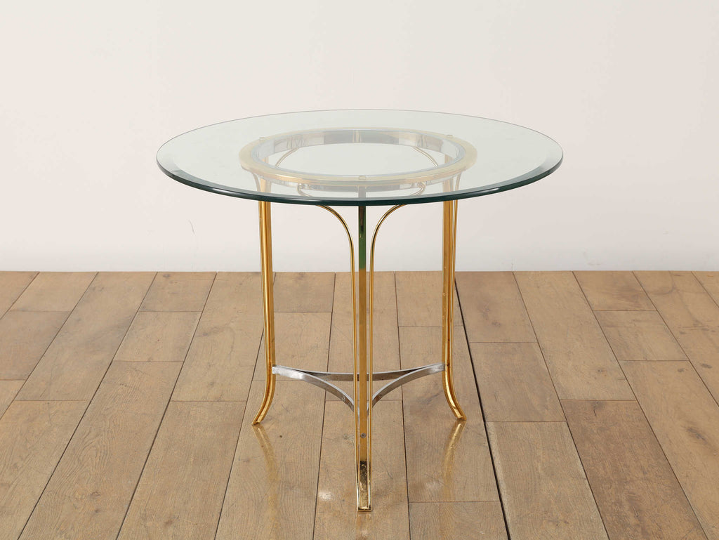 1970年代(推定)イギリス製、ガラスとブラスを使用したテーブル。クリアなガラス天板と優雅な曲線のブラスフレームの組み合わせが、モダンで洗練された印象を与えます。当時のモダンデザインの粋を集めたようなこのテーブルは、華やかさと軽やかさを兼ね備え空間にさりげない高級感を添えます。透過性のある素材は、お部屋を広く見せる効果も有ります。ソファの横に置いてサイドテーブルとして、あるいはアート作品や照明を飾る台座としてなど、様々な用途でお使いいただけます。モダンなインテリアにも調和する都会的なデザインは、時を超えて愛される普遍的な美しさを持っています。英国ヴィンテージならではの上質な素材感と、洗練された造形美をお楽しみください。