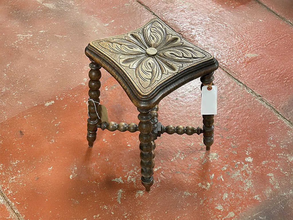 1900年代(推定)に製造されたスツールです。素朴で力強いアッシュ材の木目が活かされた、個性的なデザインのアンティークスツールです。座面には深く彫刻されたフローラルモチーフの彫刻が施されており、その立体感と躍動感が魅力です。脚部と貫きには、イギリスの伝統的な家具によく見られるボビンターニング(ろくろ細工)が用いられ、ユーモラスでありながらも安定感のある佇まいを作り出しています。横幅と奥行きを抑えたコンパクトなサイズで、持ち運びも簡単です。ちょっとした腰掛けとしてはもちろん、ソファやベッドサイドで花台やサイドテーブルとしてお使いいただくのもおすすめです。素朴な温かさと高い装飾性を兼ね備えた、空間のアクセントになる一点です。
