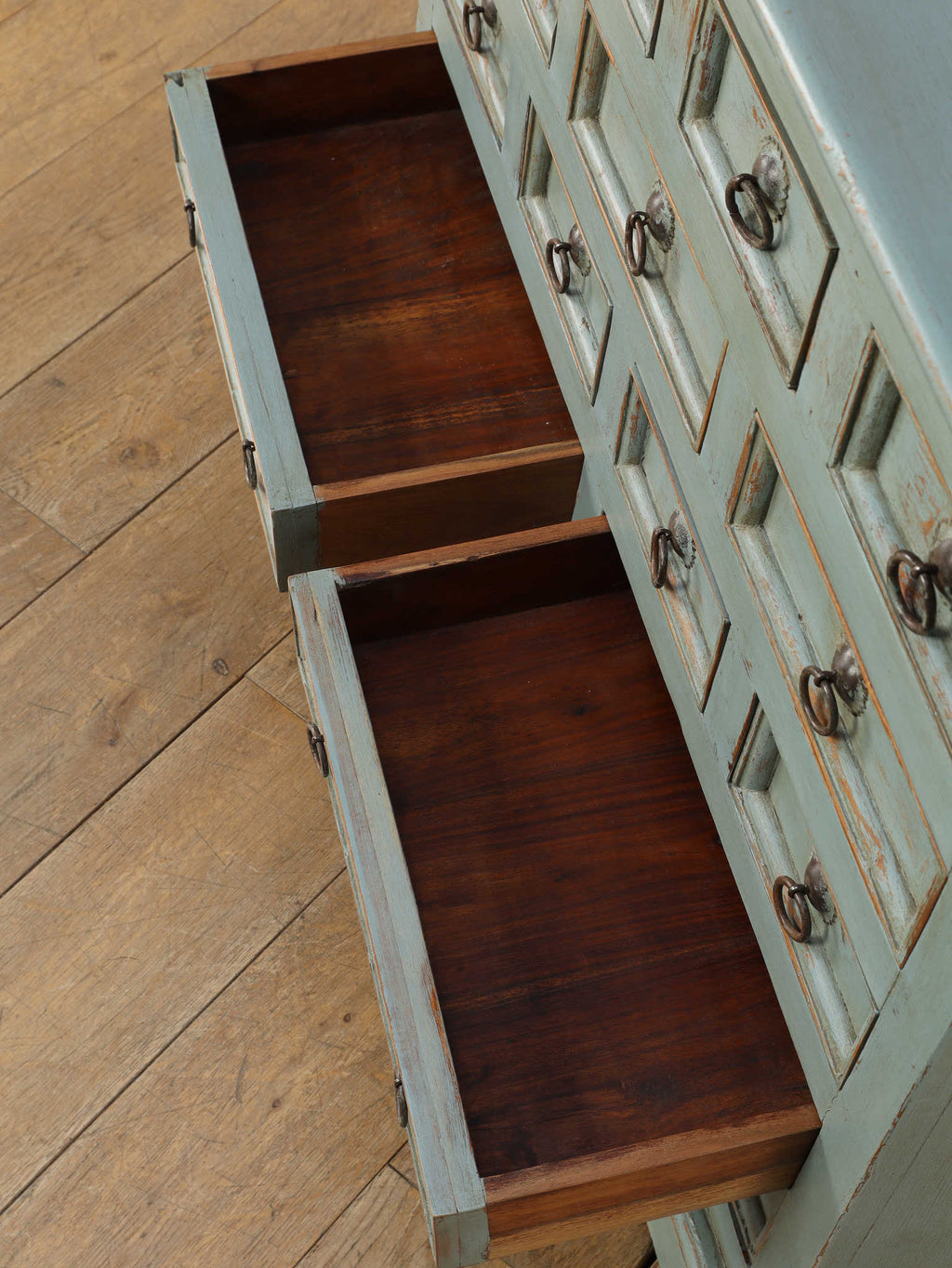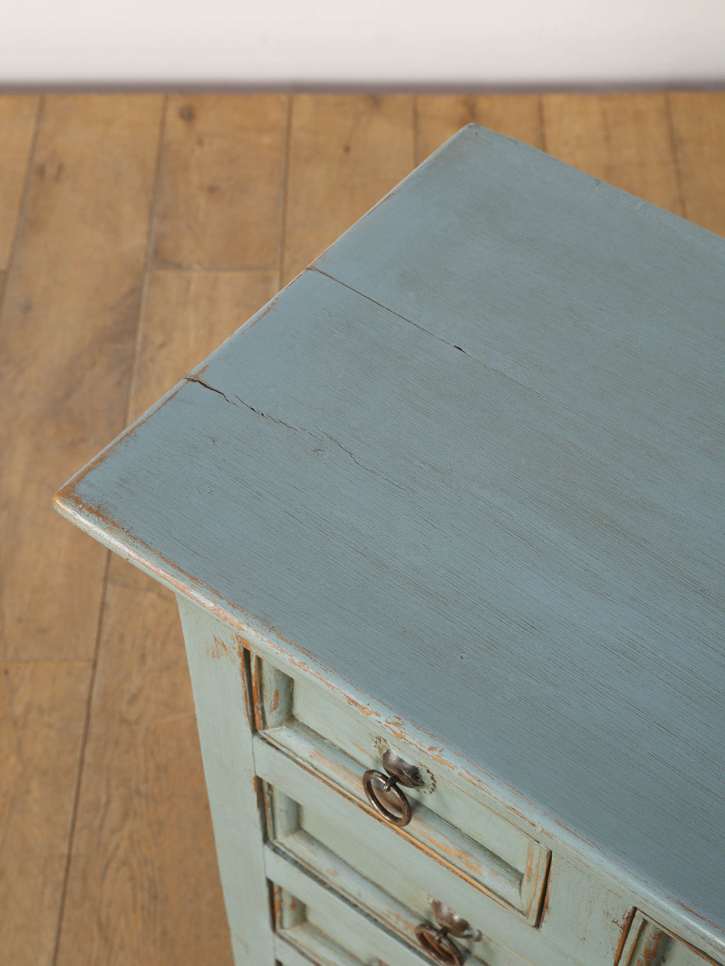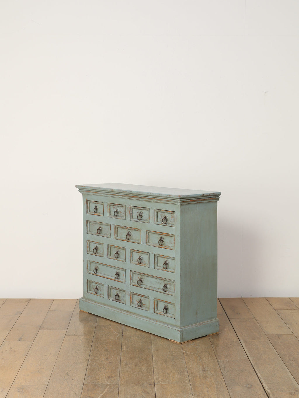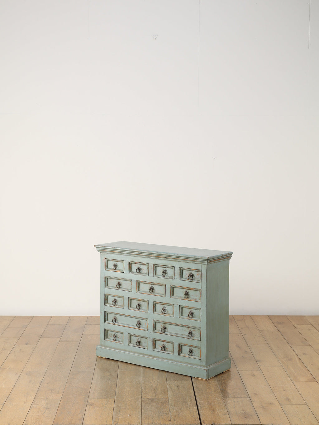 程よいサイズ感が魅力的なチェスト。一番の魅力は、見る人をワクワクさせるような、小さなたくさんの抽斗が配置されたユニークなデザインでしょう。アクセサリーや文具、大切な小物など、細かく分けて収納できる実用性の高さと、まるで宝箱のような楽しさを兼ね備えています。表面は、時代を経て風合いを増したようなシャビーな質感のペイントが施されており、落ち着いた色合いでありながら、お部屋にスパイスのようなアクセントを加えてくれます。単なる収納家具としてだけでなく、その唯一無二のインテリア性により、空間の主役となること間違いなしです。収納力とデザイン性を両立した、遊び心あふれるチェストをぜひお手元にお迎えください。