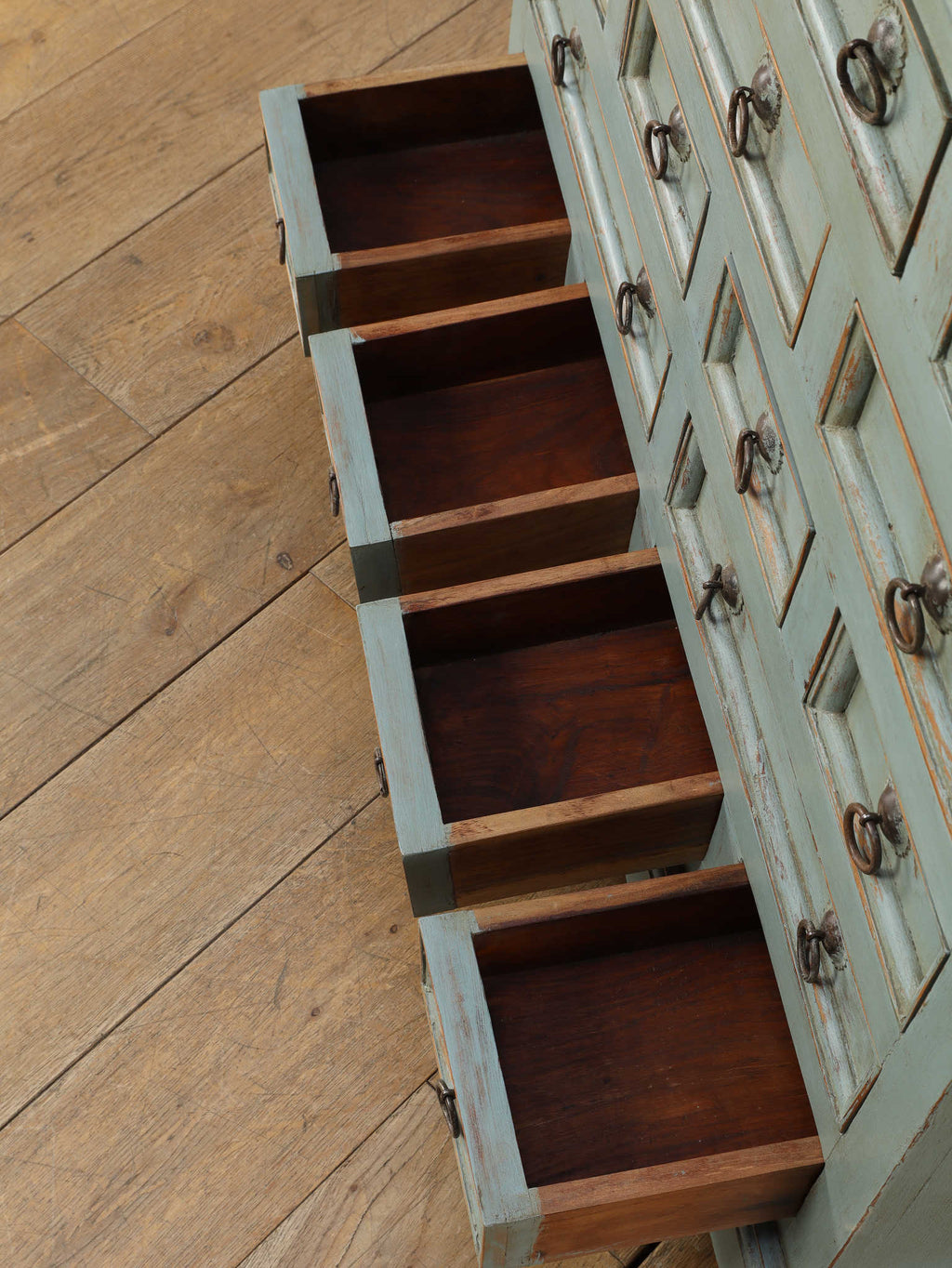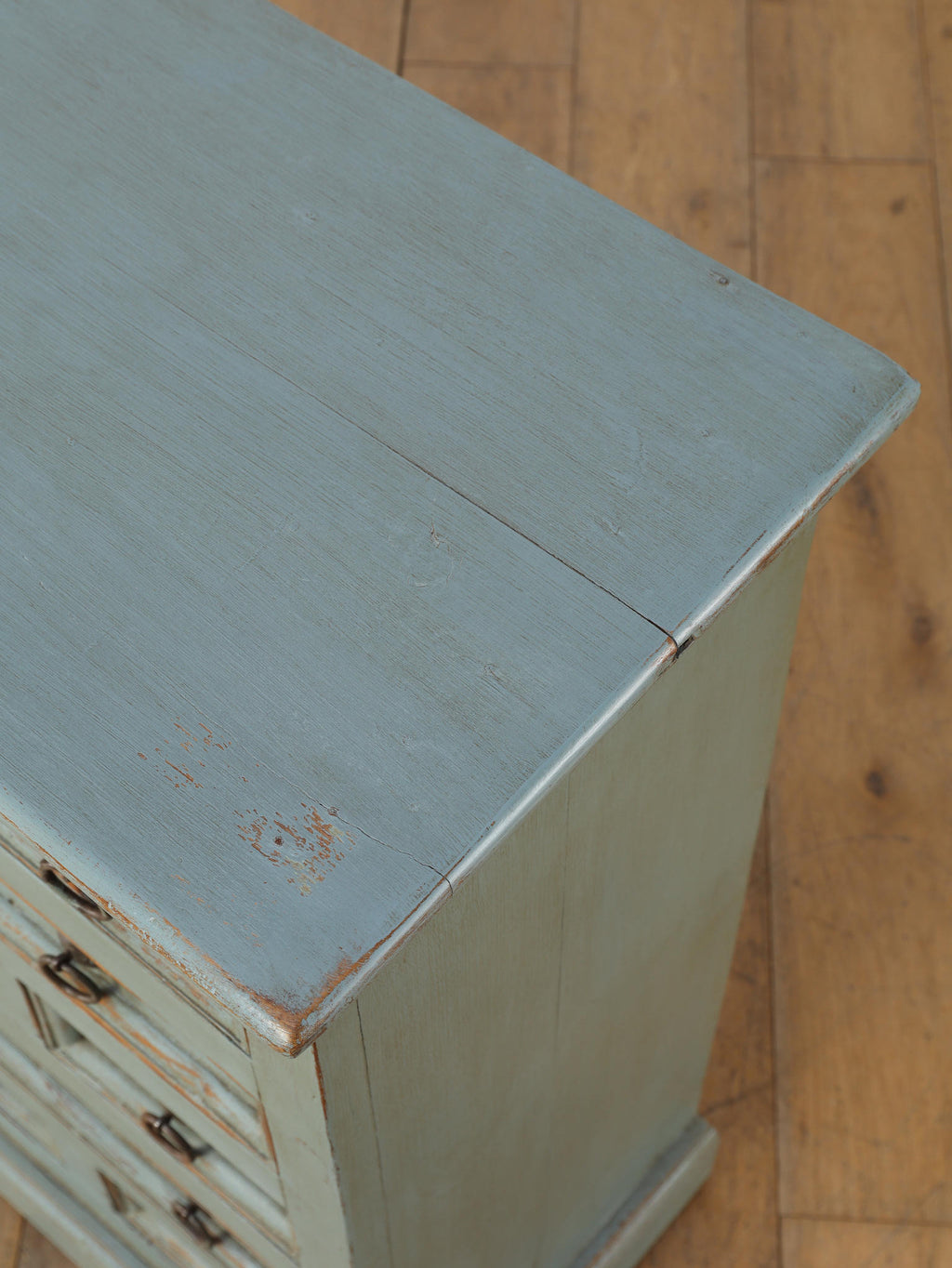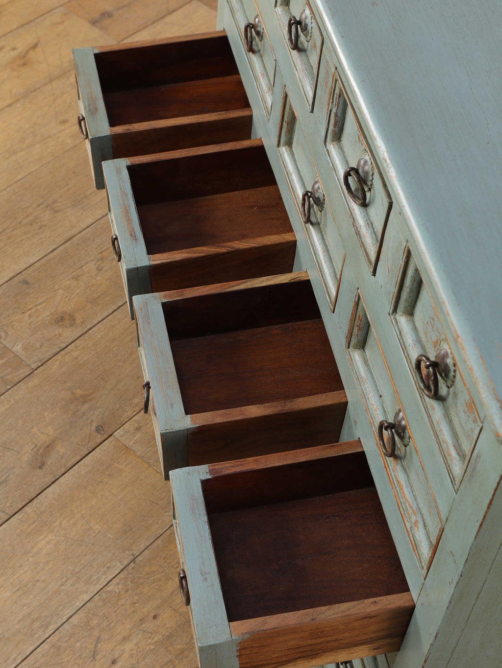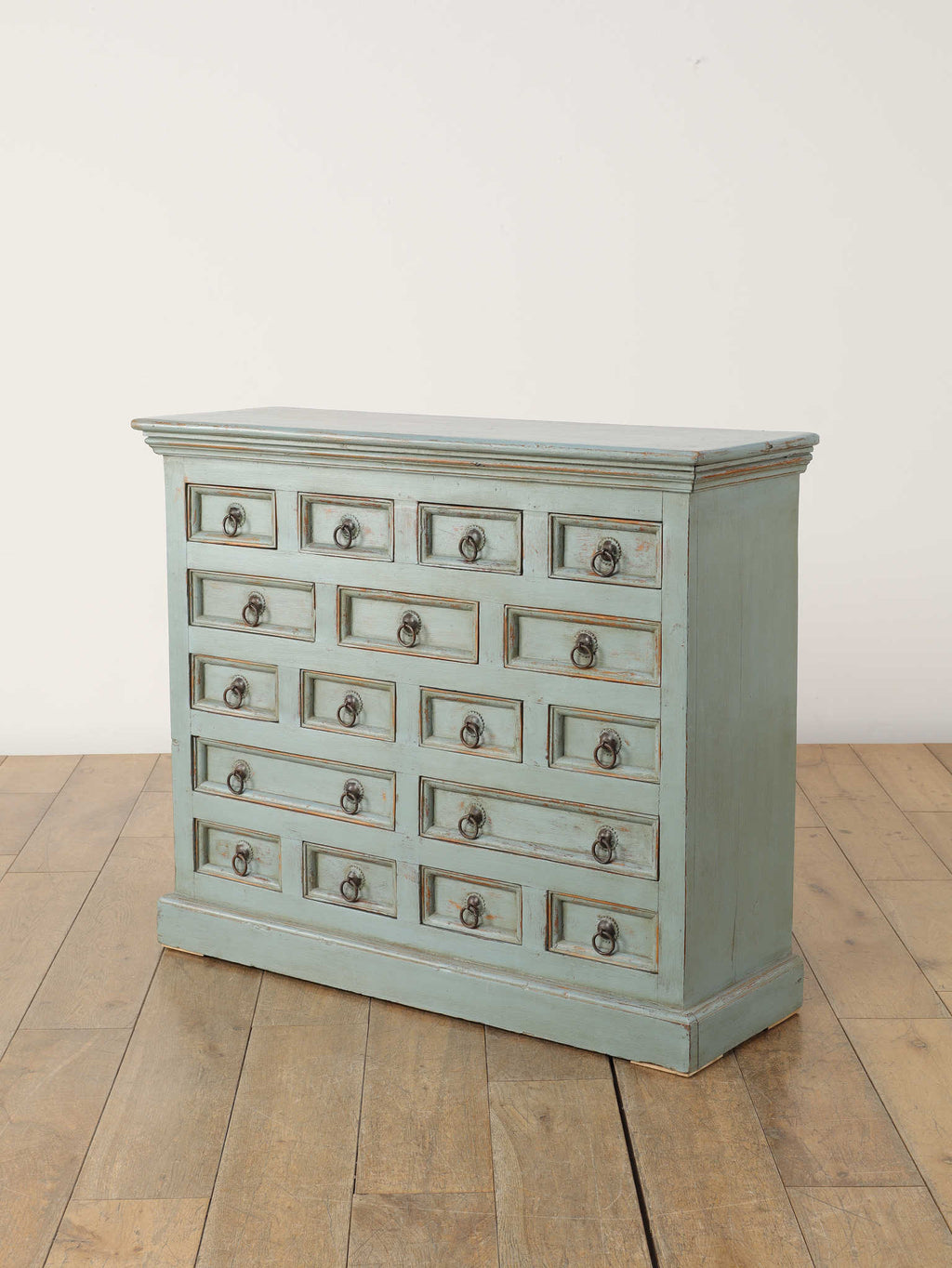程よいサイズ感が魅力的なチェスト。一番の魅力は、見る人をワクワクさせるような、小さなたくさんの抽斗が配置されたユニークなデザインでしょう。アクセサリーや文具、大切な小物など、細かく分けて収納できる実用性の高さと、まるで宝箱のような楽しさを兼ね備えています。表面は、時代を経て風合いを増したようなシャビーな質感のペイントが施されており、落ち着いた色合いでありながら、お部屋にスパイスのようなアクセントを加えてくれます。単なる収納家具としてだけでなく、その唯一無二のインテリア性により、空間の主役となること間違いなしです。収納力とデザイン性を両立した、遊び心あふれるチェストをぜひお手元にお迎えください。