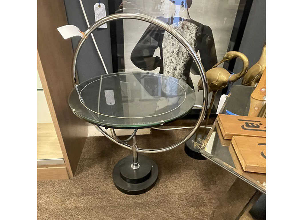 1940年代(推定)、英国製のグラストップコーヒーテーブルです。重厚な木製家具とは一線を画す、クールでモダンな佇まいが魅力です。素材には、当時注目されたクロムメタルとガラスが使用され、その無機質な輝きと透明感が、空間に洗練されたシャープな印象を与えます。最大の特徴は、まるで惑星の軌道やコンパスを思わせるような、幾何学的でユニークなフレームデザインです。円形のガラス天板を囲むメタルのラインが、そのまま脚部へと繋がり、ブラックのベースへと収束するフォルムは、アール・デコ期特有の美意識と遊び心を感じさせます。ガラスの天板は圧迫感がなく空間を広く見せる効果もあり、ソファサイドやラウンジチェアの横に置くだけで、まるで現代アートのような存在感を放つ、スタイリッシュな一台です。