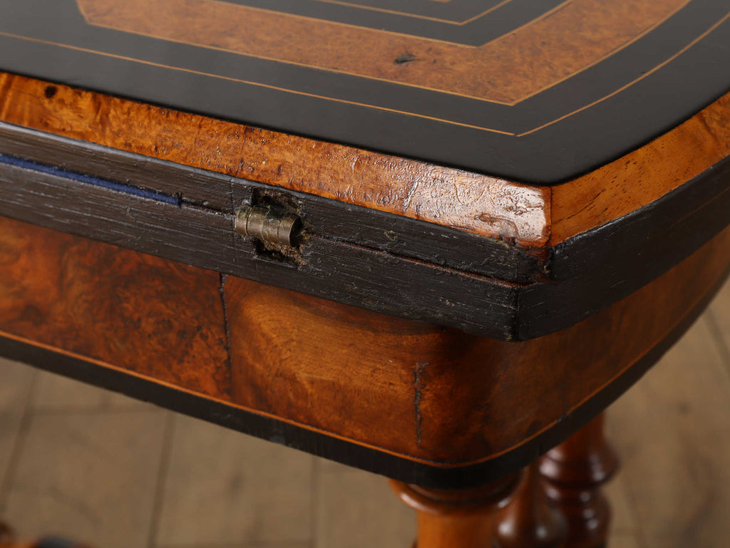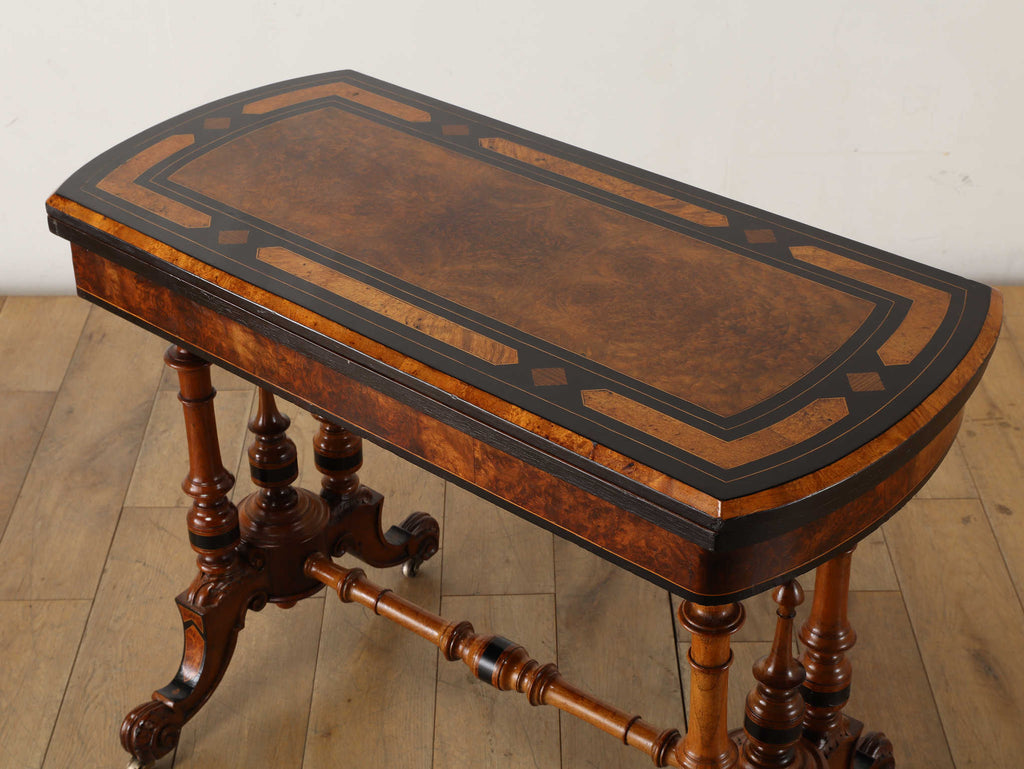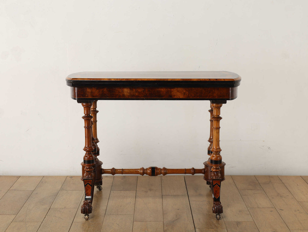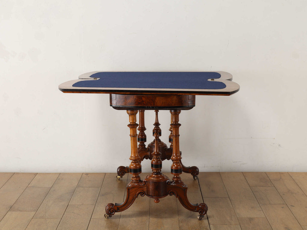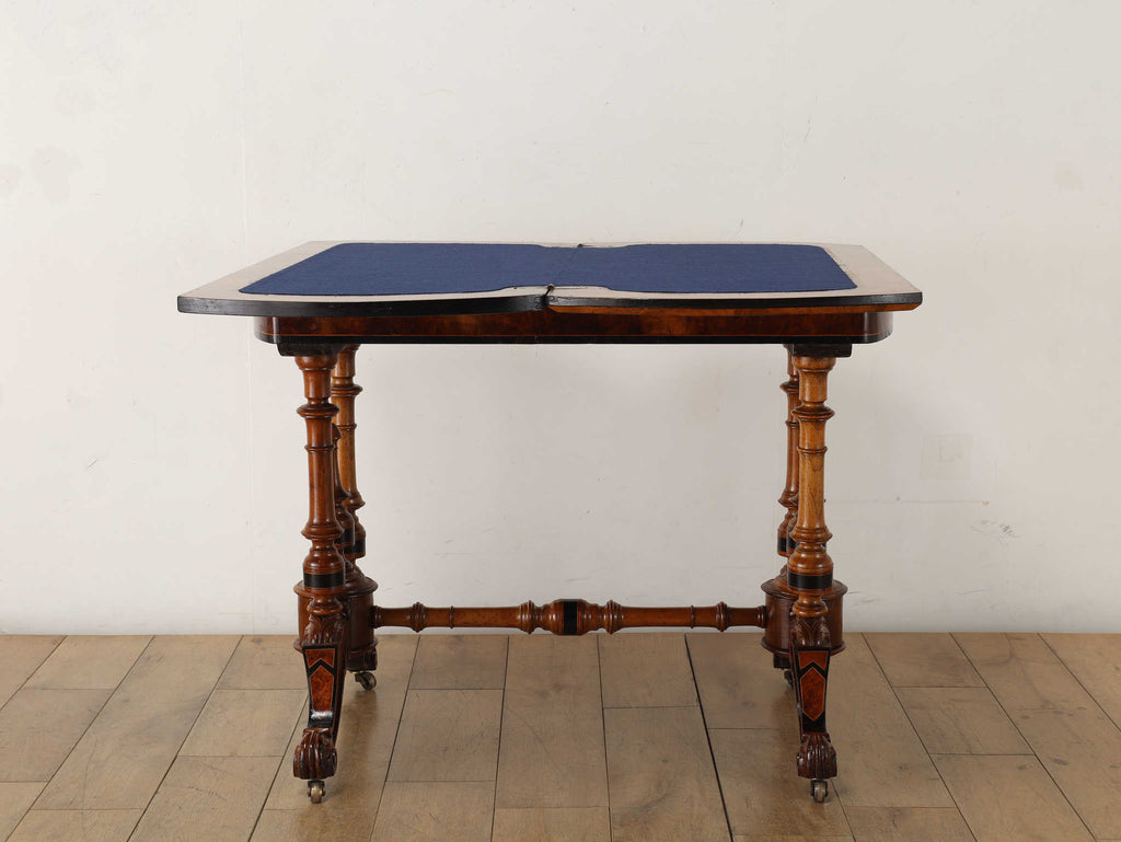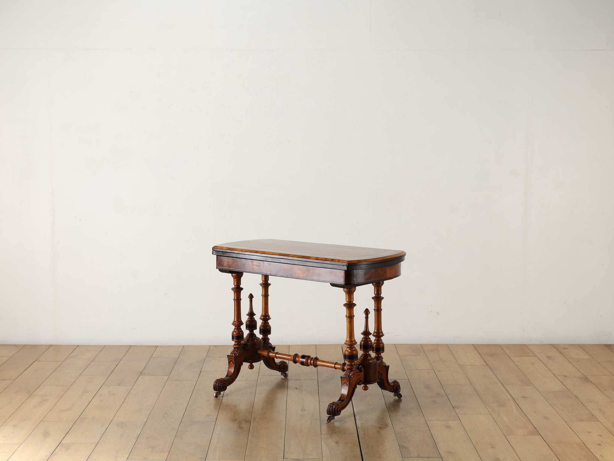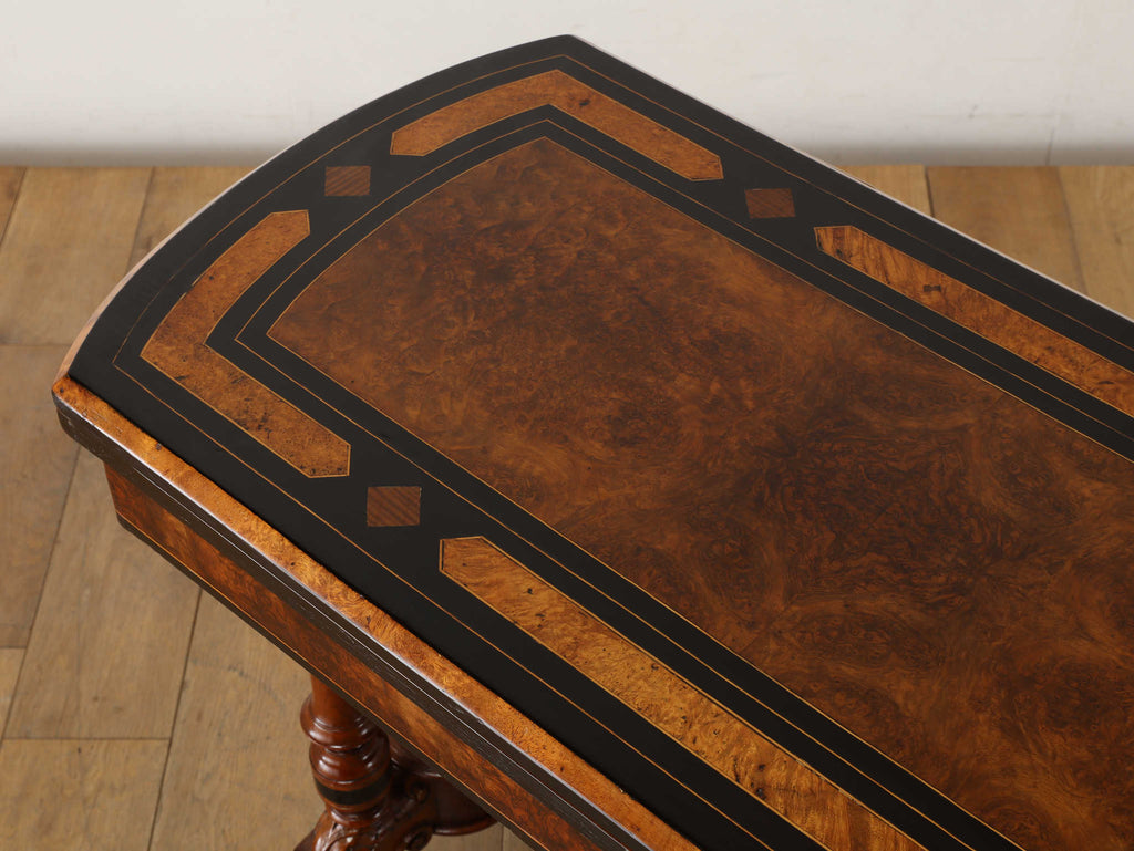 1860年代(推定)に英国でつくられた、希少なバールウォルナットのカードテーブルです。天板にはバールと呼ばれる、木材が長い年月をかけて生み出した複雑で美しい木目が、まるで絵画のように広がっています。その周囲を囲む、精緻な寄木細工は、当時の職人が持つ高度な技術と芸術的なセンスを物語っています。このテーブルの最大の魅力は、その優雅さと隠された機能性です。普段はコンソールテーブルとして玄関やリビングを華やかに彩りますが、天板を開くと、当時の貴族や紳士淑女たちがトランプゲームを楽しんだ、専用のフェルト地が現れます。このテーブルが、どのような夜会やサロンで使われ、どんな物語を見守ってきたのか、想像力を掻き立てられます。160年以上の時を経た今もなお、その姿は色褪せることなく、あなたの暮らしに深い物語と温もりを加えてくれるでしょう。このテーブルが、あなたの特別な時間をより豊かに彩ってくれるはずです。