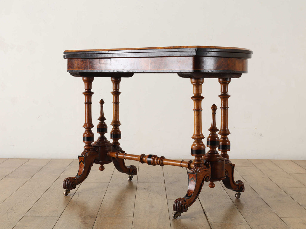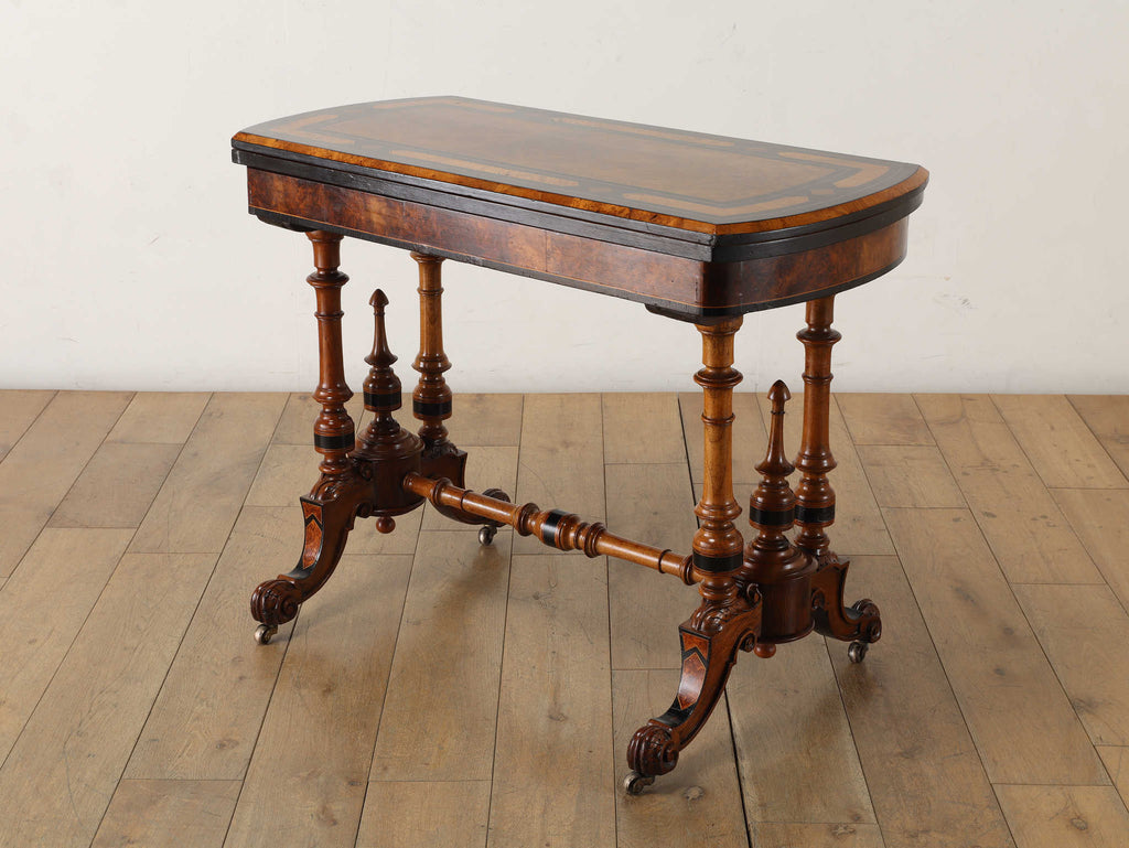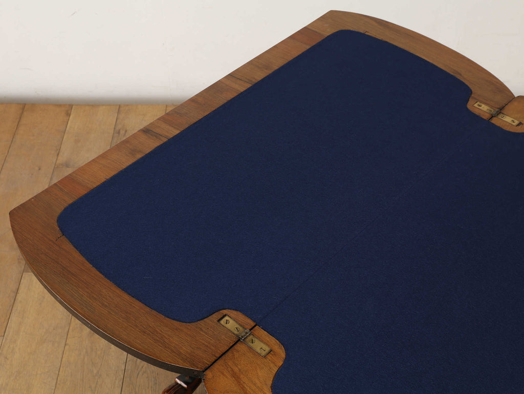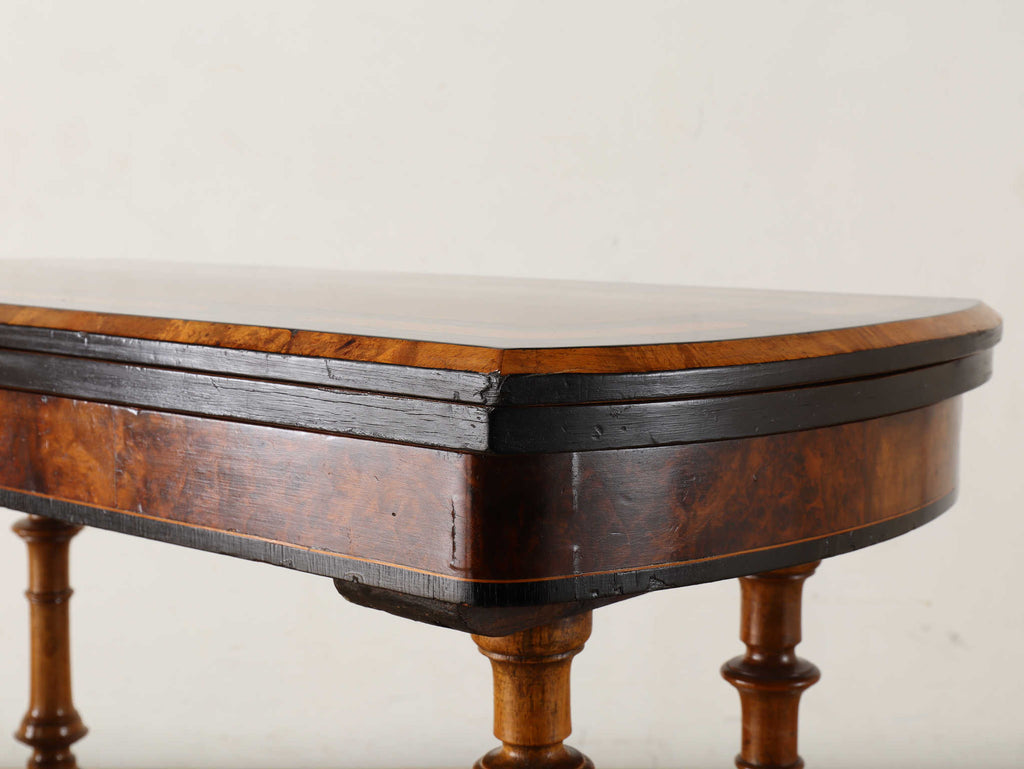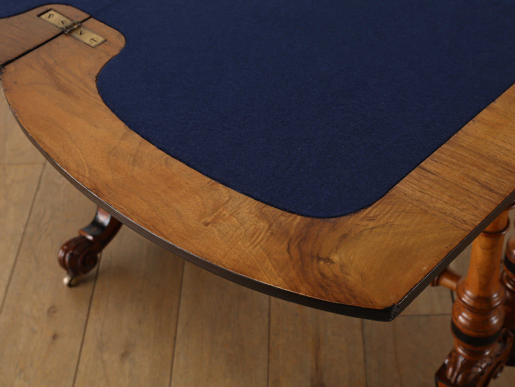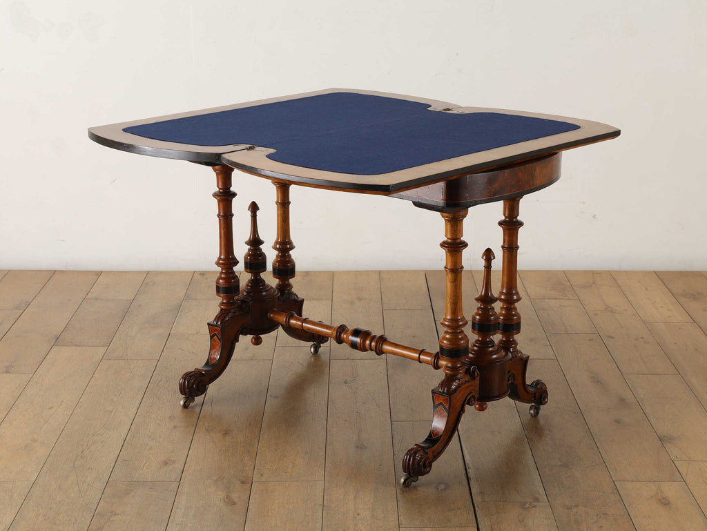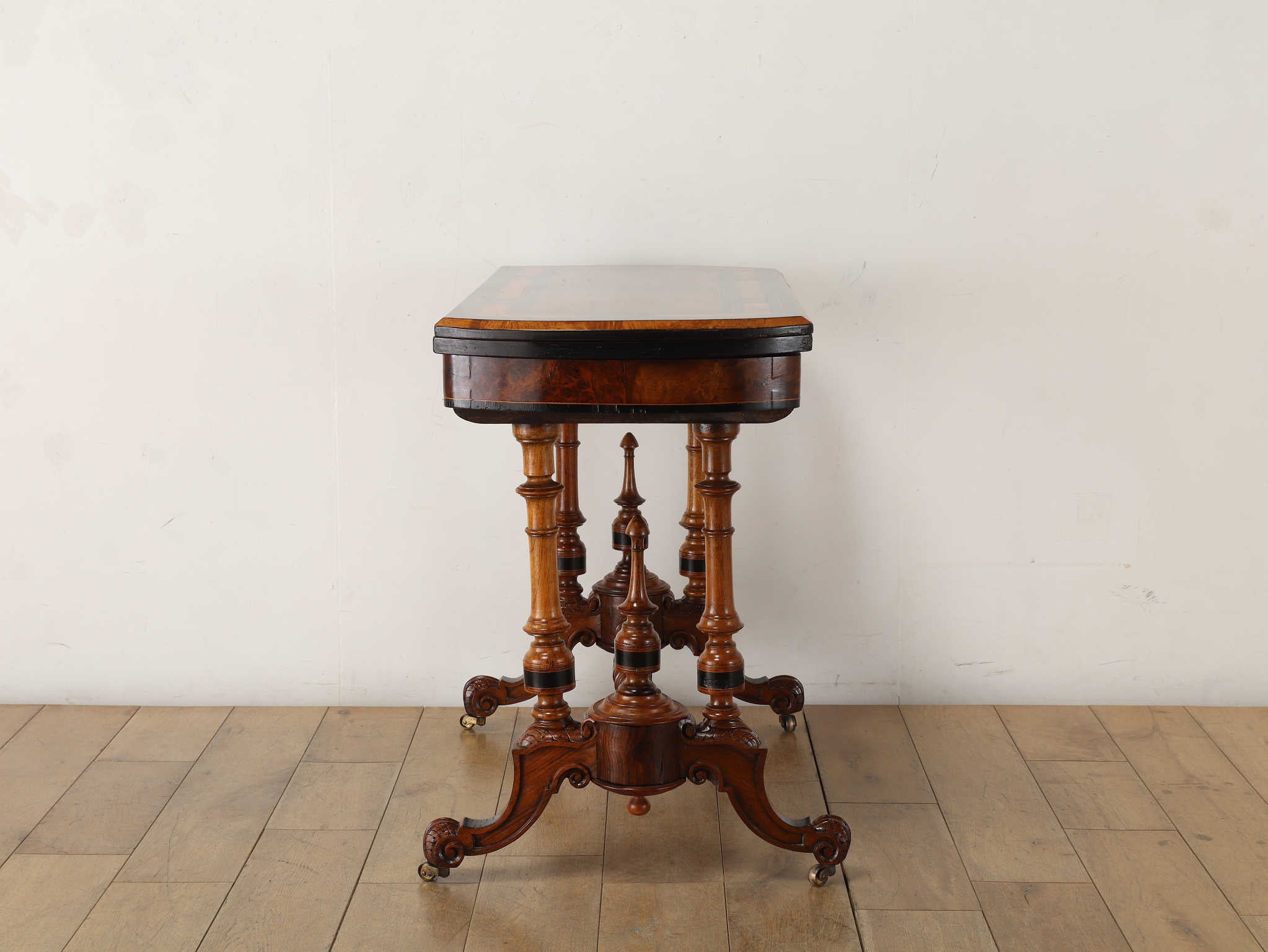 1860年代(推定)に英国でつくられた、希少なバールウォルナットのカードテーブルです。天板にはバールと呼ばれる、木材が長い年月をかけて生み出した複雑で美しい木目が、まるで絵画のように広がっています。その周囲を囲む、精緻な寄木細工は、当時の職人が持つ高度な技術と芸術的なセンスを物語っています。このテーブルの最大の魅力は、その優雅さと隠された機能性です。普段はコンソールテーブルとして玄関やリビングを華やかに彩りますが、天板を開くと、当時の貴族や紳士淑女たちがトランプゲームを楽しんだ、専用のフェルト地が現れます。このテーブルが、どのような夜会やサロンで使われ、どんな物語を見守ってきたのか、想像力を掻き立てられます。160年以上の時を経た今もなお、その姿は色褪せることなく、あなたの暮らしに深い物語と温もりを加えてくれるでしょう。このテーブルが、あなたの特別な時間をより豊かに彩ってくれるはずです。
