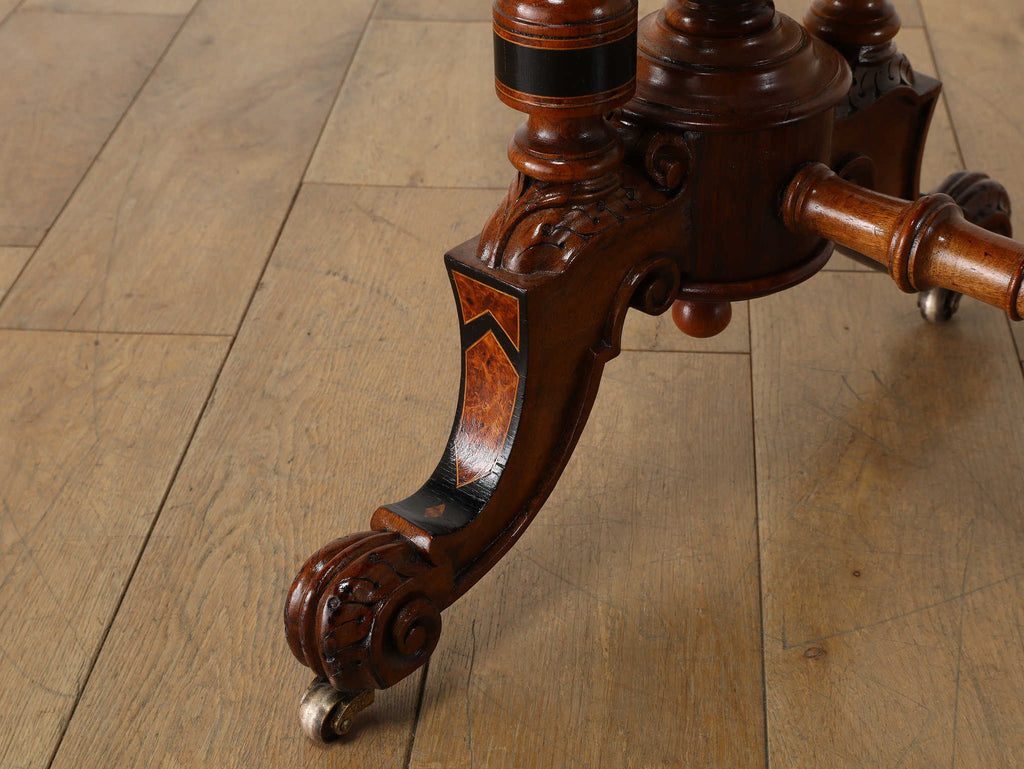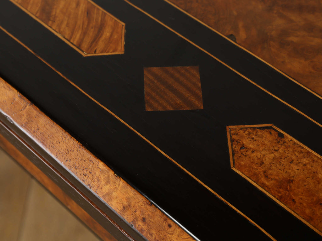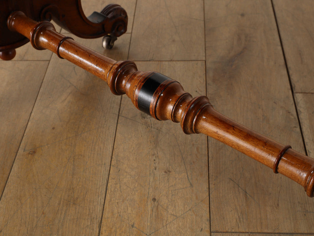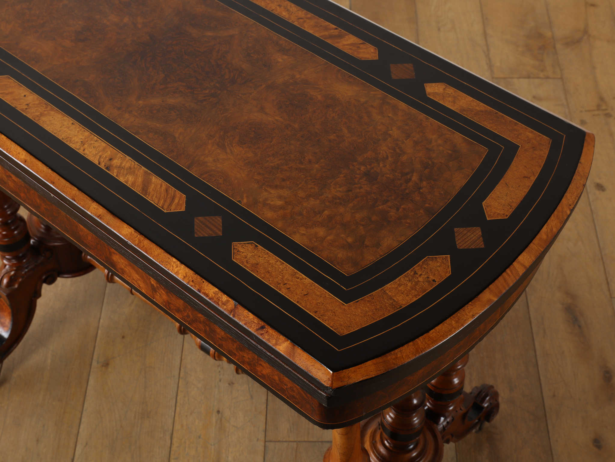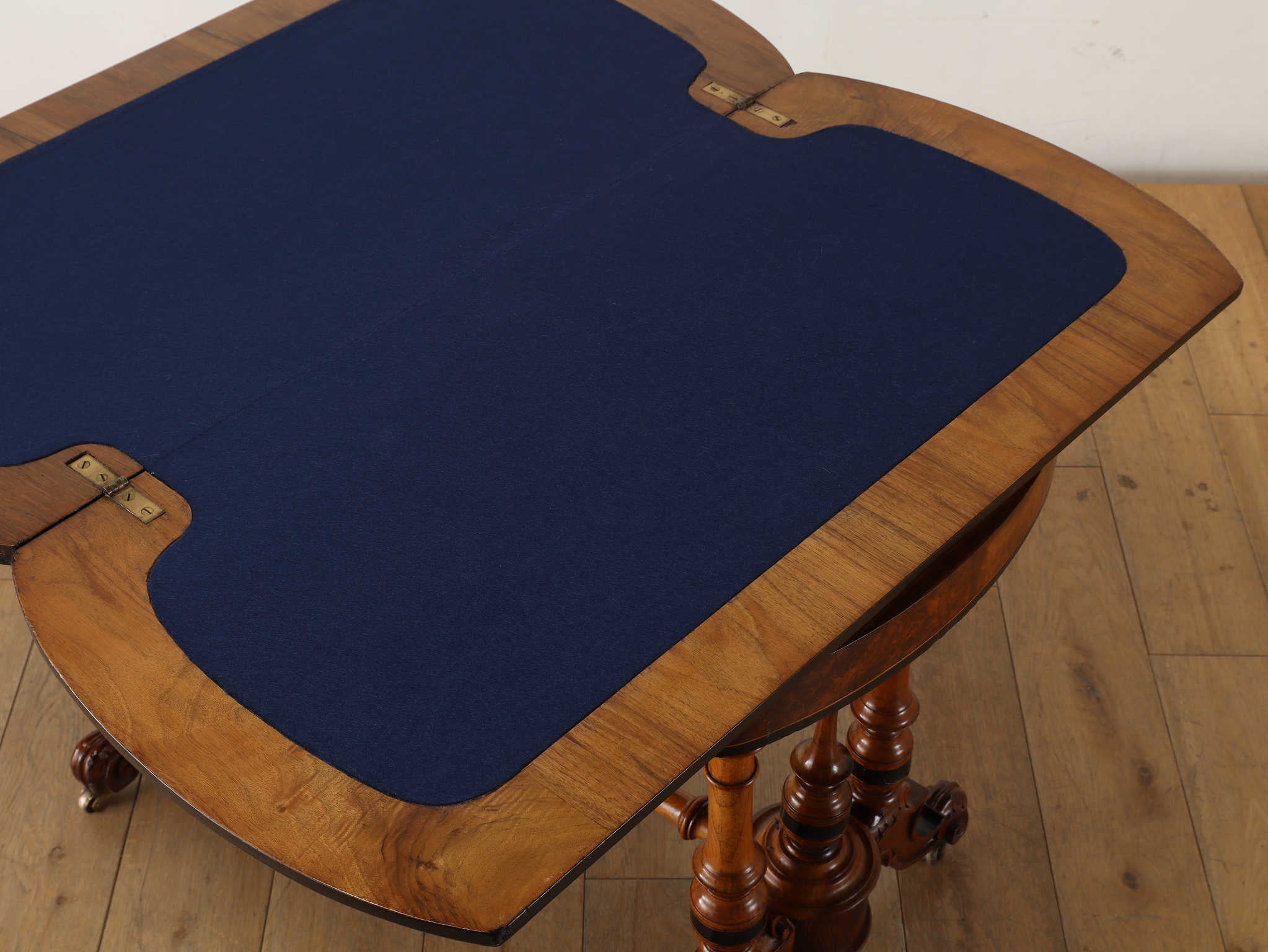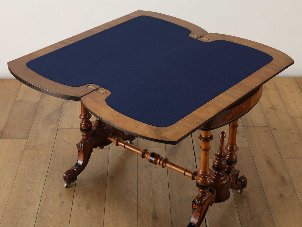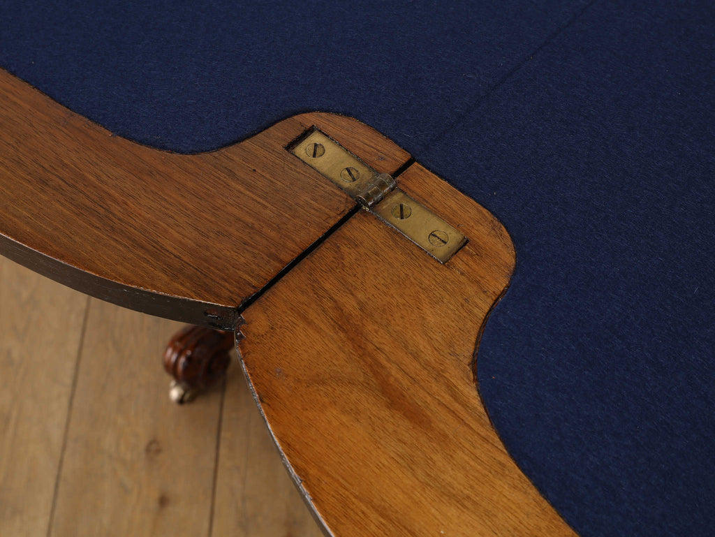 1860年代(推定)に英国でつくられた、希少なバールウォルナットのカードテーブルです。天板にはバールと呼ばれる、木材が長い年月をかけて生み出した複雑で美しい木目が、まるで絵画のように広がっています。その周囲を囲む、精緻な寄木細工は、当時の職人が持つ高度な技術と芸術的なセンスを物語っています。このテーブルの最大の魅力は、その優雅さと隠された機能性です。普段はコンソールテーブルとして玄関やリビングを華やかに彩りますが、天板を開くと、当時の貴族や紳士淑女たちがトランプゲームを楽しんだ、専用のフェルト地が現れます。このテーブルが、どのような夜会やサロンで使われ、どんな物語を見守ってきたのか、想像力を掻き立てられます。160年以上の時を経た今もなお、その姿は色褪せることなく、あなたの暮らしに深い物語と温もりを加えてくれるでしょう。このテーブルが、あなたの特別な時間をより豊かに彩ってくれるはずです。