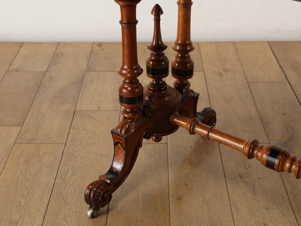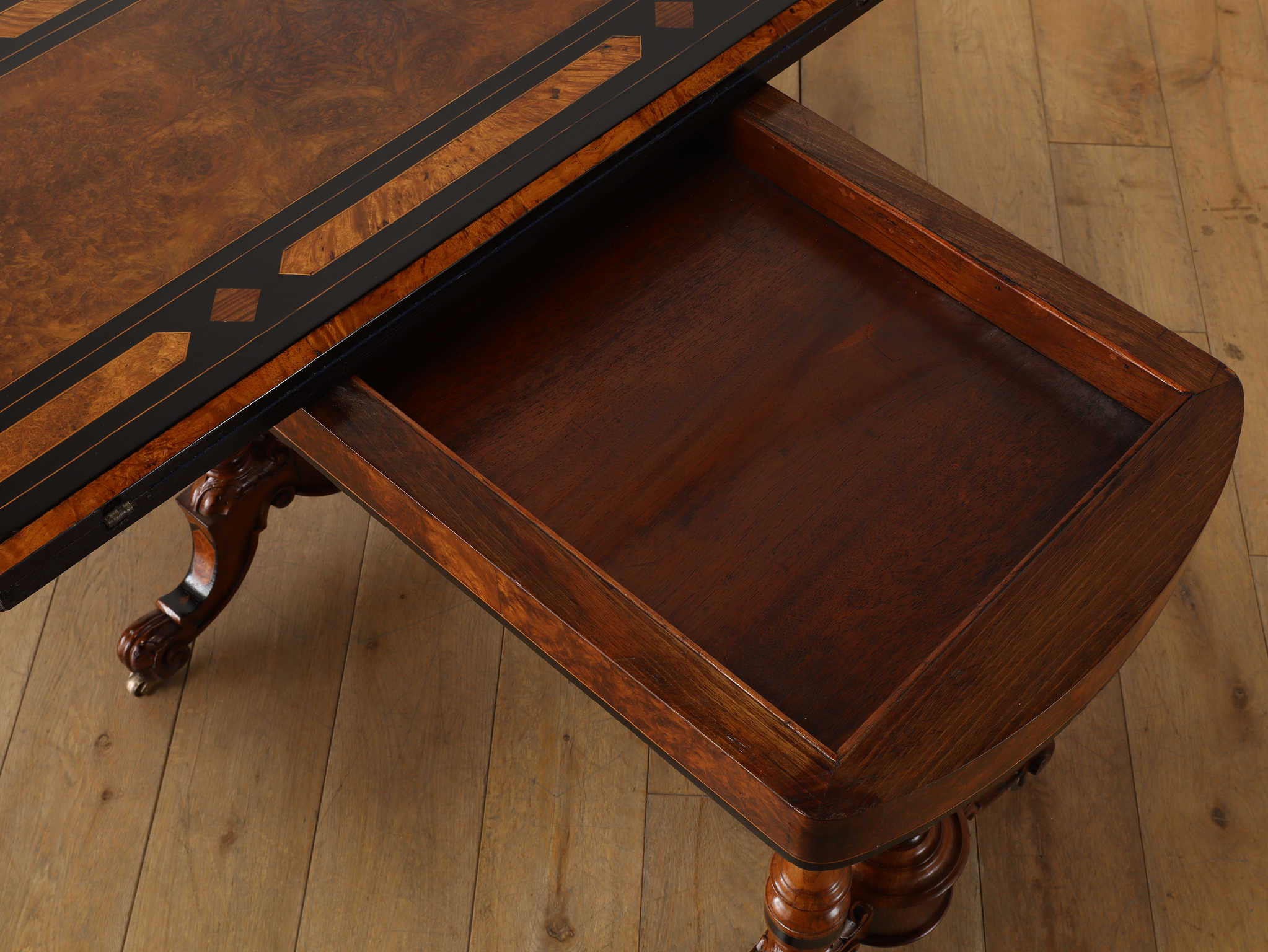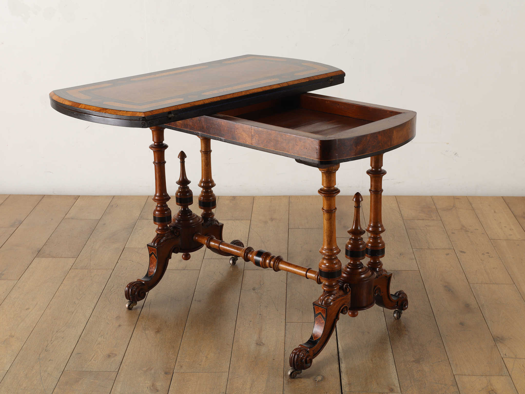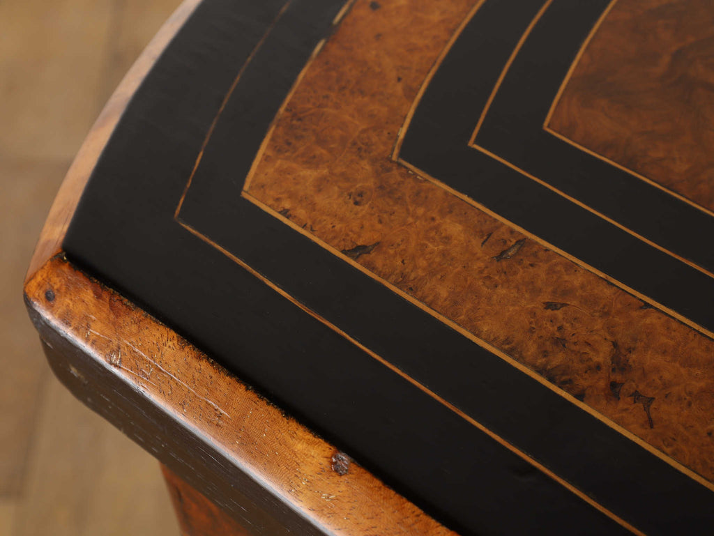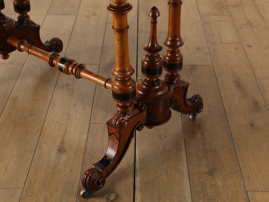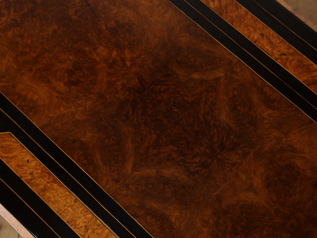 1860年代(推定)に英国でつくられた、希少なバールウォルナットのカードテーブルです。天板にはバールと呼ばれる、木材が長い年月をかけて生み出した複雑で美しい木目が、まるで絵画のように広がっています。その周囲を囲む、精緻な寄木細工は、当時の職人が持つ高度な技術と芸術的なセンスを物語っています。このテーブルの最大の魅力は、その優雅さと隠された機能性です。普段はコンソールテーブルとして玄関やリビングを華やかに彩りますが、天板を開くと、当時の貴族や紳士淑女たちがトランプゲームを楽しんだ、専用のフェルト地が現れます。このテーブルが、どのような夜会やサロンで使われ、どんな物語を見守ってきたのか、想像力を掻き立てられます。160年以上の時を経た今もなお、その姿は色褪せることなく、あなたの暮らしに深い物語と温もりを加えてくれるでしょう。このテーブルが、あなたの特別な時間をより豊かに彩ってくれるはずです。