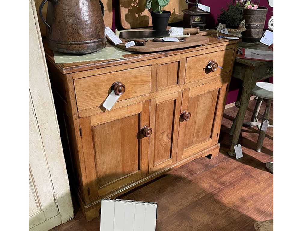 1890年代(推定)、英国製のファーマーズキャビネットです。 素朴で優しい表情が魅力のパイン材が使用され、長い年月を経て味わい深い飴色へと変化した木肌からは、自然素材ならではの温もりが伝わってきます。ファーマーズの名が示す通り、日々の暮らしの中で使われることを想定した、シンプルで飾らないデザインが特徴です。ころんとした愛らしい木製の取っ手や、扉の素朴なパネル装飾が、英国カントリー家具らしい牧歌的な雰囲気を醸し出しています。上段にはカトラリーや小物をしまえる2杯の抽斗、下段にはたっぷりと収納できるキャビネットを備え、収納家具としての実用性も抜群です。キッチンで食器棚として、あるいはリビングで日用品をすっきりと収めるサイドボードとして。陶器やドライフラワー、アンティーク雑貨との相性も良く、空間にほっとするような安らぎと穏やかな時間を運んでくれる一台です。
