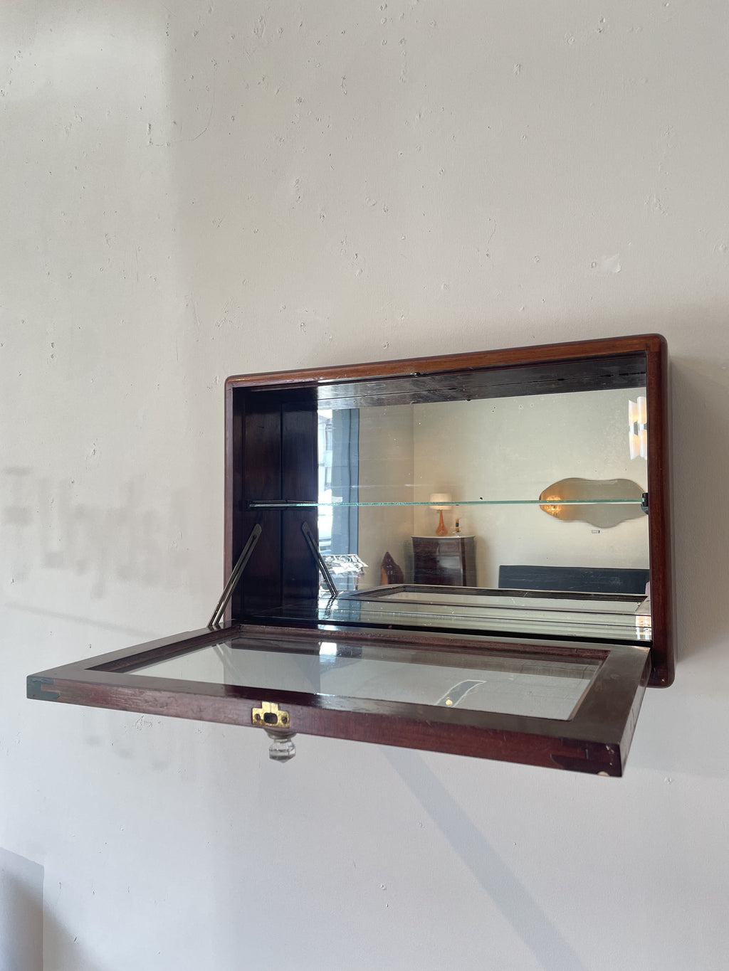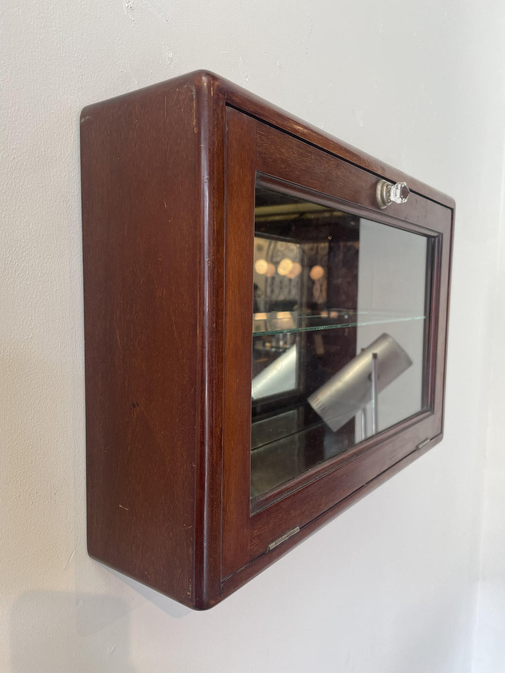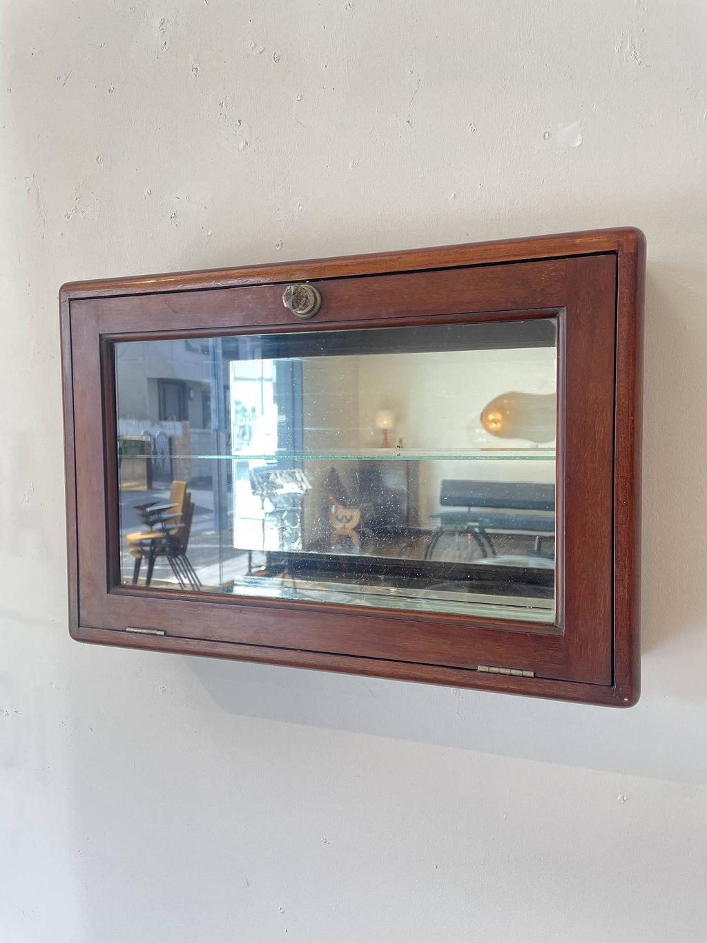 1910年代(推定)に英国で製作された、重厚なマホガニー材のウォールキャビネットです。当時の職人が丁寧に仕上げた深い色合いと、シンプルでありながらも洗練されたデザインが、このキャビネットに特別な風格を与えています。ガラス扉を開けると、そこにはお気に入りのコレクションや大切な品々を飾るための空間が広がっています。書斎でパイプや時計を、リビングで小さなオブジェを、あるいは寝室でジュエリーを飾るなど、使い方はあなたのアイデア次第です。