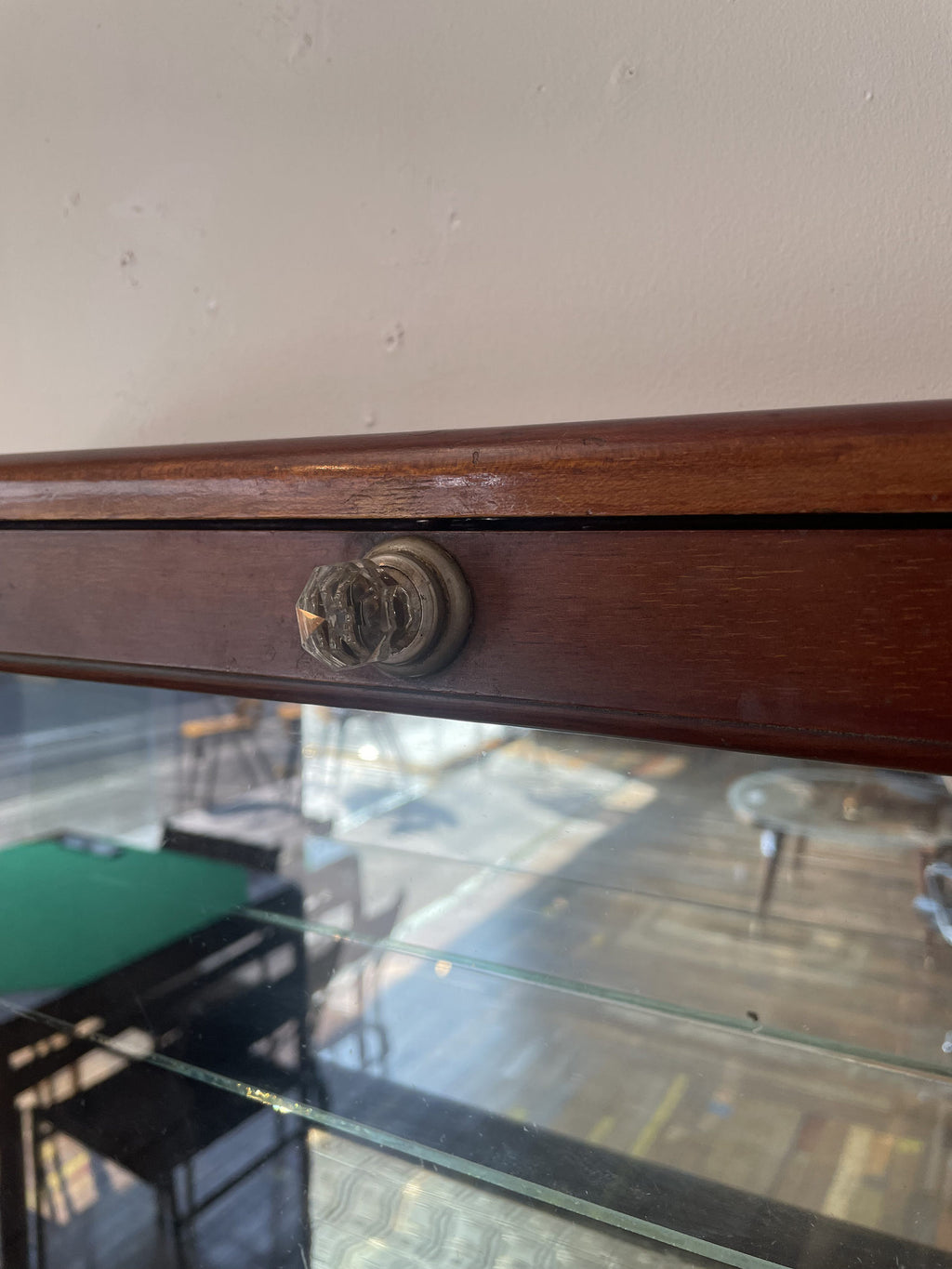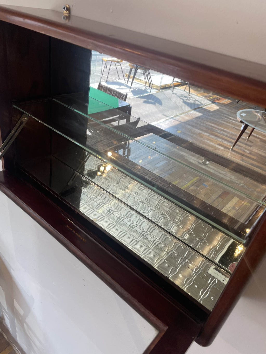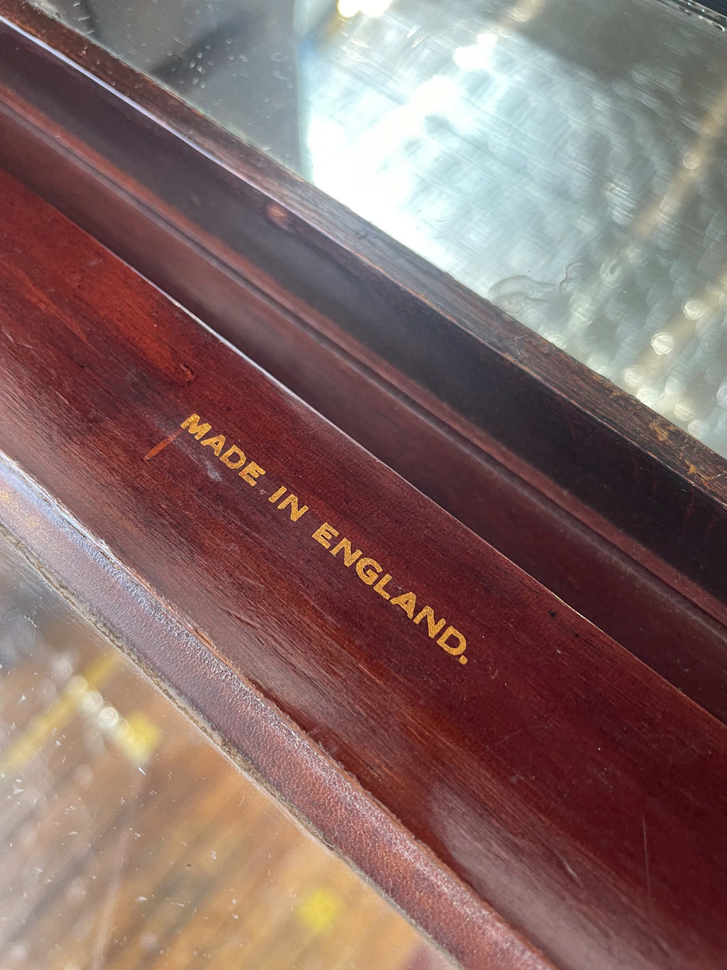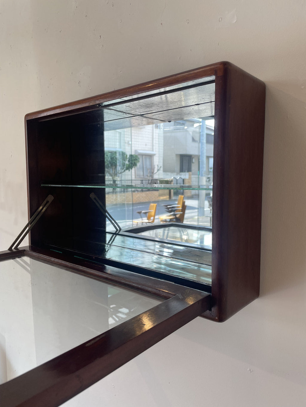 1910年代(推定)に英国で製作された、重厚なマホガニー材のウォールキャビネットです。当時の職人が丁寧に仕上げた深い色合いと、シンプルでありながらも洗練されたデザインが、このキャビネットに特別な風格を与えています。ガラス扉を開けると、そこにはお気に入りのコレクションや大切な品々を飾るための空間が広がっています。書斎でパイプや時計を、リビングで小さなオブジェを、あるいは寝室でジュエリーを飾るなど、使い方はあなたのアイデア次第です。