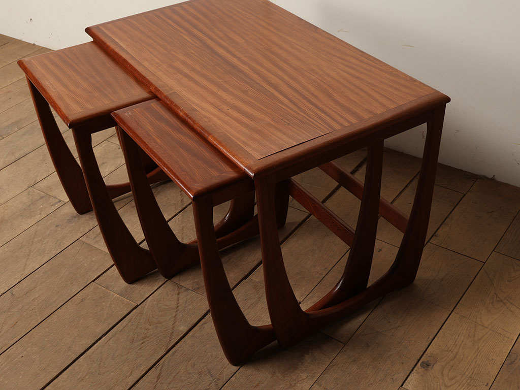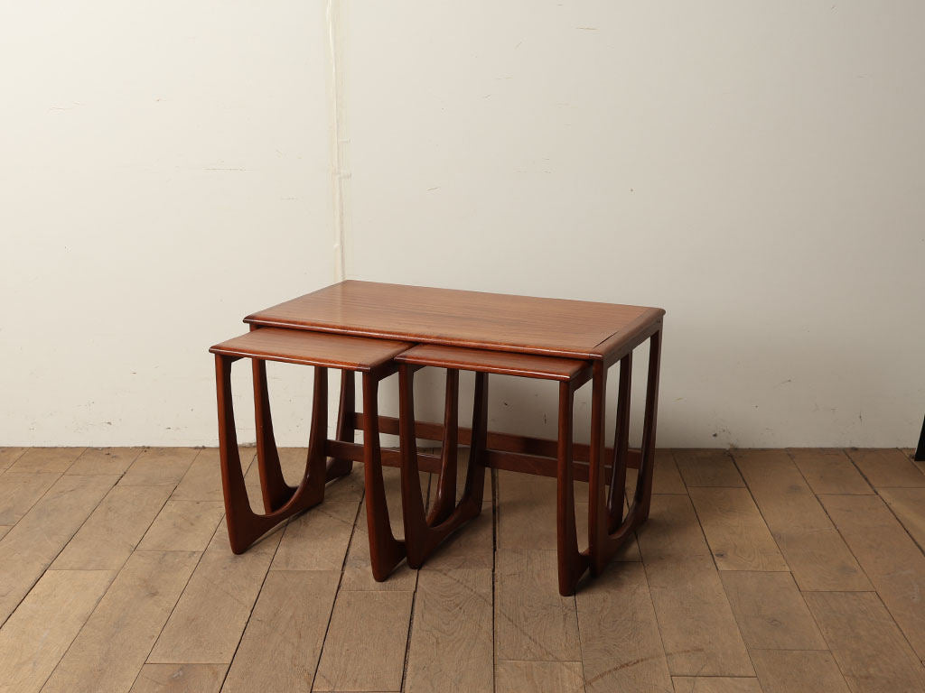 英国老舗家具メーカーE.Gomme社が発表した人気シリーズのG-PLANのフレスコシリーズ。G-PLANは、ダイニングからストレージ、そしてソファ類に至るまでのプロダクトをラインナップしており、空間をトータルコーディネートできる画期的なアプローチで人気を博しました。こちらはその中のラインナップの一つであるネストテーブル。同時シリーズだけでも数種類のネストテーブルが存在しておりますが、こちらはメインのテーブルから同サイズのテーブル×2という構成。通常、3つのサイズでデザインされるパターンが多いですが、メインのコーヒーテーブルと、その他サイドテーブルといった形式で、とても使用しやすいサイズバランスになっております。UKビンテージの定番として人気の高いG-PLANですが、年々数も減り、マーケットプライスも上がってきているのが実際です。是非、G-PLANのある日常を、楽しんでみてはいかがでしょうか。
