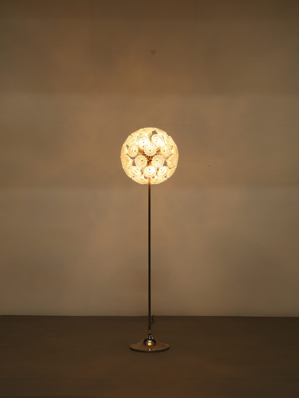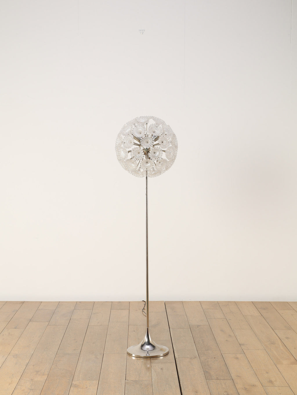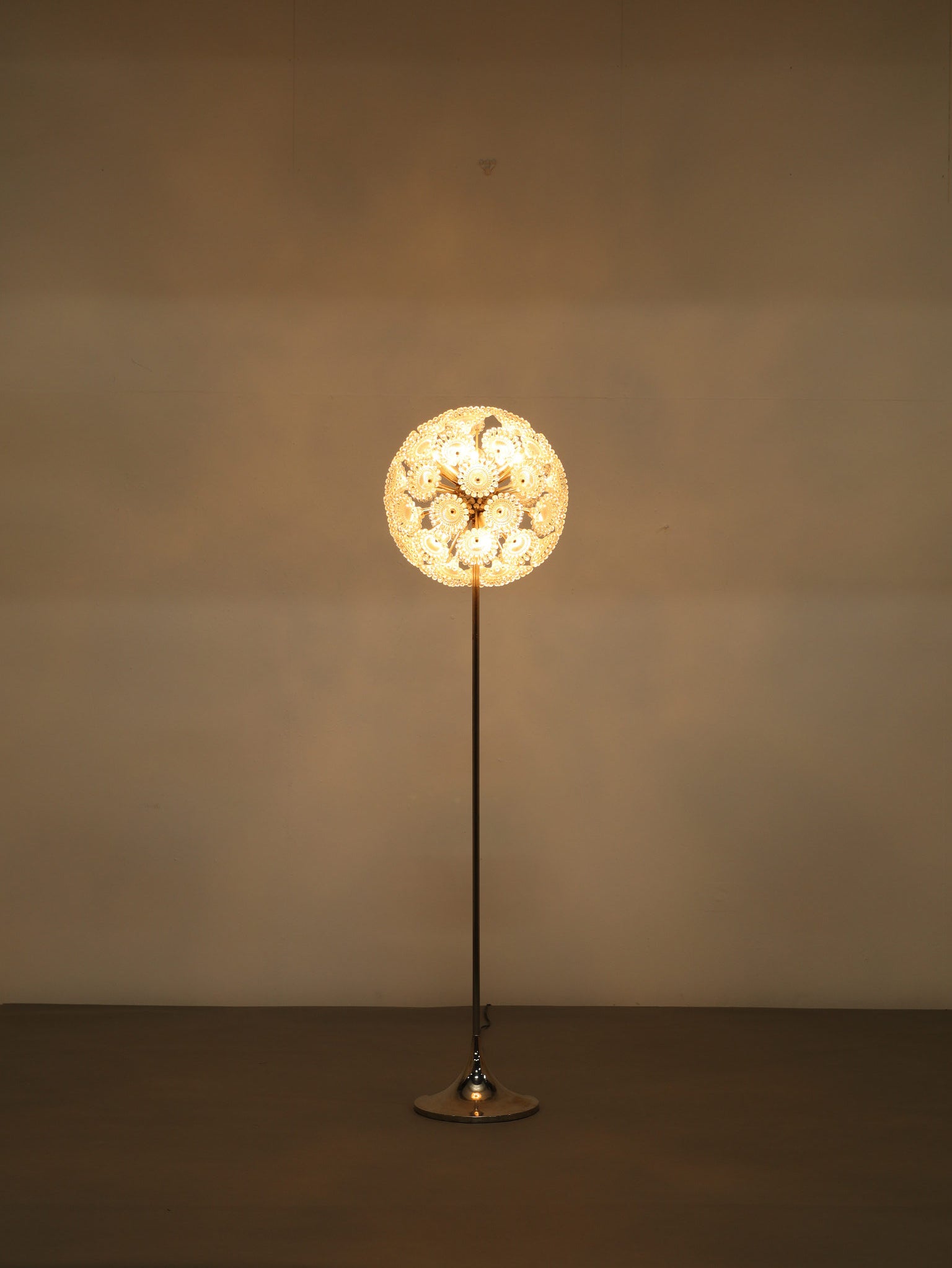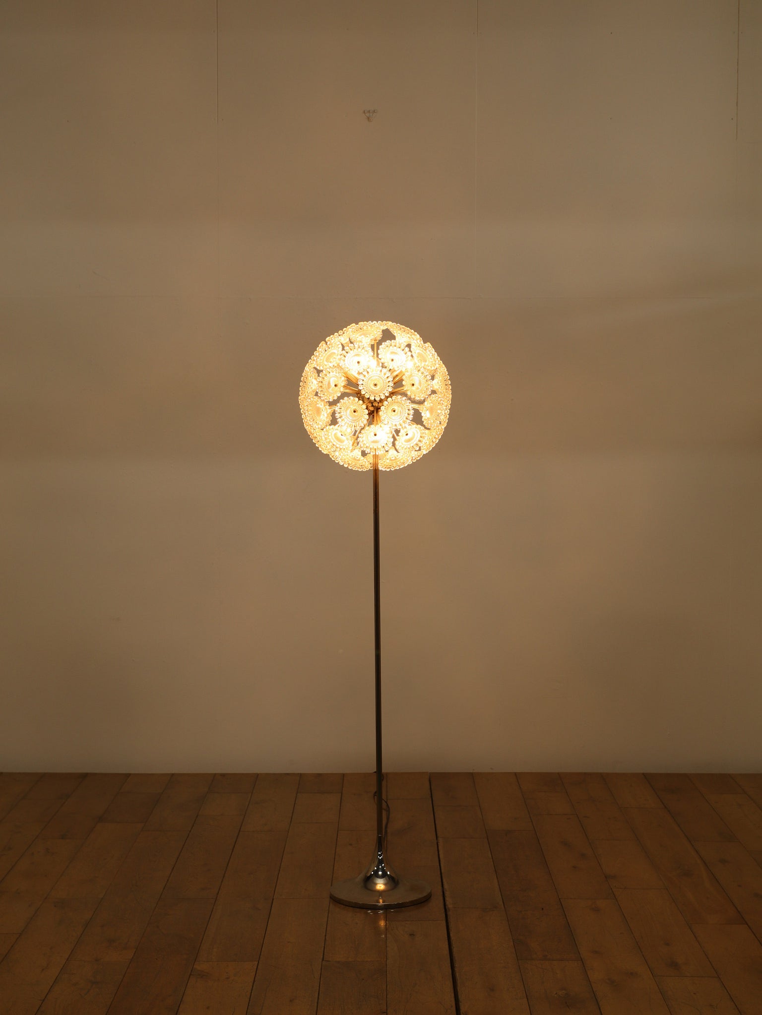 ドイツの照明ブランドSolken Leuchtenが手掛けた、光の芸術品とも呼べるフロアランプ。最大の特徴は、無数のテクスチャールーサイトが放射状に広がる、まるで「タンポポの綿毛」や「氷の結晶」を思わせる幻想的なシェード。スイッチを入れた瞬間、壁や天井に広がる複雑で美しい陰影は息をのむほどで、部屋の空気を一変させます。スペースエイジを象徴するクロームの輝きと、繊細なガラスの煌めき。昼は洗練されたオブジェとして、夜は幻想的な光の演出家として、リビングをドラマチックに彩ります。