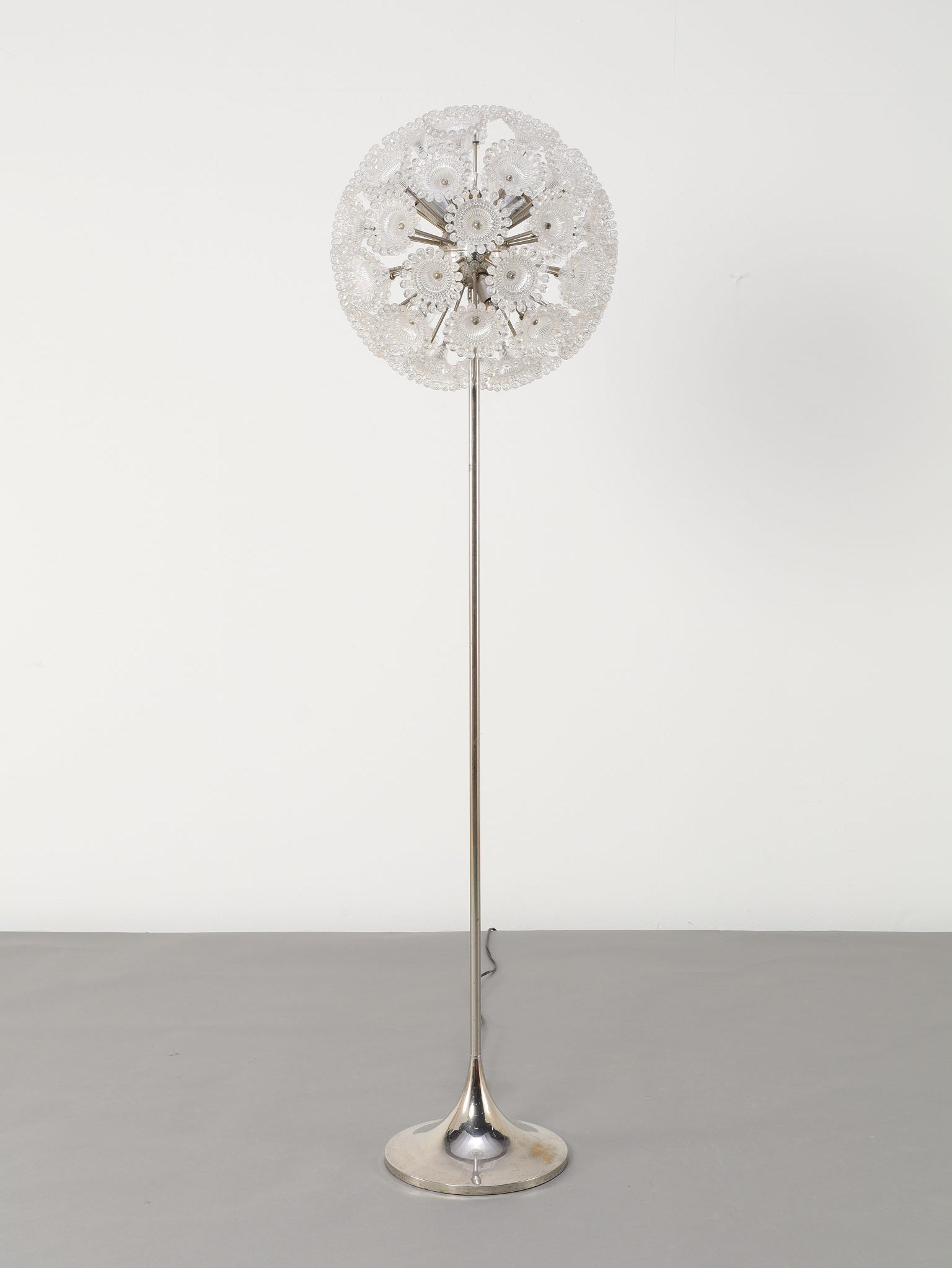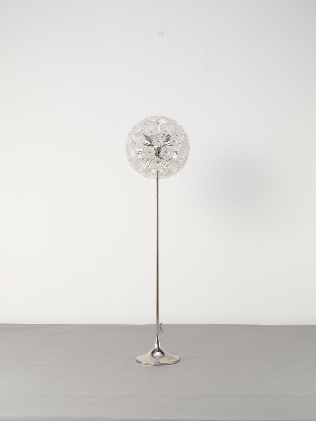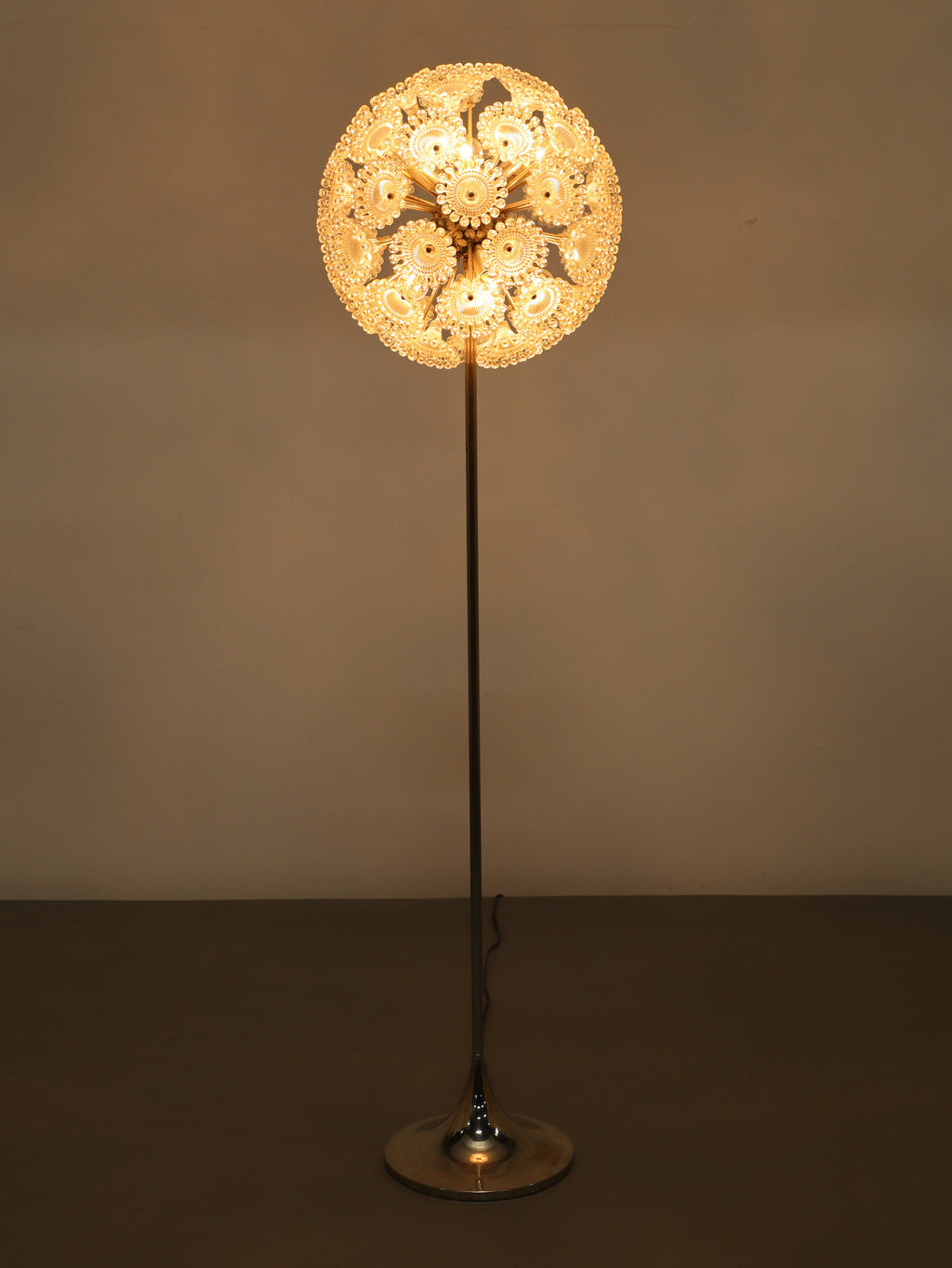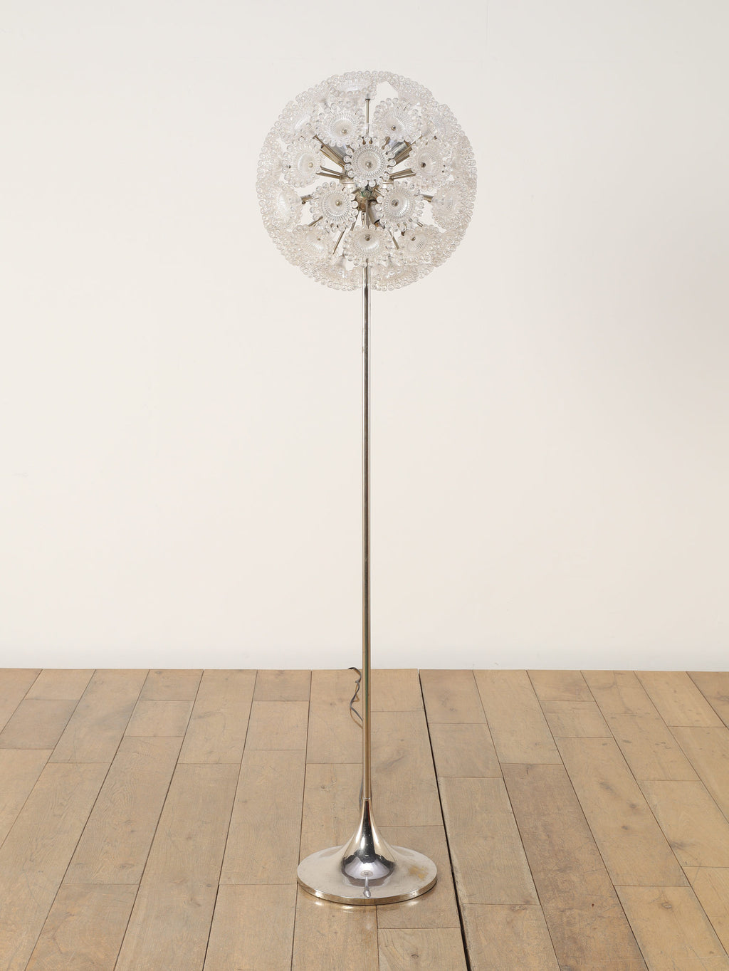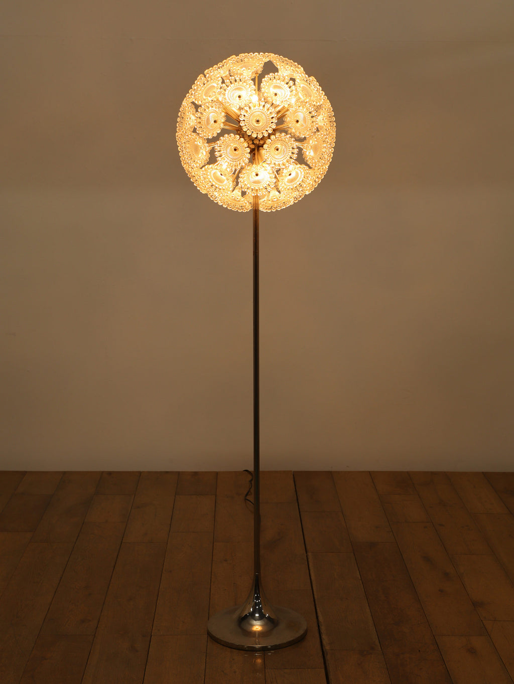 ドイツの照明ブランドSolken Leuchtenが手掛けた、光の芸術品とも呼べるフロアランプ。最大の特徴は、無数のテクスチャールーサイトが放射状に広がる、まるで「タンポポの綿毛」や「氷の結晶」を思わせる幻想的なシェード。スイッチを入れた瞬間、壁や天井に広がる複雑で美しい陰影は息をのむほどで、部屋の空気を一変させます。スペースエイジを象徴するクロームの輝きと、繊細なガラスの煌めき。昼は洗練されたオブジェとして、夜は幻想的な光の演出家として、リビングをドラマチックに彩ります。