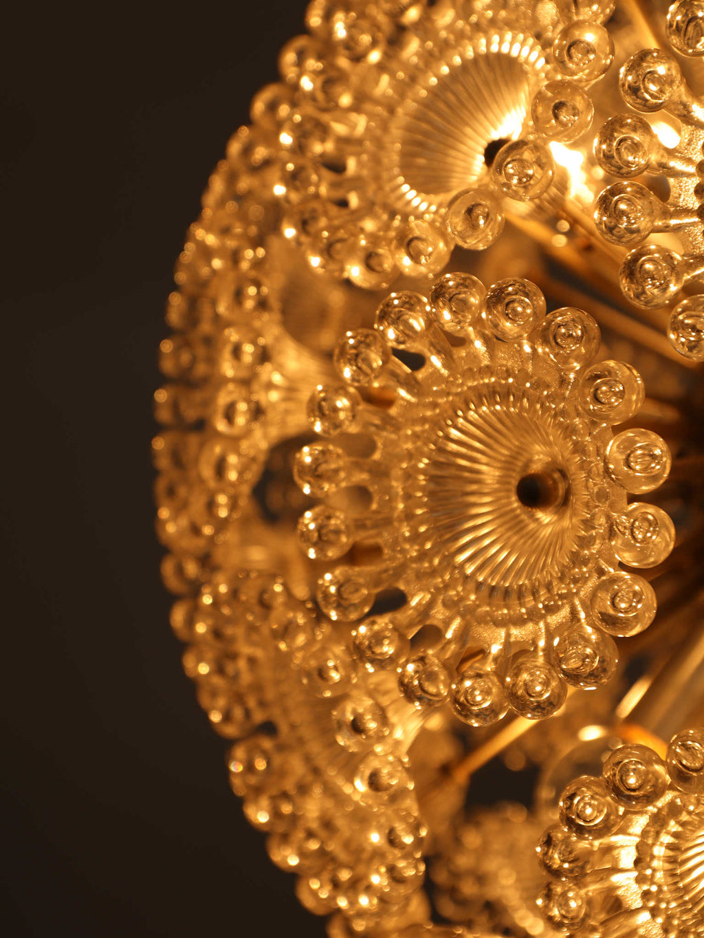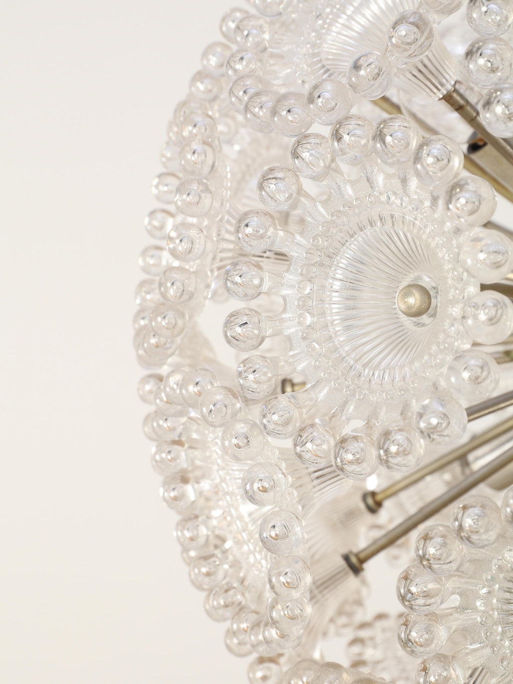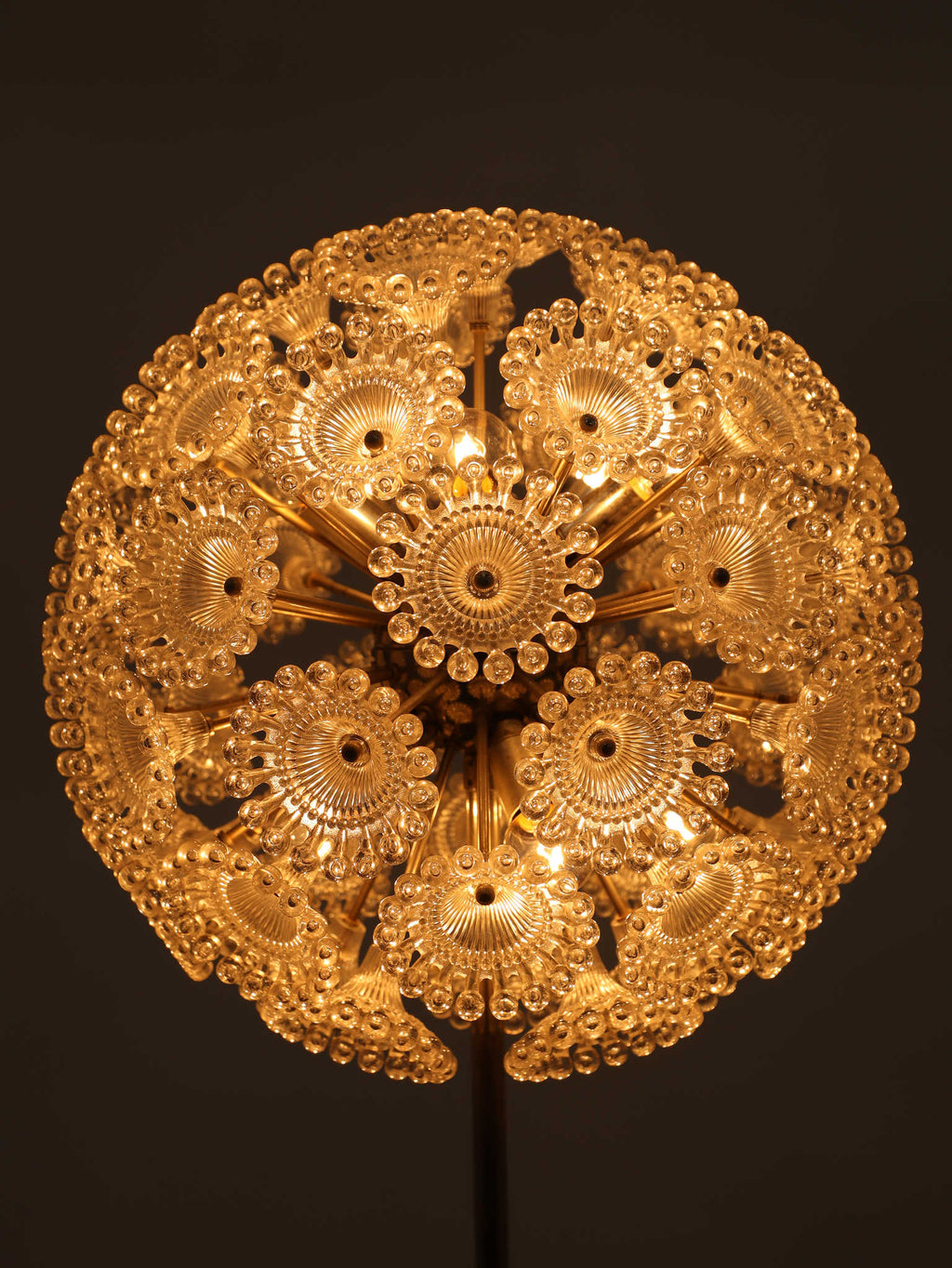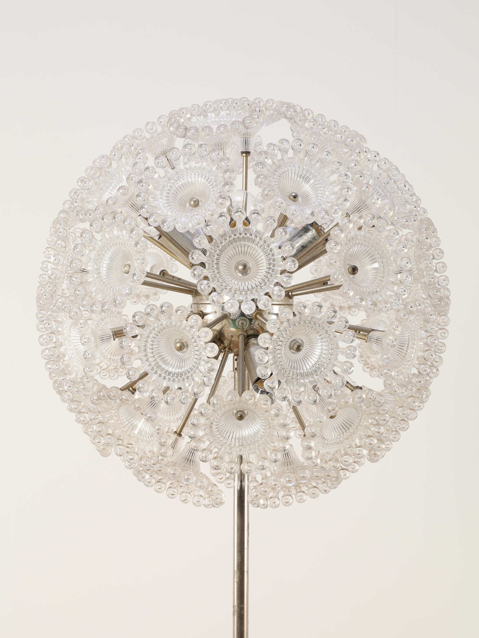 ドイツの照明ブランドSolken Leuchtenが手掛けた、光の芸術品とも呼べるフロアランプ。最大の特徴は、無数のテクスチャールーサイトが放射状に広がる、まるで「タンポポの綿毛」や「氷の結晶」を思わせる幻想的なシェード。スイッチを入れた瞬間、壁や天井に広がる複雑で美しい陰影は息をのむほどで、部屋の空気を一変させます。スペースエイジを象徴するクロームの輝きと、繊細なガラスの煌めき。昼は洗練されたオブジェとして、夜は幻想的な光の演出家として、リビングをドラマチックに彩ります。