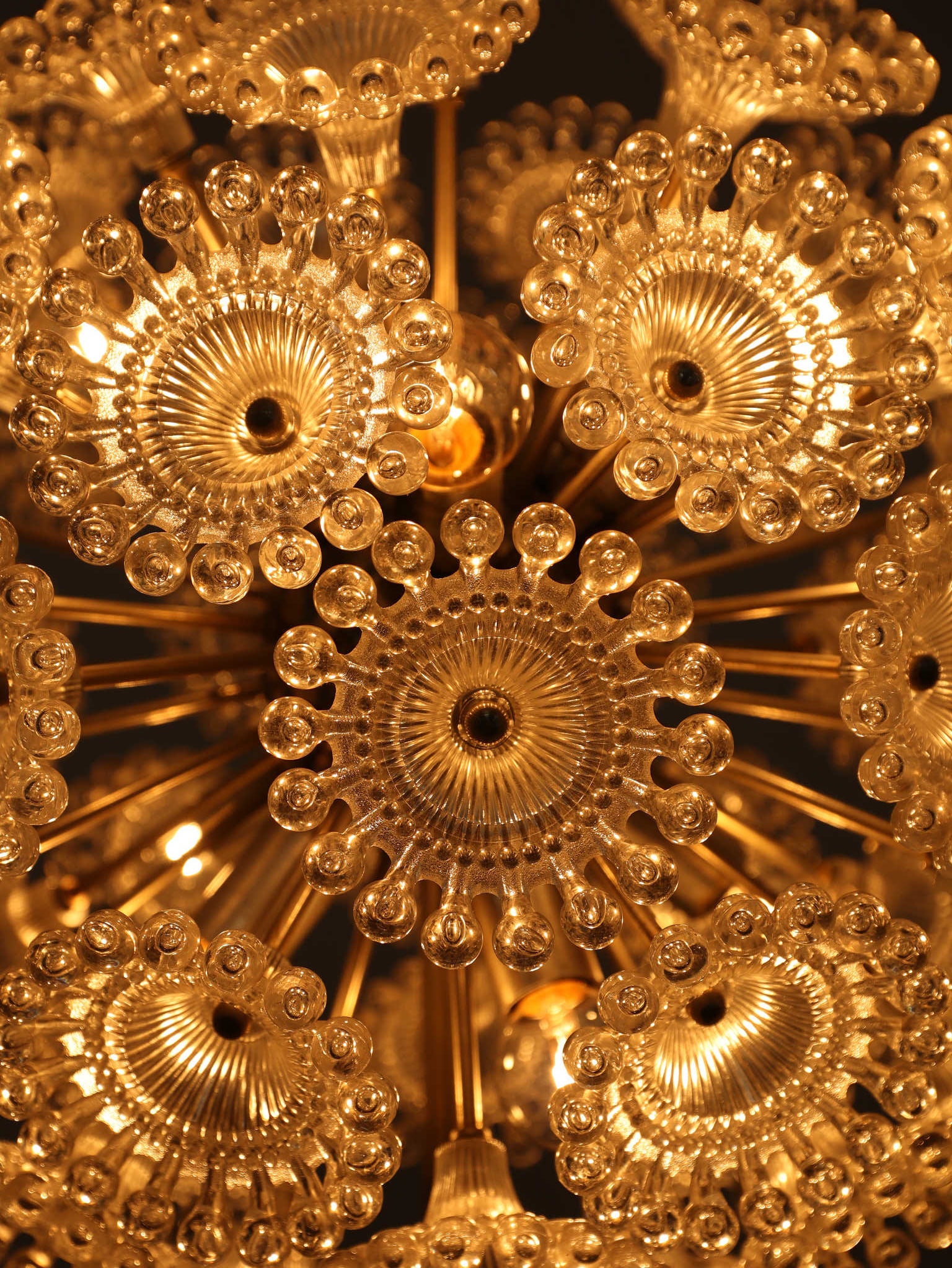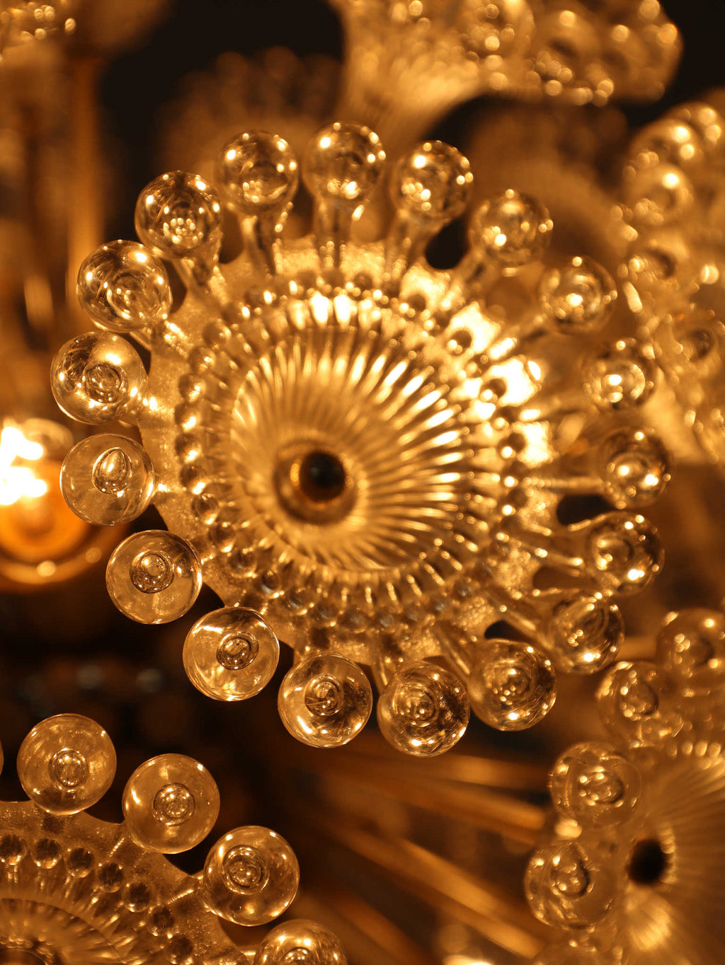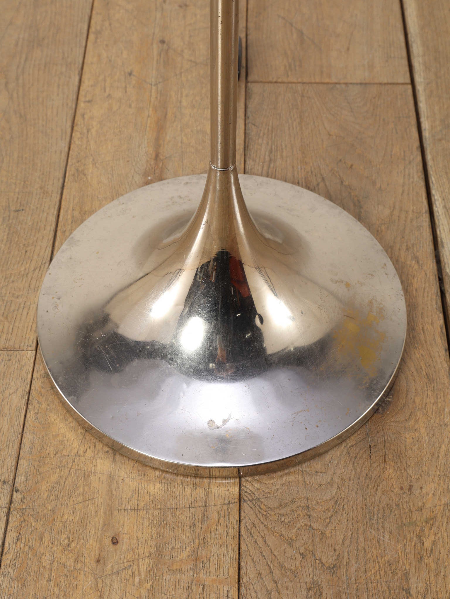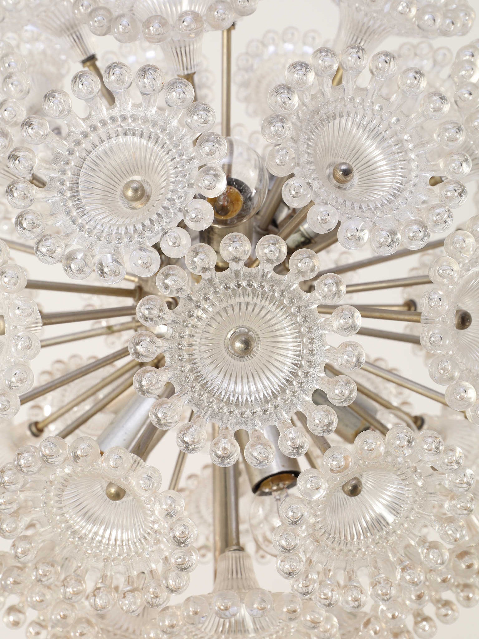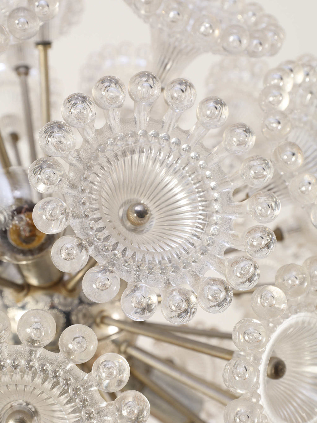 ドイツの照明ブランドSolken Leuchtenが手掛けた、光の芸術品とも呼べるフロアランプ。最大の特徴は、無数のテクスチャールーサイトが放射状に広がる、まるで「タンポポの綿毛」や「氷の結晶」を思わせる幻想的なシェード。スイッチを入れた瞬間、壁や天井に広がる複雑で美しい陰影は息をのむほどで、部屋の空気を一変させます。スペースエイジを象徴するクロームの輝きと、繊細なガラスの煌めき。昼は洗練されたオブジェとして、夜は幻想的な光の演出家として、リビングをドラマチックに彩ります。