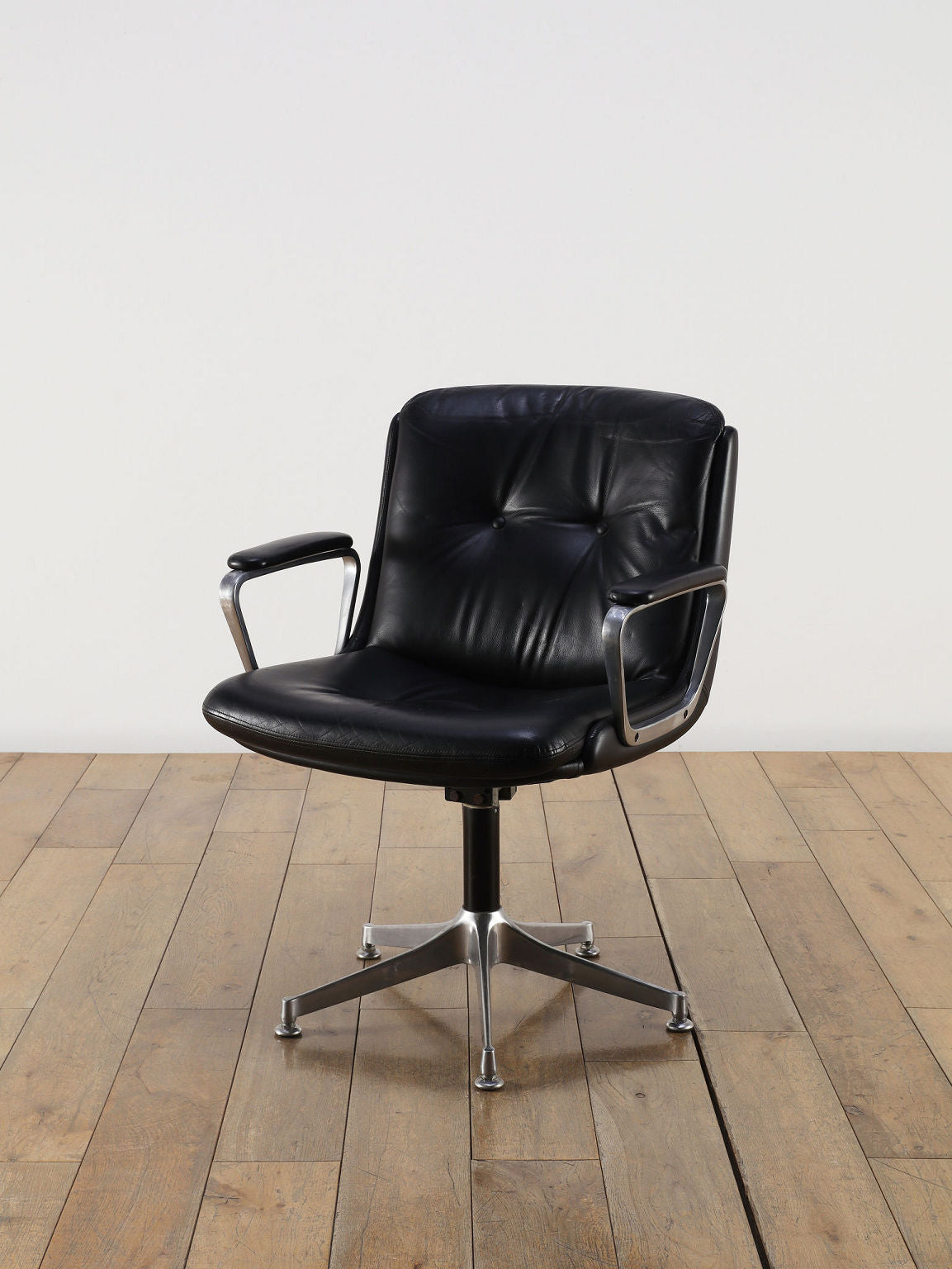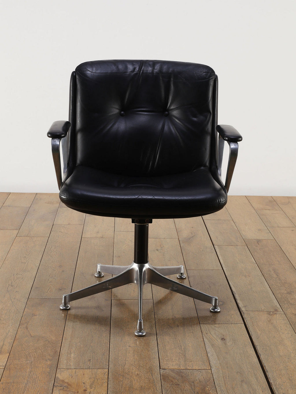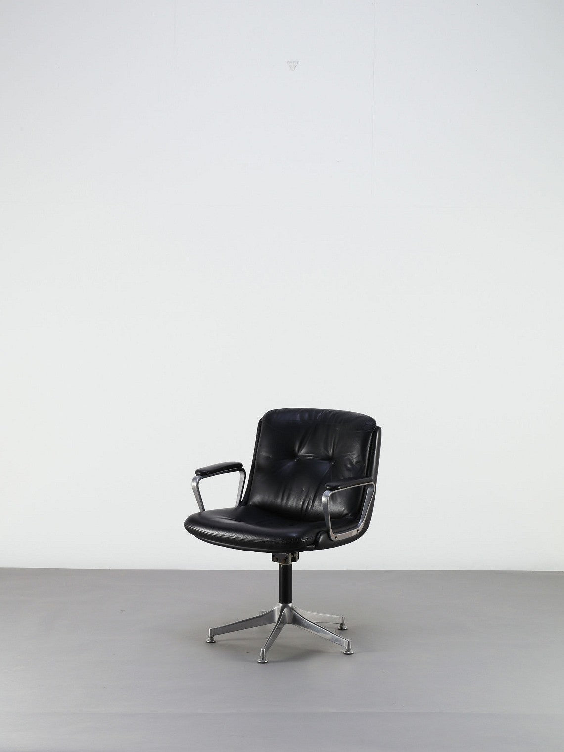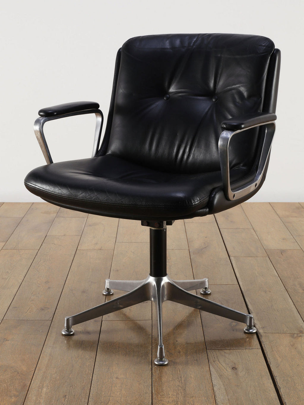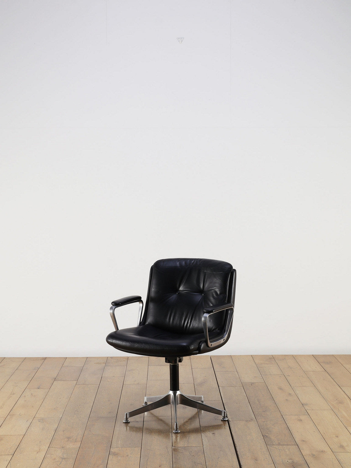 実用主義と美意識が高度に融合した、オランダ・ミッドセンチュリー期を象徴するデスクチェア。時を経て味わい深く艶を増したブラックレザーは、ヴィンテージならではの重厚なオーラを放っています。そこに組み合わされたクールなメタルベースとアームが、全体をモダンに引き締める絶好のアクセントに。身体をしっかりと支える座り心地は、長時間のデスクワークにおいても最良のパートナーとなるでしょう。無骨さと洗練が同居するこの一脚があることで、自宅の書斎やオフィスにクリエイティブな印象を与えてくれるでしょう。