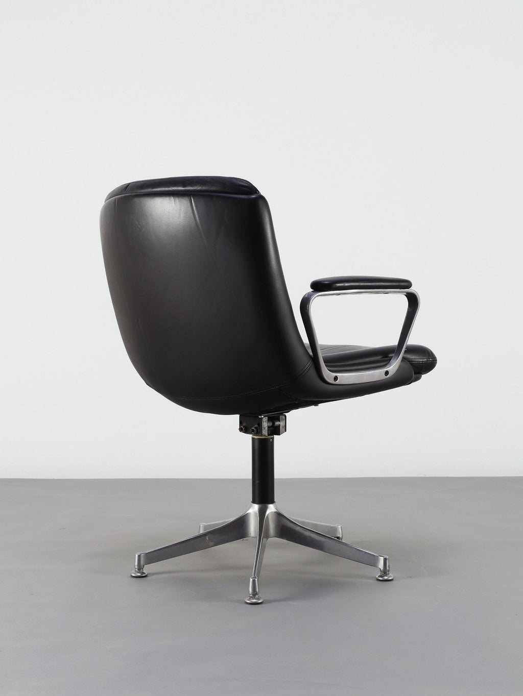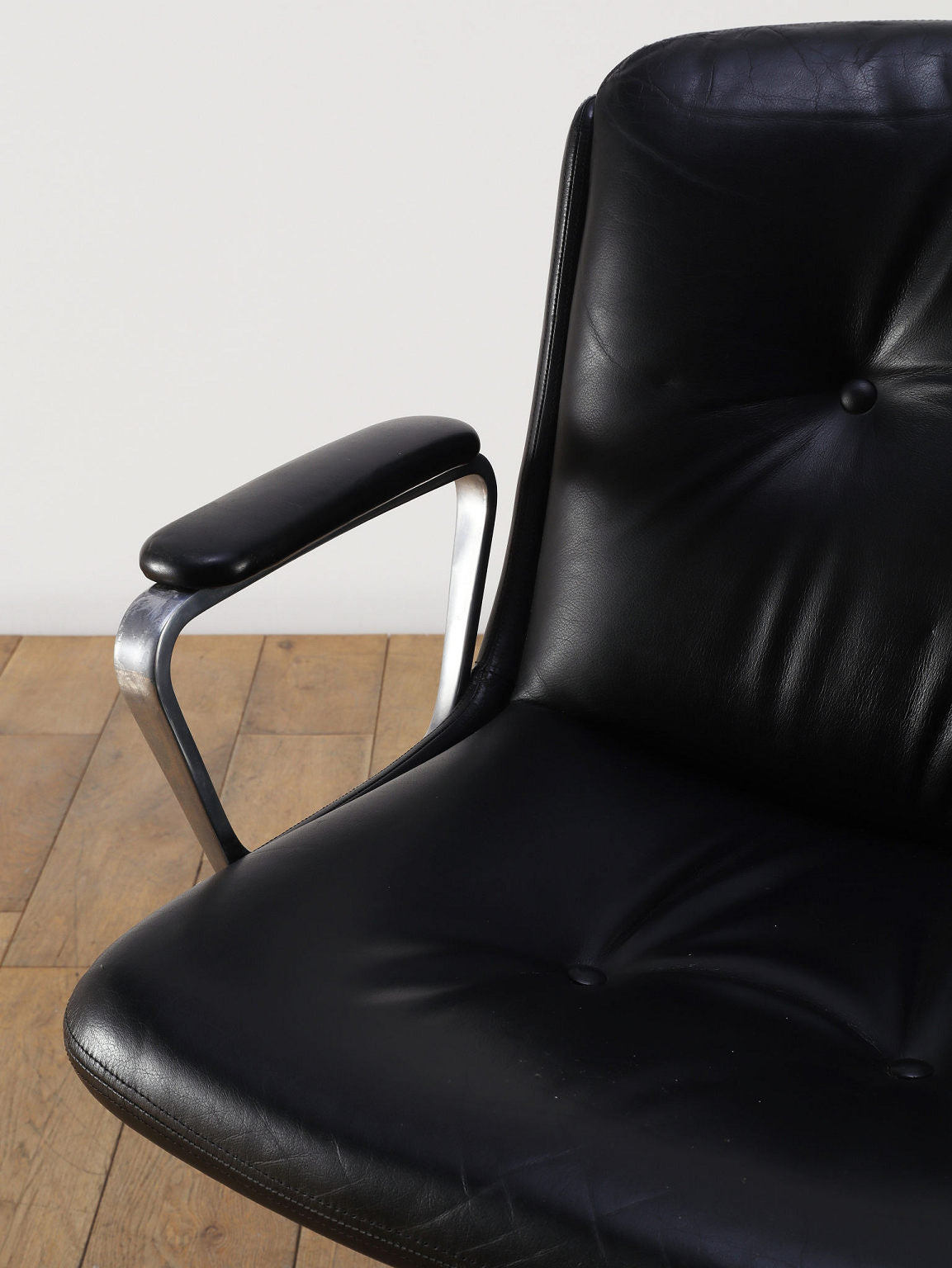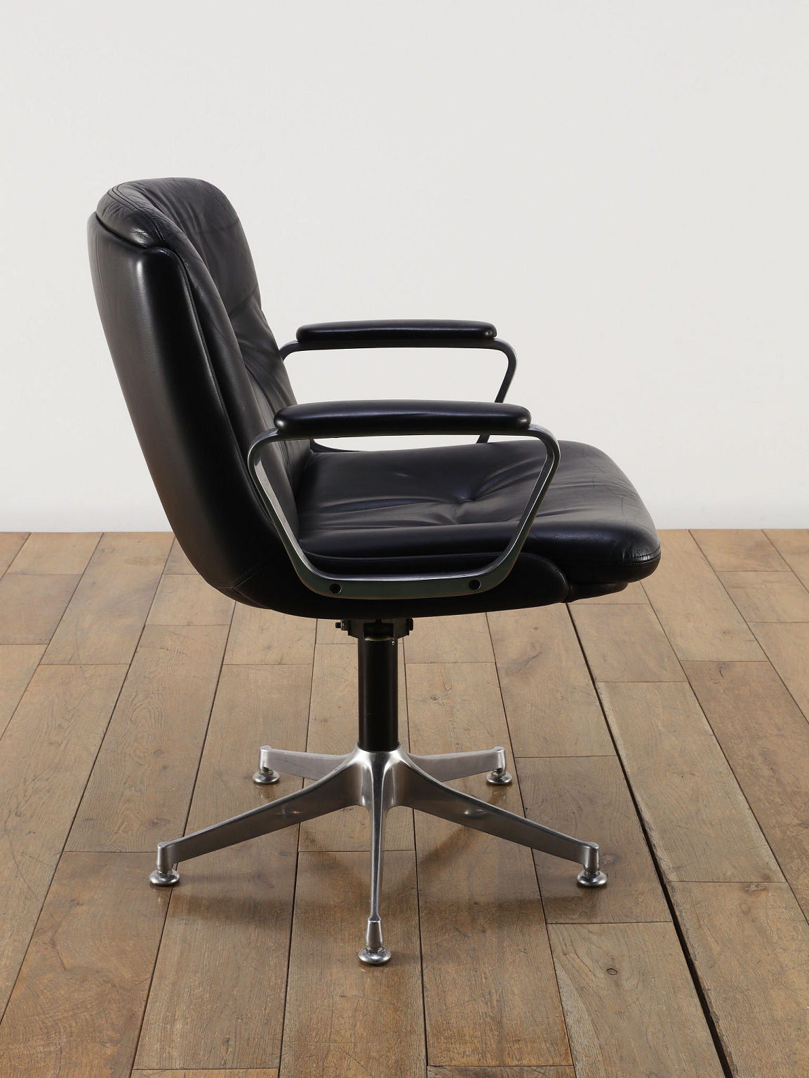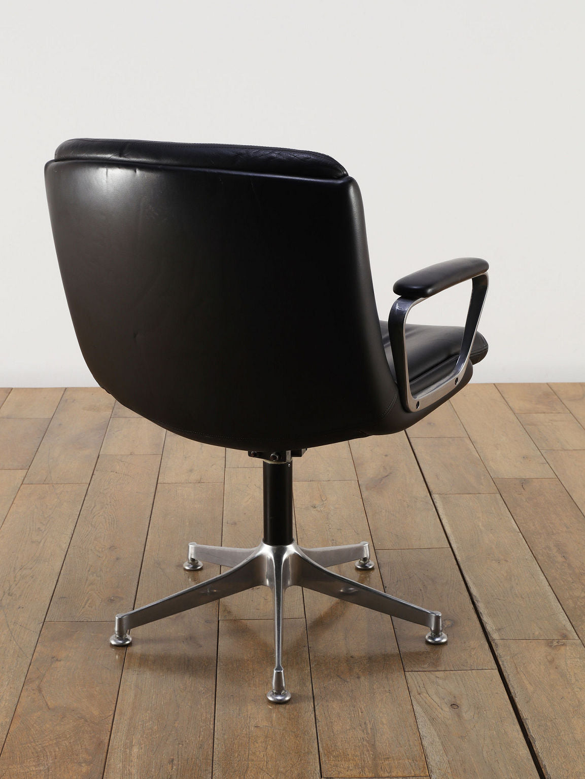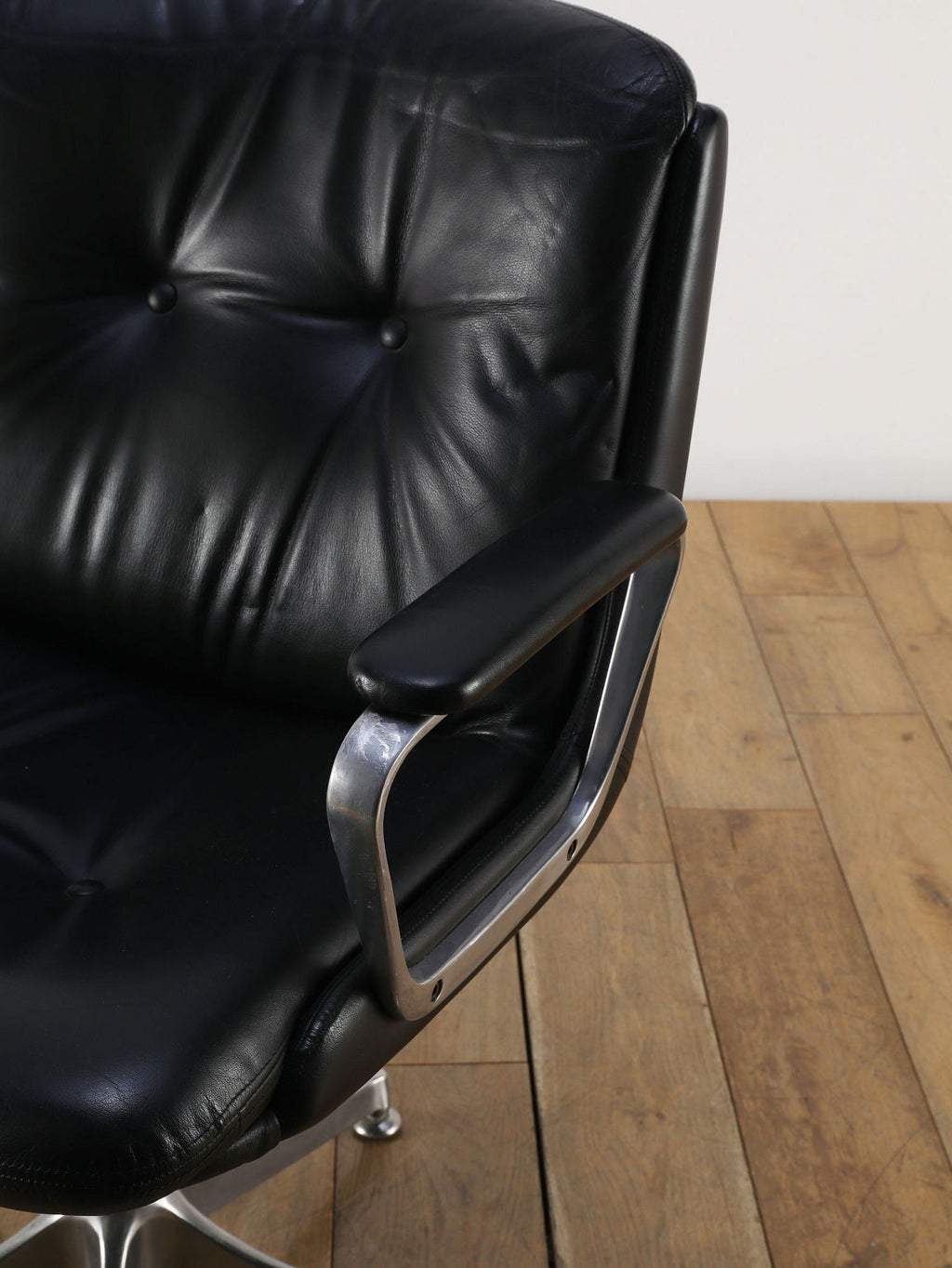 実用主義と美意識が高度に融合した、オランダ・ミッドセンチュリー期を象徴するデスクチェア。時を経て味わい深く艶を増したブラックレザーは、ヴィンテージならではの重厚なオーラを放っています。そこに組み合わされたクールなメタルベースとアームが、全体をモダンに引き締める絶好のアクセントに。身体をしっかりと支える座り心地は、長時間のデスクワークにおいても最良のパートナーとなるでしょう。無骨さと洗練が同居するこの一脚があることで、自宅の書斎やオフィスにクリエイティブな印象を与えてくれるでしょう。