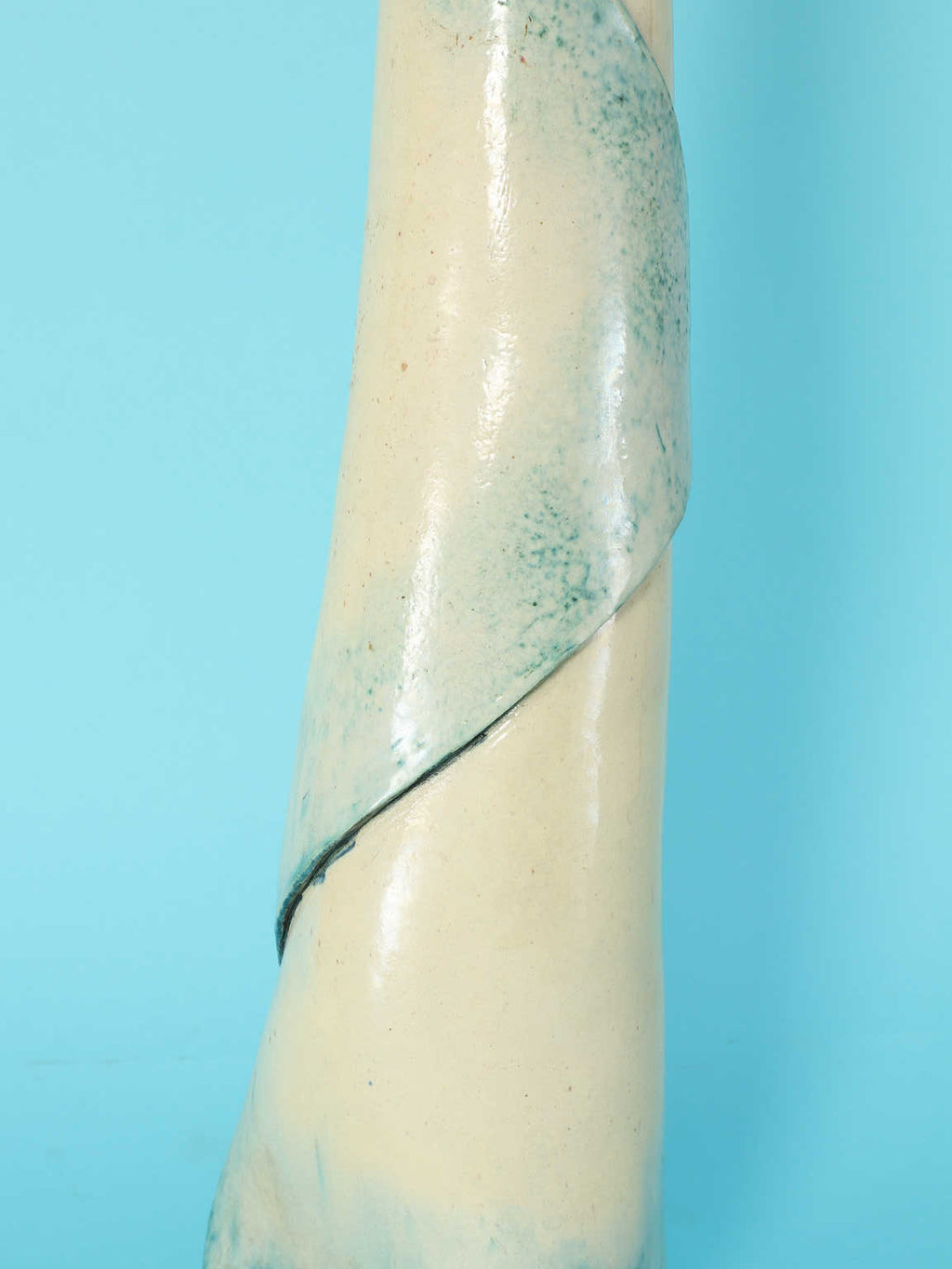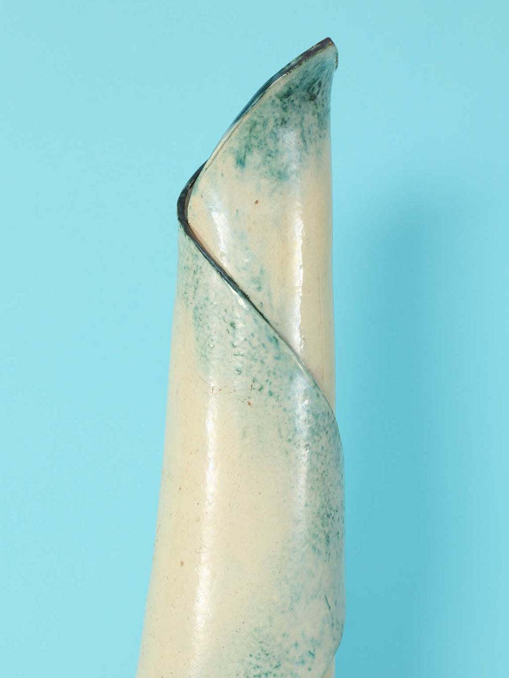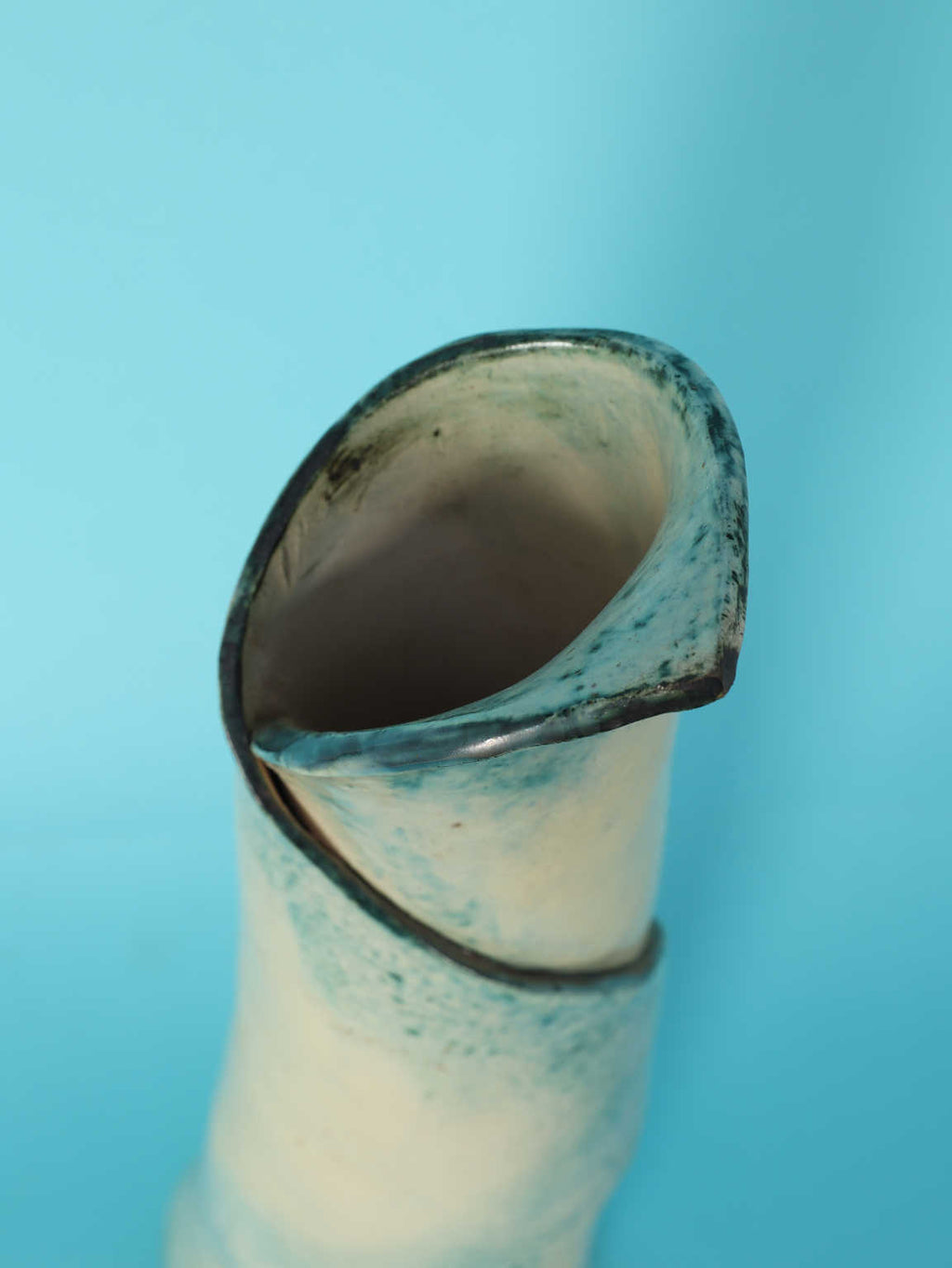 1970年代(推定)に製造されたオランダのフラワーバーズです。柔らかなクリーム色をベースに、鮮やかなターコイズブルーのような釉薬がアクセントとして効いた、モダンで芸術的な一品です。植物や自然物を抽象化したような、ひねりを加えた有機的な縦長のフォルムが特徴的で、静けさの中にも動きを感じさせます。オブジェとしてそのまま飾るだけでも絵になります。オランダヴィンテージならではの独特な色使いと造形美が、空間に知的な遊び心と洗練された雰囲気をもたらします。