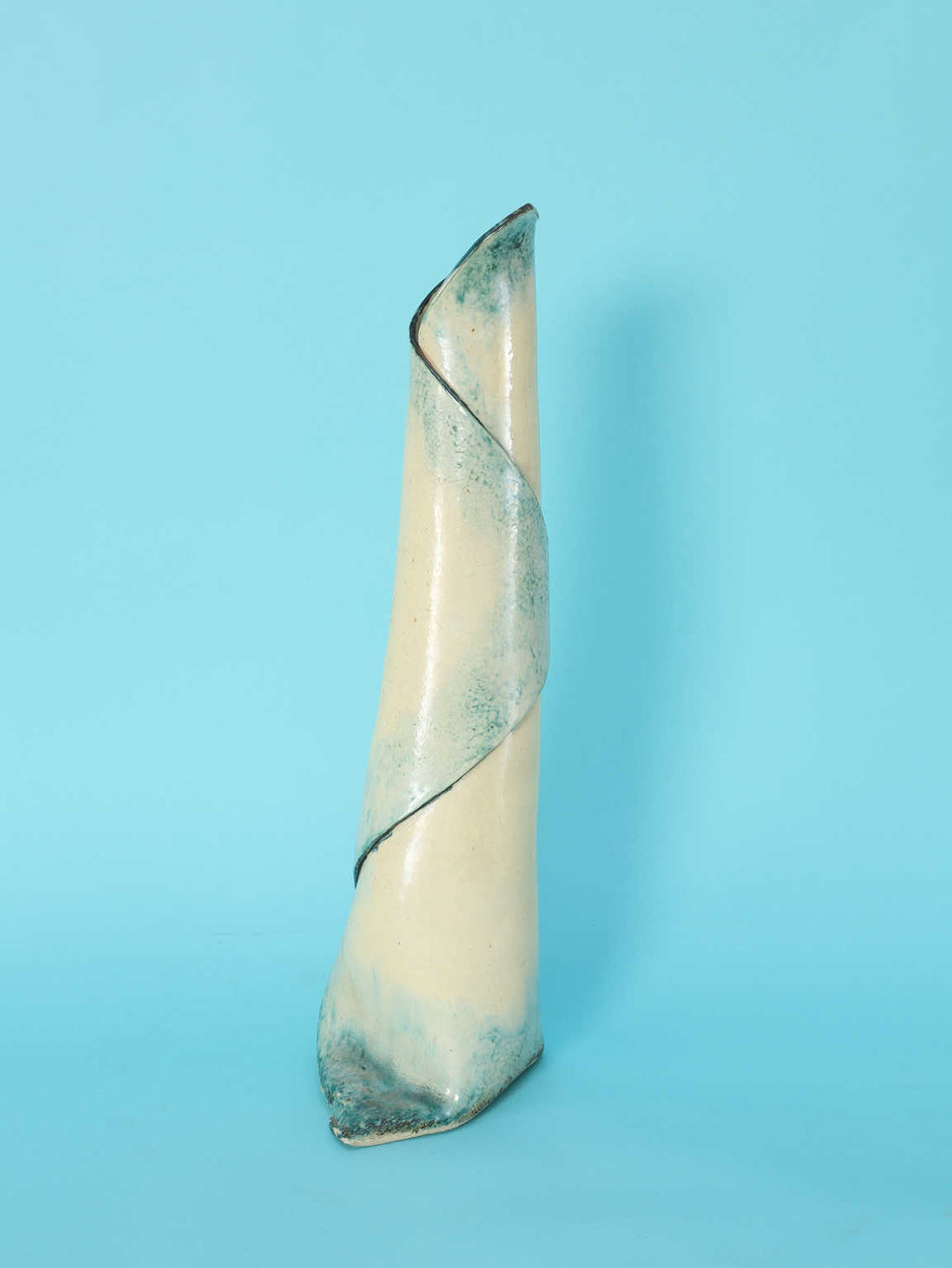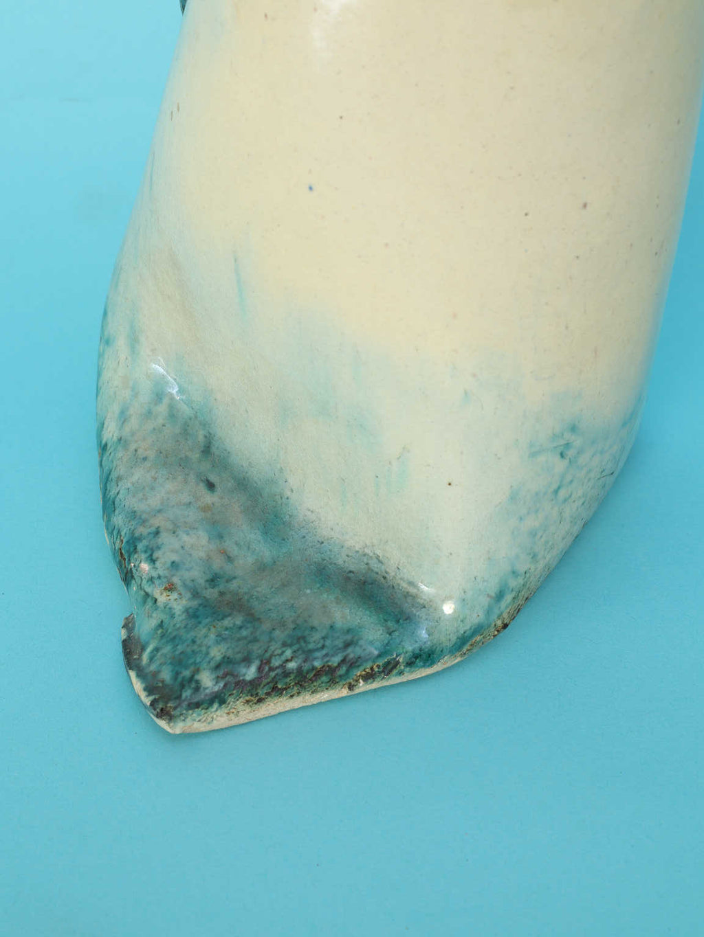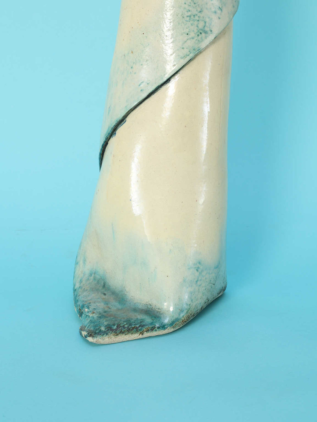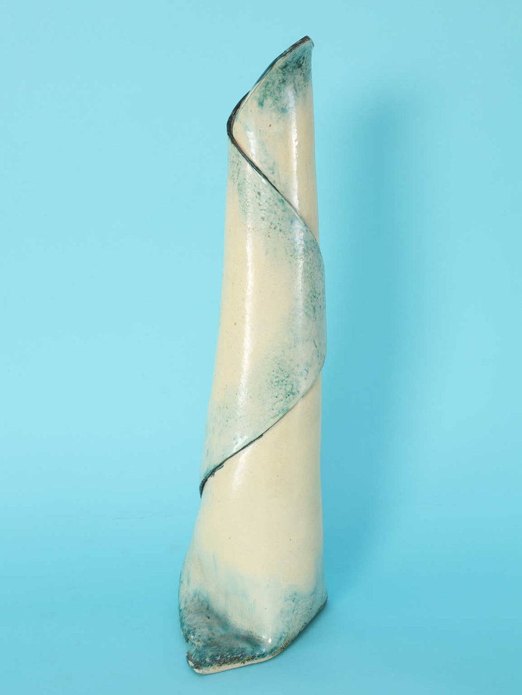 1970年代(推定)に製造されたオランダのフラワーバーズです。柔らかなクリーム色をベースに、鮮やかなターコイズブルーのような釉薬がアクセントとして効いた、モダンで芸術的な一品です。植物や自然物を抽象化したような、ひねりを加えた有機的な縦長のフォルムが特徴的で、静けさの中にも動きを感じさせます。オブジェとしてそのまま飾るだけでも絵になります。オランダヴィンテージならではの独特な色使いと造形美が、空間に知的な遊び心と洗練された雰囲気をもたらします。