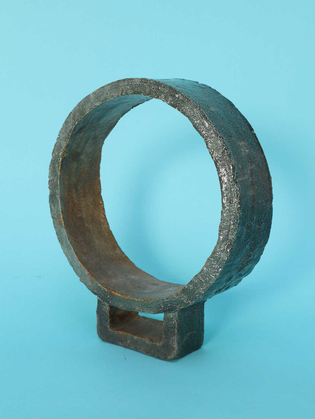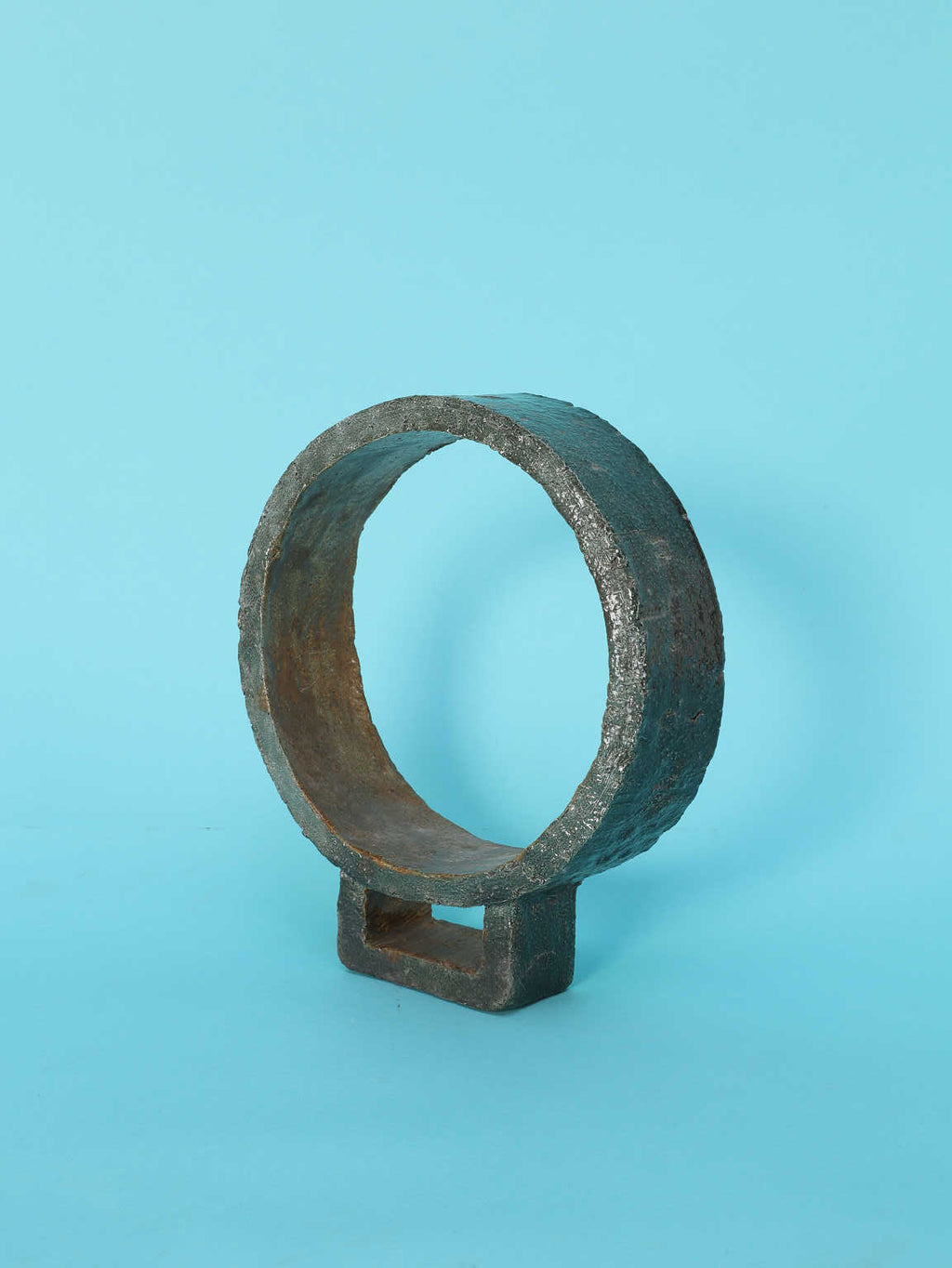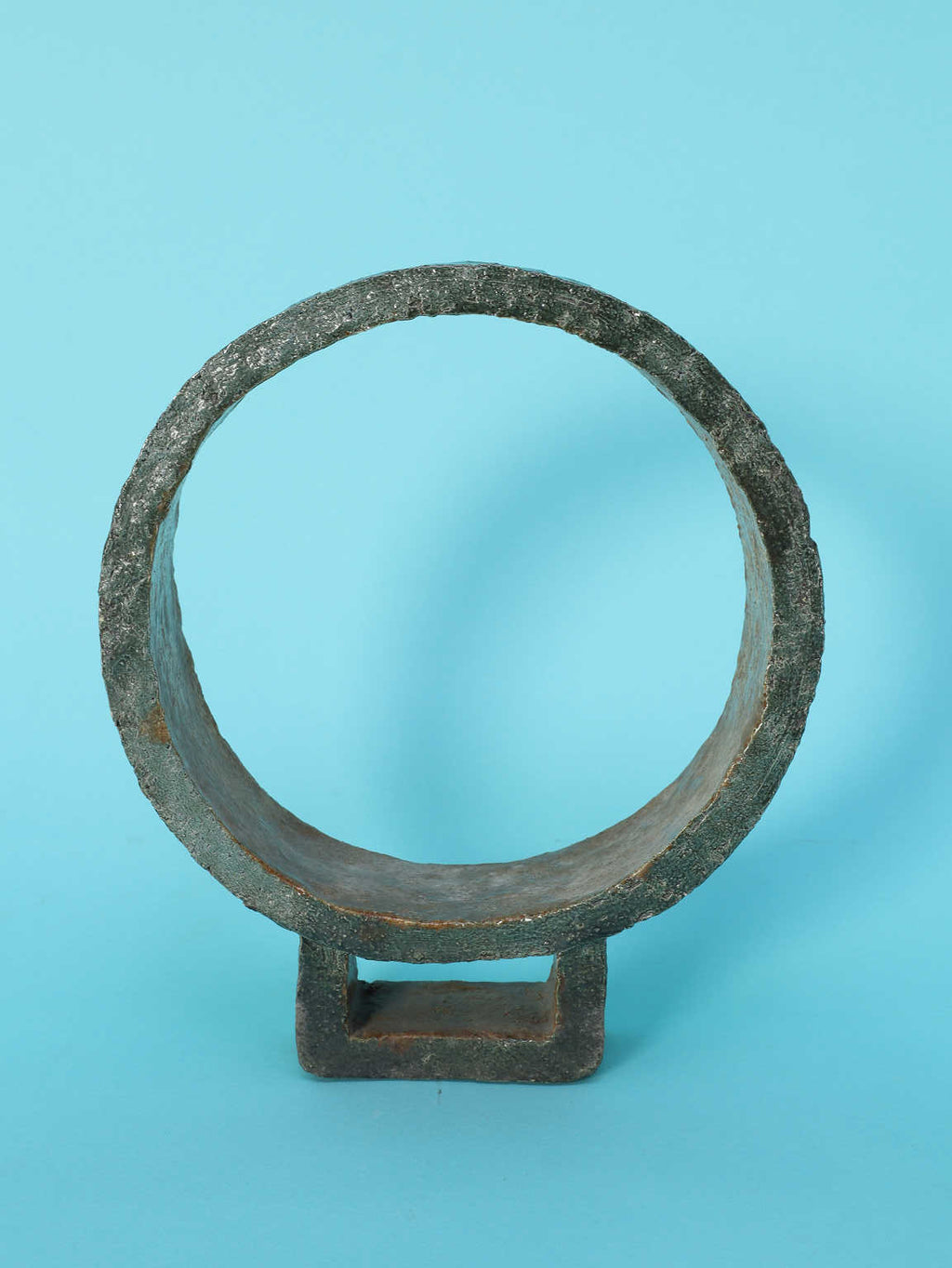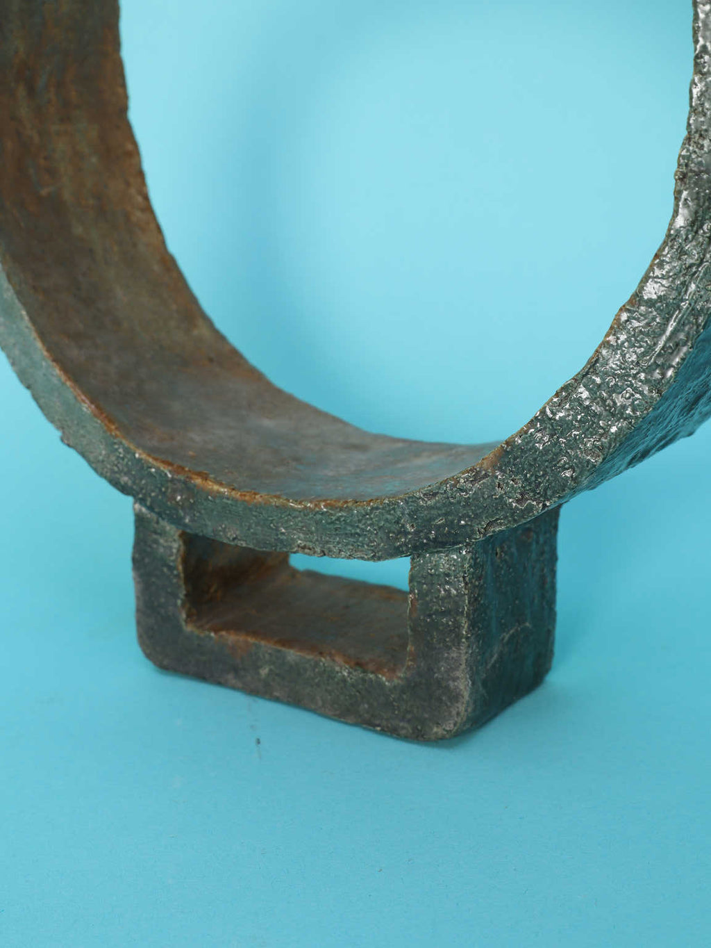 1970年代(推定)に製造されたオランダの陶器オブジェです。自立する大きなリング状のフォルムが印象的で、シンプルながらも彫刻的な美しさを湛えたアートピースです。表面は岩肌のように粗く素朴なテクスチャーで仕上げられており、グレーとブラウンが混じり合ったような色合いが、土の力強さと落ち着きを感じさせます。幾何学的なデザインと自然な風合いが融合した、オランダのヴィンテージらしい独創的な表現が魅力です。光の当たり方によって生まれる陰影が美しく、見る角度によって様々な表情を見せてくれます。