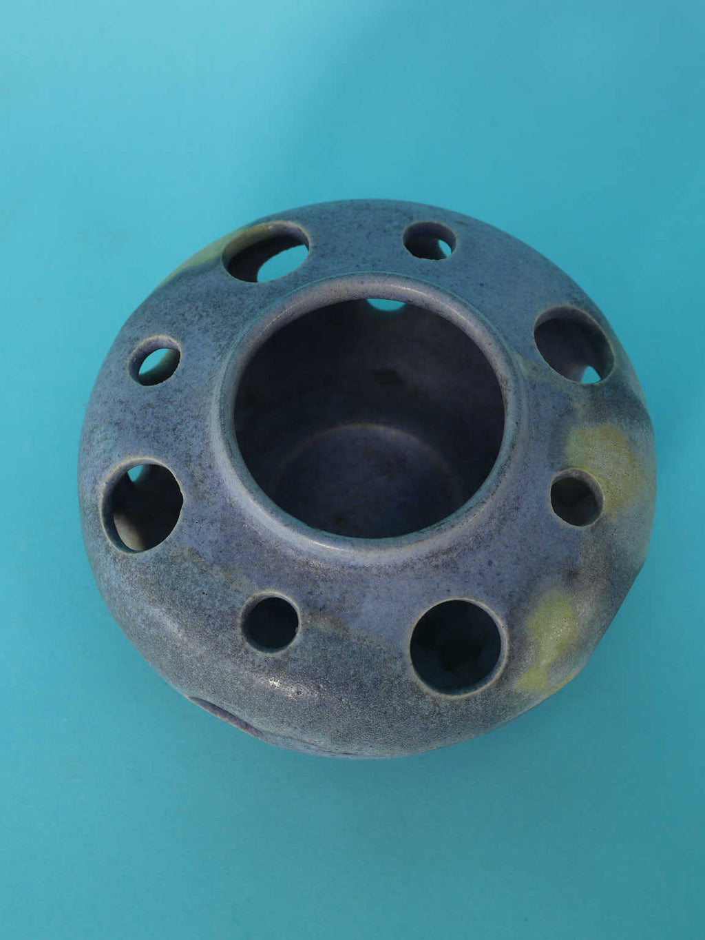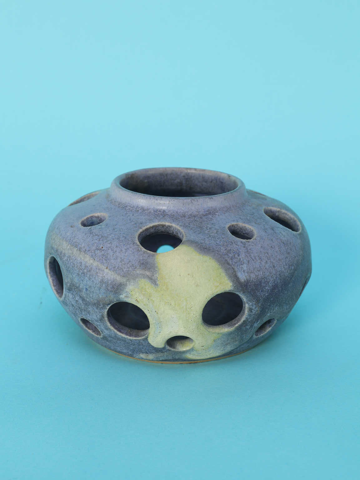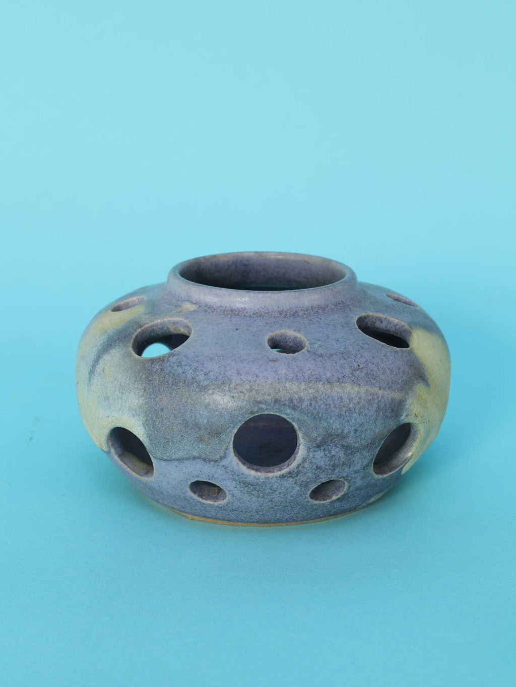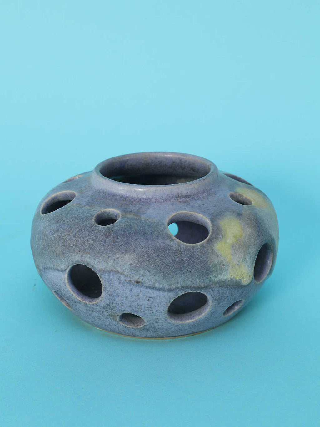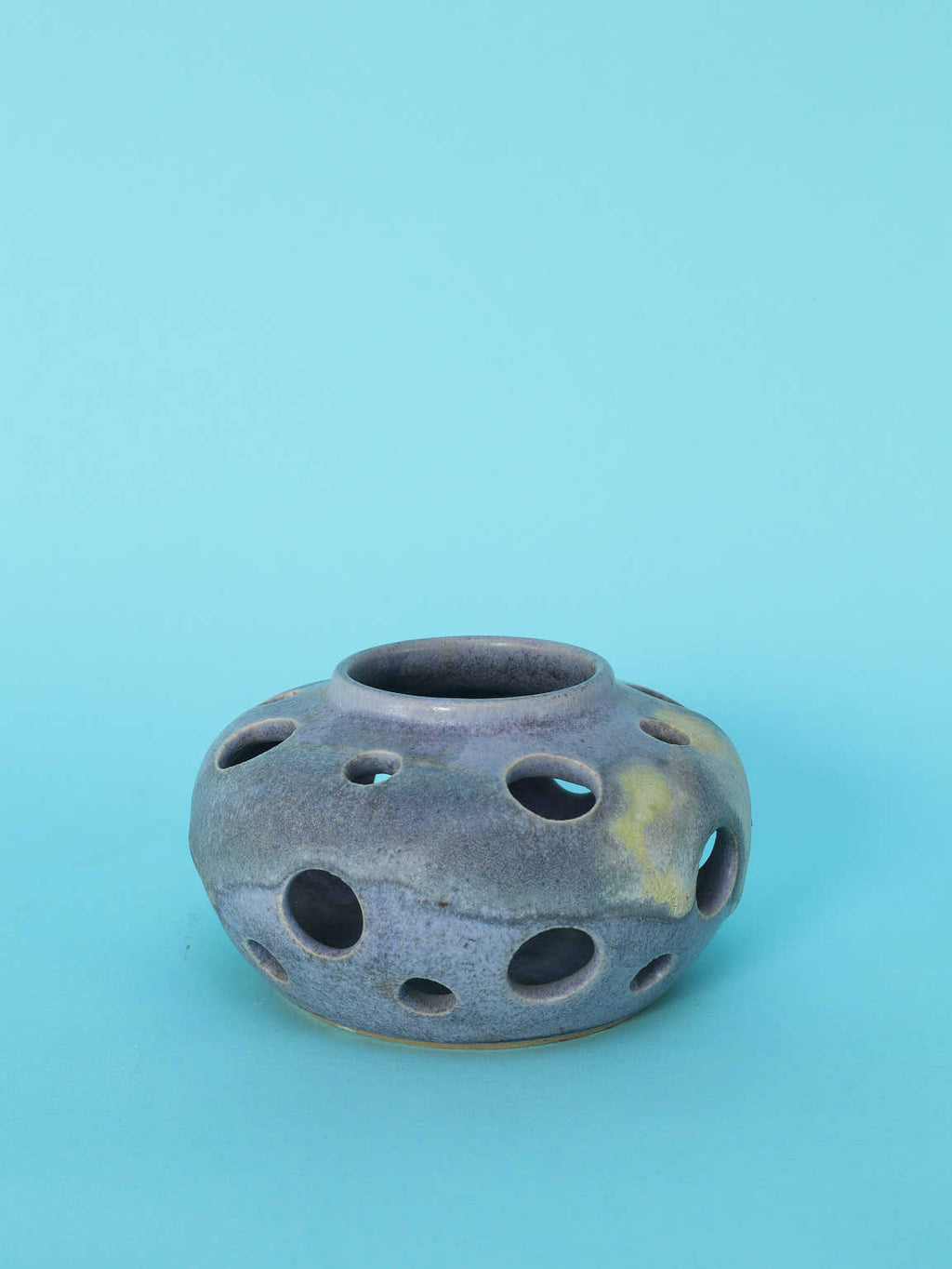 黒にも藍色にも見えるマットな質感と、土に含まれる鉱物が浮き出たような神秘的な黄色がかった斑点が、宇宙的、あるいは深海のような深遠なムードを漂わせています。特筆すべきは、胴体全体に穿たれた円形の「孔(あな)」です。この多孔のデザインは、光と影の相互作用を際立たせ、見る角度によって表情を変える視覚的な遊びを生み出します。静謐で抽象的な表現は、ミニマリズムやブルータリズムといった同時代の建築・デザイン様式との呼応を感じさせます。花器としてはもちろん、窓辺に置いて自然光を通したり、棚の中でダウンライトを受けたりすることで、このオブジェの持つ彫刻的な魅力が最大限に引き出されます。確かな存在感を放ち、空間のアクセントとなる逸品です。