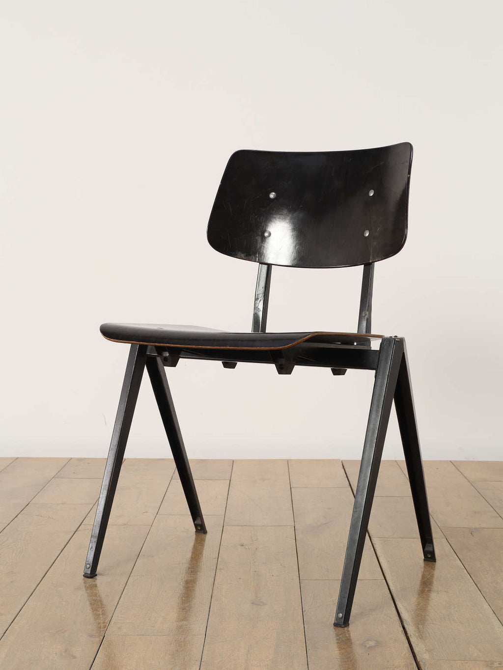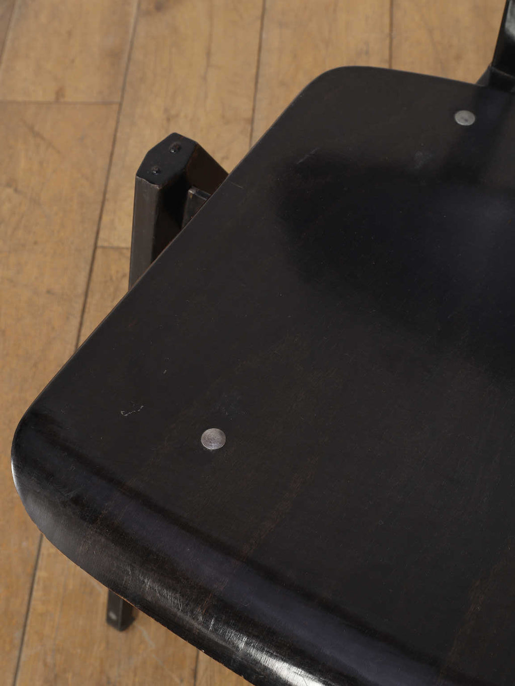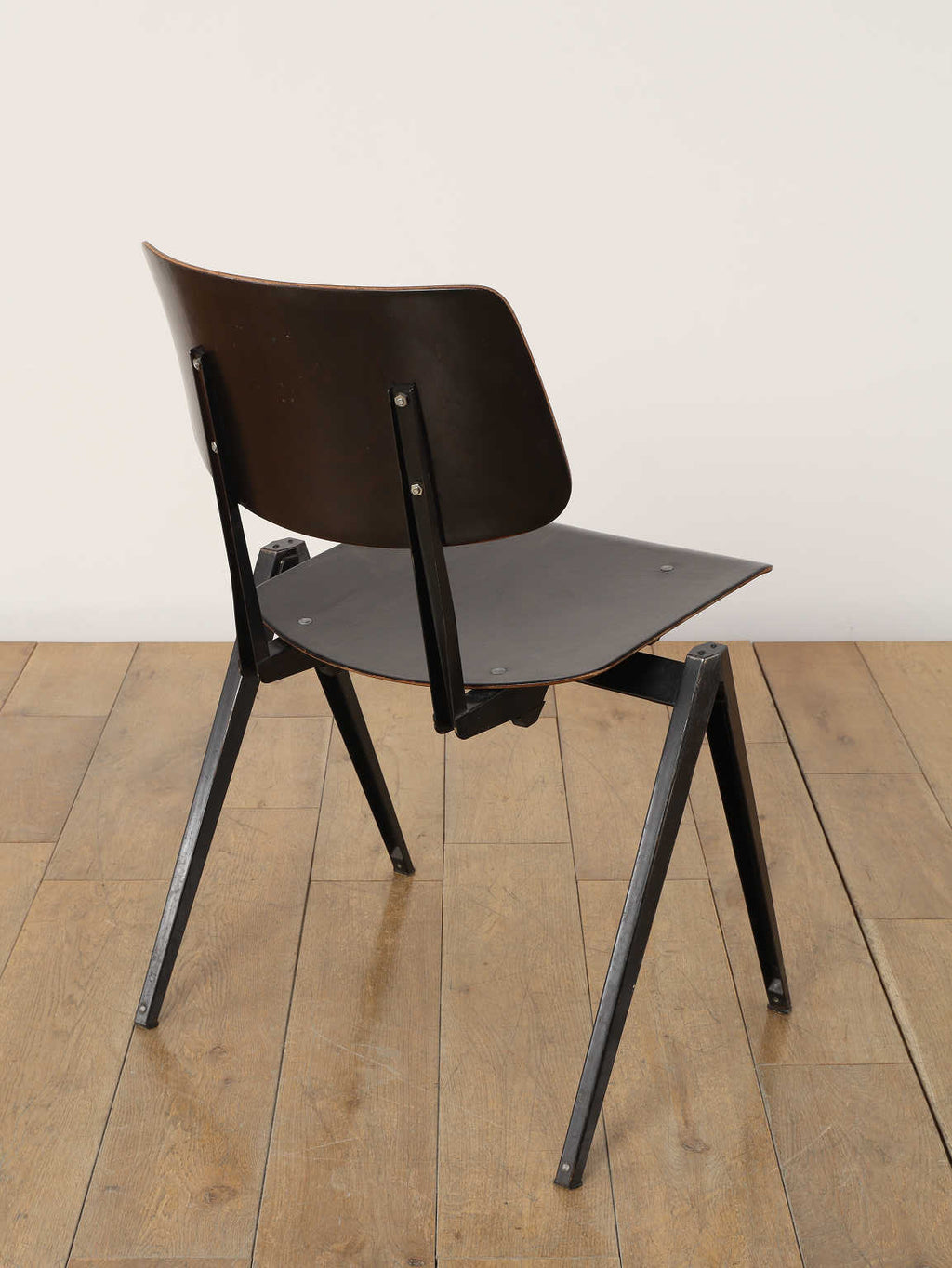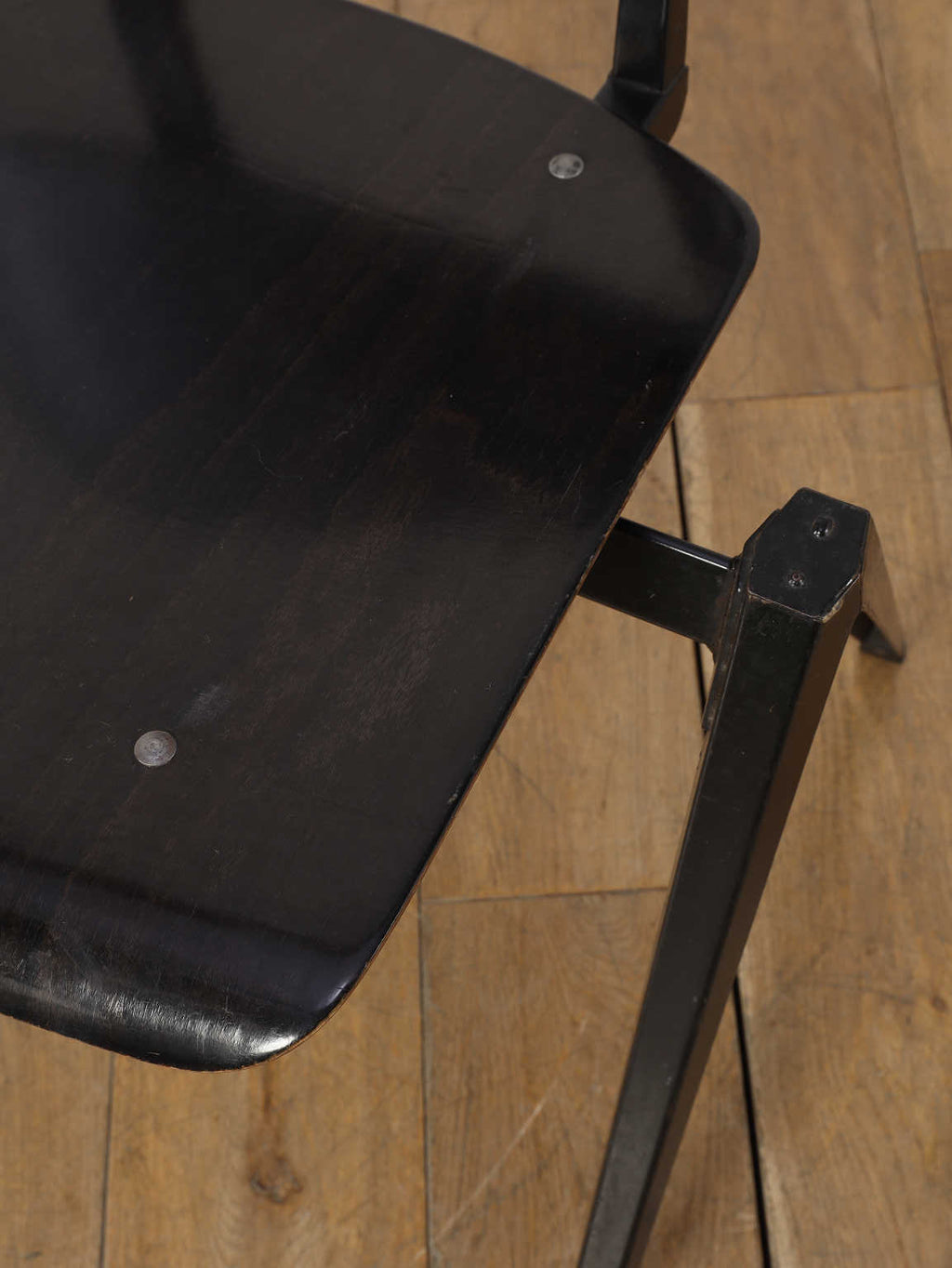 オランダヴィンテージを代表する家具メーカー、GALVANITAS社の実用性とデザイン性を兼ね備えたモデルNo.21のスタッキングチェア。ダークな色味のウッドと、左右対称のコンパス型のブラックメタルフレームの組み合わせが、インダストリアルでクールな雰囲気を演出します。ダイニングチェアとしてはもちろん、ワークデスクに合わせてアトリエのような雰囲気もお愉しみいただけます。スタッキングが可能なので、使わない時は重ねてコンパクトに収納できるのも嬉しいポイントです。