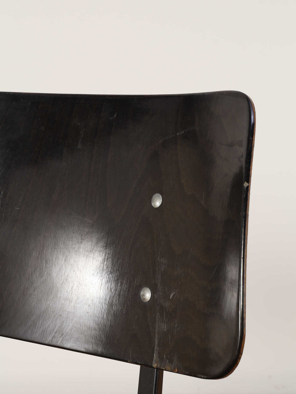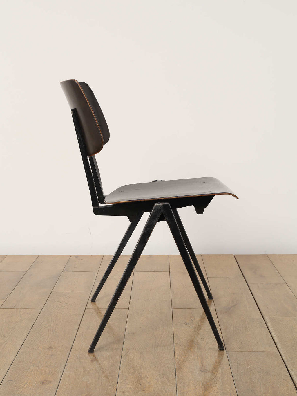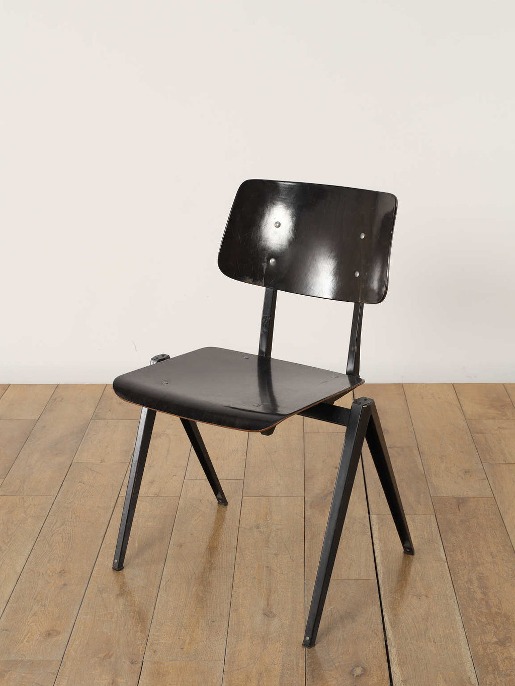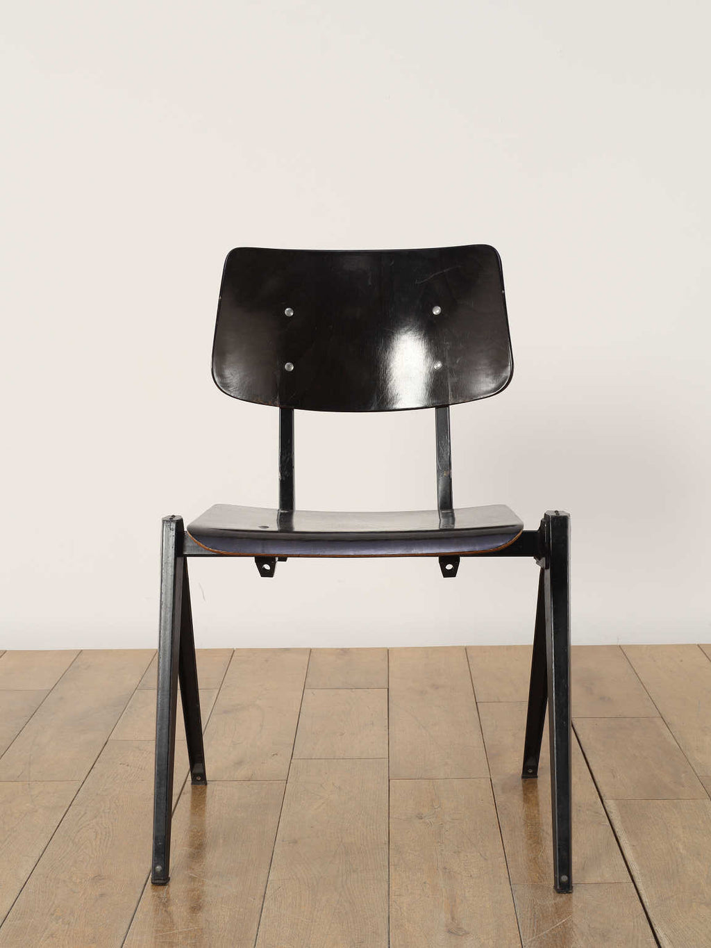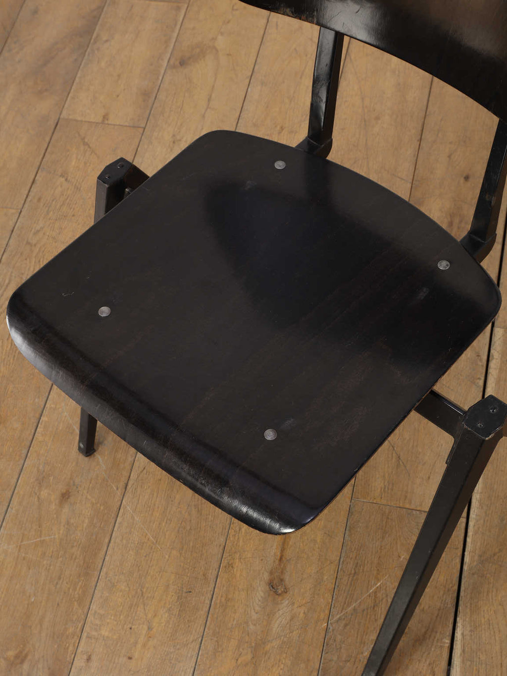 オランダヴィンテージを代表する家具メーカー、GALVANITAS社の実用性とデザイン性を兼ね備えたモデルNo.21のスタッキングチェア。ダークな色味のウッドと、左右対称のコンパス型のブラックメタルフレームの組み合わせが、インダストリアルでクールな雰囲気を演出します。ダイニングチェアとしてはもちろん、ワークデスクに合わせてアトリエのような雰囲気もお愉しみいただけます。スタッキングが可能なので、使わない時は重ねてコンパクトに収納できるのも嬉しいポイントです。