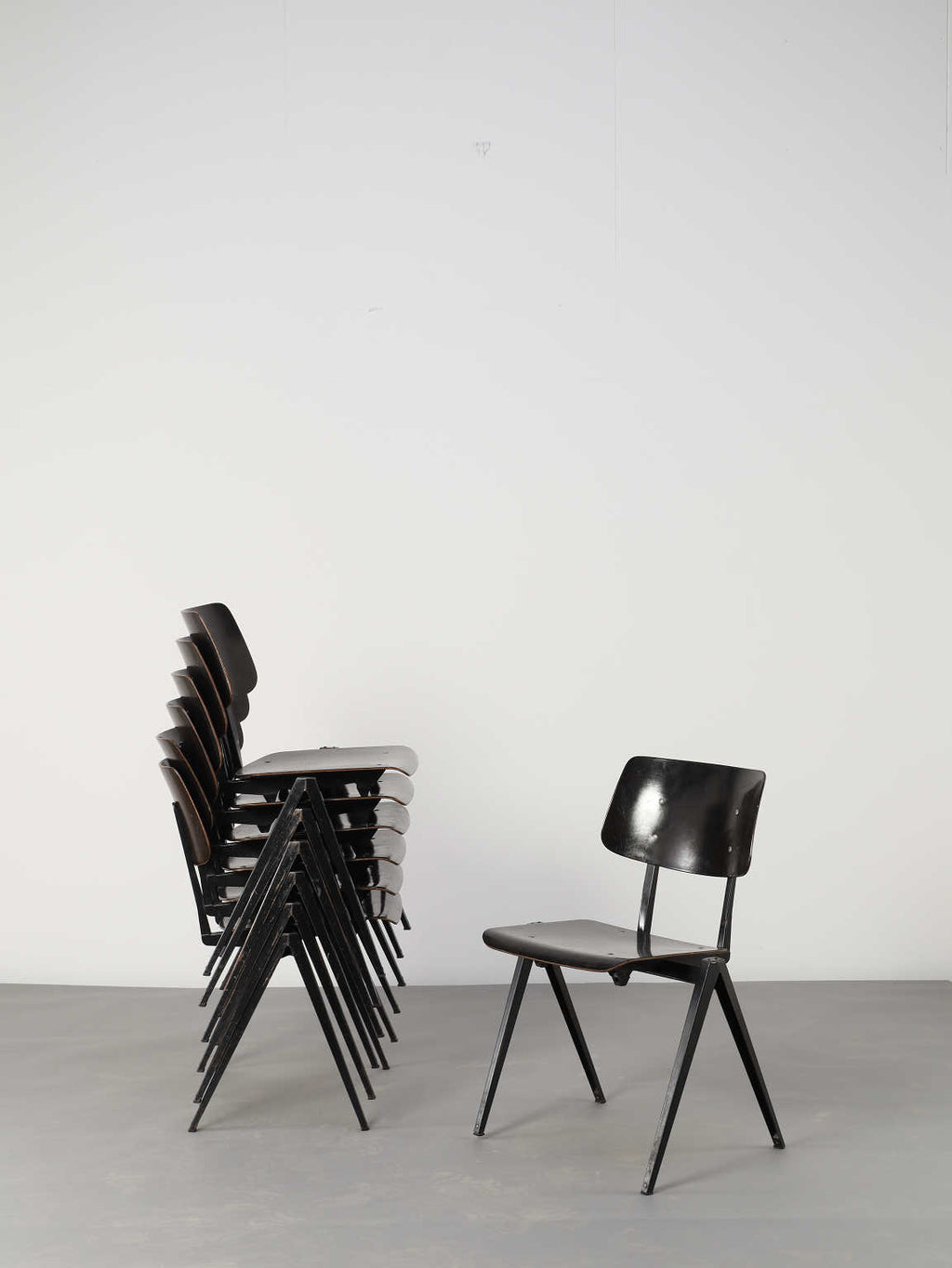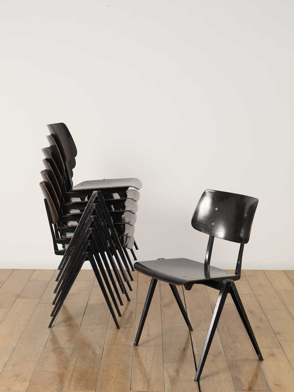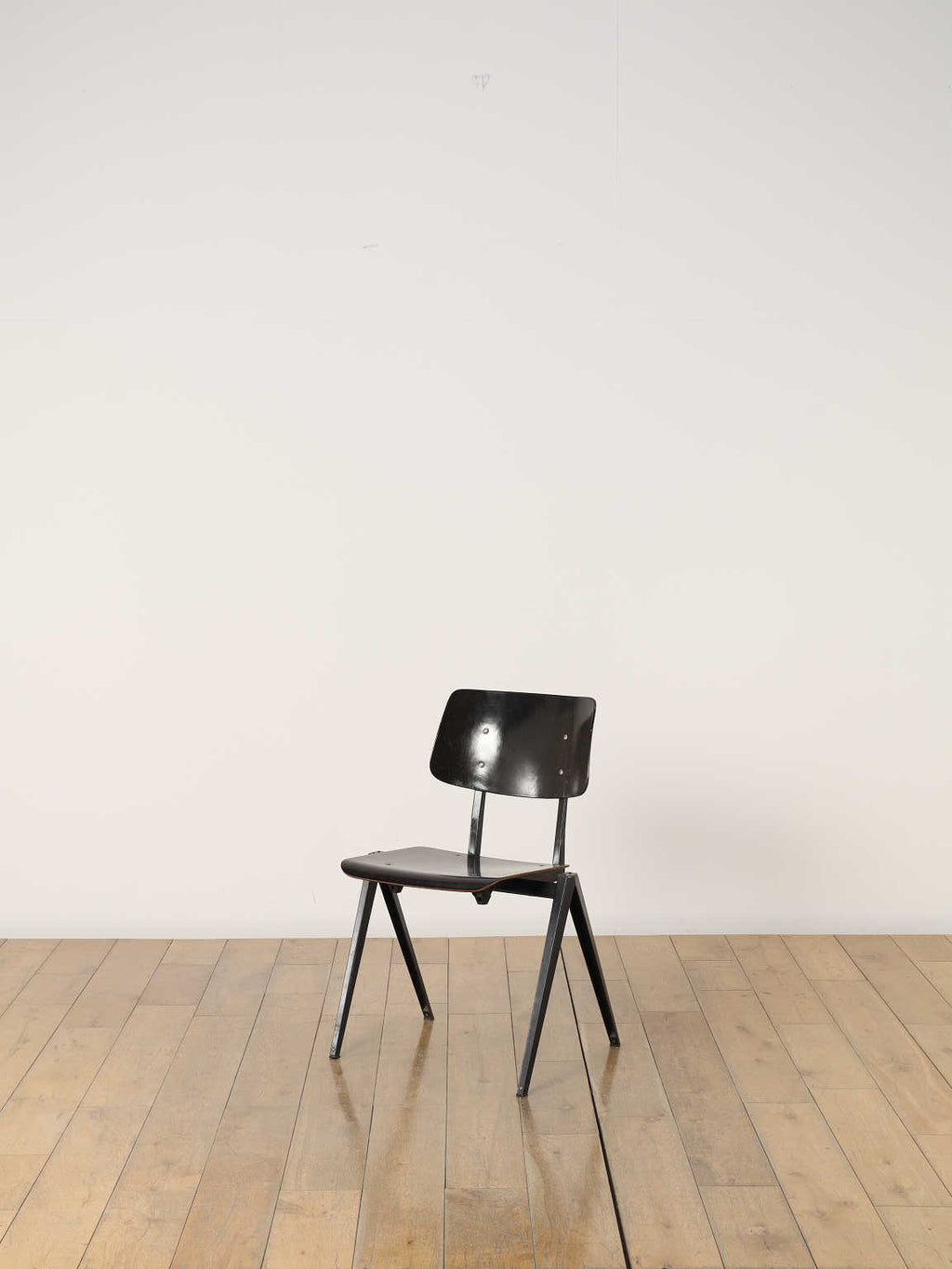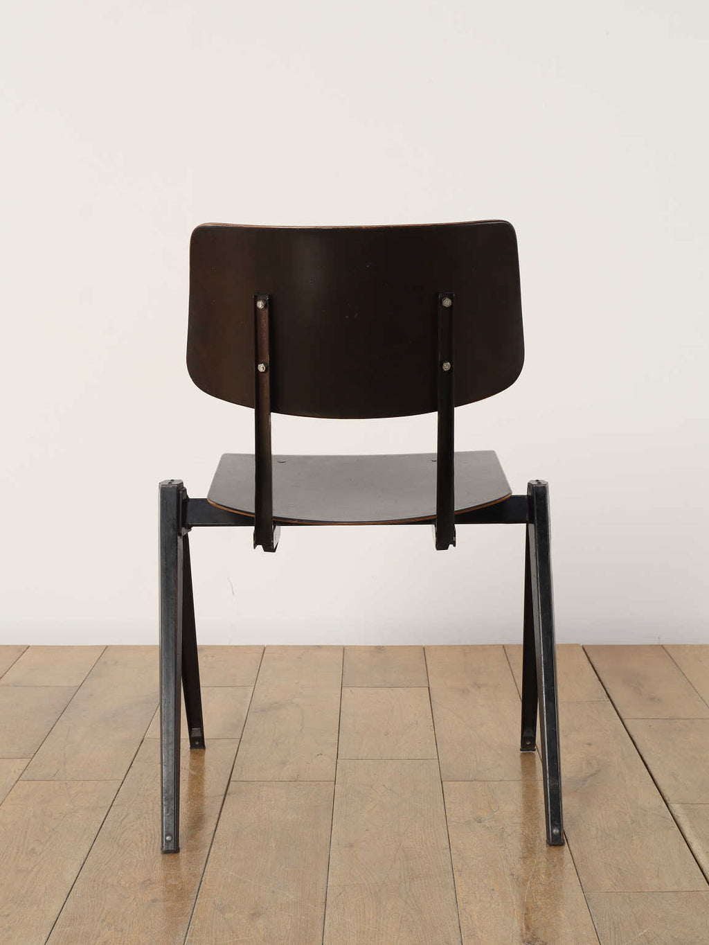 オランダヴィンテージを代表する家具メーカー、GALVANITAS社の実用性とデザイン性を兼ね備えたモデルNo.21のスタッキングチェア。ダークな色味のウッドと、左右対称のコンパス型のブラックメタルフレームの組み合わせが、インダストリアルでクールな雰囲気を演出します。ダイニングチェアとしてはもちろん、ワークデスクに合わせてアトリエのような雰囲気もお愉しみいただけます。スタッキングが可能なので、使わない時は重ねてコンパクトに収納できるのも嬉しいポイントです。