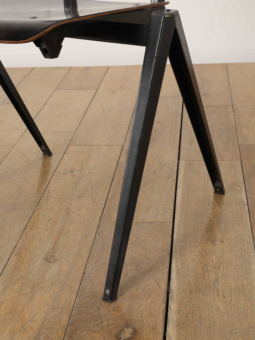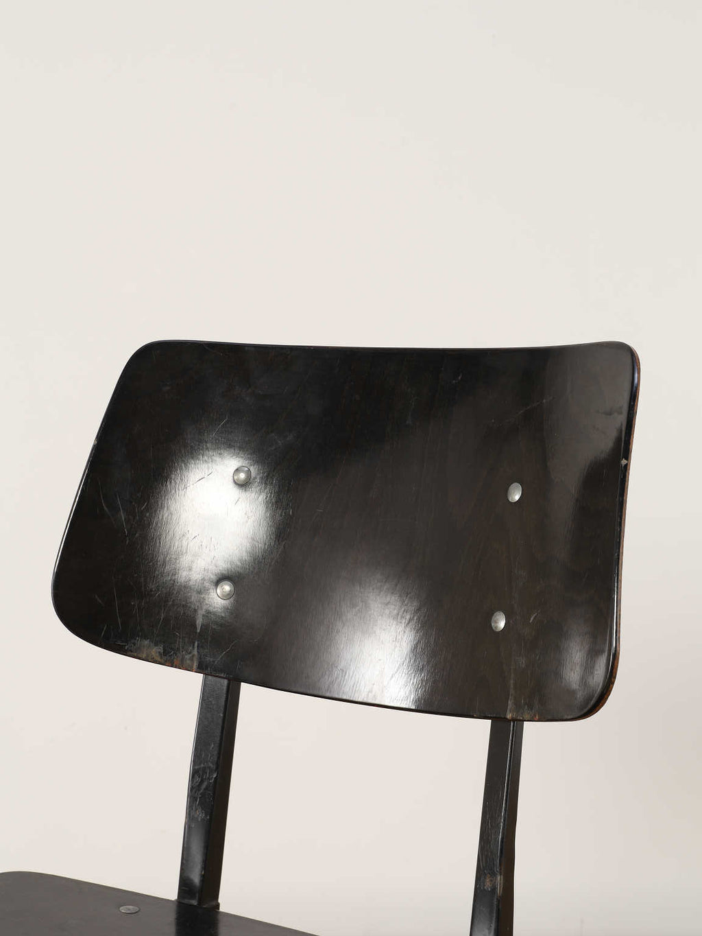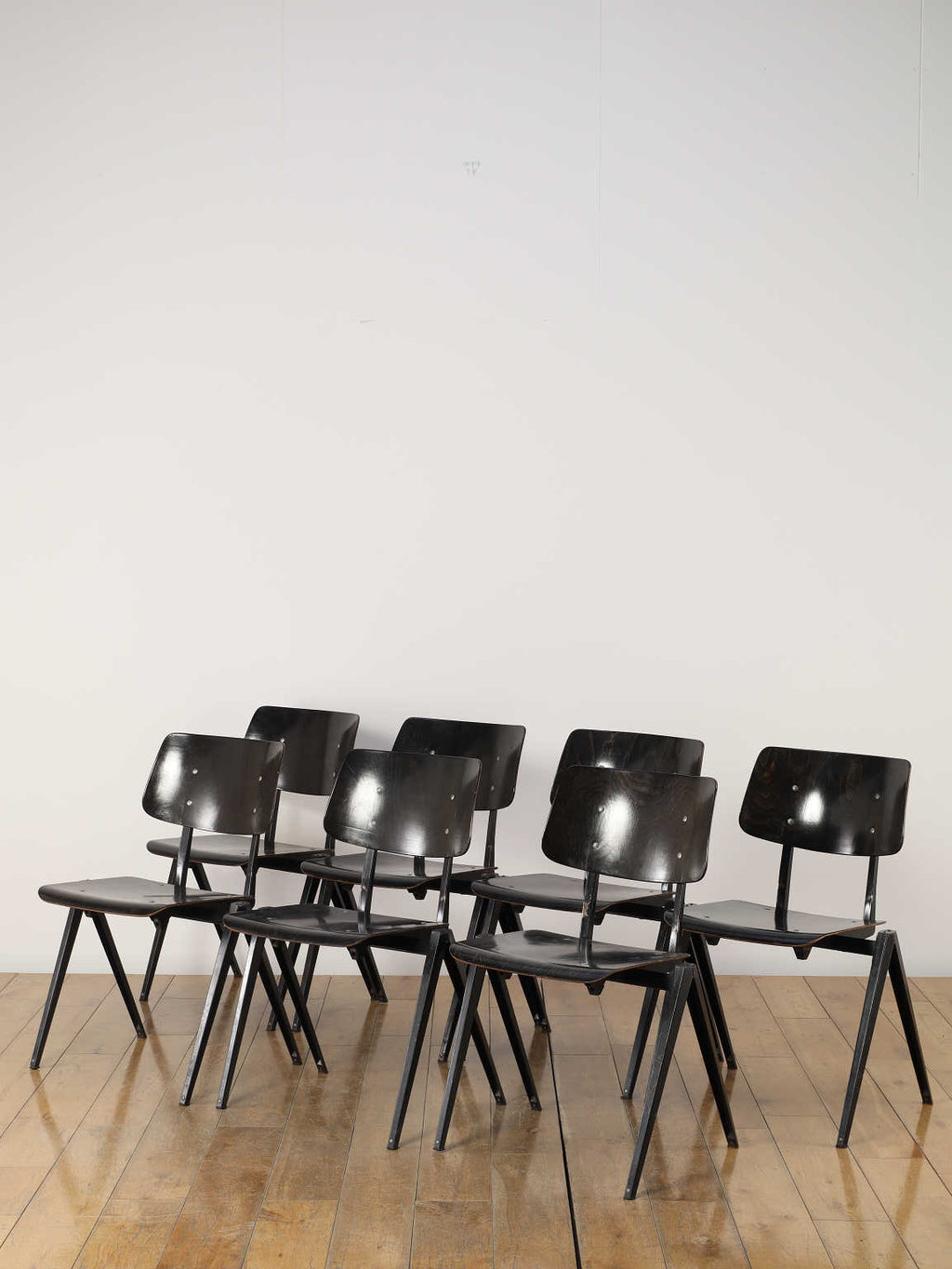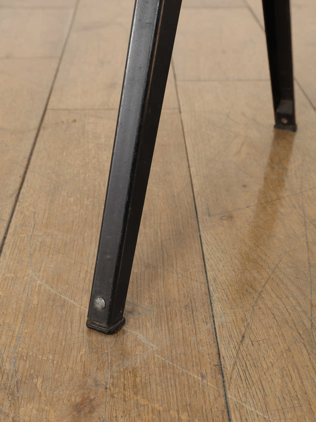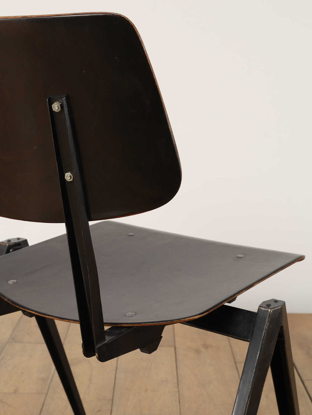 オランダヴィンテージを代表する家具メーカー、GALVANITAS社の実用性とデザイン性を兼ね備えたモデルNo.21のスタッキングチェア。ダークな色味のウッドと、左右対称のコンパス型のブラックメタルフレームの組み合わせが、インダストリアルでクールな雰囲気を演出します。ダイニングチェアとしてはもちろん、ワークデスクに合わせてアトリエのような雰囲気もお愉しみいただけます。スタッキングが可能なので、使わない時は重ねてコンパクトに収納できるのも嬉しいポイントです。