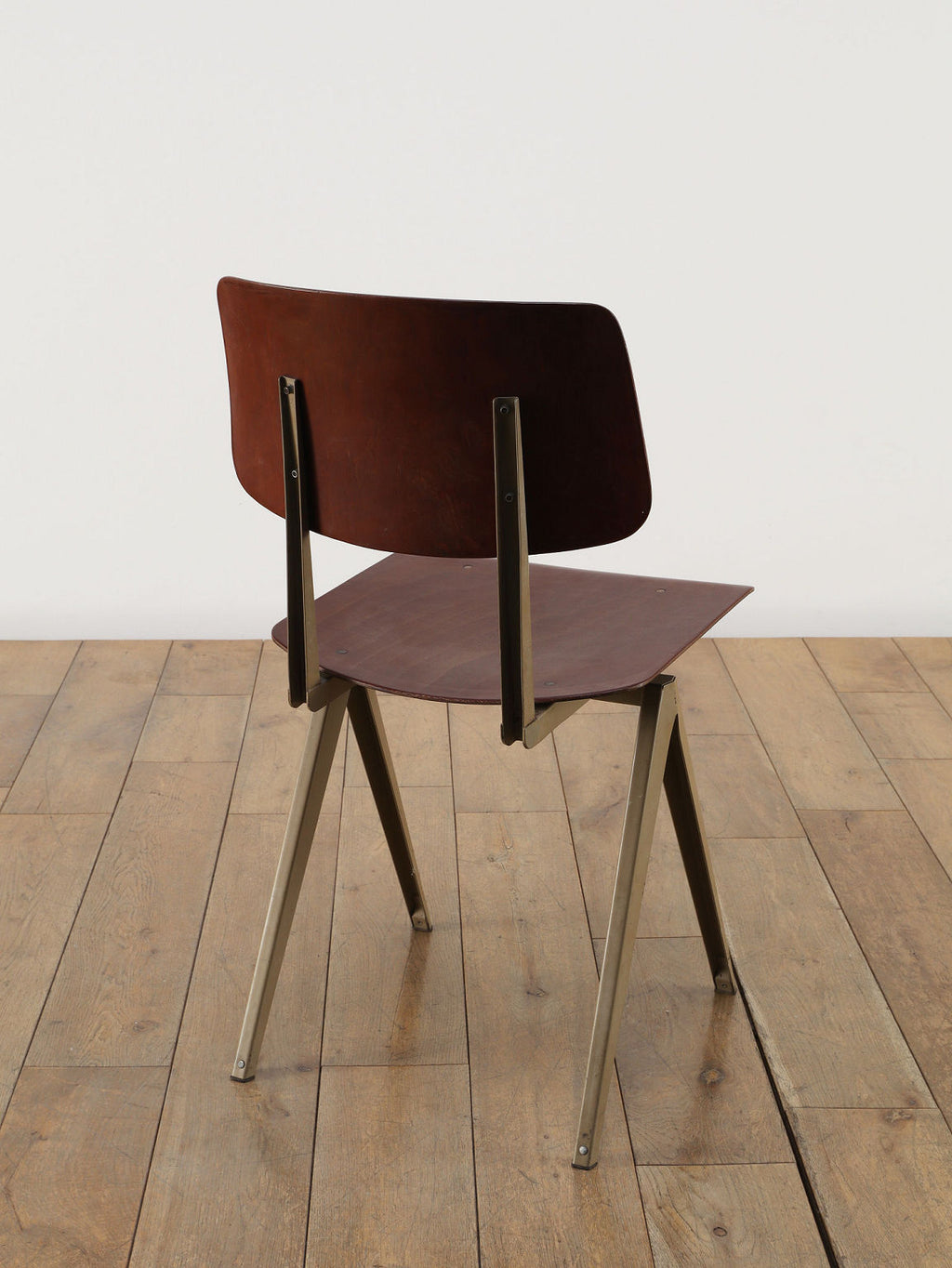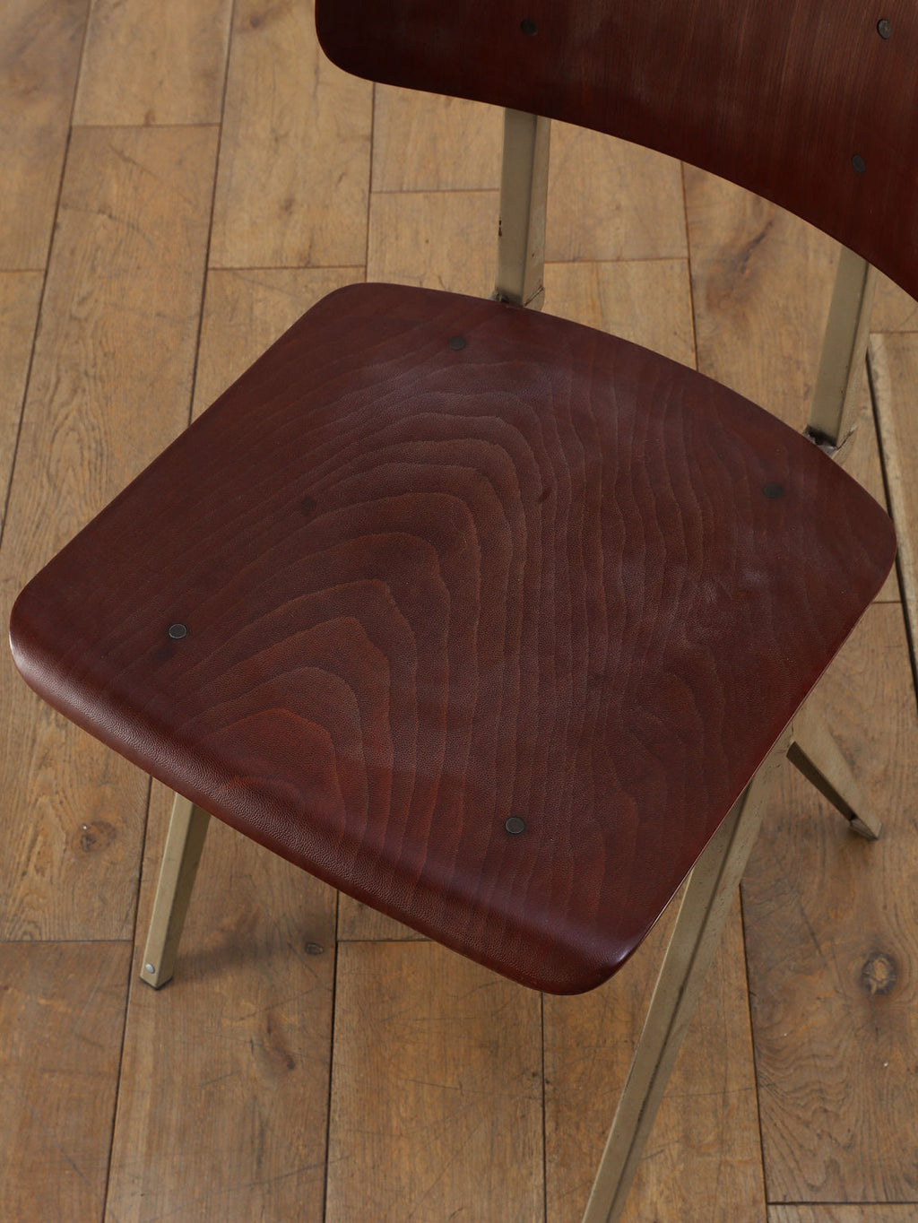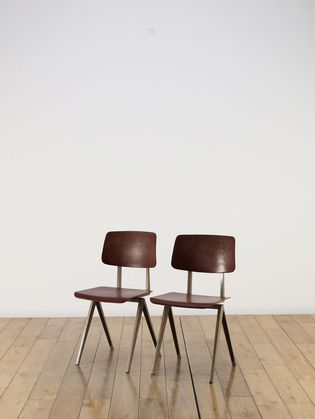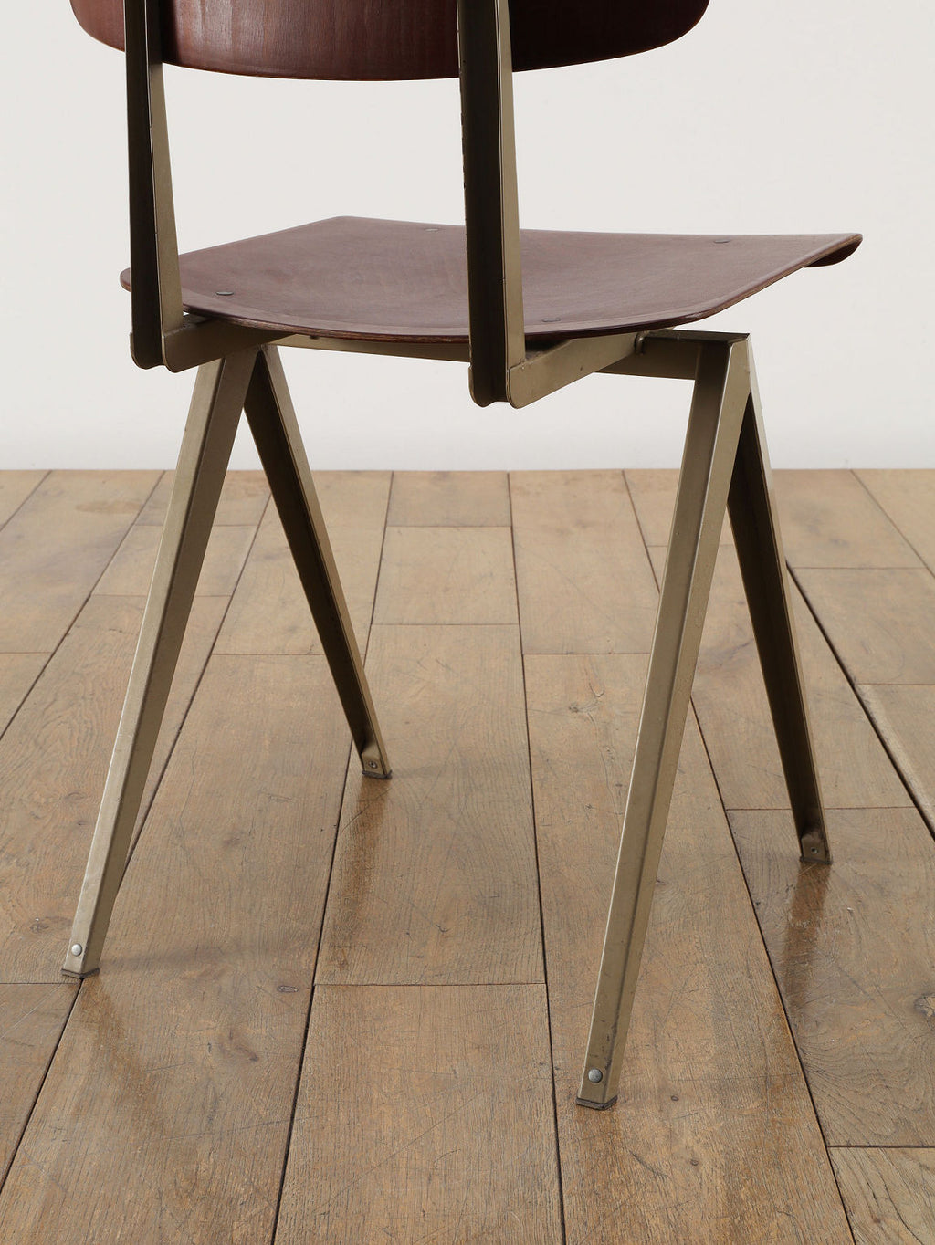 オランダヴィンテージを代表する家具メーカー、GALVANITAS社の実用性とデザイン性を兼ね備えたモデルNo.21のスタッキングチェア。ダークな色味のウッドと、左右対称のコンパス型のブラックメタルフレームの組み合わせが、インダストリアルでクールな雰囲気を演出します。ダイニングチェアとしてはもちろん、ワークデスクに合わせてアトリエのような雰囲気もお愉しみいただけます。スタッキングが可能なので、使わない時は重ねてコンパクトに収納できるのも嬉しいポイントです。
