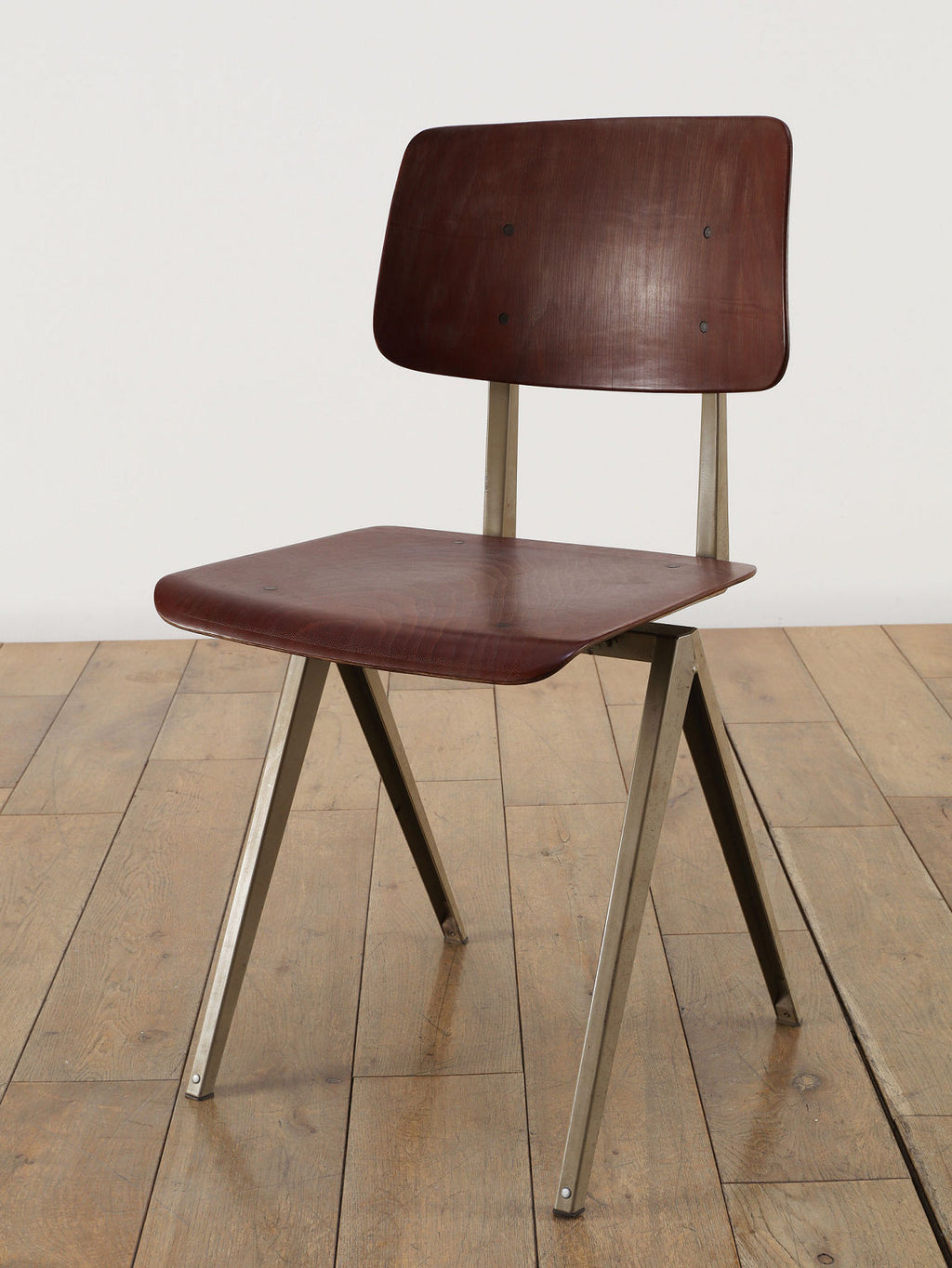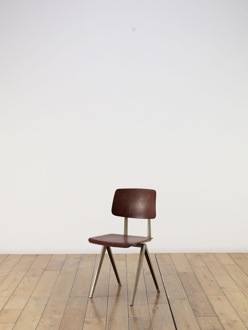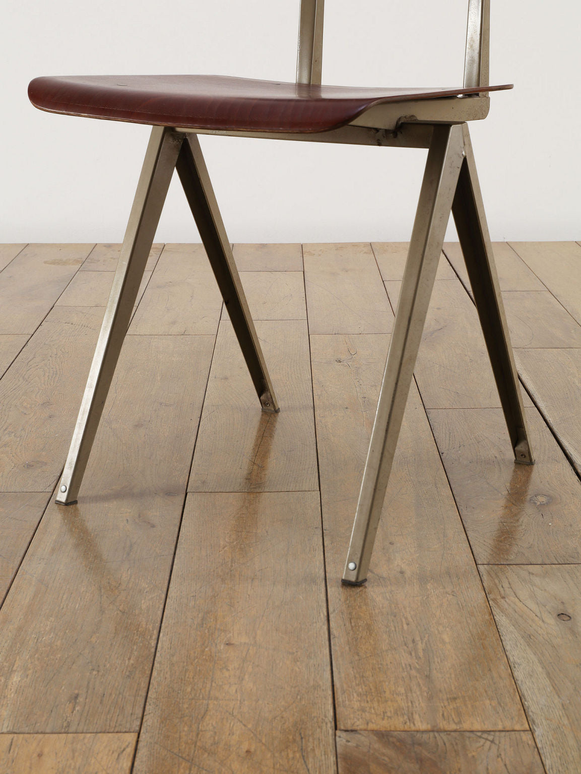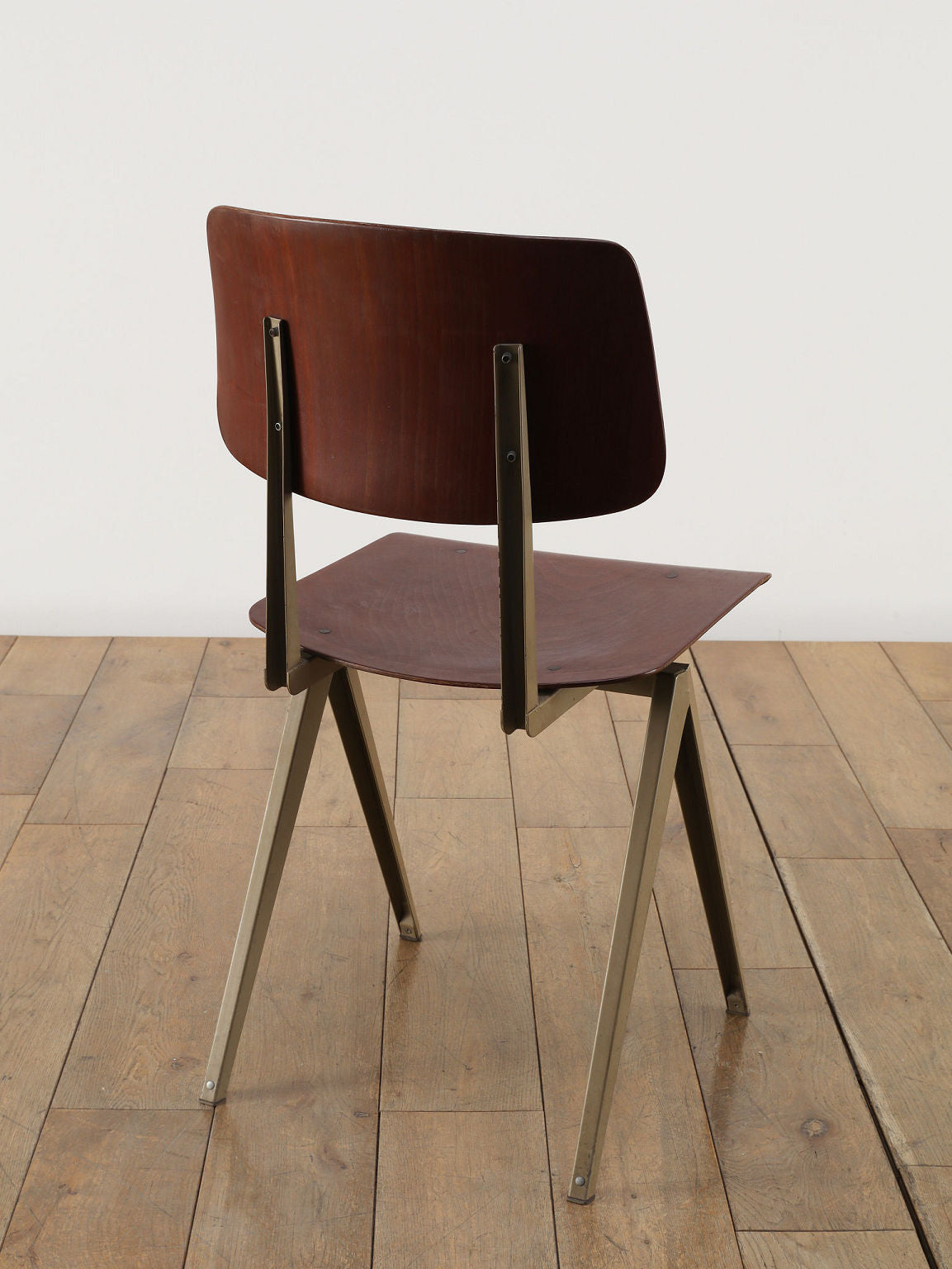 オランダヴィンテージを代表する家具メーカー、GALVANITAS社の実用性とデザイン性を兼ね備えたモデルNo.21のスタッキングチェア。ダークな色味のウッドと、左右対称のコンパス型のブラックメタルフレームの組み合わせが、インダストリアルでクールな雰囲気を演出します。ダイニングチェアとしてはもちろん、ワークデスクに合わせてアトリエのような雰囲気もお愉しみいただけます。スタッキングが可能なので、使わない時は重ねてコンパクトに収納できるのも嬉しいポイントです。