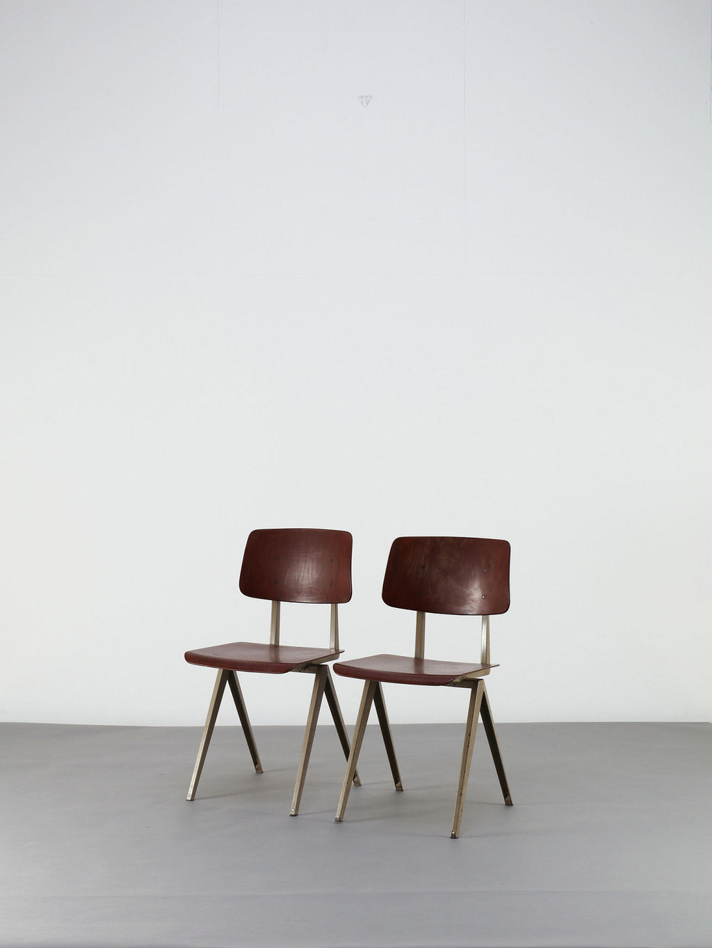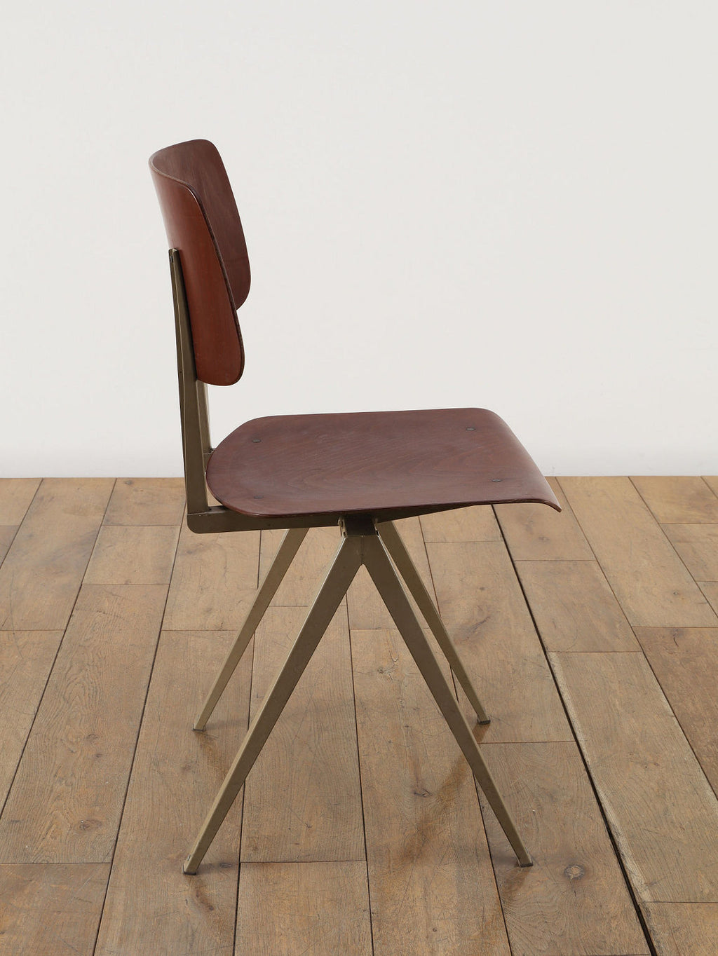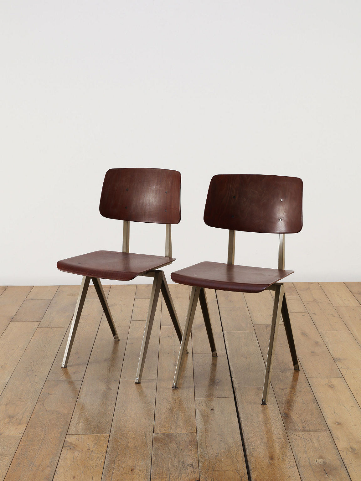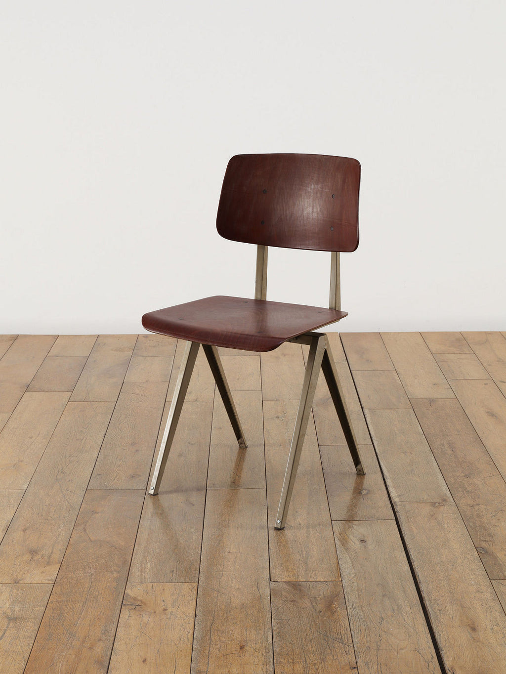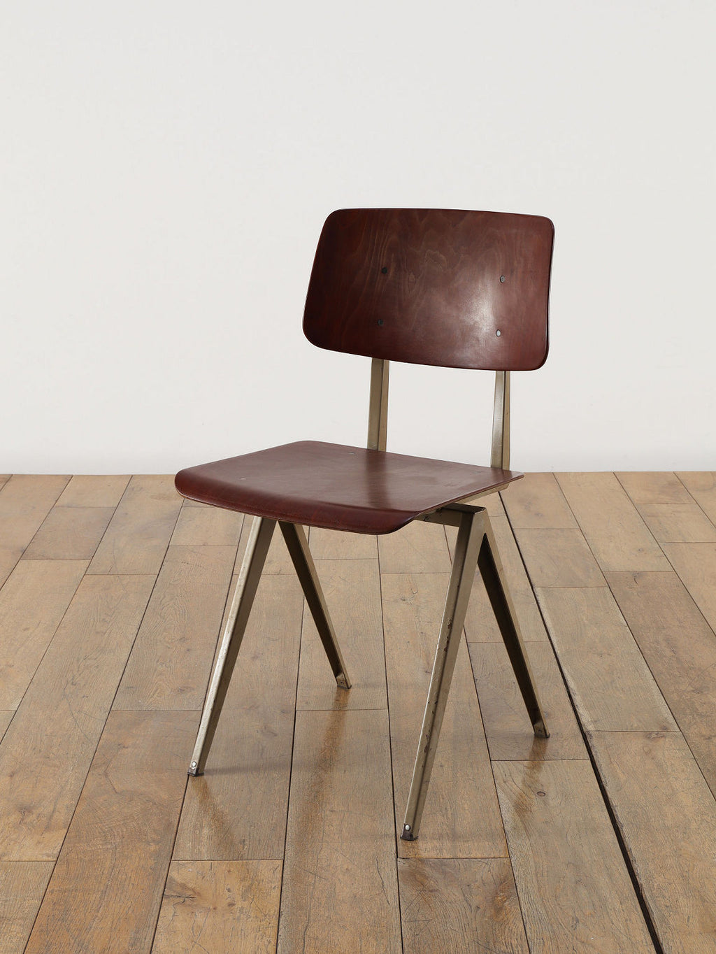 オランダヴィンテージを代表する家具メーカー、GALVANITAS社の実用性とデザイン性を兼ね備えたモデルNo.21のスタッキングチェア。ダークな色味のウッドと、左右対称のコンパス型のブラックメタルフレームの組み合わせが、インダストリアルでクールな雰囲気を演出します。ダイニングチェアとしてはもちろん、ワークデスクに合わせてアトリエのような雰囲気もお愉しみいただけます。スタッキングが可能なので、使わない時は重ねてコンパクトに収納できるのも嬉しいポイントです。