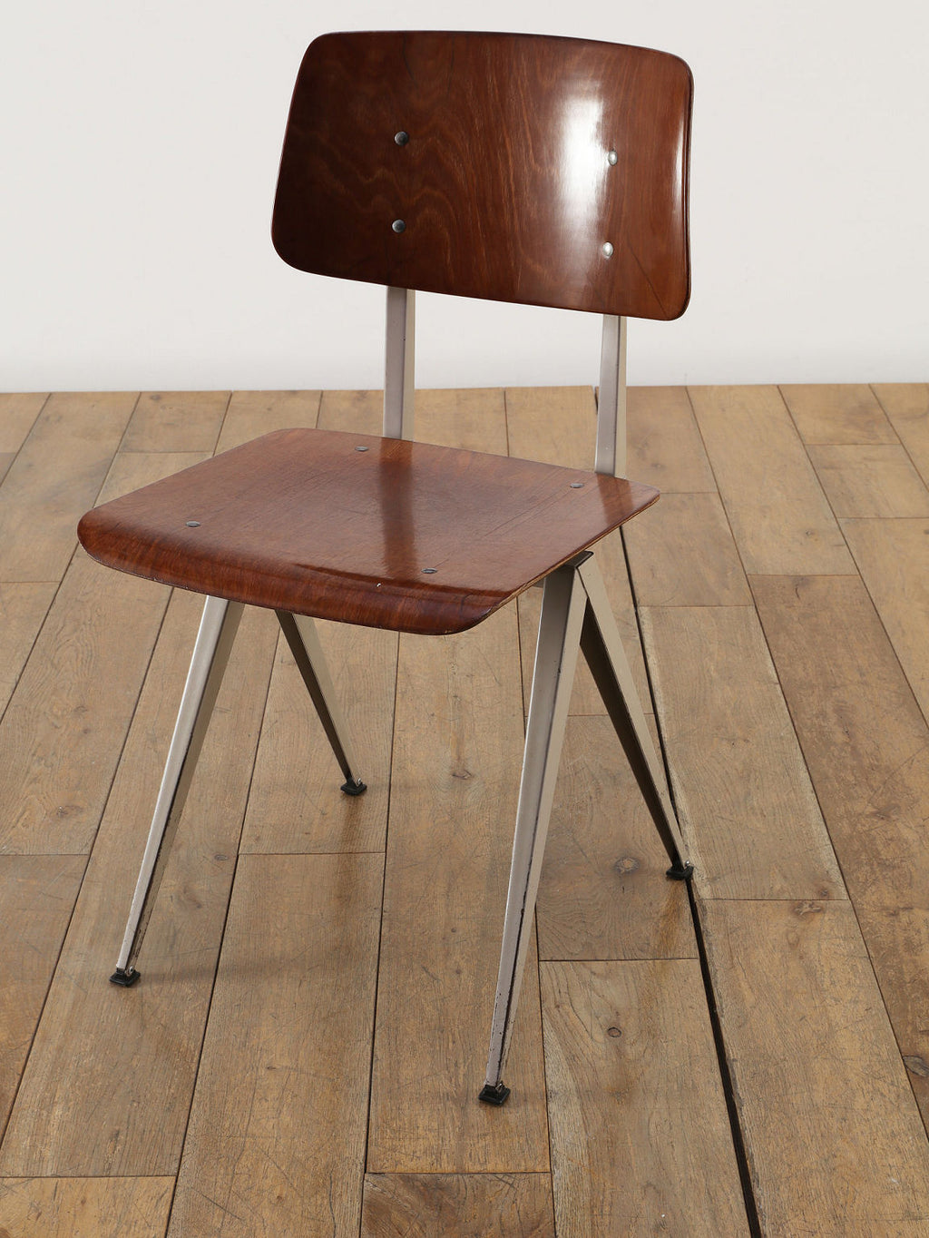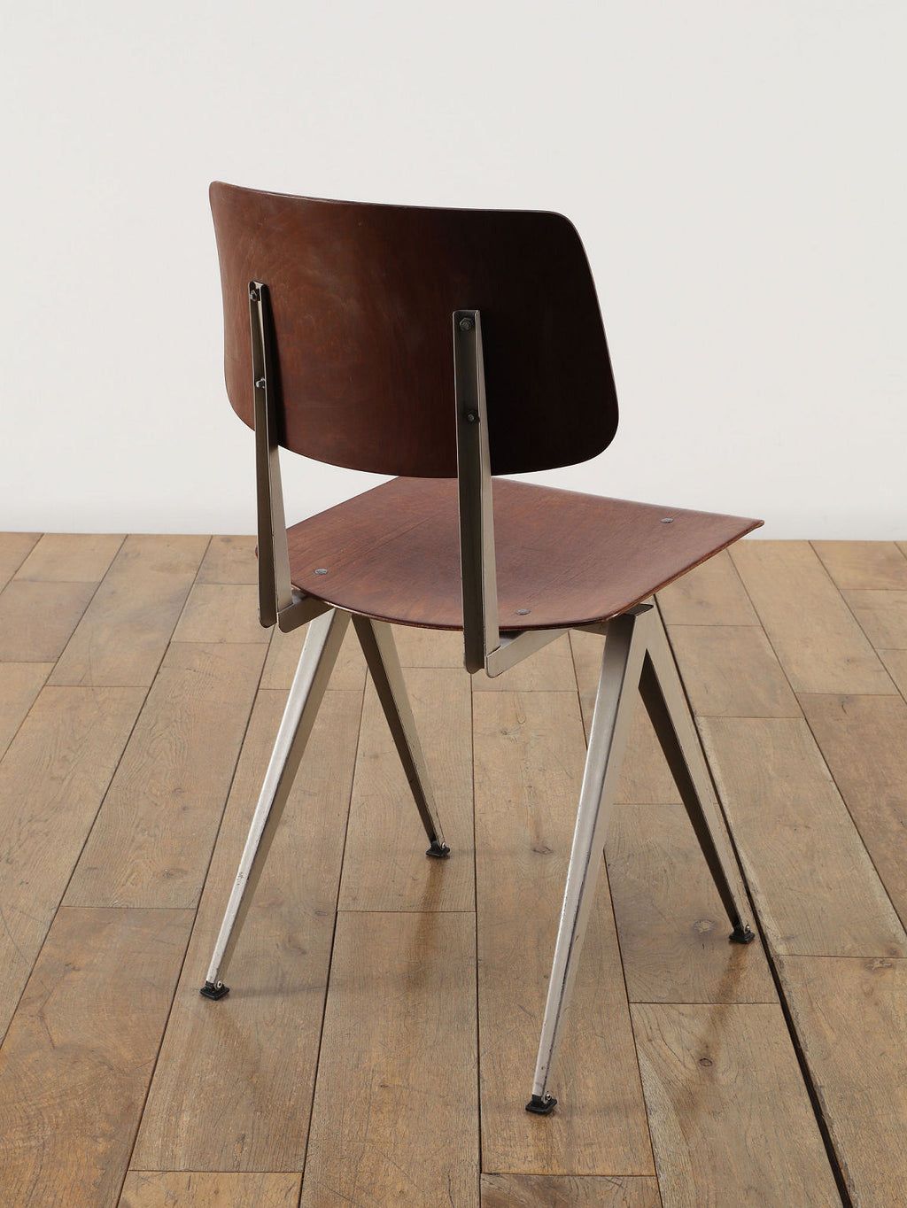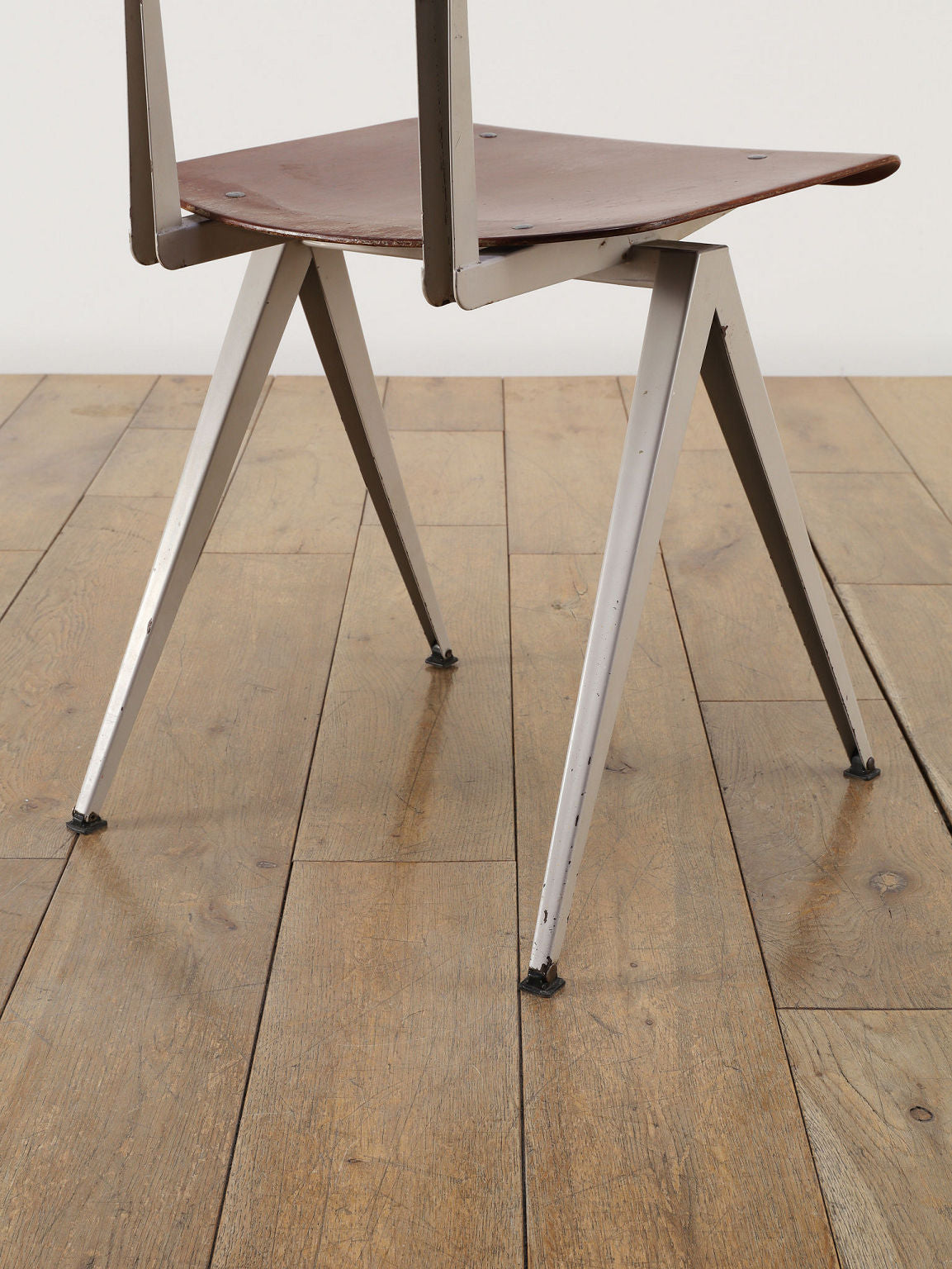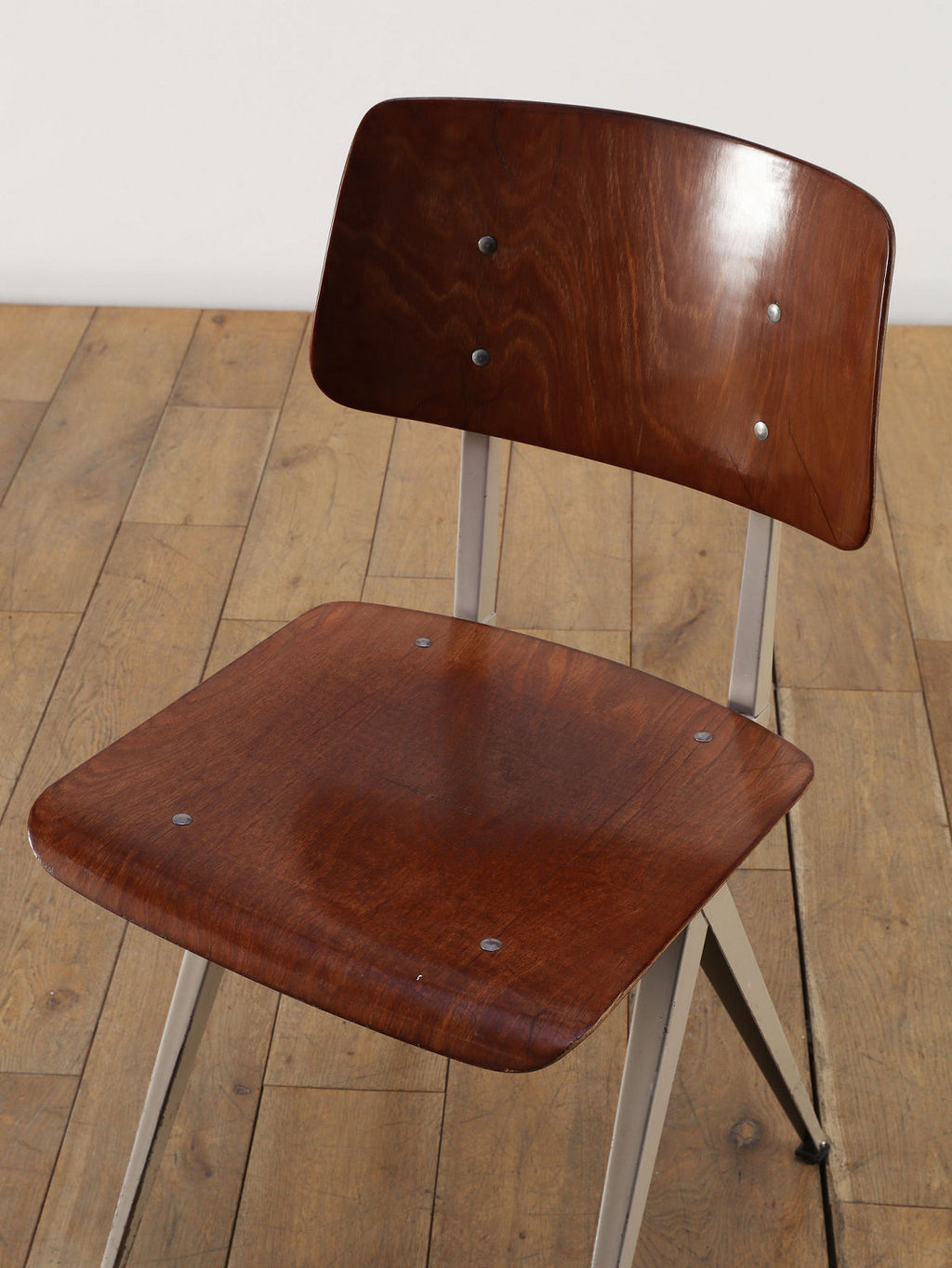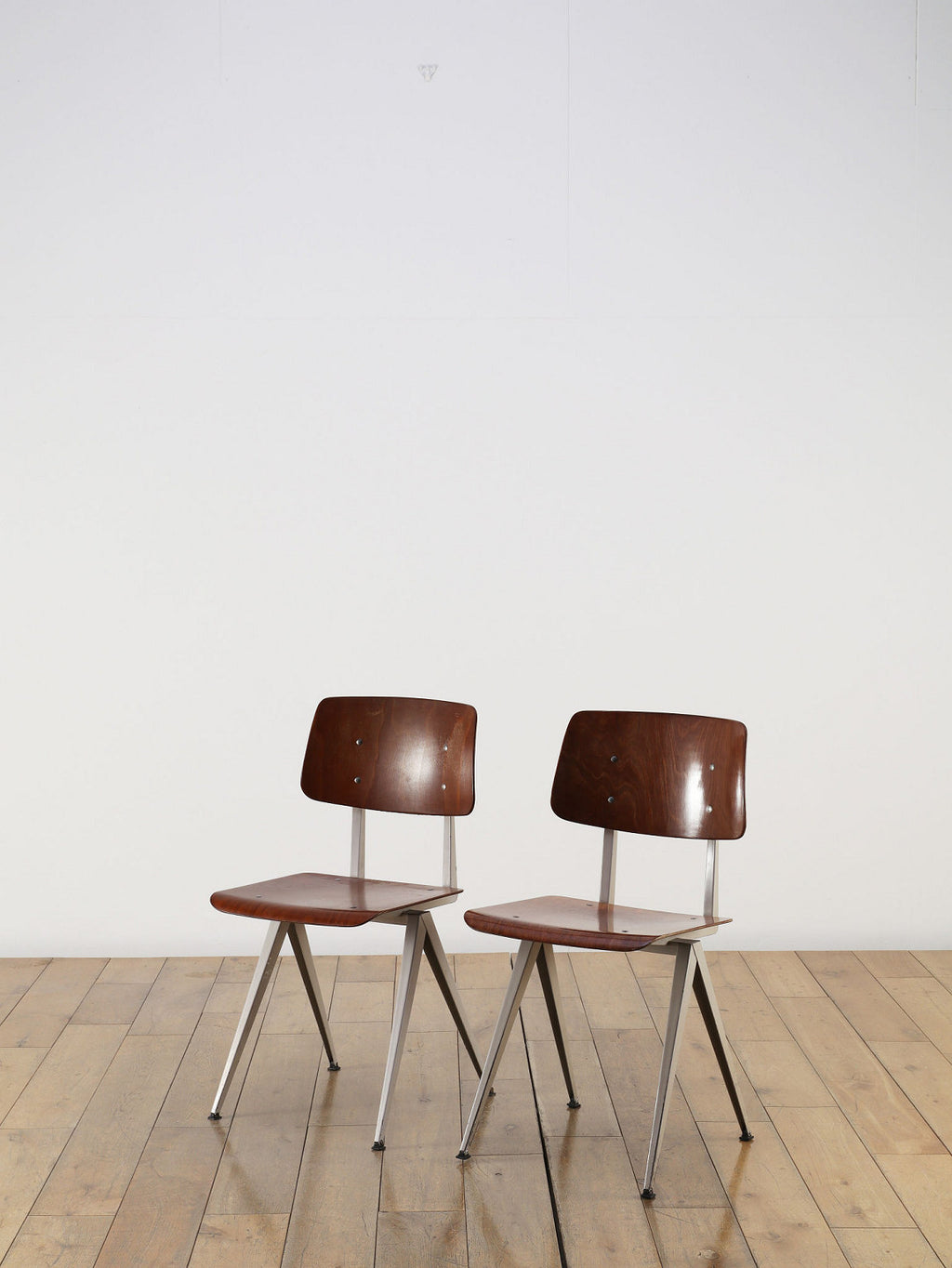 オランダヴィンテージを代表する家具メーカー、GALVANITAS社の実用性とデザイン性を兼ね備えたモデルNo.21のスタッキングチェア。ダークな色味のウッドと、左右対称のコンパス型のブラックメタルフレームの組み合わせが、インダストリアルでクールな雰囲気を演出します。ダイニングチェアとしてはもちろん、ワークデスクに合わせてアトリエのような雰囲気もお愉しみいただけます。スタッキングが可能なので、使わない時は重ねてコンパクトに収納できるのも嬉しいポイントです。