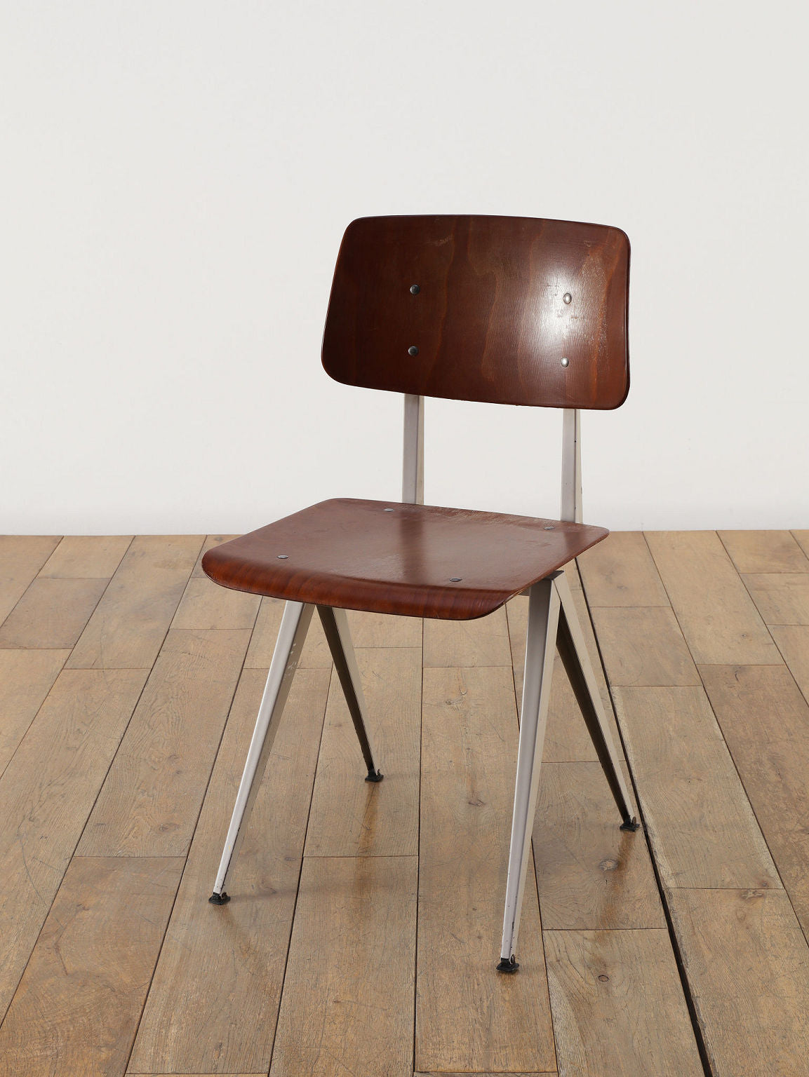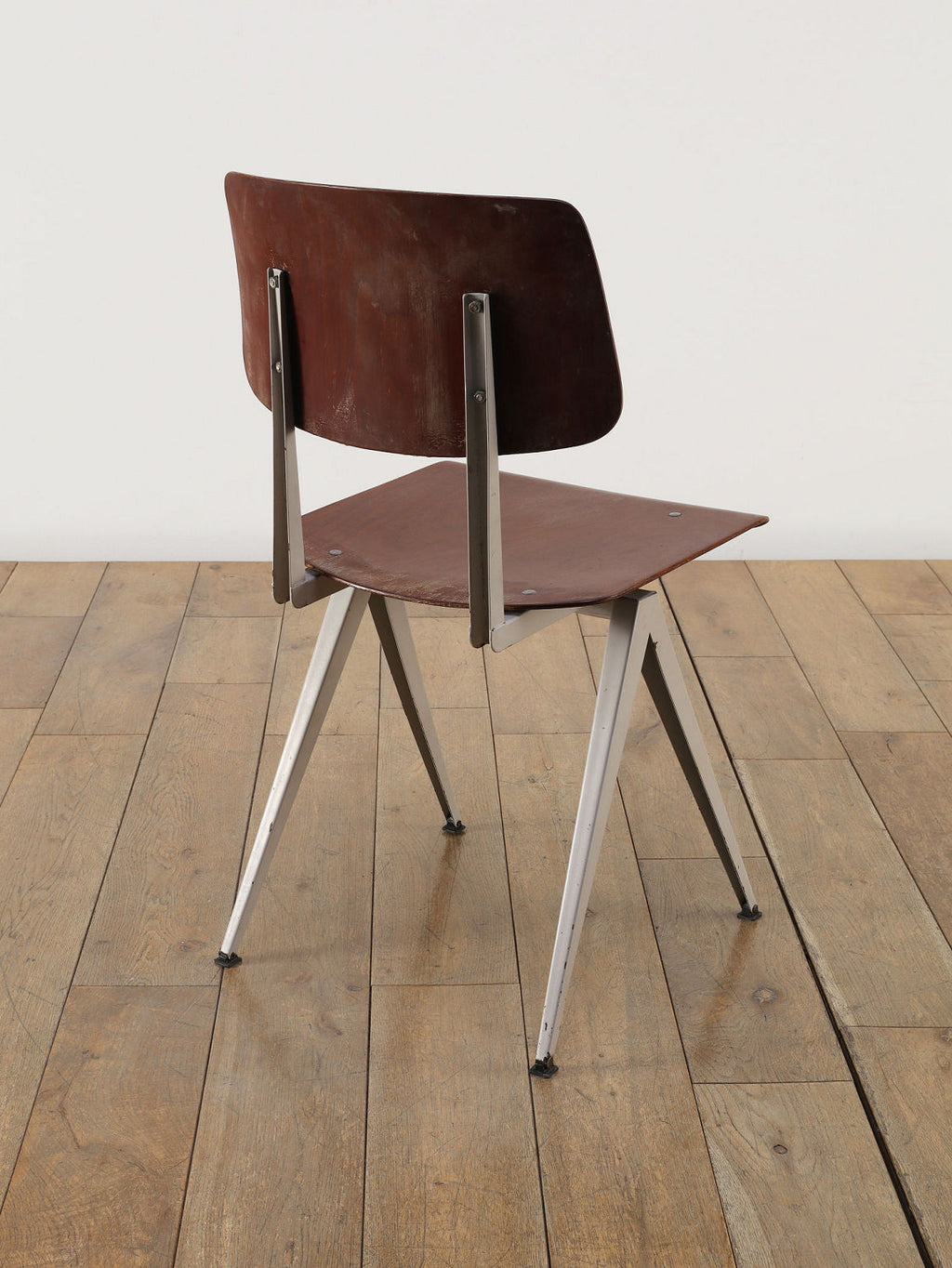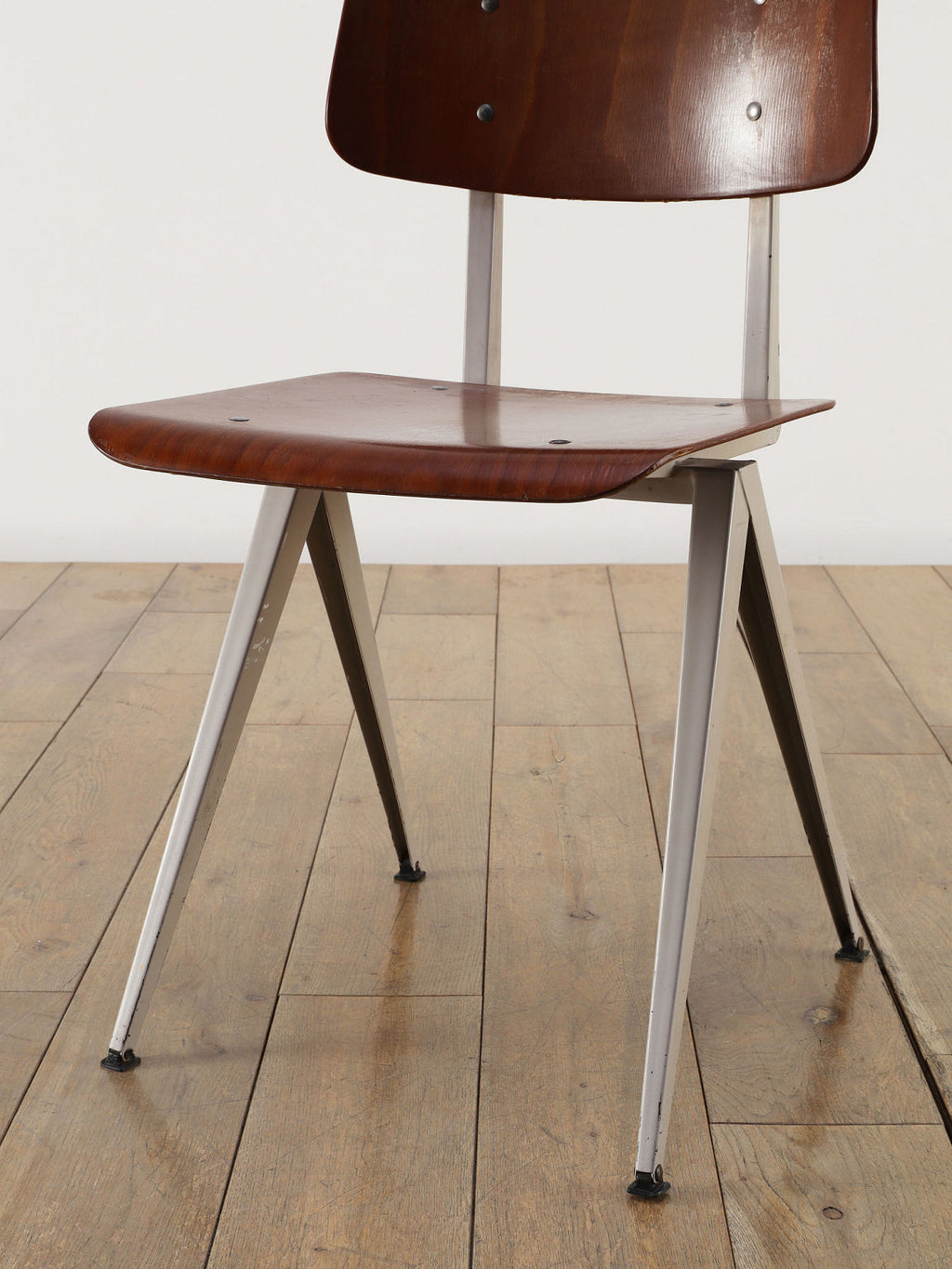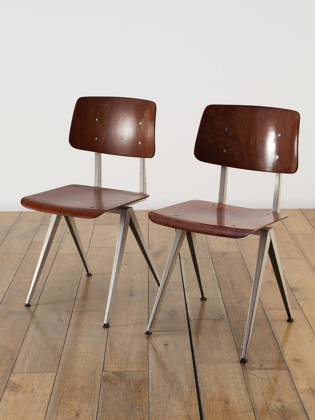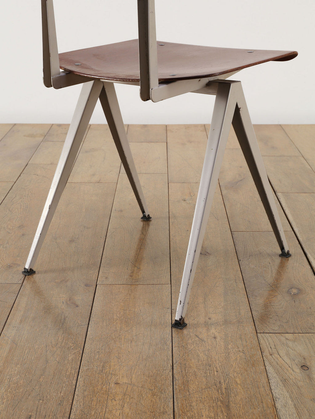 オランダヴィンテージを代表する家具メーカー、GALVANITAS社の実用性とデザイン性を兼ね備えたモデルNo.21のスタッキングチェア。ダークな色味のウッドと、左右対称のコンパス型のブラックメタルフレームの組み合わせが、インダストリアルでクールな雰囲気を演出します。ダイニングチェアとしてはもちろん、ワークデスクに合わせてアトリエのような雰囲気もお愉しみいただけます。スタッキングが可能なので、使わない時は重ねてコンパクトに収納できるのも嬉しいポイントです。