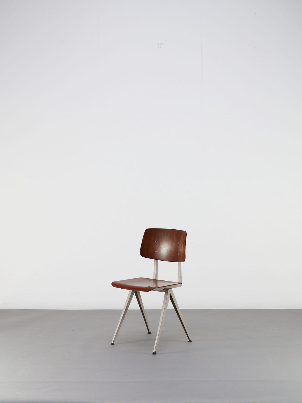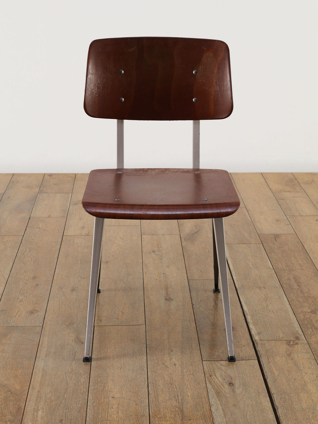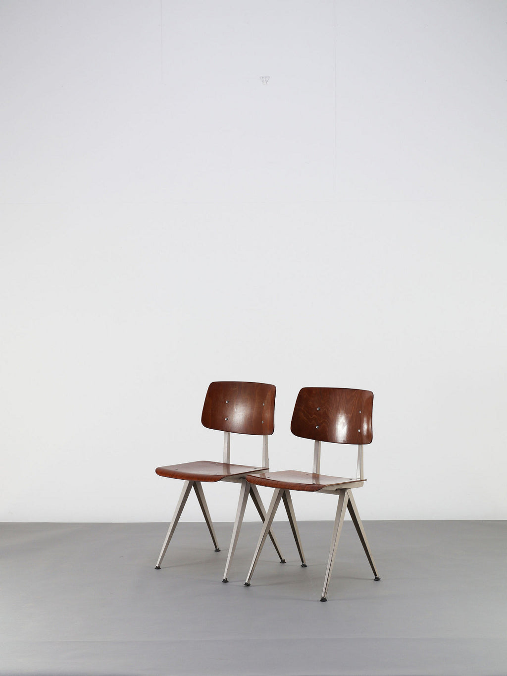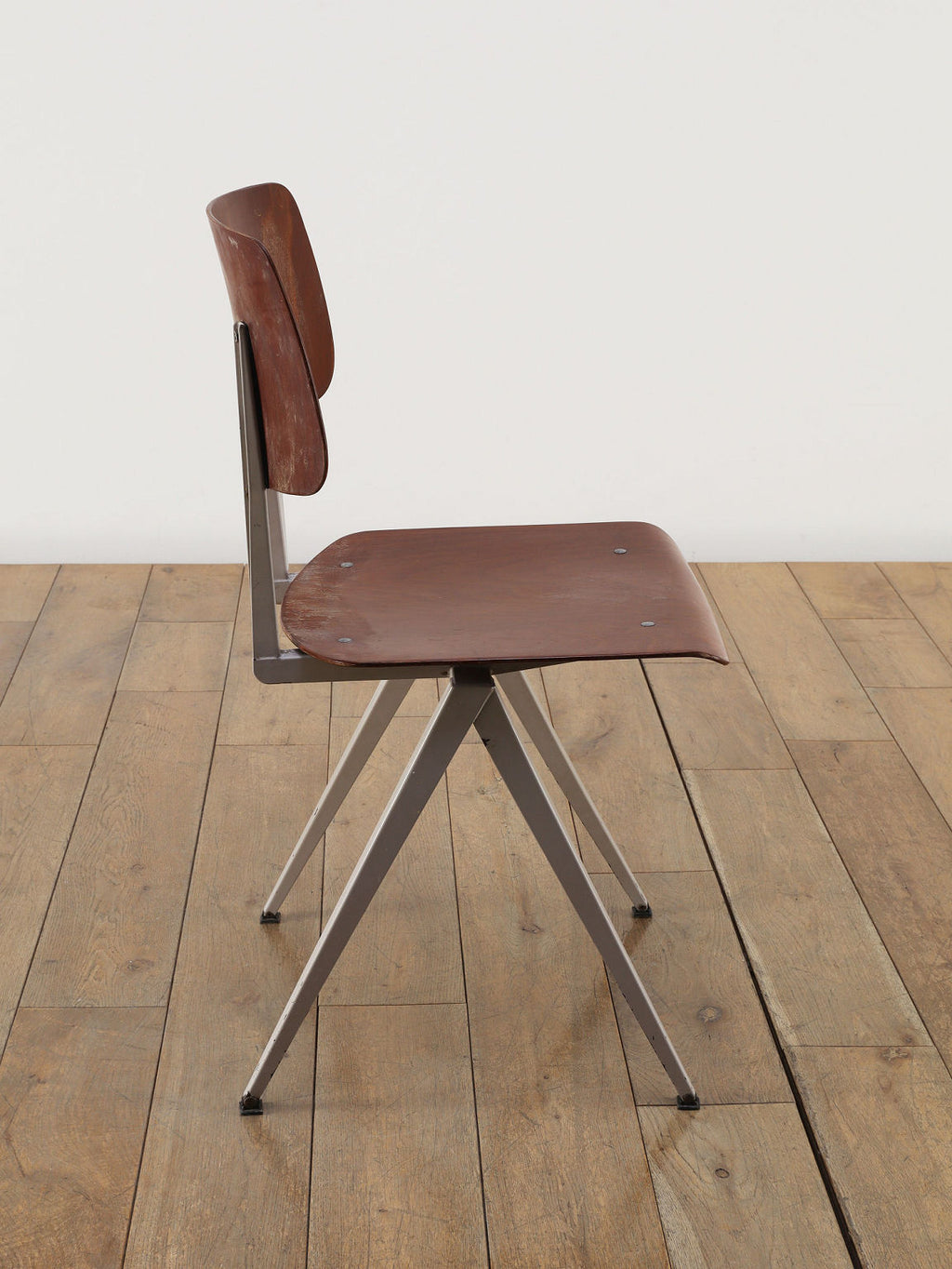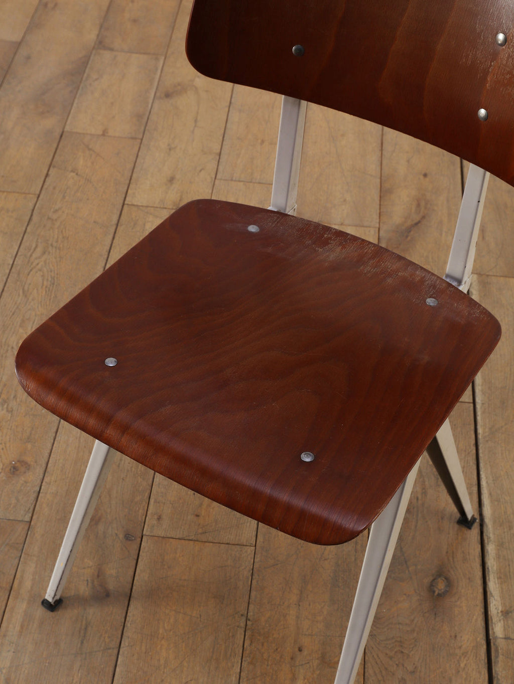 オランダヴィンテージを代表する家具メーカー、GALVANITAS社の実用性とデザイン性を兼ね備えたモデルNo.21のスタッキングチェア。ダークな色味のウッドと、左右対称のコンパス型のブラックメタルフレームの組み合わせが、インダストリアルでクールな雰囲気を演出します。ダイニングチェアとしてはもちろん、ワークデスクに合わせてアトリエのような雰囲気もお愉しみいただけます。スタッキングが可能なので、使わない時は重ねてコンパクトに収納できるのも嬉しいポイントです。