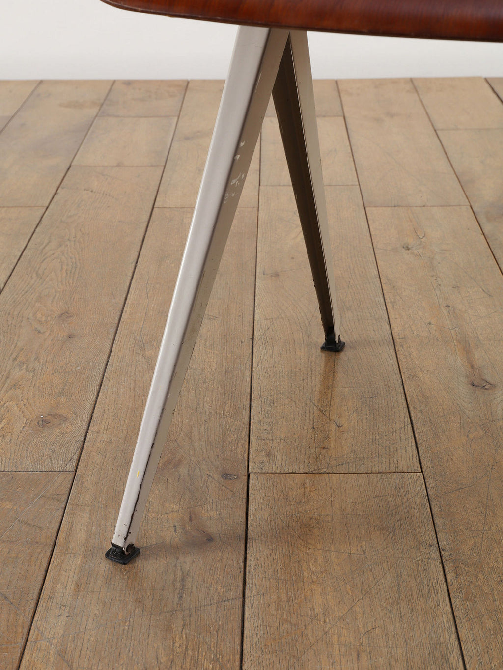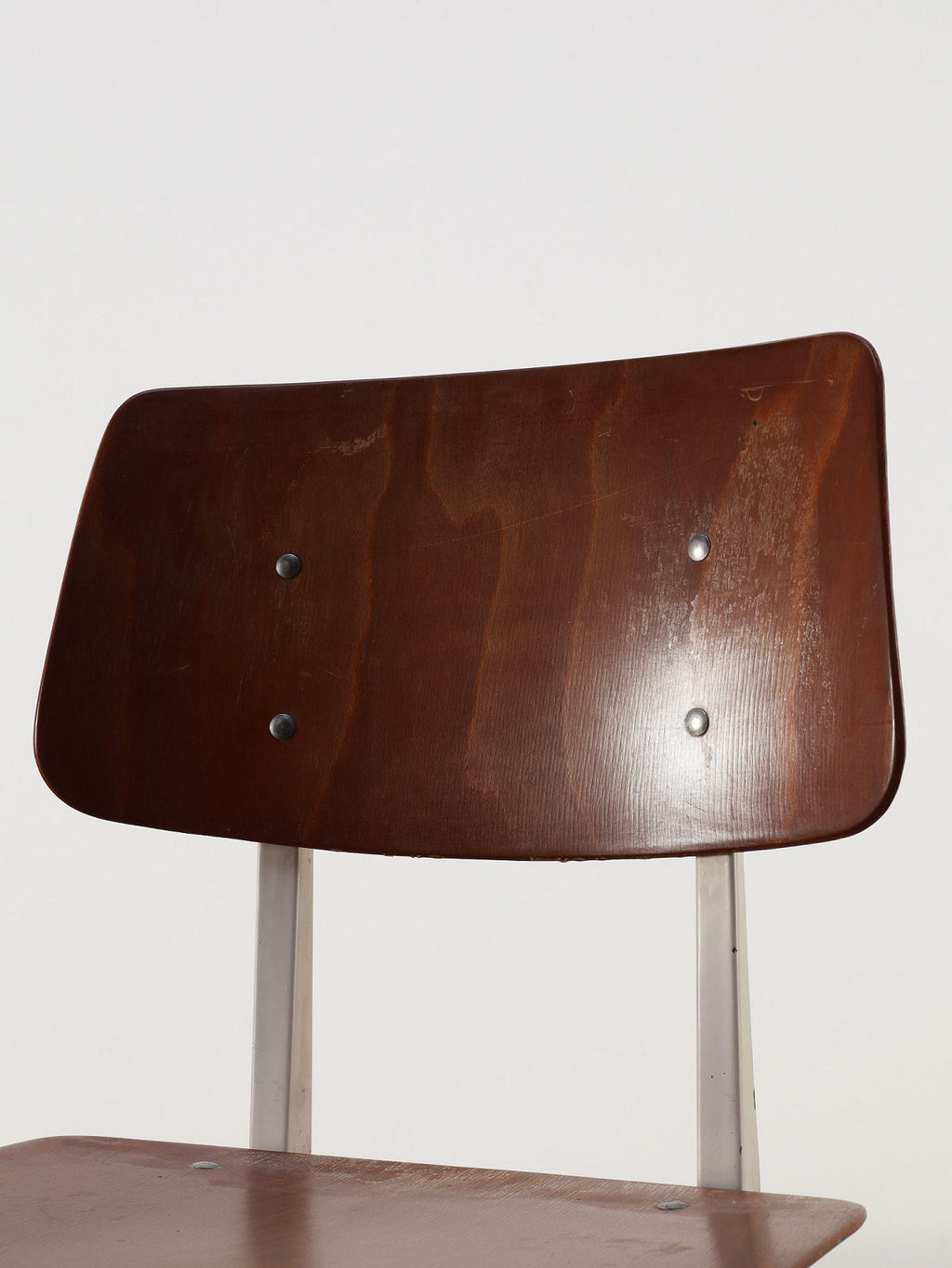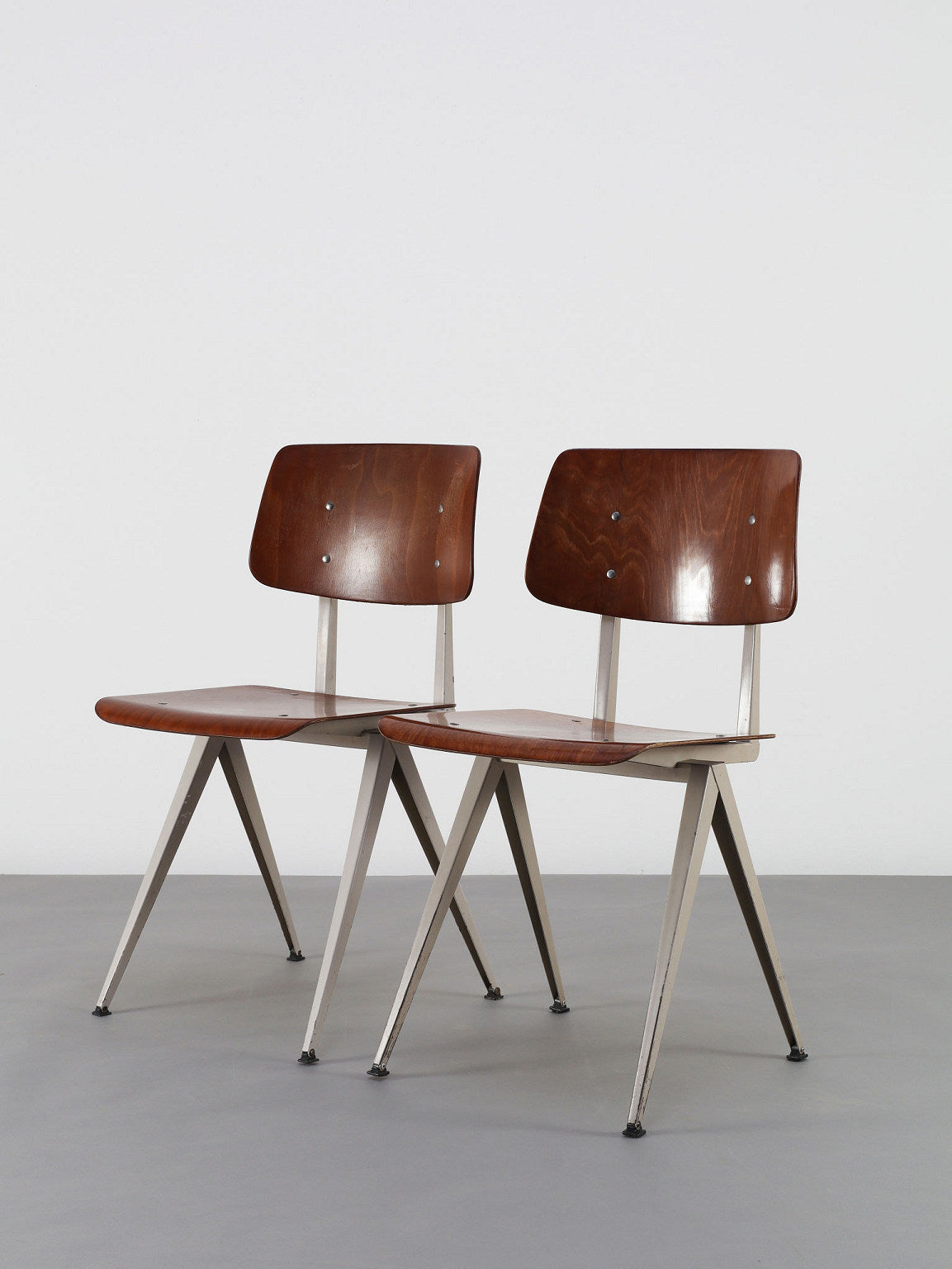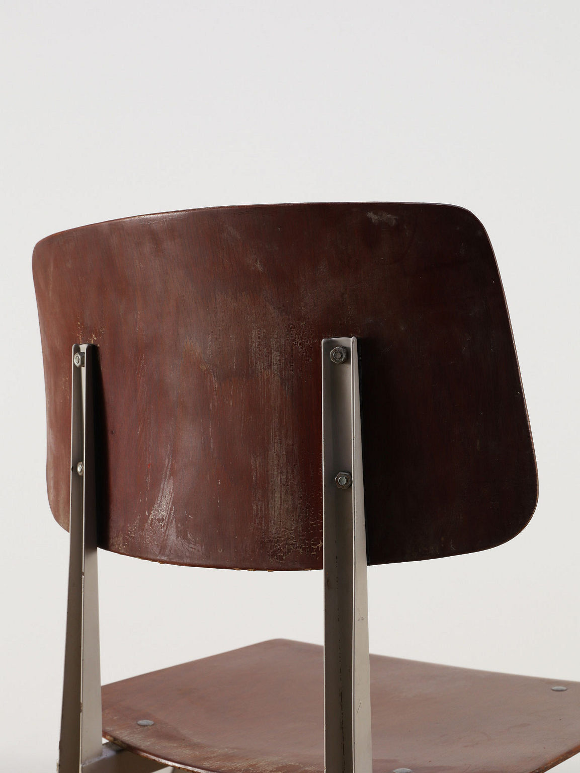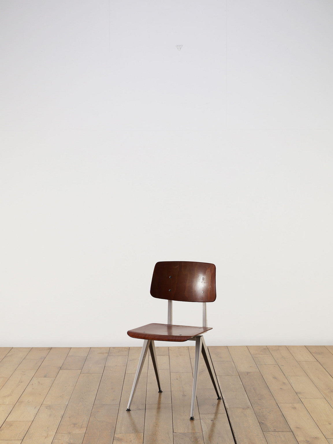 オランダヴィンテージを代表する家具メーカー、GALVANITAS社の実用性とデザイン性を兼ね備えたモデルNo.21のスタッキングチェア。ダークな色味のウッドと、左右対称のコンパス型のブラックメタルフレームの組み合わせが、インダストリアルでクールな雰囲気を演出します。ダイニングチェアとしてはもちろん、ワークデスクに合わせてアトリエのような雰囲気もお愉しみいただけます。スタッキングが可能なので、使わない時は重ねてコンパクトに収納できるのも嬉しいポイントです。