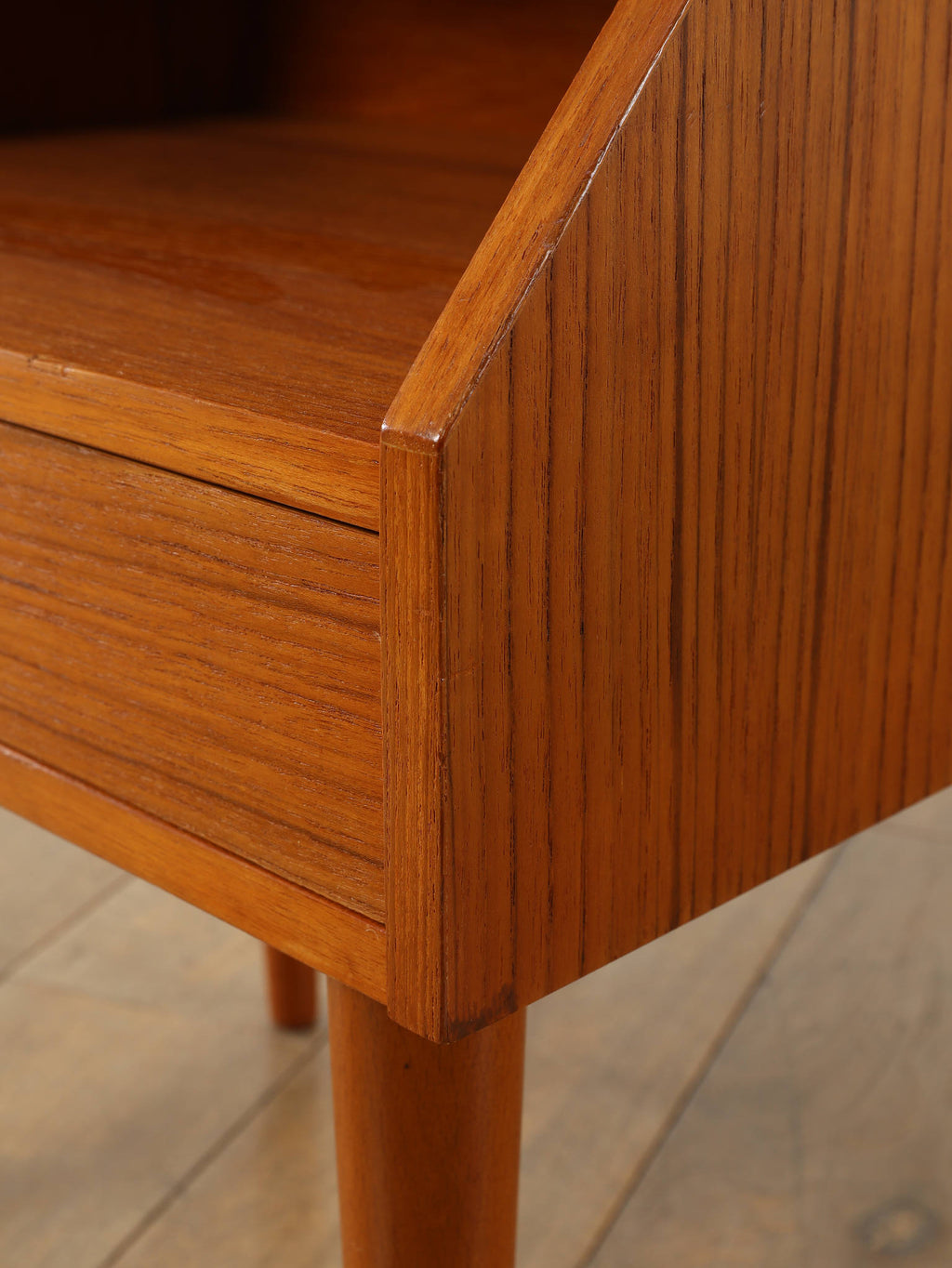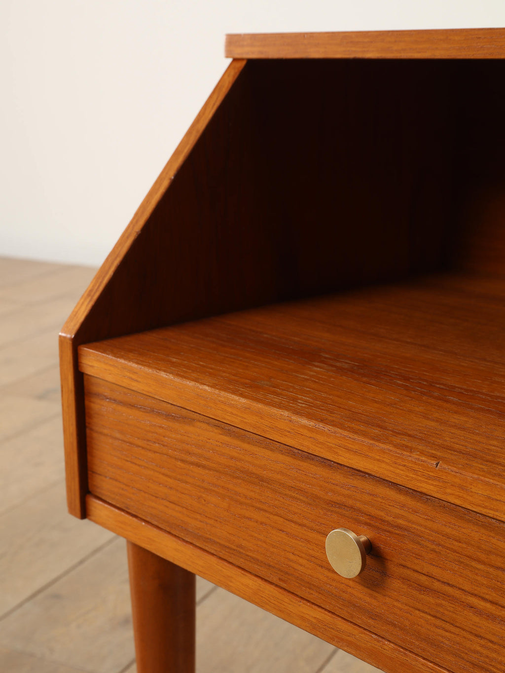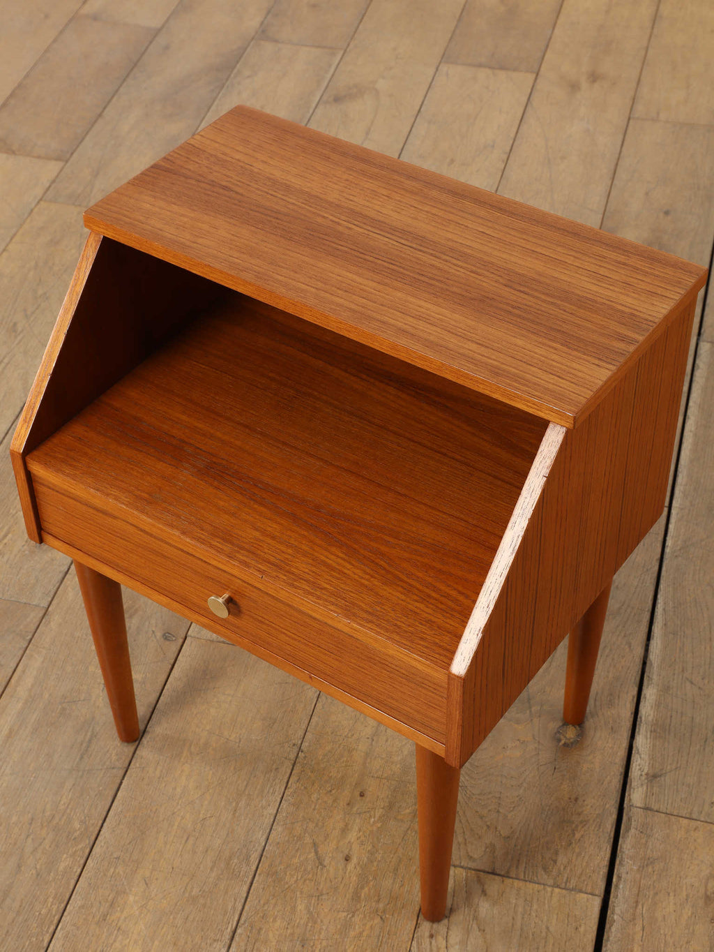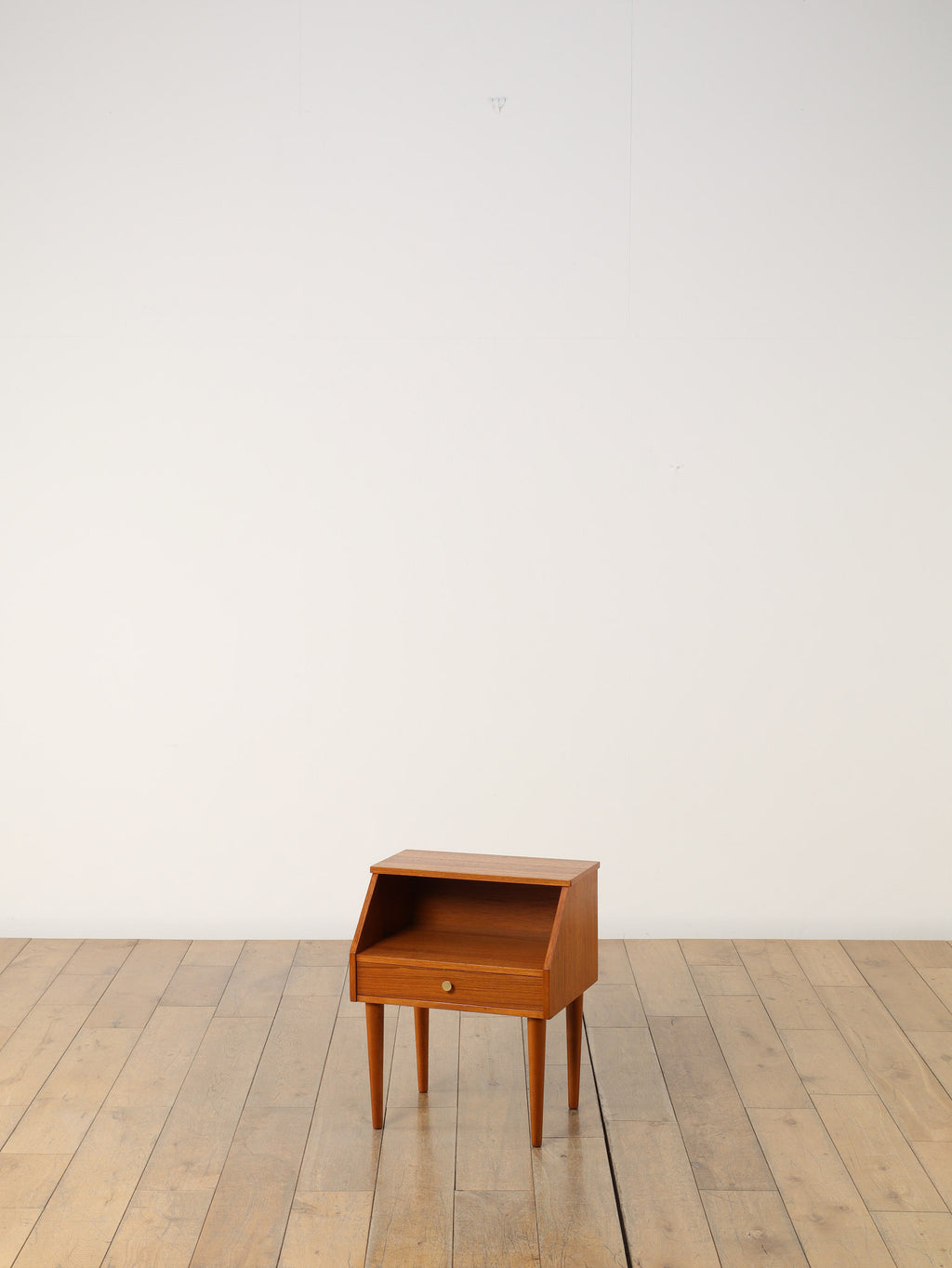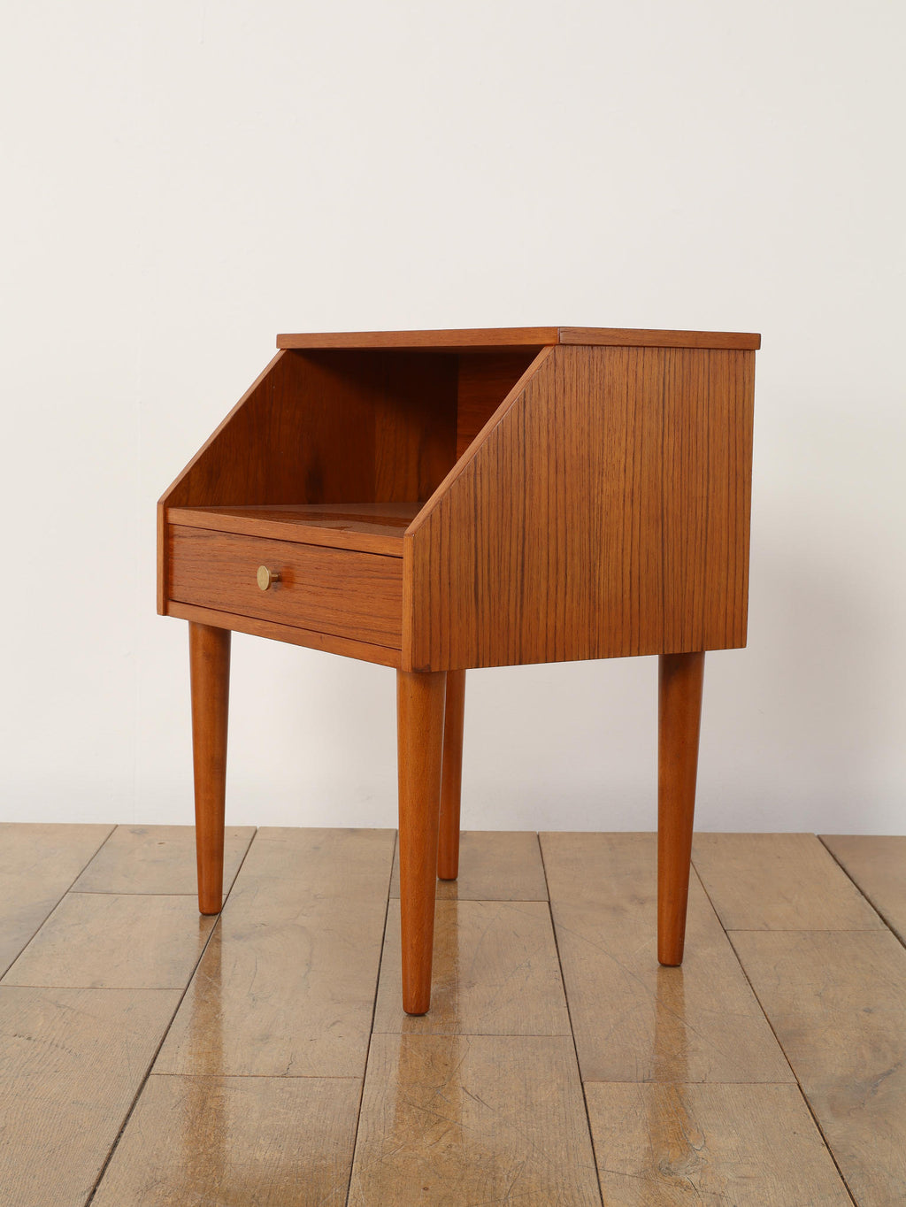 1960年代(推定)デンマークで丁寧に製作された、チーク材のベッドサイドテーブルです。小さいアイテムでありながら、確かな存在感を放つのは、計算し尽くされたデザインの賜物です。天板と側面が斜めに構成された直線的な美しいフォルムは、チーク材の温かみと相まって、シンプルながらも彫刻的な魅力を感じさせます。この角度を持ったデザインは、置かれた空間にモダンで洗練された空気をもたらします。上部のオープンシェルフは、就寝前の読書本を置くのに最適であり、下部の引き出しには、細々とした日用品を隠して収納できます。すらりと伸びたテーパードレッグは、全体の軽やかさを強調し、ベッドルームやリビングの片隅に置いても圧迫感がありません。