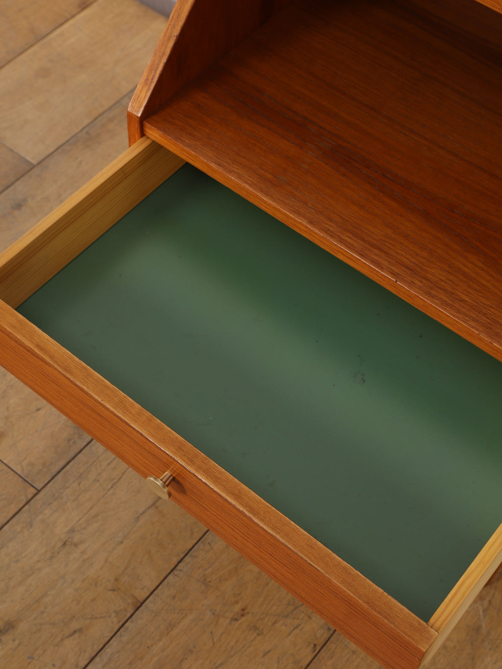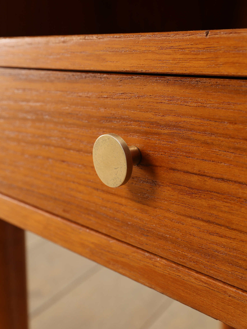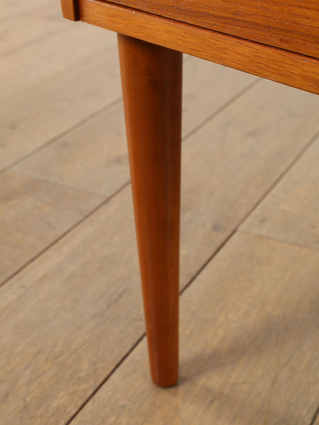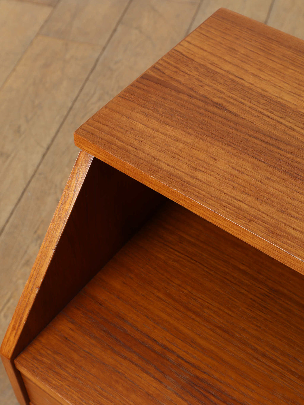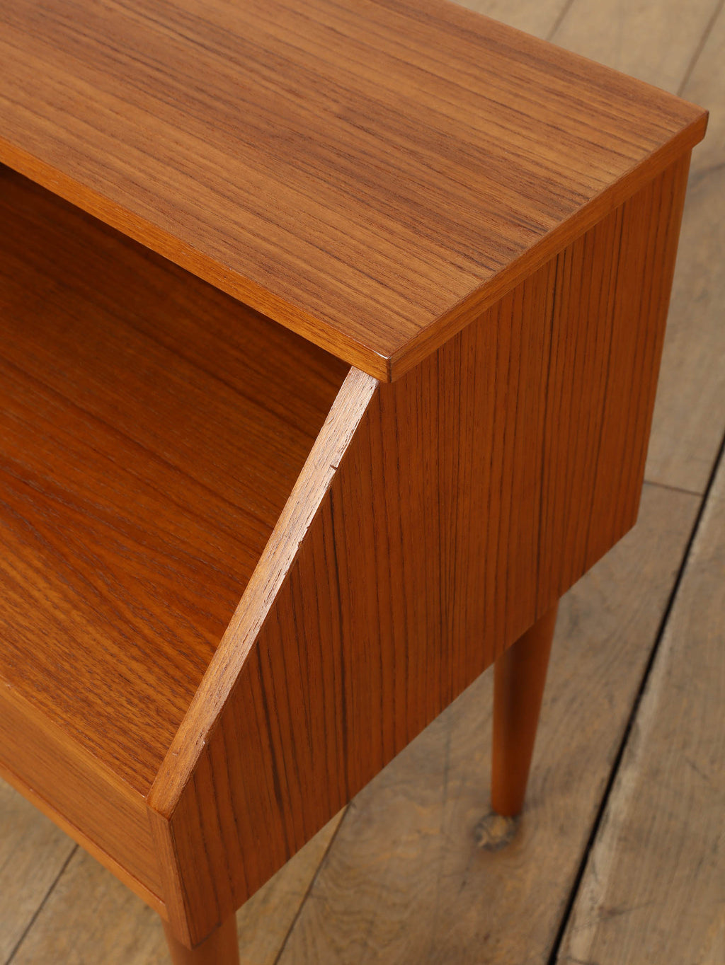 1960年代(推定)デンマークで丁寧に製作された、チーク材のベッドサイドテーブルです。小さいアイテムでありながら、確かな存在感を放つのは、計算し尽くされたデザインの賜物です。天板と側面が斜めに構成された直線的な美しいフォルムは、チーク材の温かみと相まって、シンプルながらも彫刻的な魅力を感じさせます。この角度を持ったデザインは、置かれた空間にモダンで洗練された空気をもたらします。上部のオープンシェルフは、就寝前の読書本を置くのに最適であり、下部の引き出しには、細々とした日用品を隠して収納できます。すらりと伸びたテーパードレッグは、全体の軽やかさを強調し、ベッドルームやリビングの片隅に置いても圧迫感がありません。