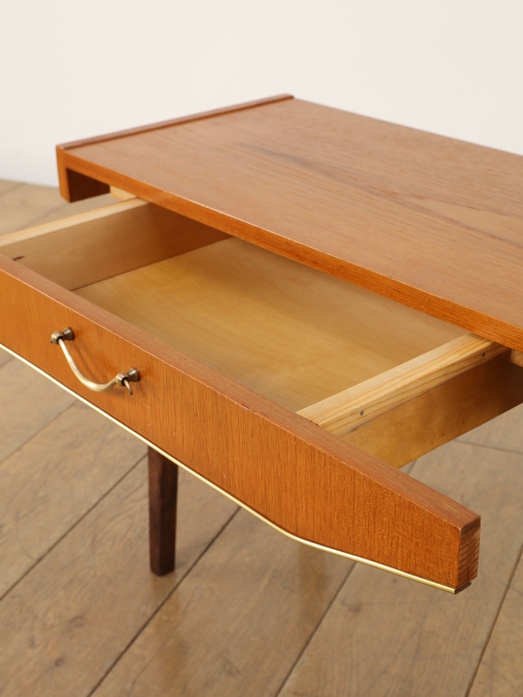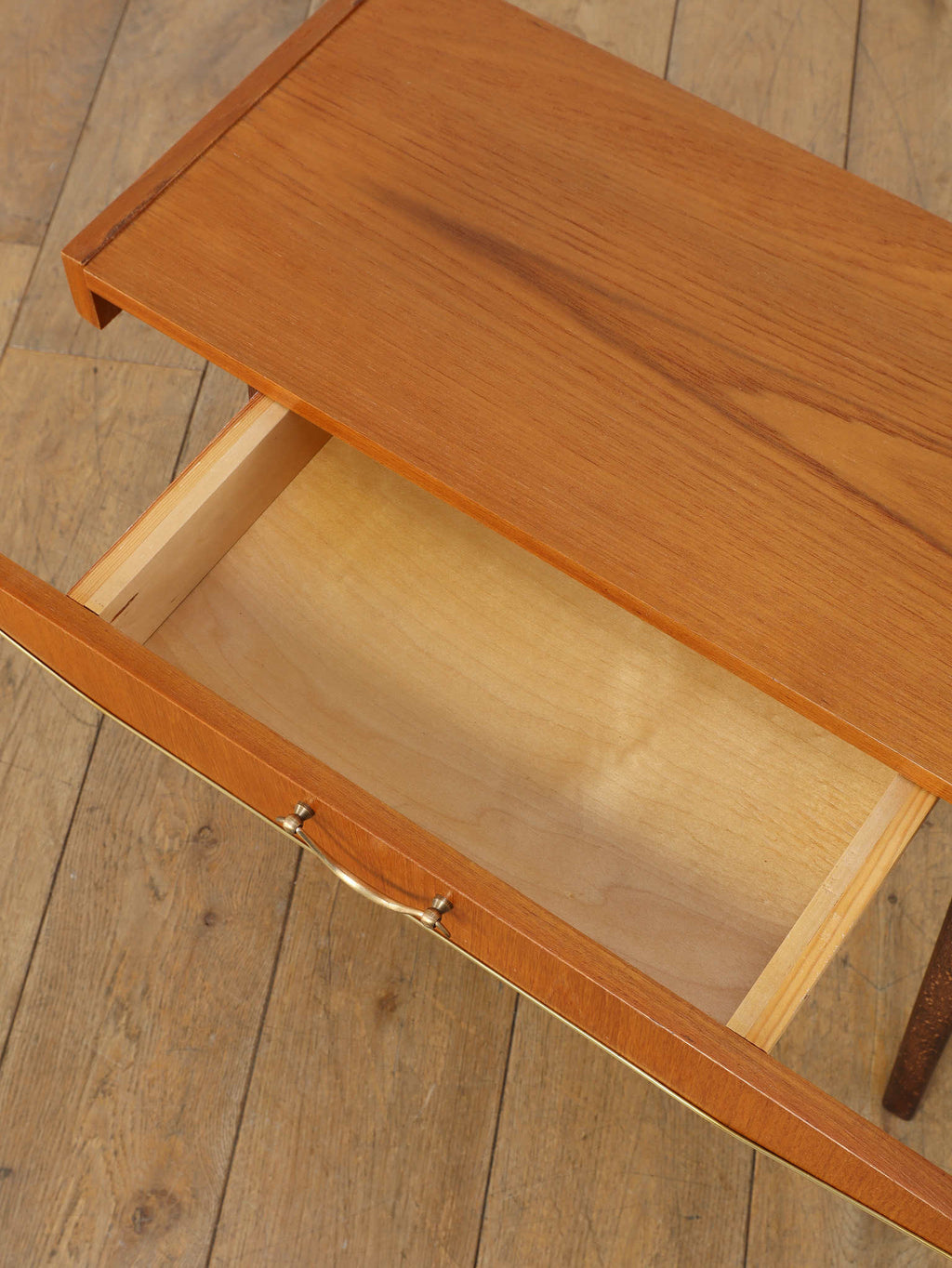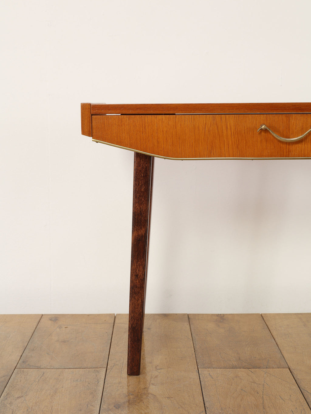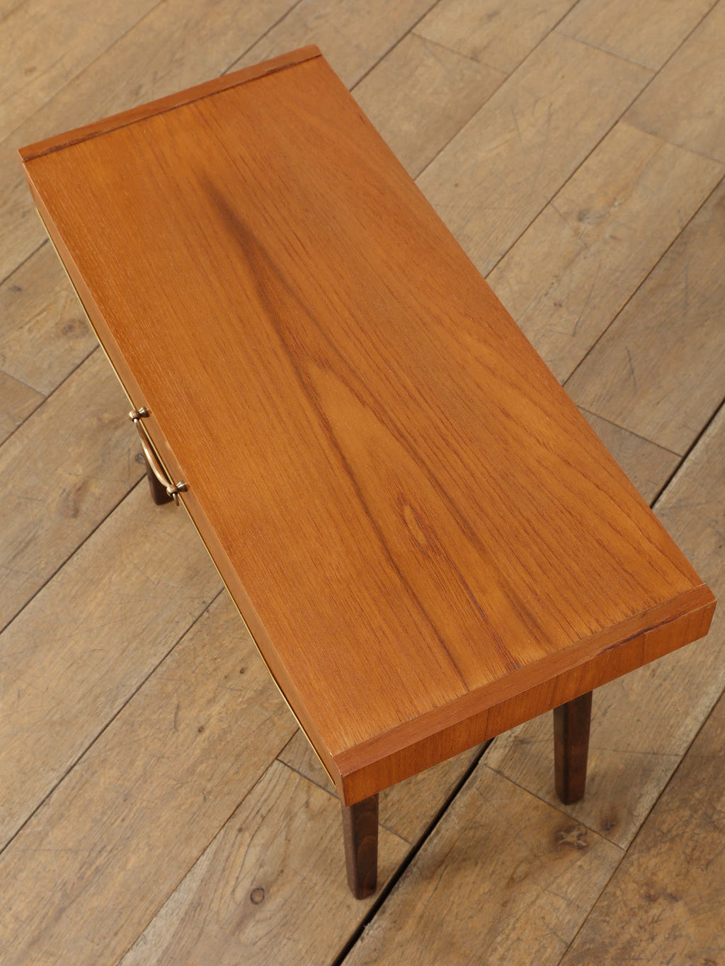1960年代(推定)、デンマーク製のスモールチェストです。 上質なチーク材の温かく深みのある杢目が美しく、北欧デザインらしい洗練された雰囲気をまとっています。玄関や廊下など、限られたスペースにもすっきりと収まるスリムなフォルムが特徴です。目を引くのは、緩やかな曲線を描く引き出しの前面。真鍮製のクラシカルな取っ手や、引き出し下部にあしらわれた細い金属のラインが、シンプルなデザインに上品なアクセントを加えています。すっと伸びる脚部が、全体に軽やかな印象を与えます。玄関で鍵や小物を収納するコンソールとして、あるいはソファサイドやベッドサイドのテーブルとしても活躍します。空間に上質な落ち着きと北欧ヴィンテージならではの温もりを添える、デザイン性の高い小家具です。
