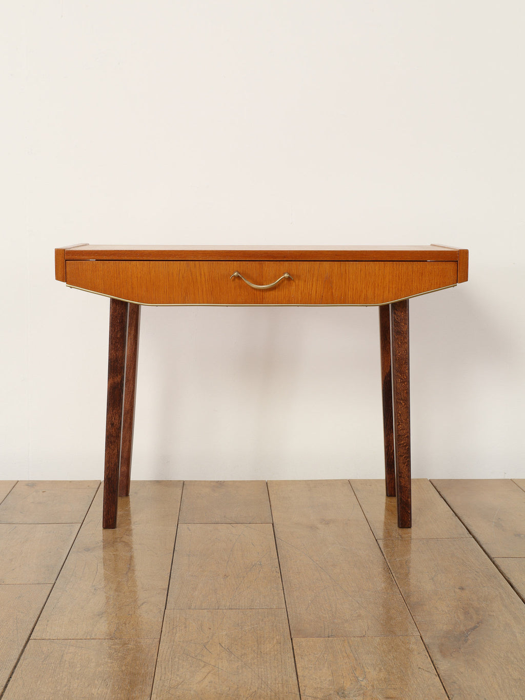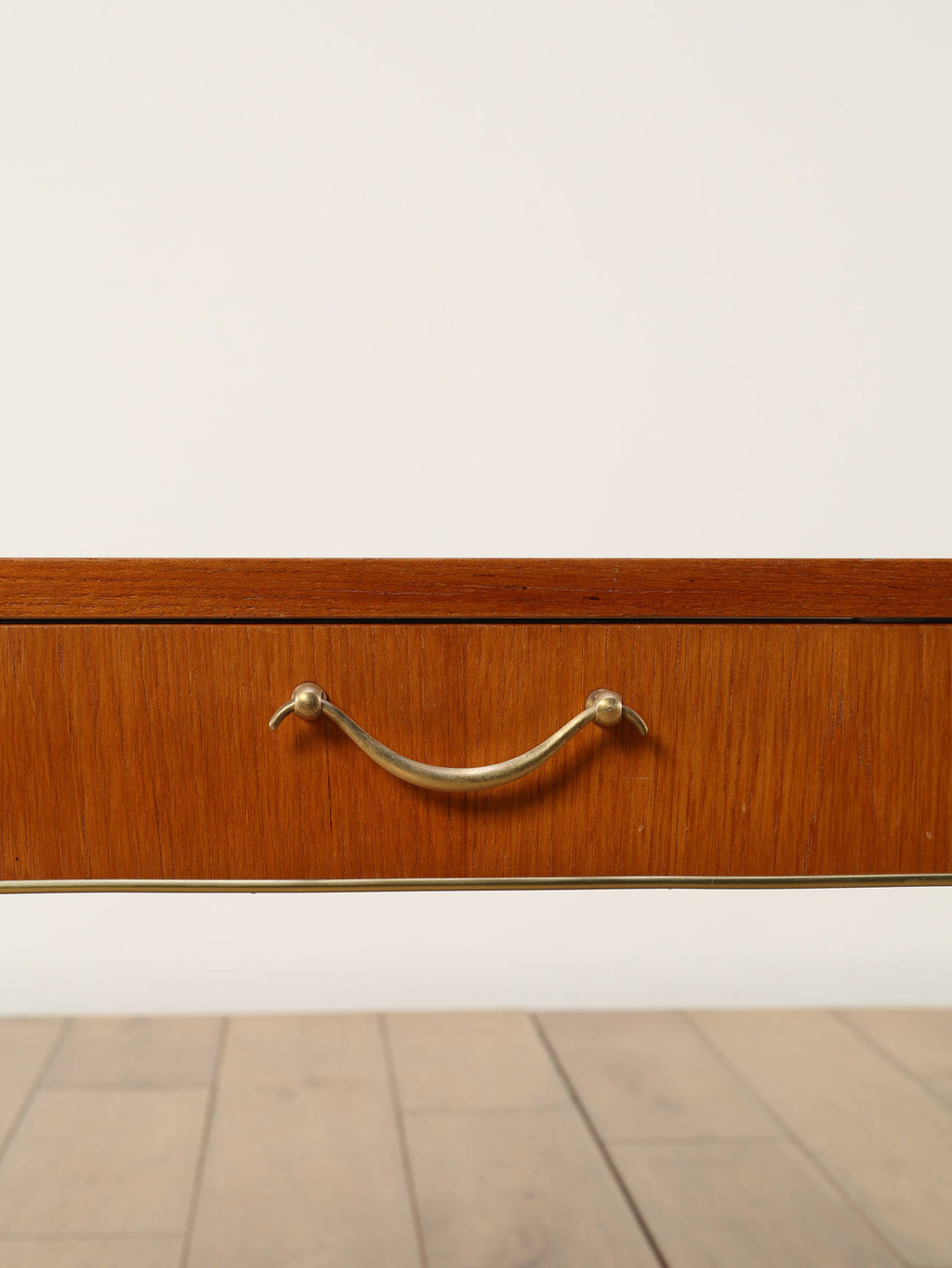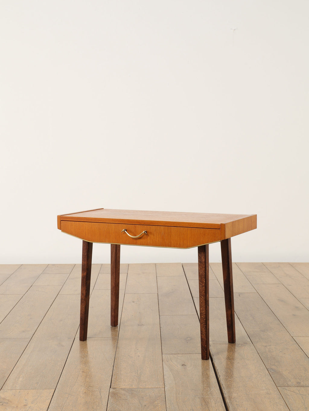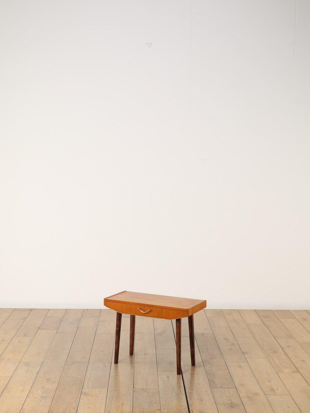 1960年代(推定)、デンマーク製のスモールチェストです。 上質なチーク材の温かく深みのある杢目が美しく、北欧デザインらしい洗練された雰囲気をまとっています。玄関や廊下など、限られたスペースにもすっきりと収まるスリムなフォルムが特徴です。目を引くのは、緩やかな曲線を描く引き出しの前面。真鍮製のクラシカルな取っ手や、引き出し下部にあしらわれた細い金属のラインが、シンプルなデザインに上品なアクセントを加えています。すっと伸びる脚部が、全体に軽やかな印象を与えます。玄関で鍵や小物を収納するコンソールとして、あるいはソファサイドやベッドサイドのテーブルとしても活躍します。空間に上質な落ち着きと北欧ヴィンテージならではの温もりを添える、デザイン性の高い小家具です。