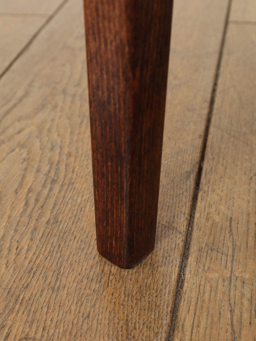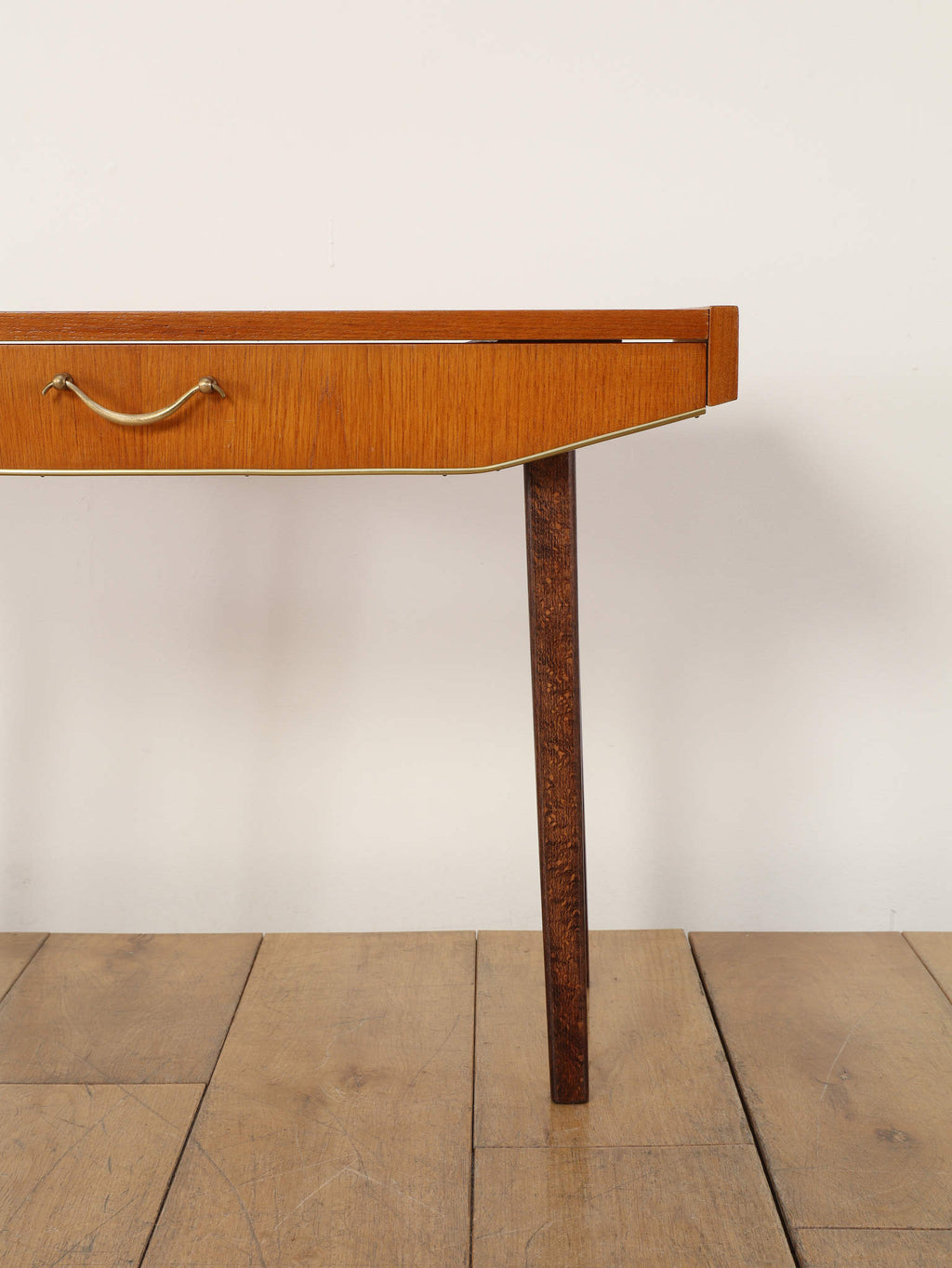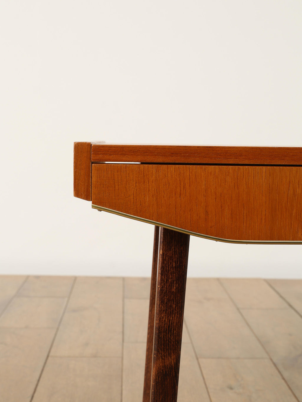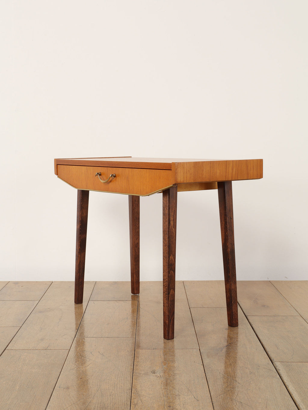 1960年代(推定)、デンマーク製のスモールチェストです。 上質なチーク材の温かく深みのある杢目が美しく、北欧デザインらしい洗練された雰囲気をまとっています。玄関や廊下など、限られたスペースにもすっきりと収まるスリムなフォルムが特徴です。目を引くのは、緩やかな曲線を描く引き出しの前面。真鍮製のクラシカルな取っ手や、引き出し下部にあしらわれた細い金属のラインが、シンプルなデザインに上品なアクセントを加えています。すっと伸びる脚部が、全体に軽やかな印象を与えます。玄関で鍵や小物を収納するコンソールとして、あるいはソファサイドやベッドサイドのテーブルとしても活躍します。空間に上質な落ち着きと北欧ヴィンテージならではの温もりを添える、デザイン性の高い小家具です。
