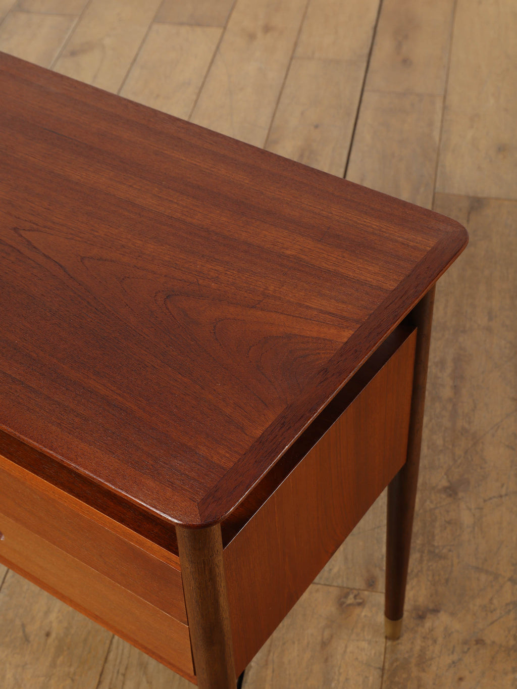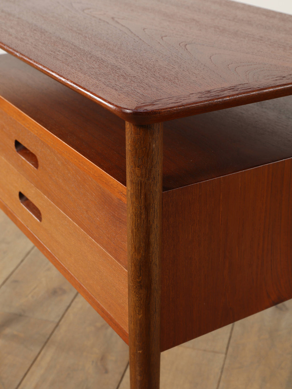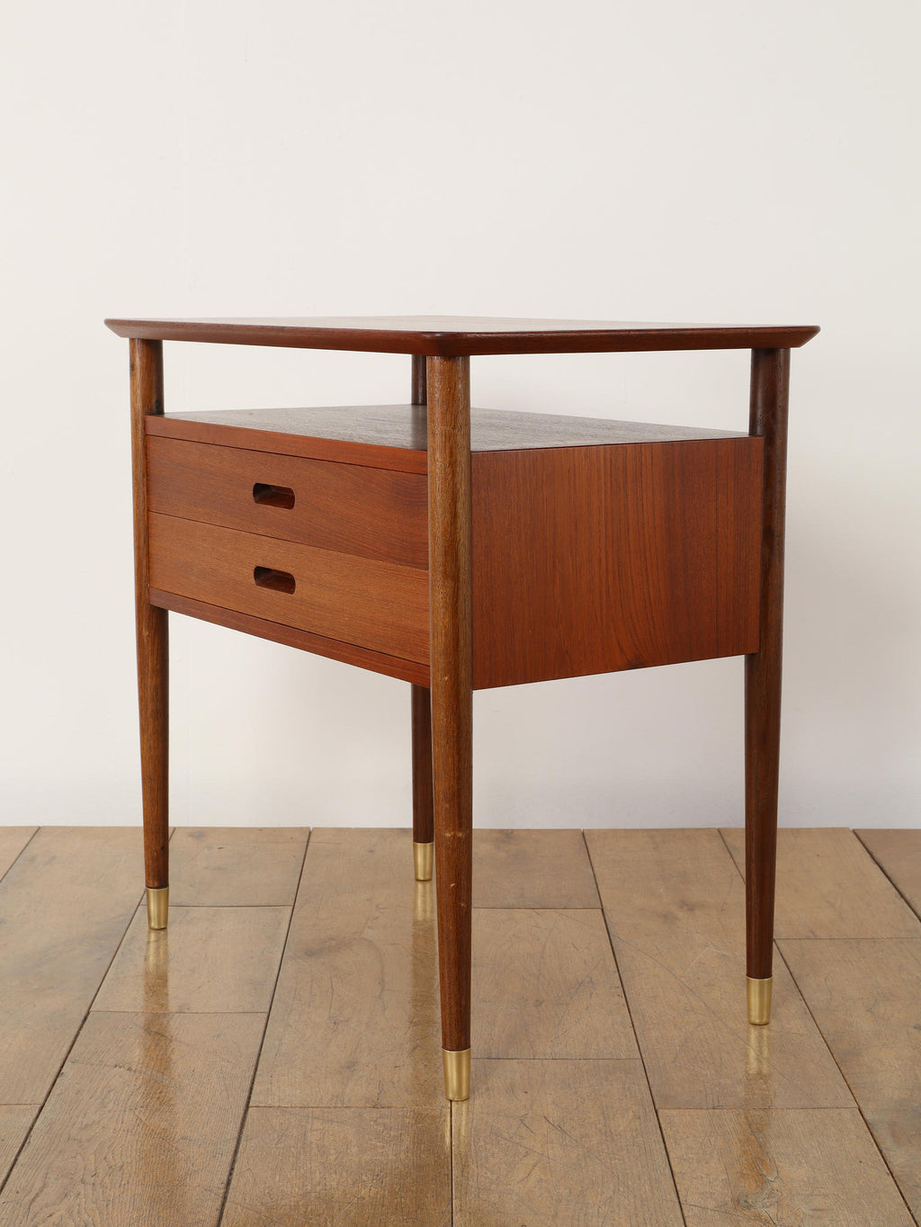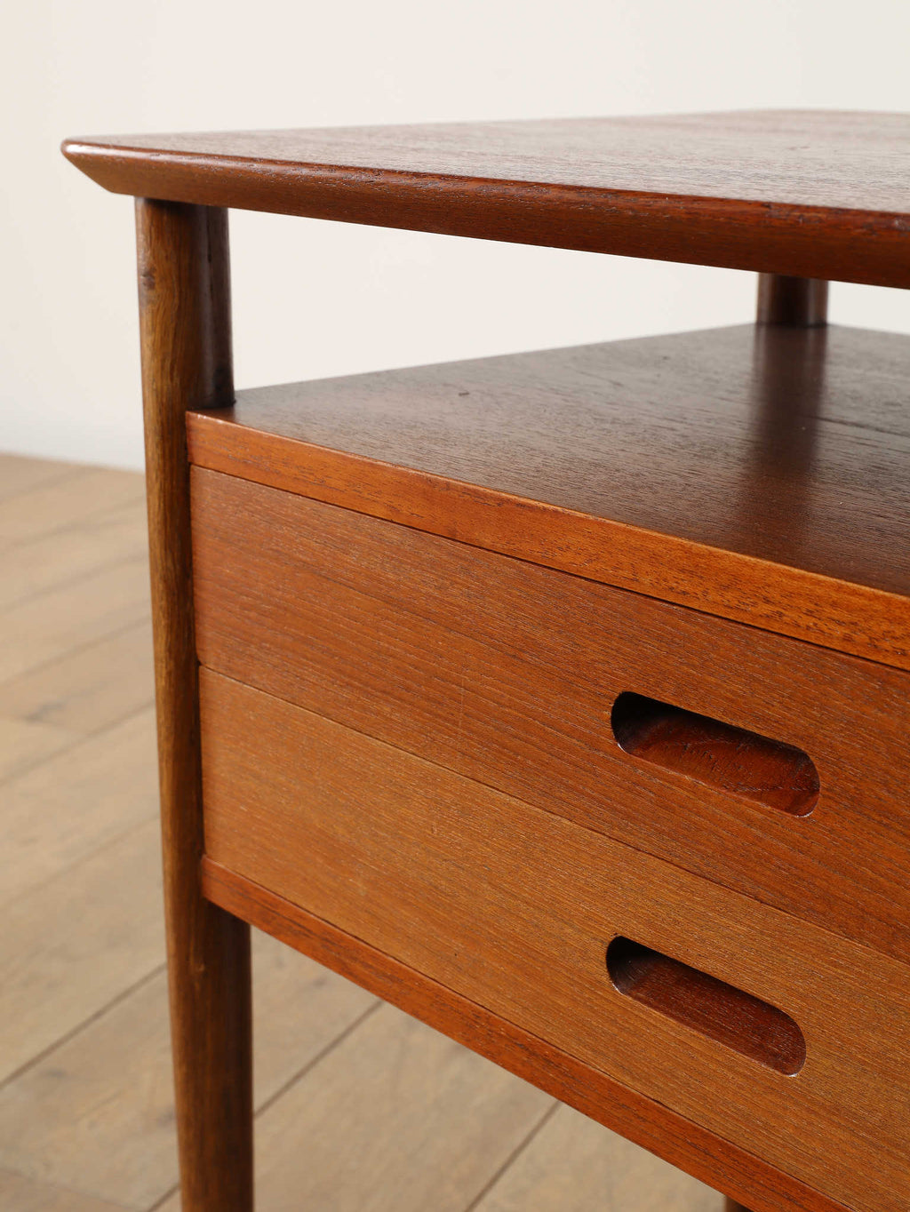 デンマークの黄金期の時代、1960年代(推定)直線的で空間を大胆に活かした特徴的なデザインです。チーク材の温かみのある美しい木目が、お部屋に落ち着いた雰囲気を添えてくれます。本体のチーク材とは対照的に脚部にはオーク材が使われている事で、デザインに拘った印象を与えてくれます。2段の引き出しは収納力も有、シンプルでミニマルなフォルムを感じさせてくれます。製造から半世紀以上の時を経てもなお色褪せない、デンマークヴィンテージ家具の確かな品質と魅力を、ぜひお手元でお楽しみください。