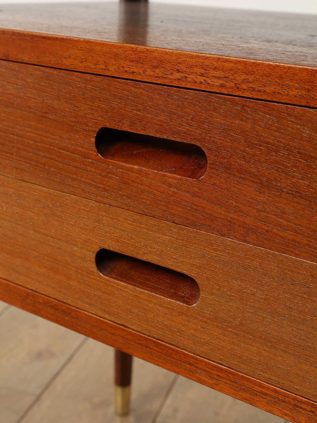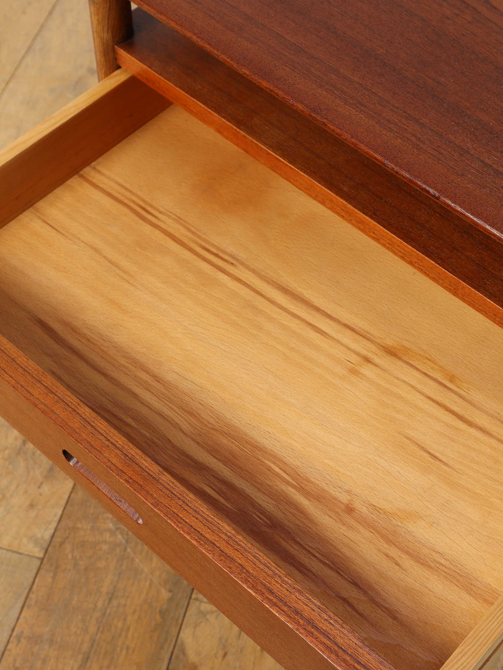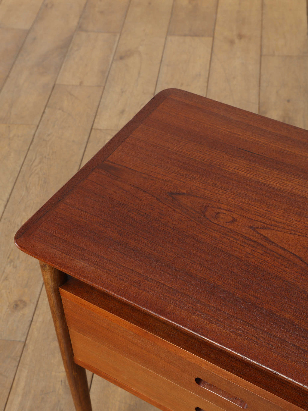 デンマークの黄金期の時代、1960年代(推定)直線的で空間を大胆に活かした特徴的なデザインです。チーク材の温かみのある美しい木目が、お部屋に落ち着いた雰囲気を添えてくれます。本体のチーク材とは対照的に脚部にはオーク材が使われている事で、デザインに拘った印象を与えてくれます。2段の引き出しは収納力も有、シンプルでミニマルなフォルムを感じさせてくれます。製造から半世紀以上の時を経てもなお色褪せない、デンマークヴィンテージ家具の確かな品質と魅力を、ぜひお手元でお楽しみください。