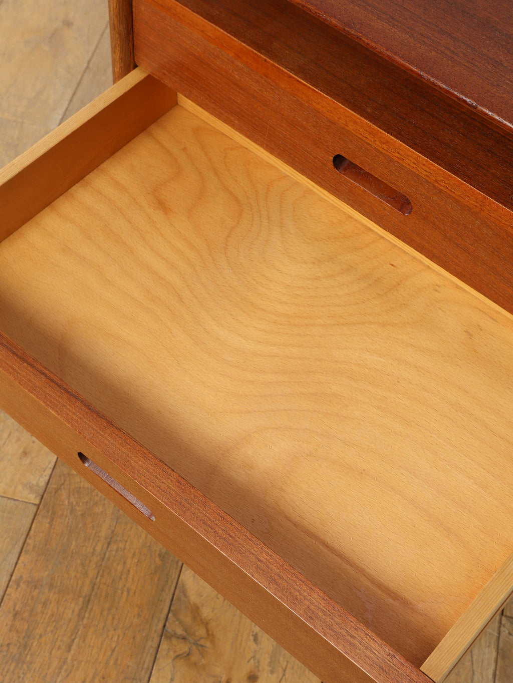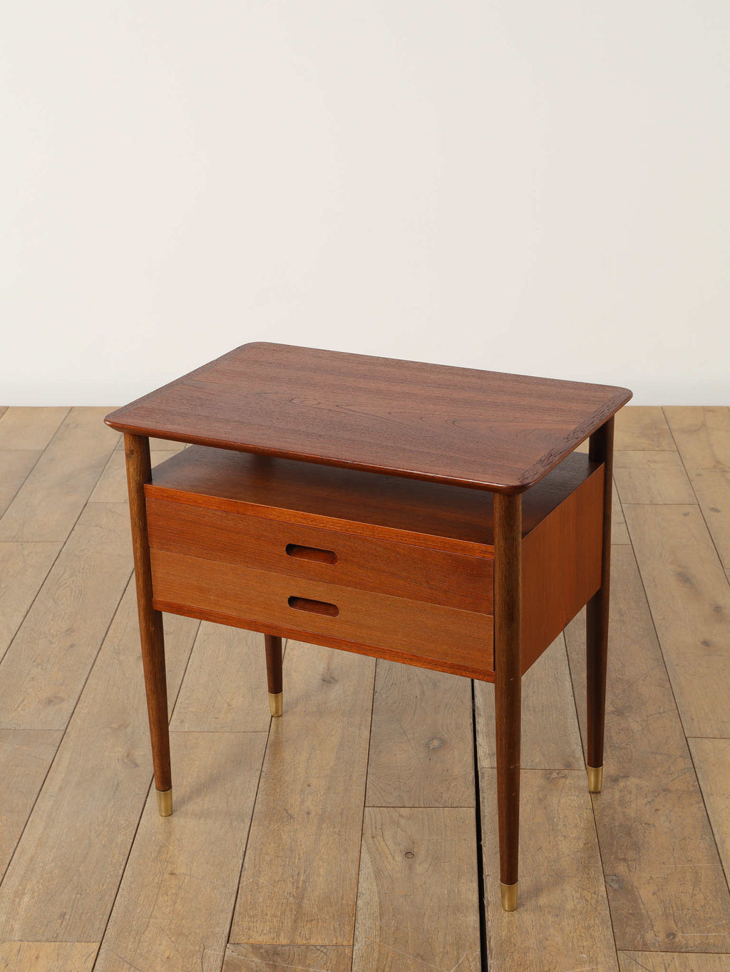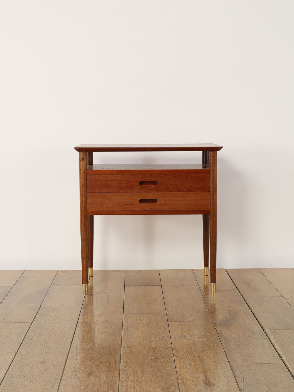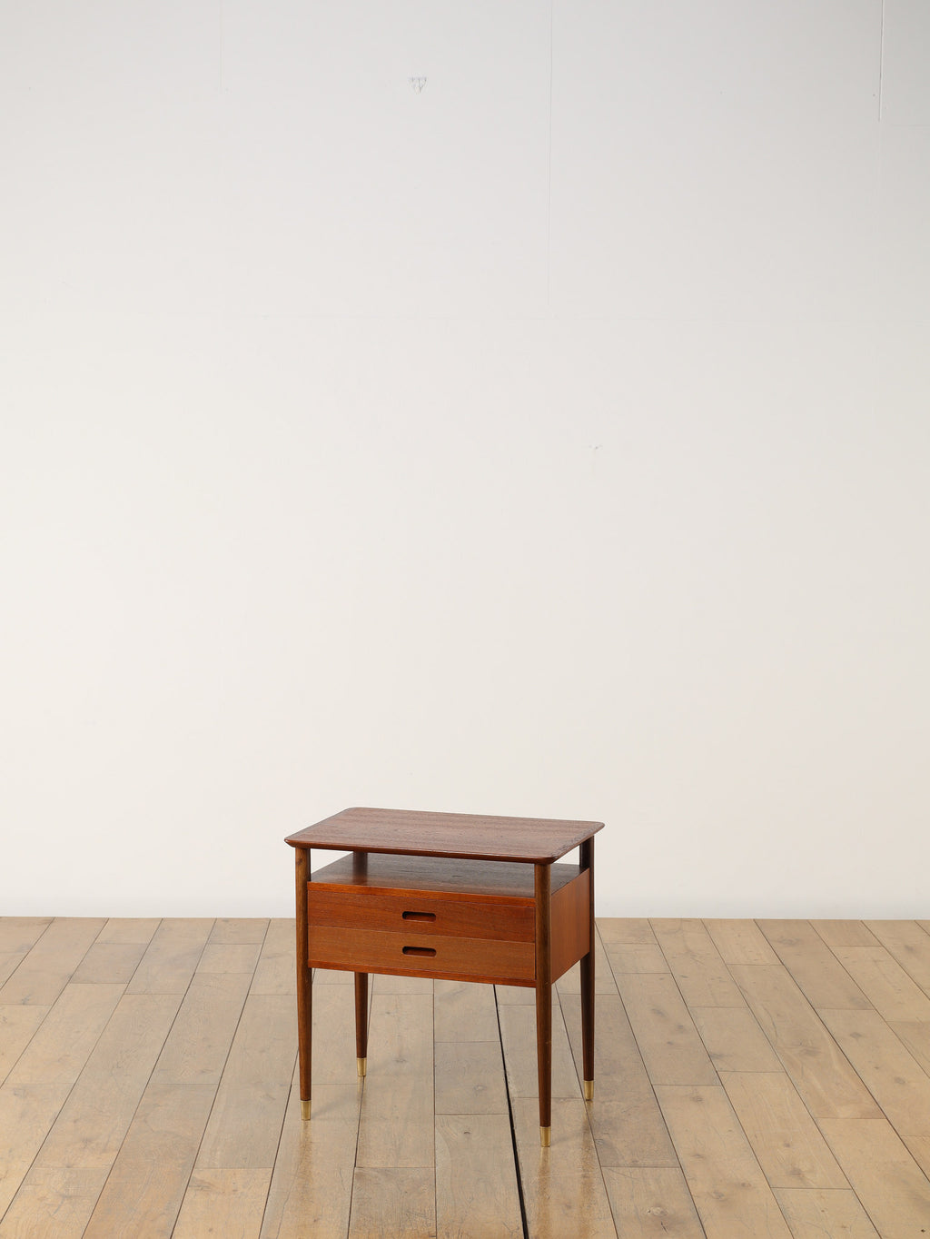 デンマークの黄金期の時代、1960年代(推定)直線的で空間を大胆に活かした特徴的なデザインです。チーク材の温かみのある美しい木目が、お部屋に落ち着いた雰囲気を添えてくれます。本体のチーク材とは対照的に脚部にはオーク材が使われている事で、デザインに拘った印象を与えてくれます。2段の引き出しは収納力も有、シンプルでミニマルなフォルムを感じさせてくれます。製造から半世紀以上の時を経てもなお色褪せない、デンマークヴィンテージ家具の確かな品質と魅力を、ぜひお手元でお楽しみください。